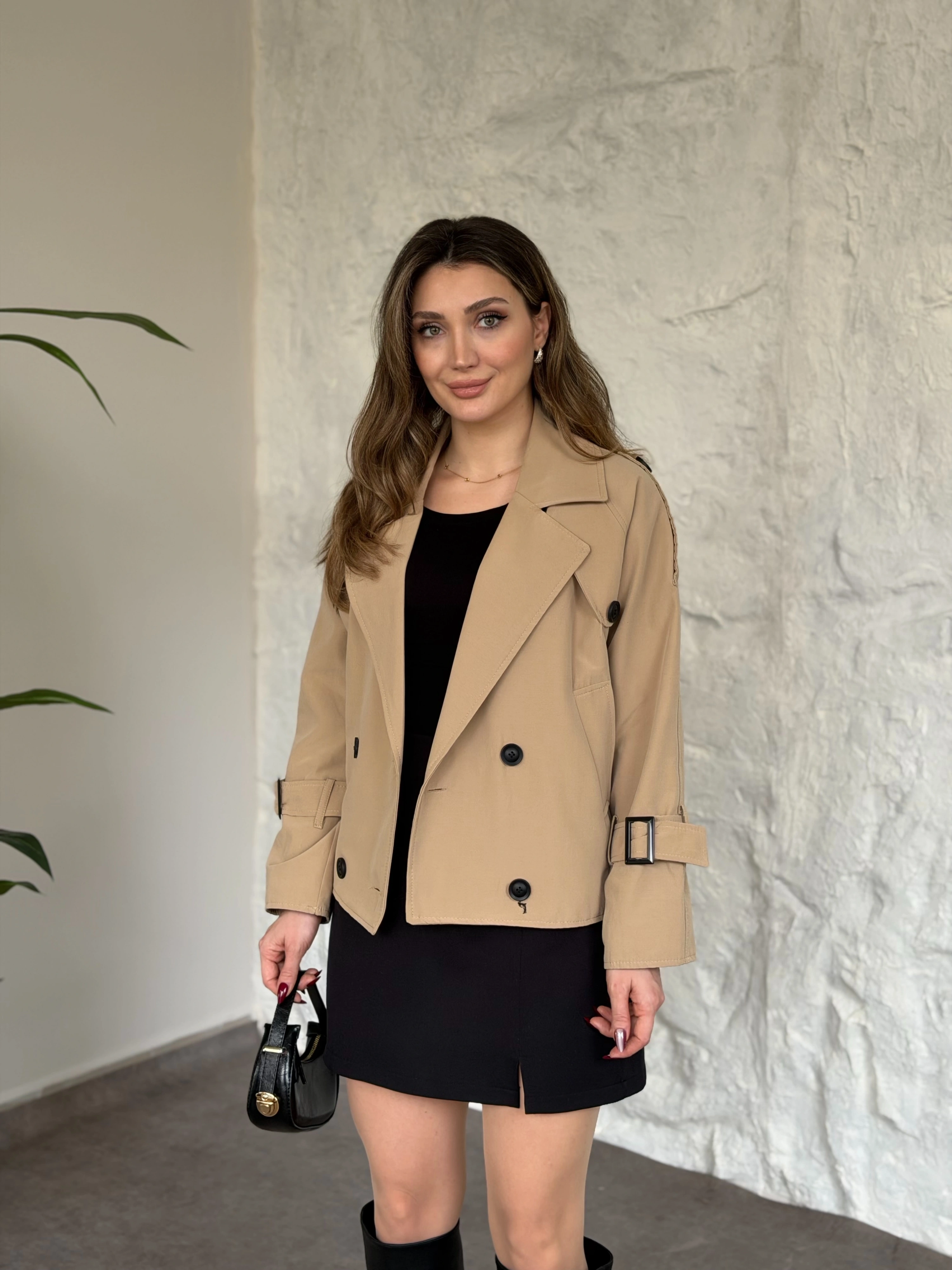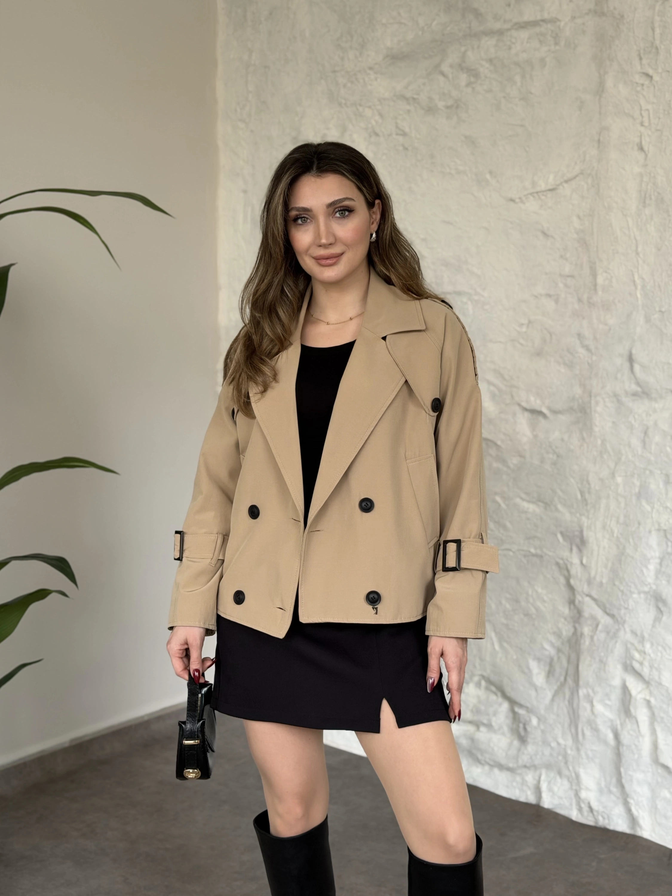 Premium torino kumaş boğazlı düğmeli kısa trenç bej