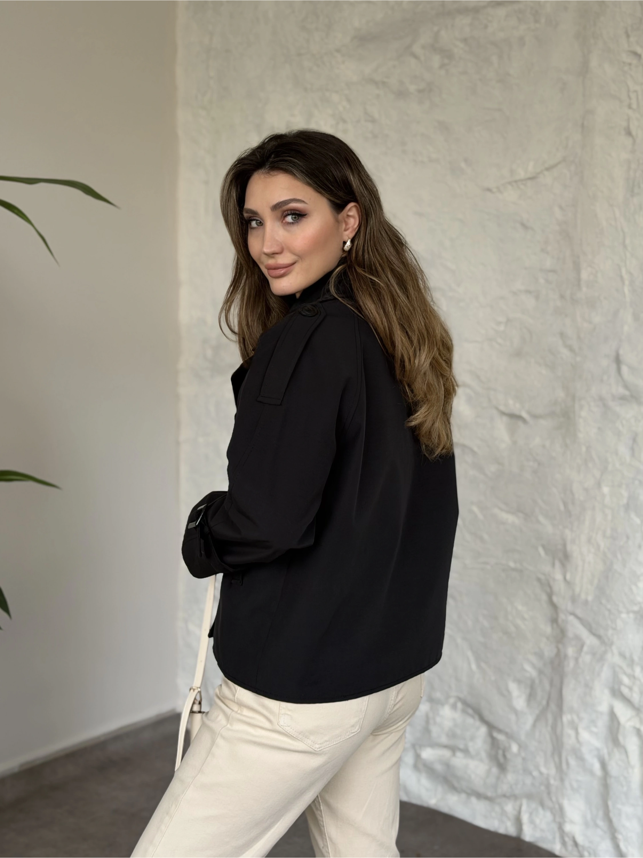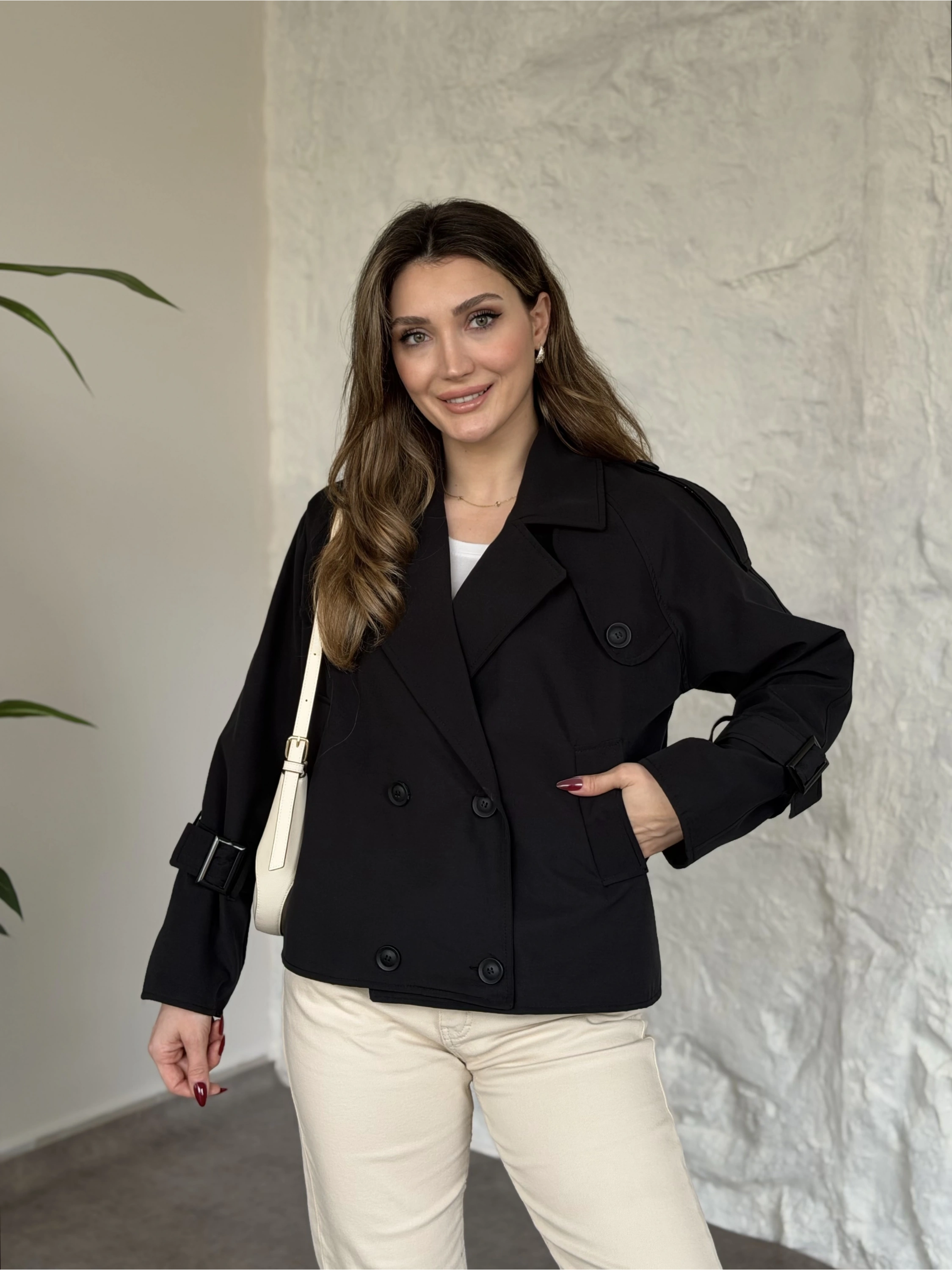 Premium kalite Torino kumaş kruvaze model kolları kemerli trenç siyah