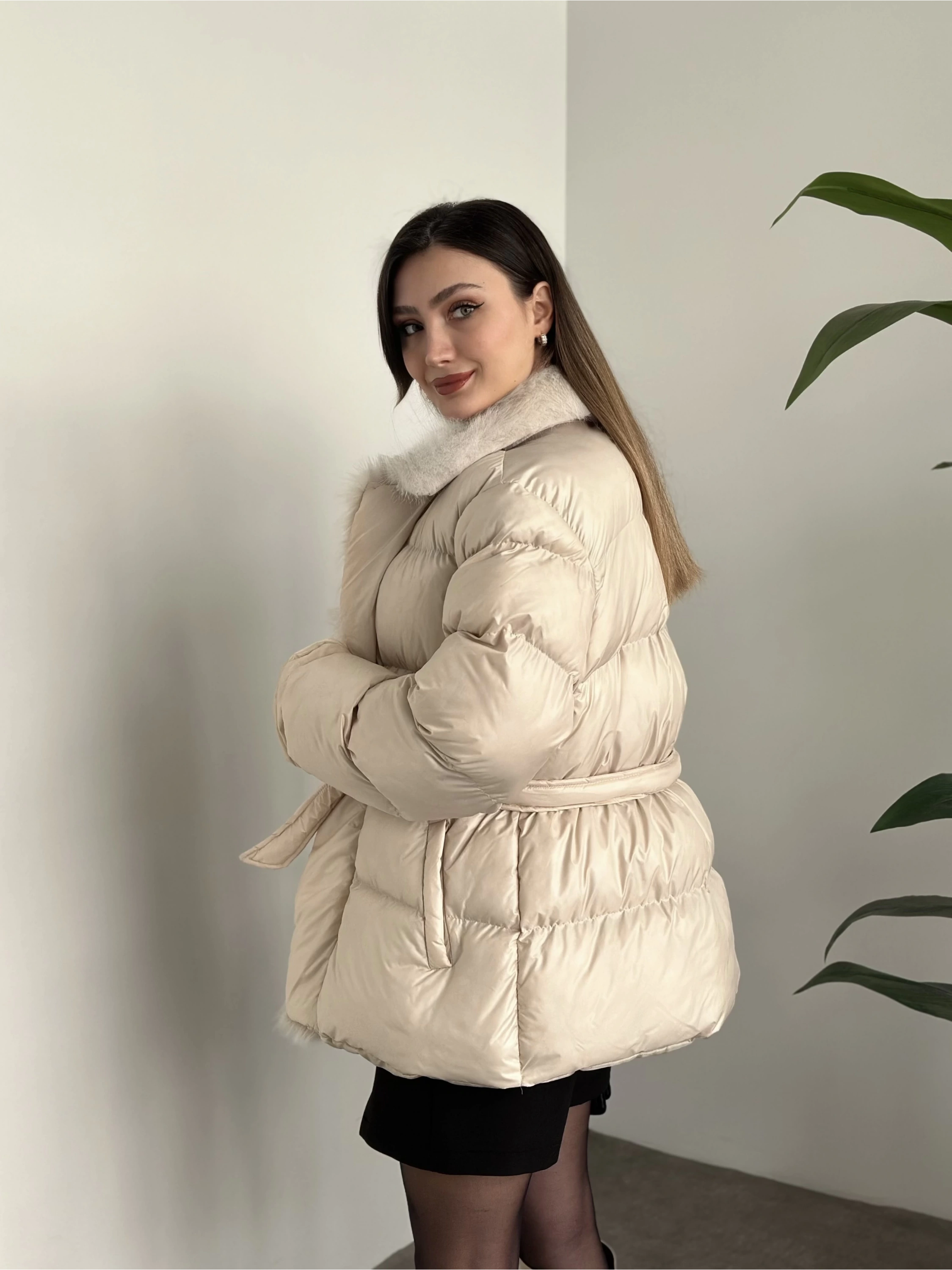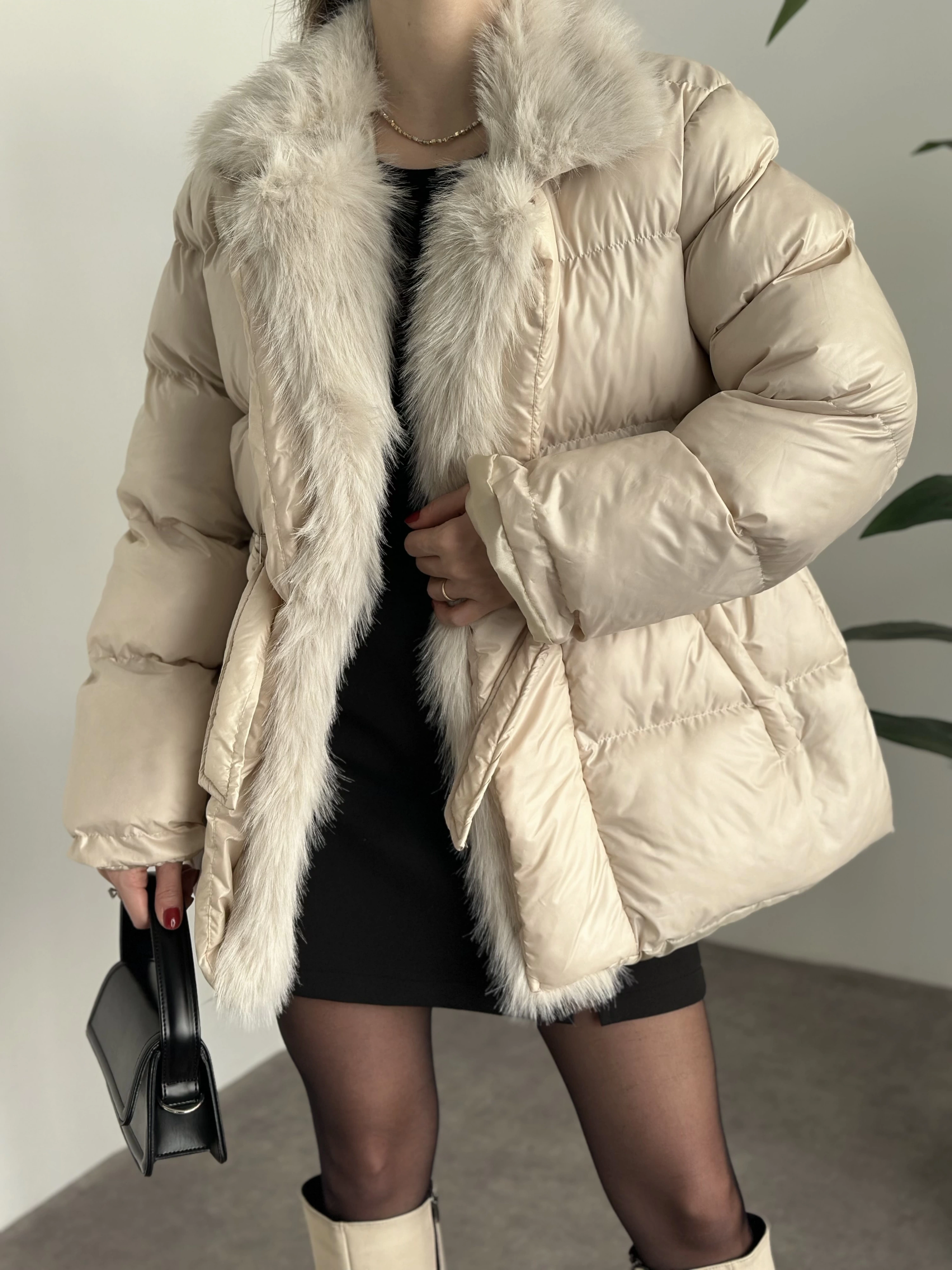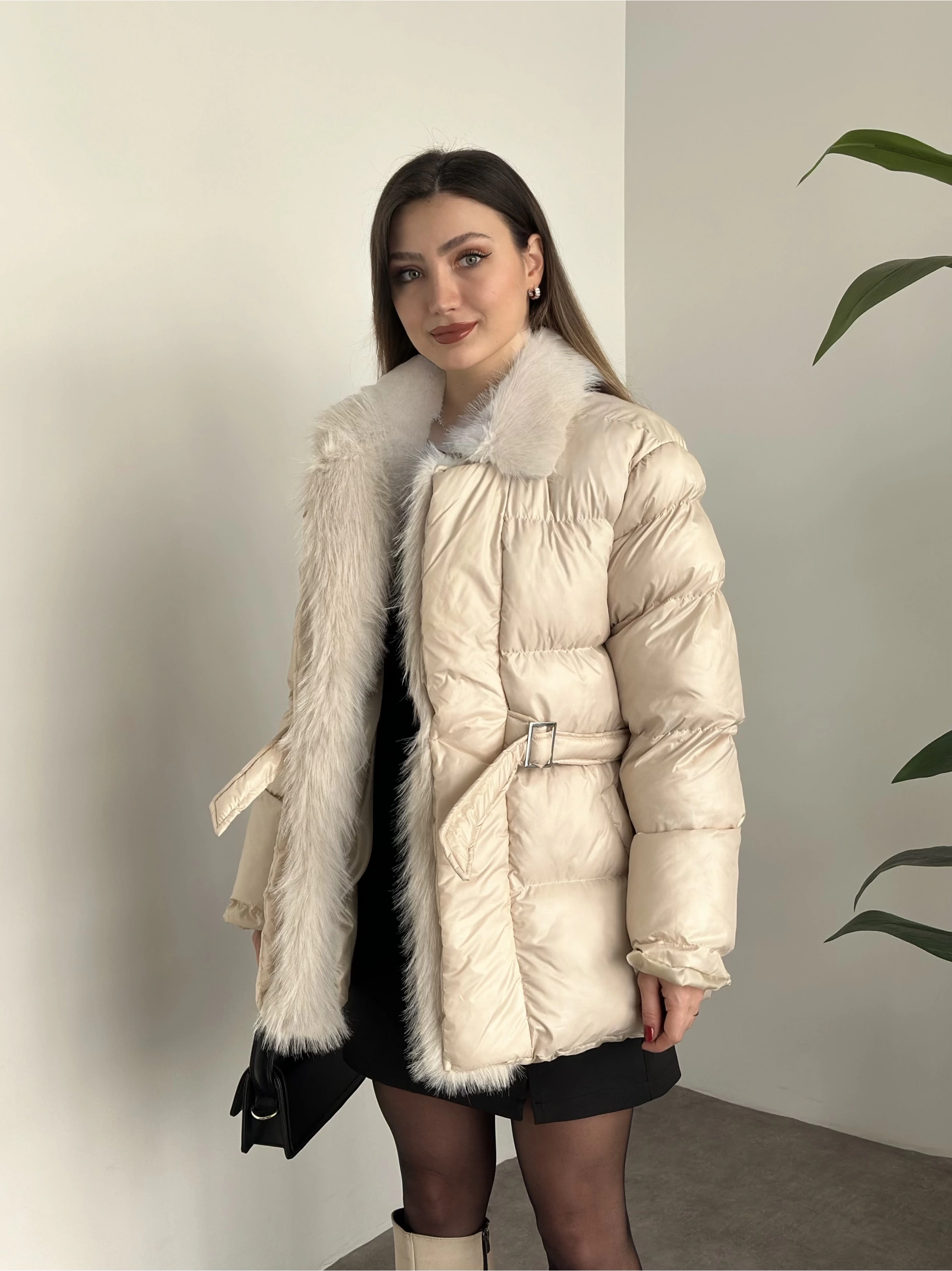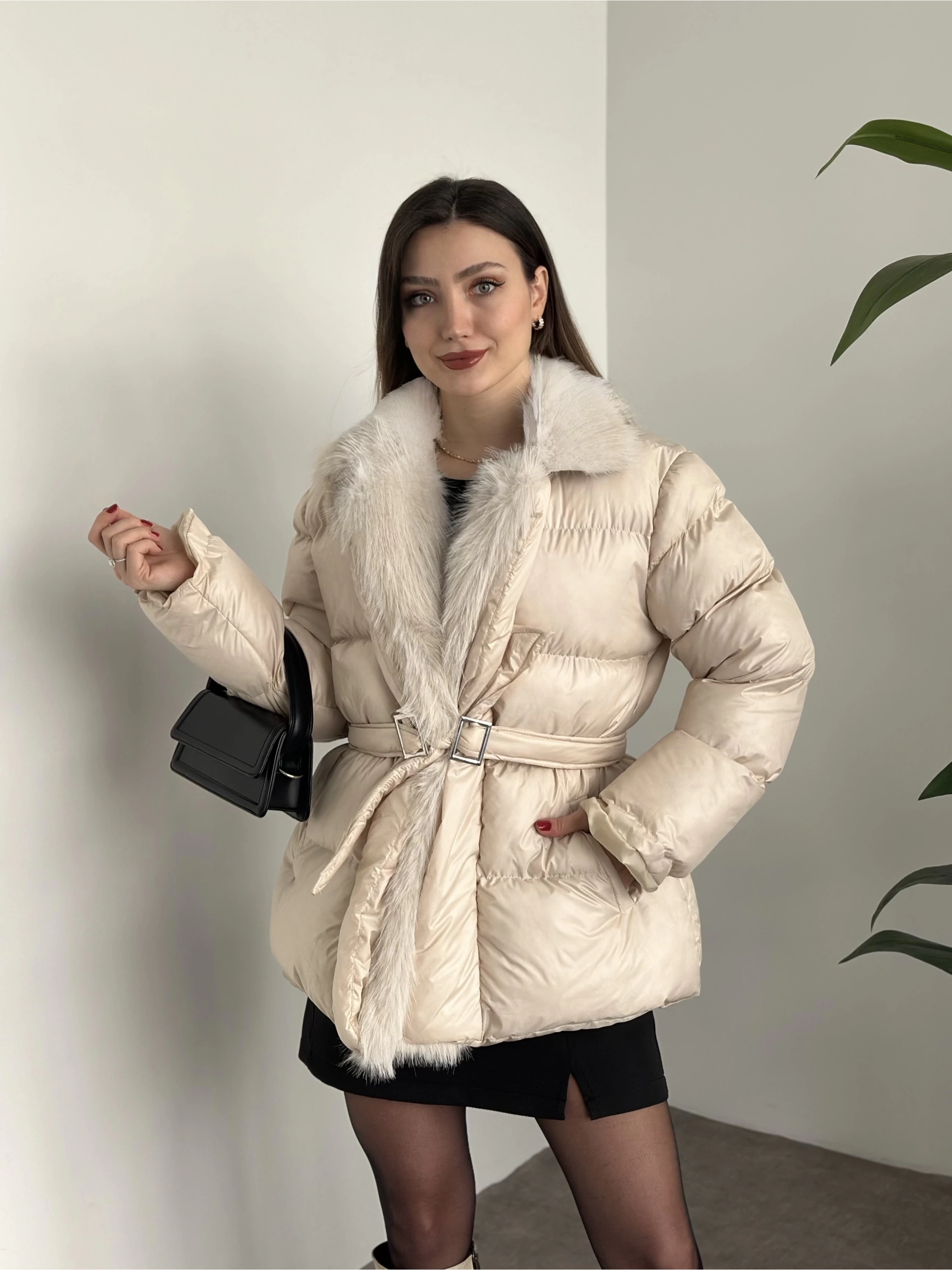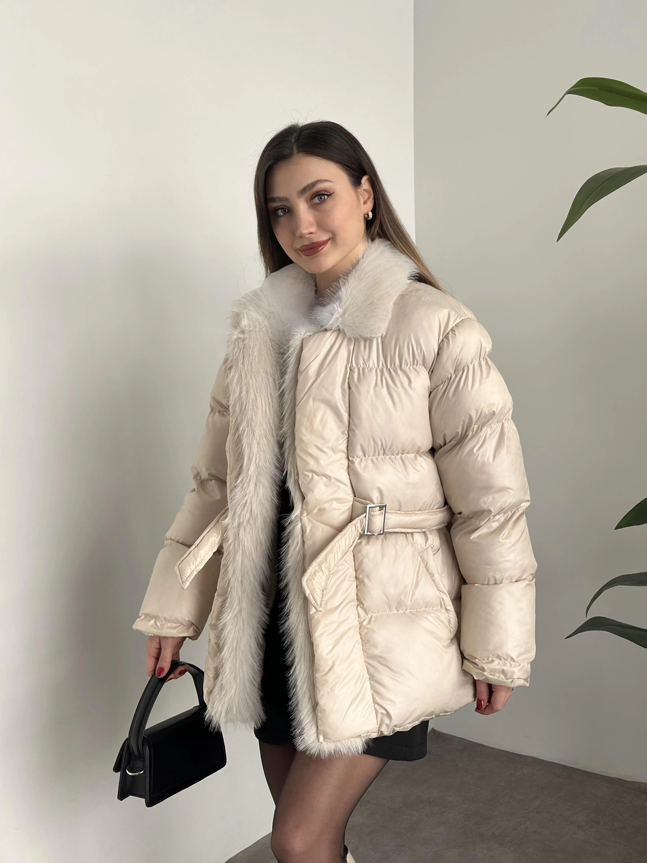 Premium kürk detaylı bağlamalı şişme mont krem