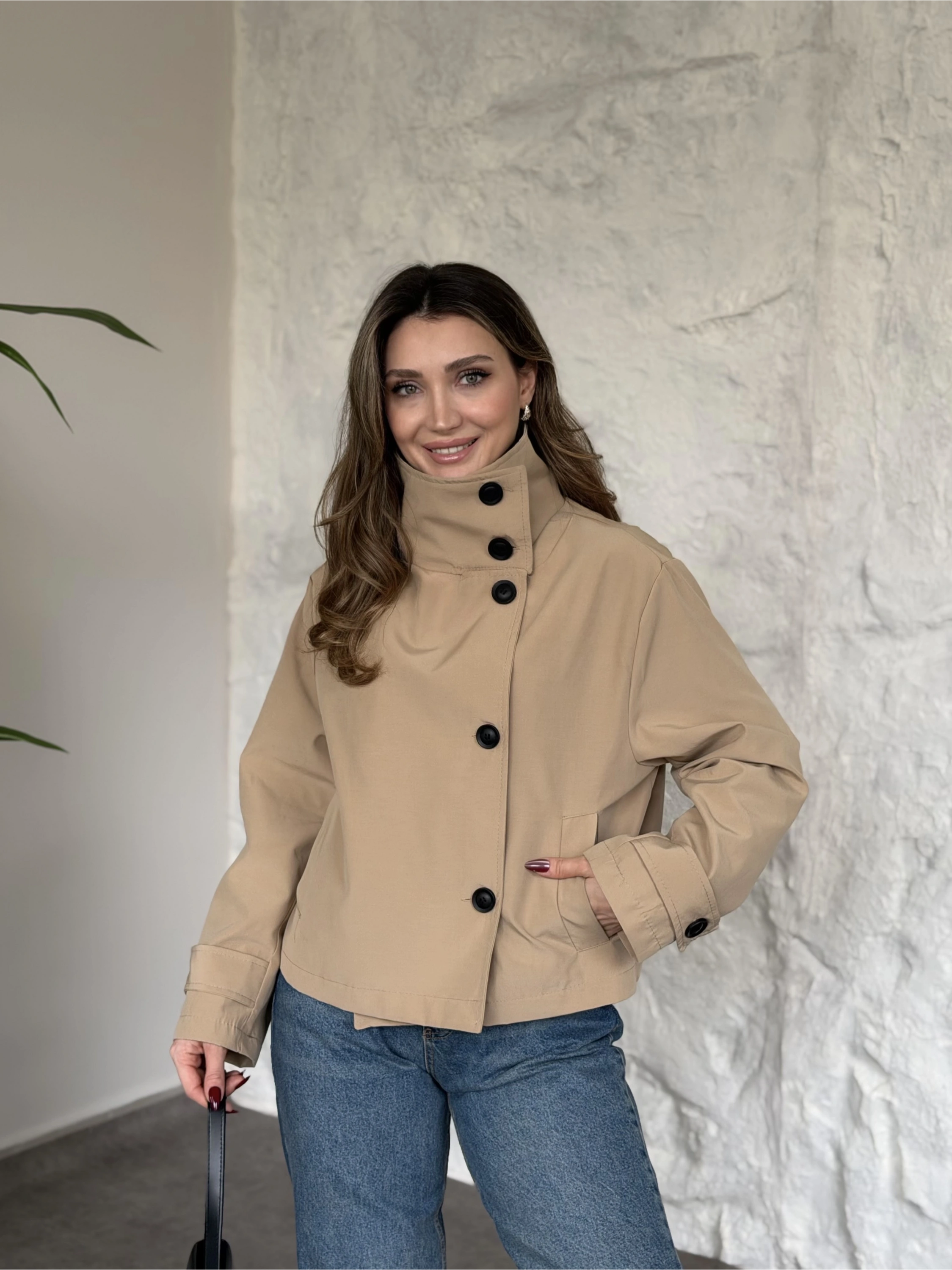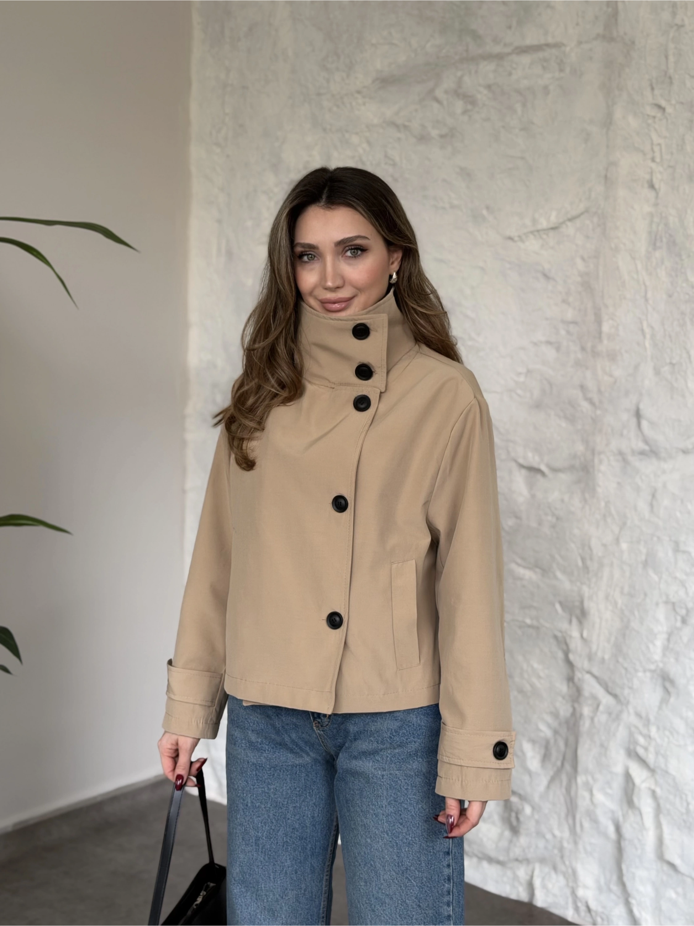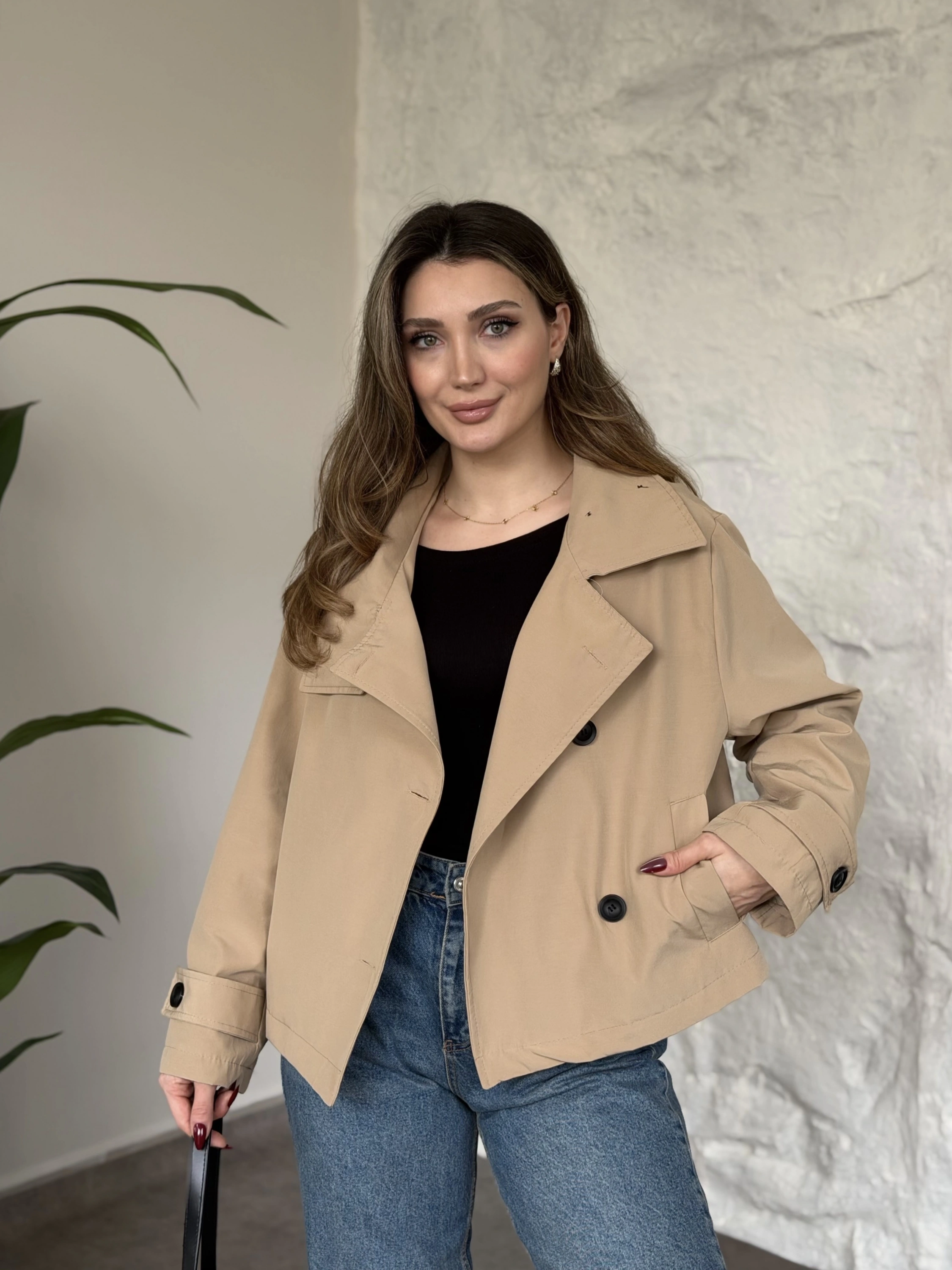 Premium torino kumaş boğazlı düğmeli kısa trenç bej