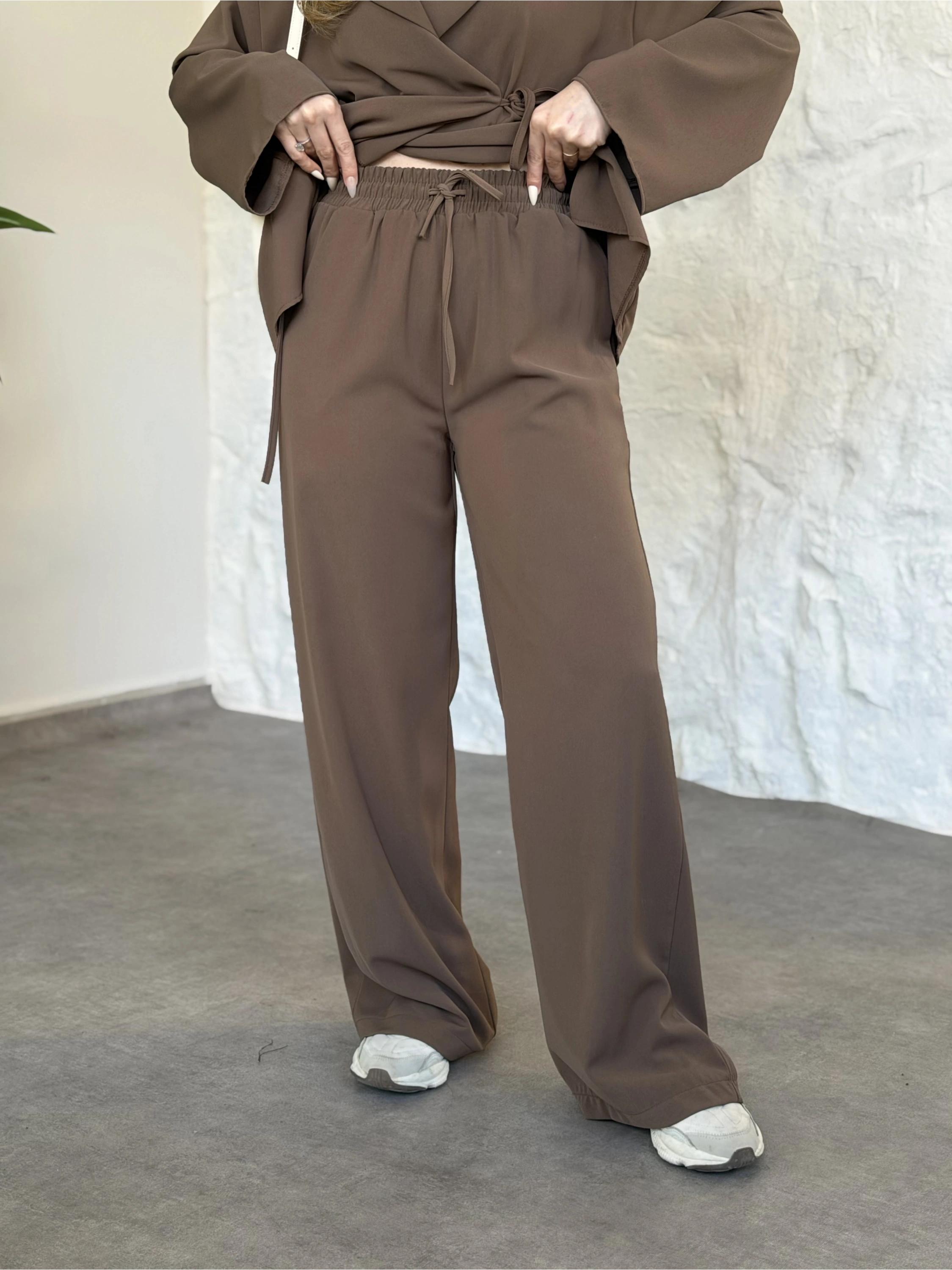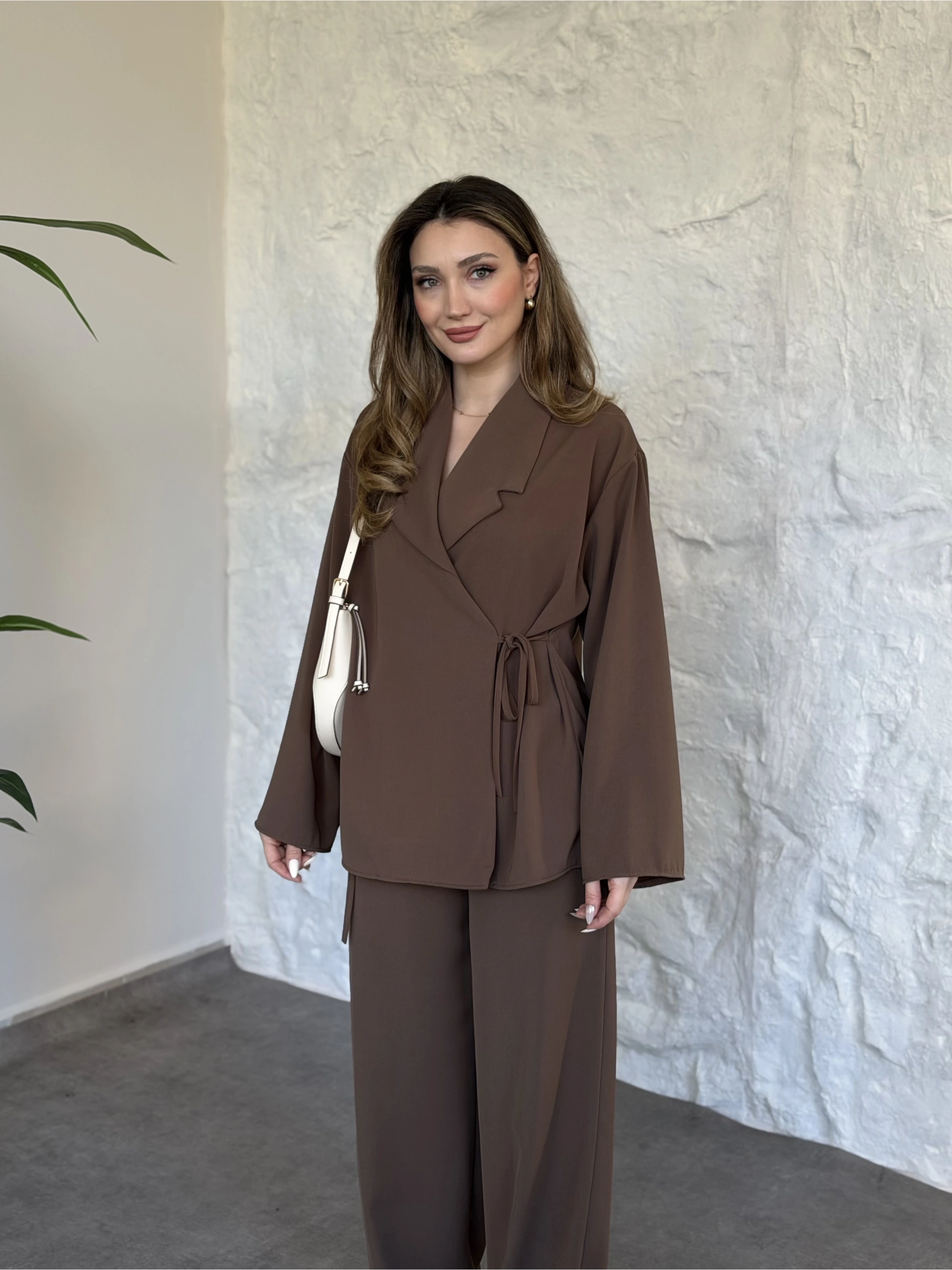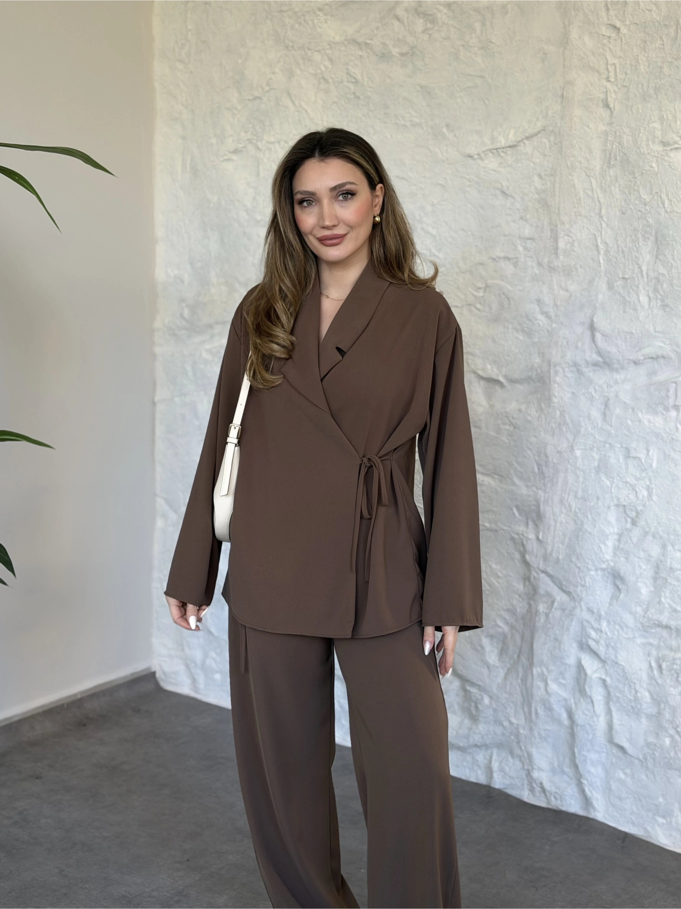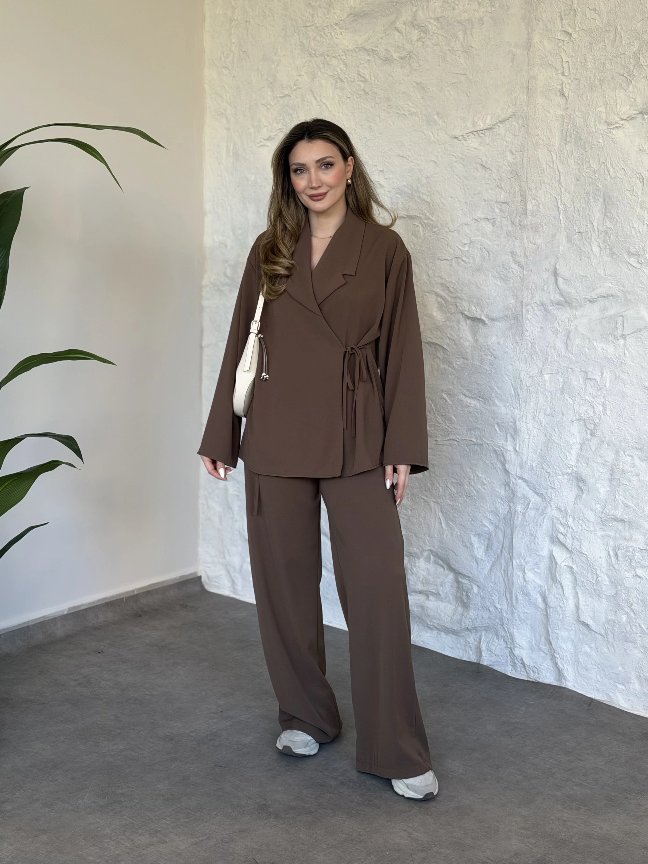 Asimetrik kesim scuba crep kumaş takım kahve