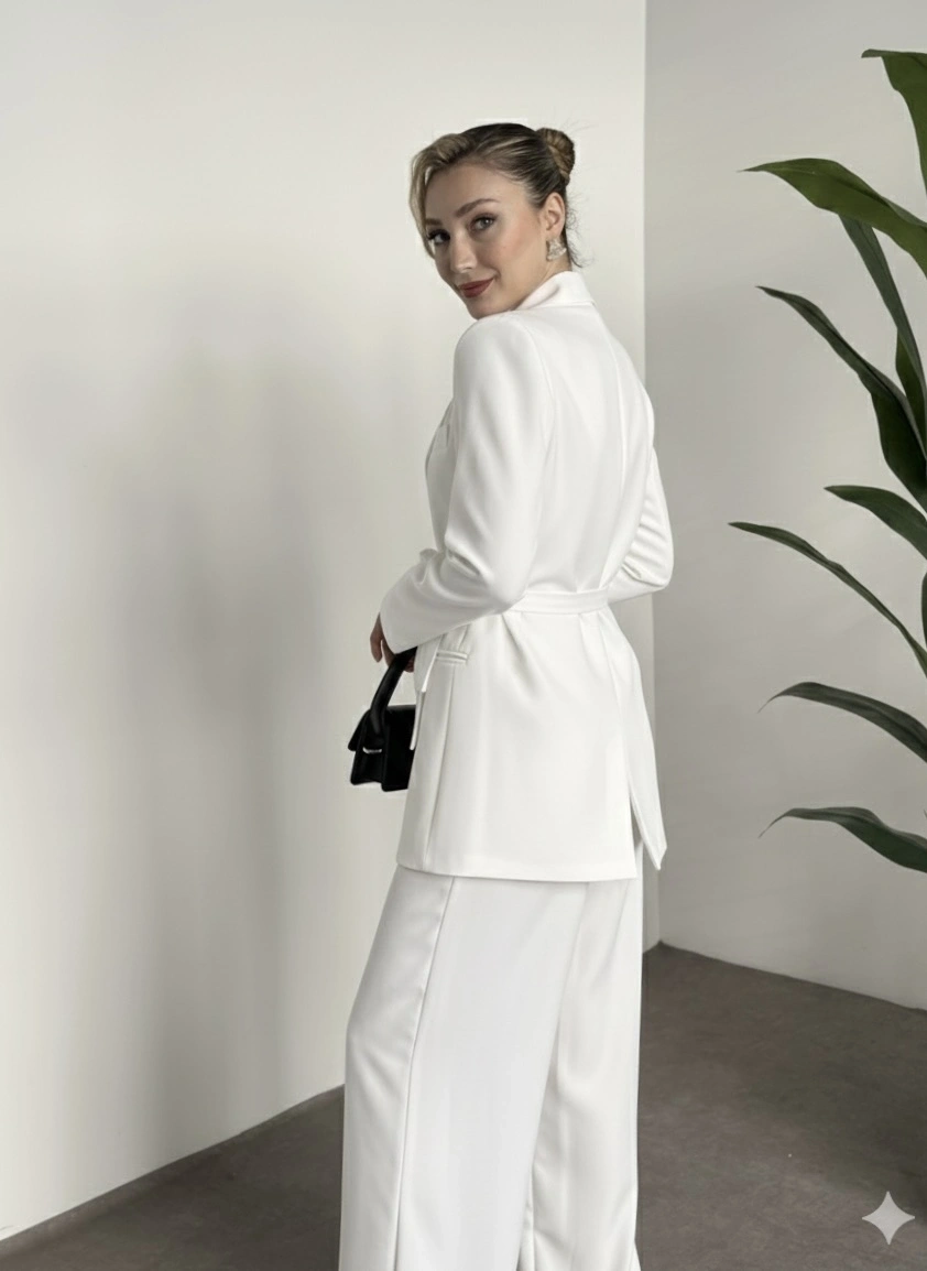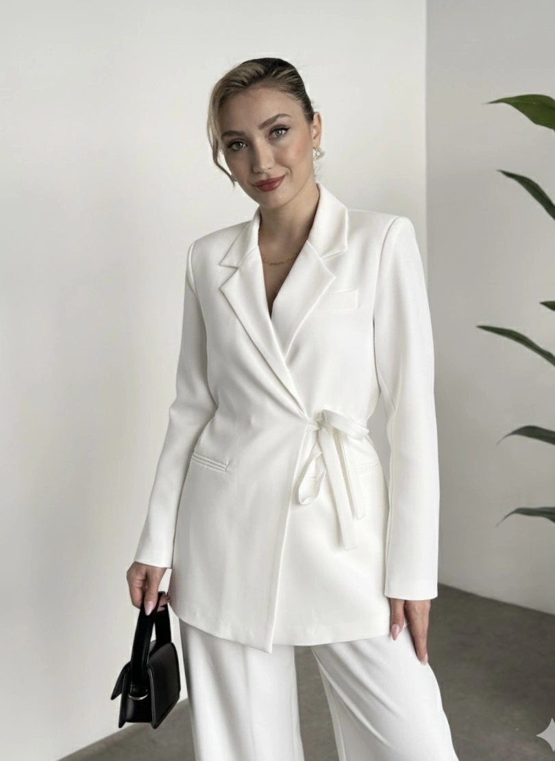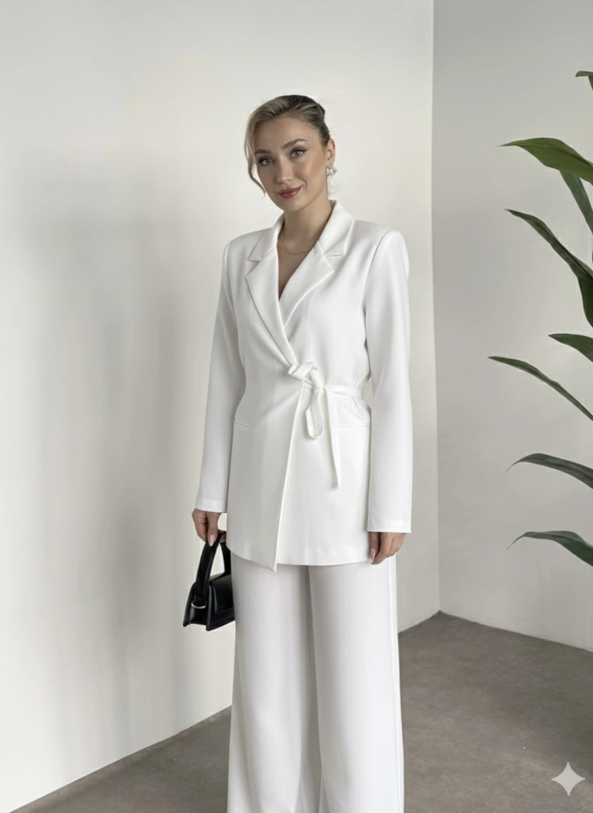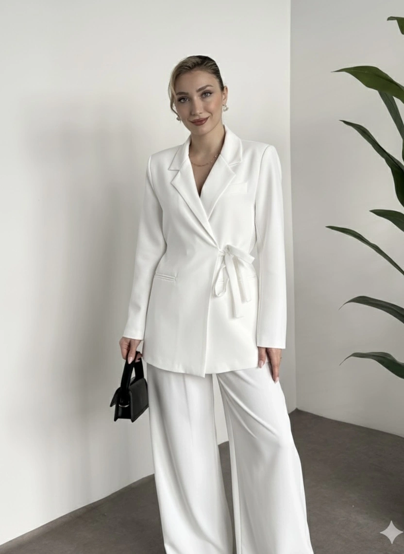 Premium yandan bağlama detaylı double kumaş takım beyaz