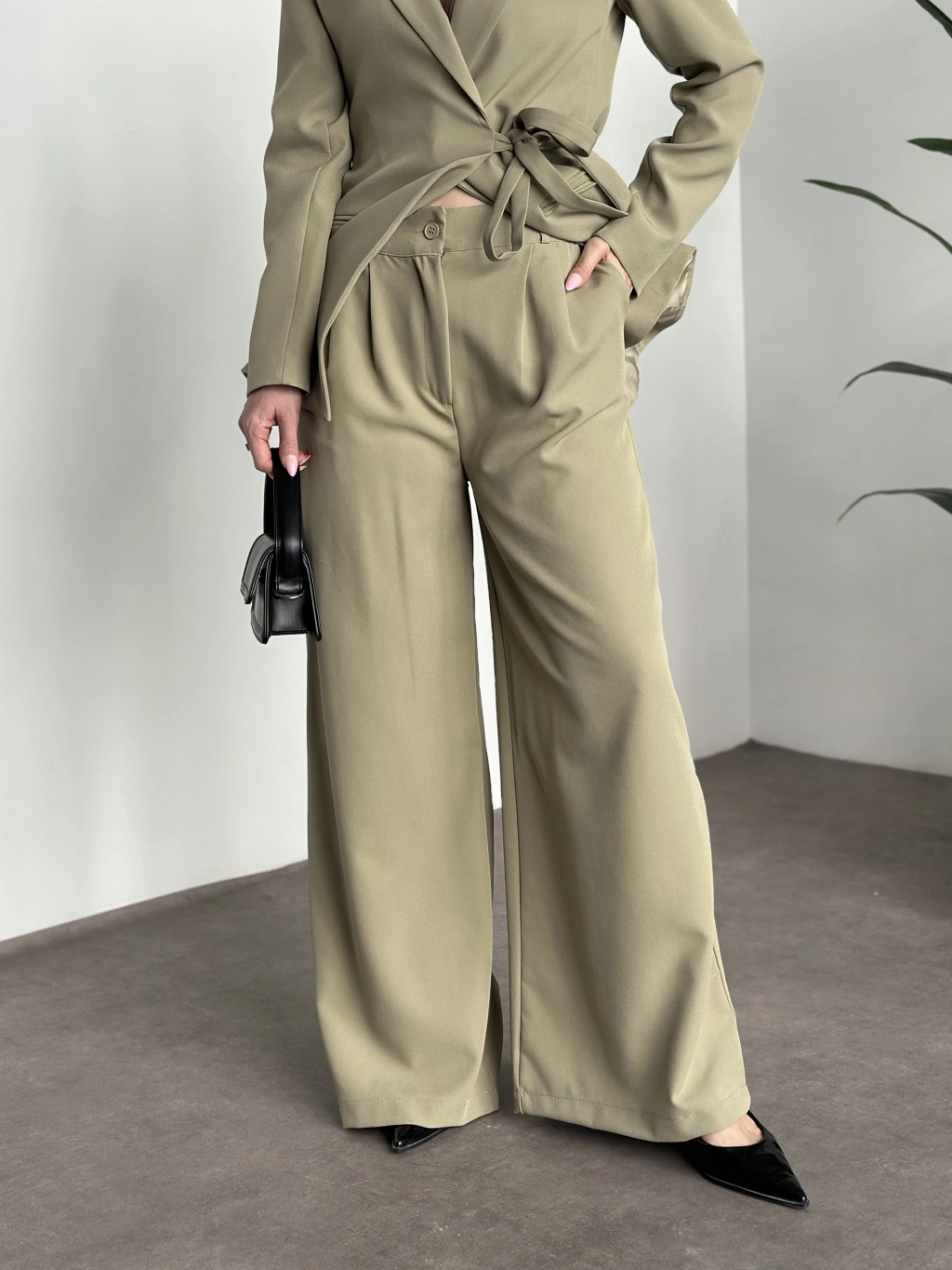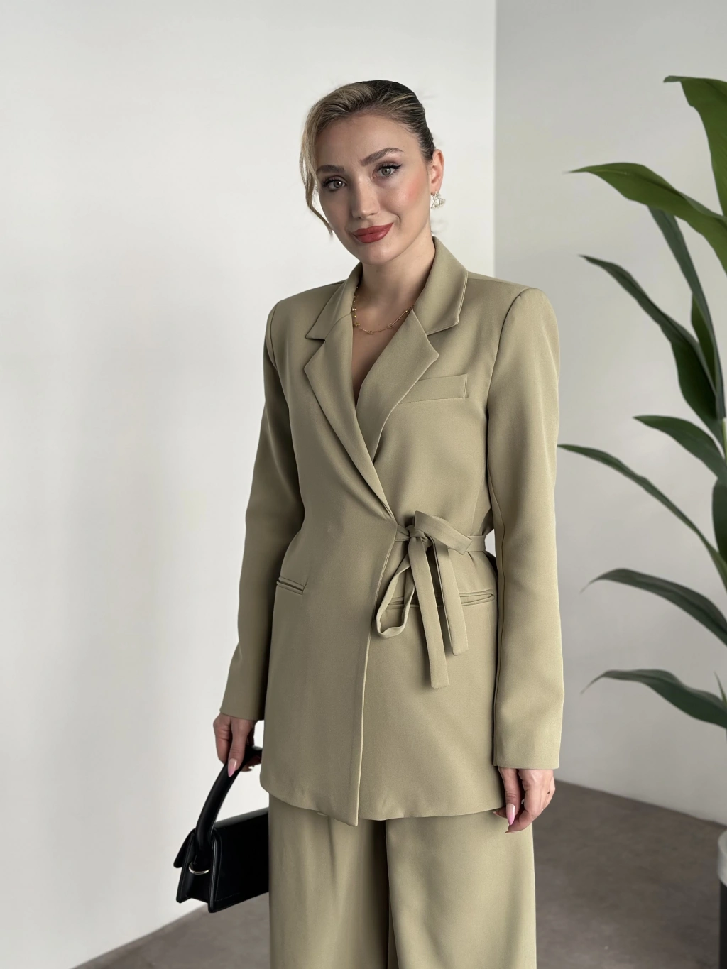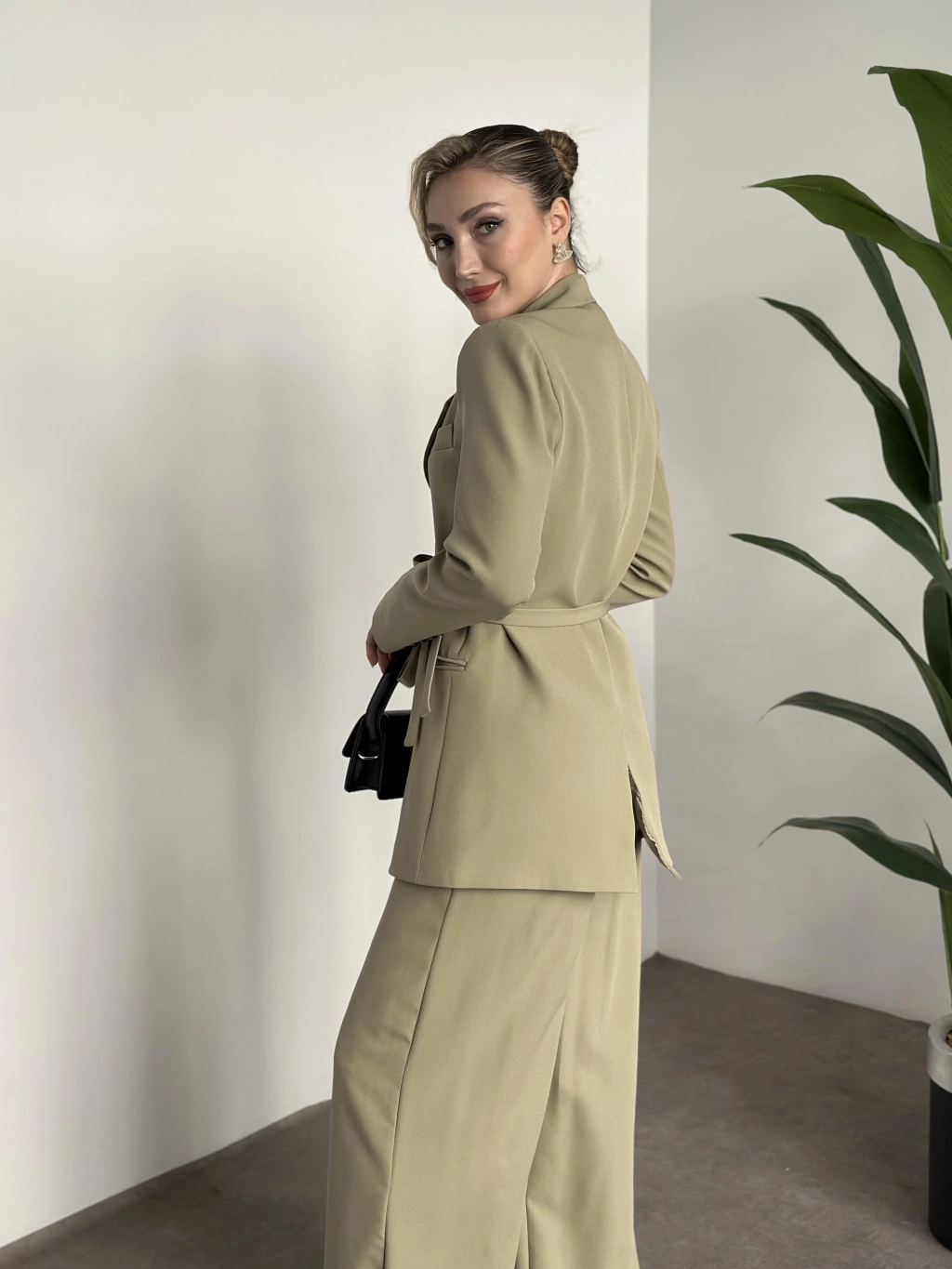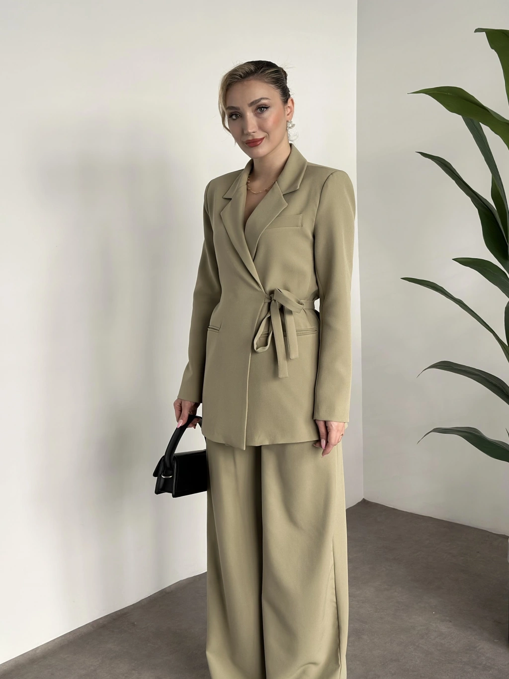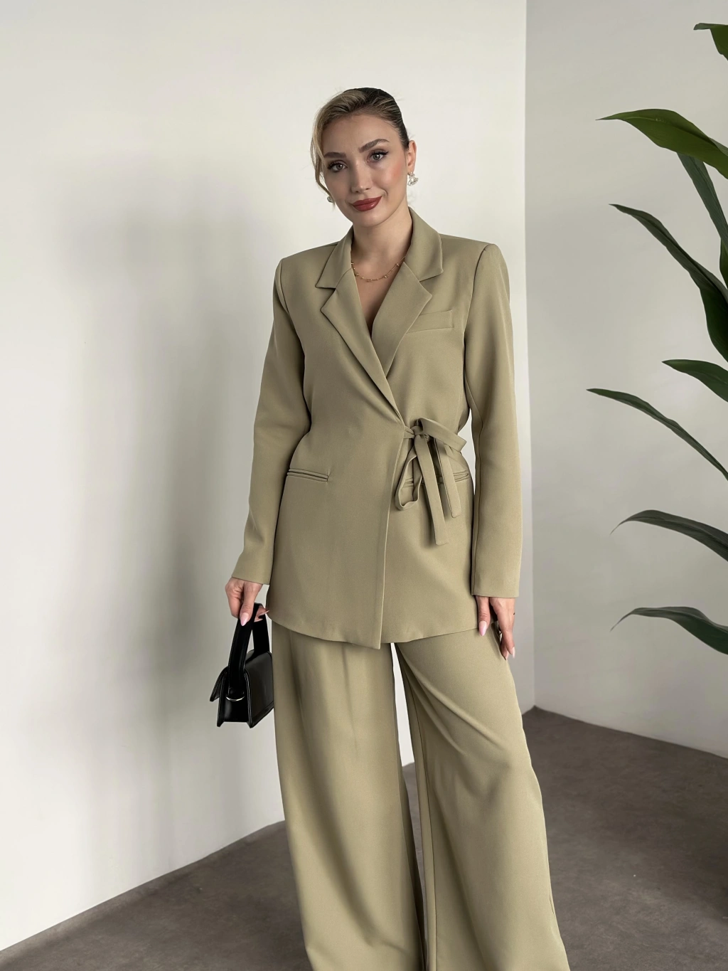 Premium yandan bağlama detaylı double kumaş takım kahve