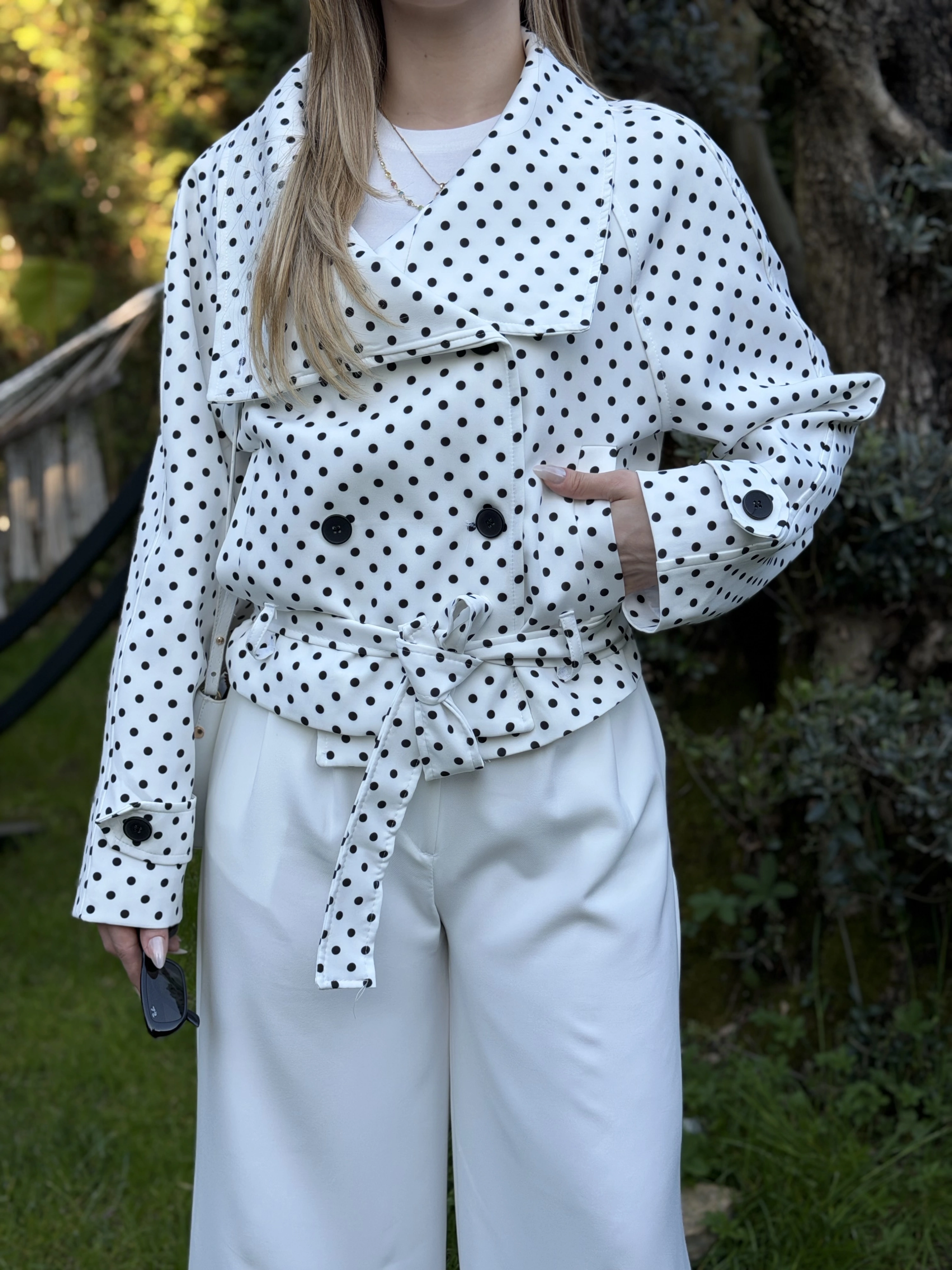Puantiyeli yakalı astarlı kısa trenç beyaz
