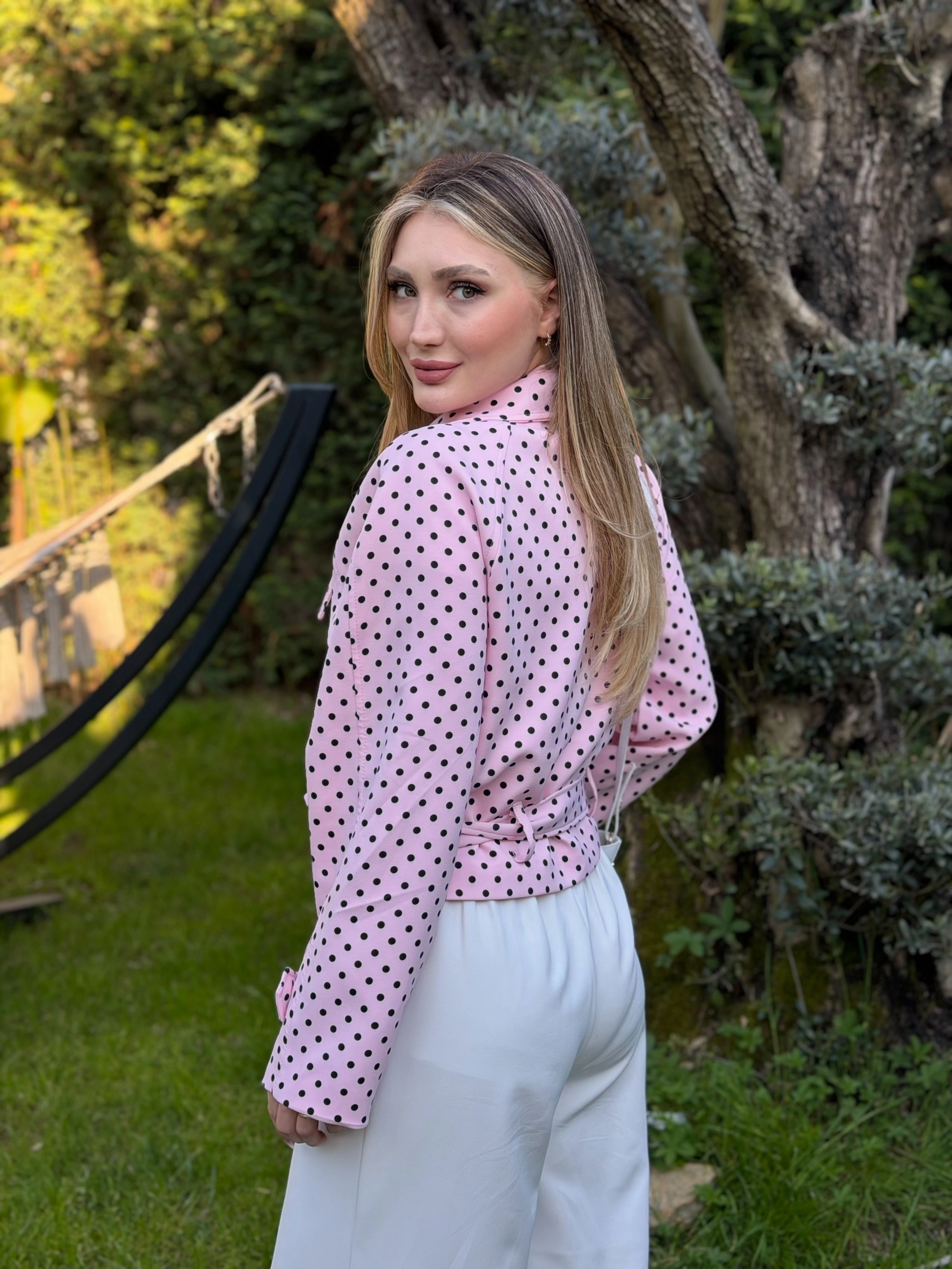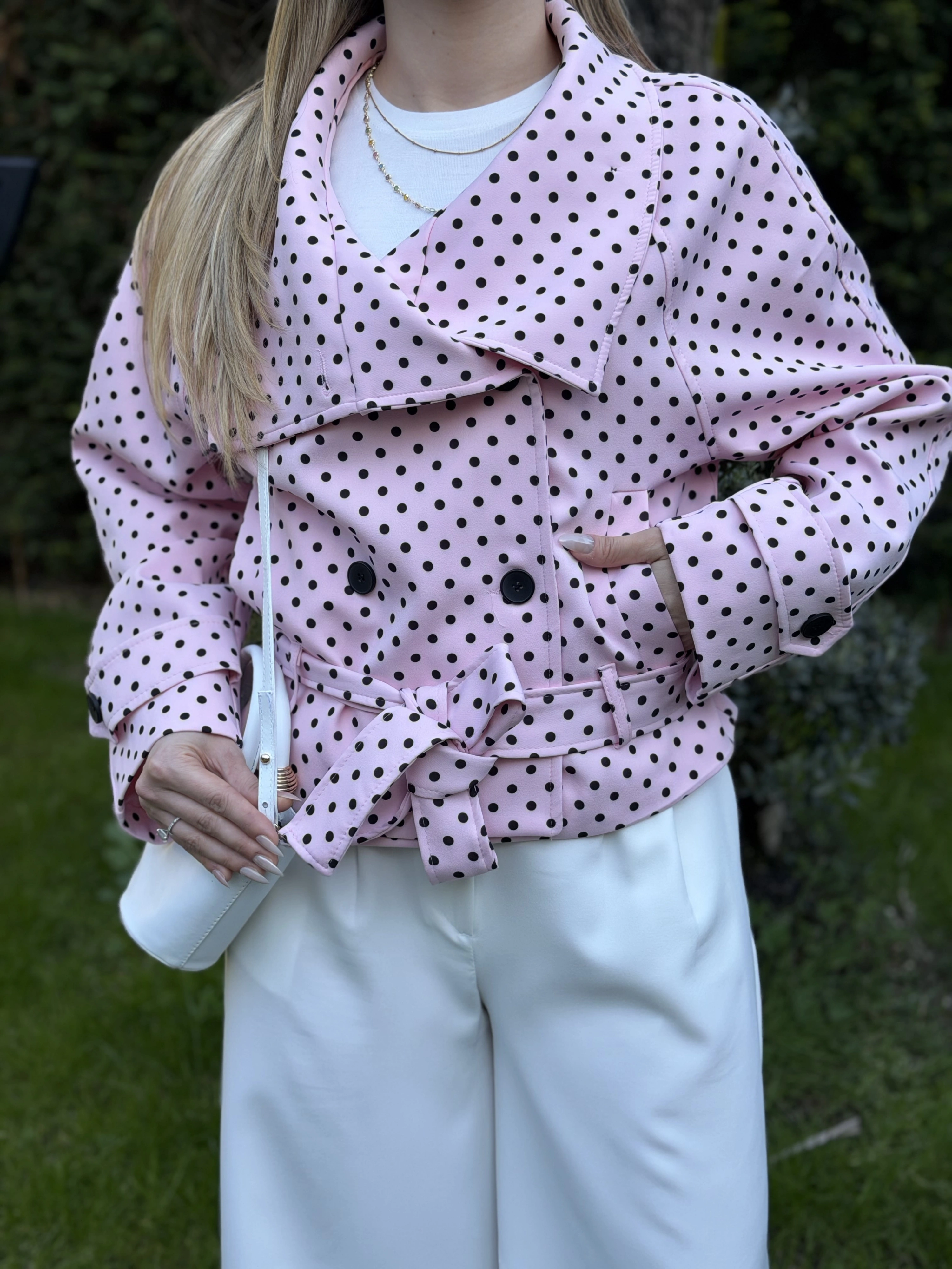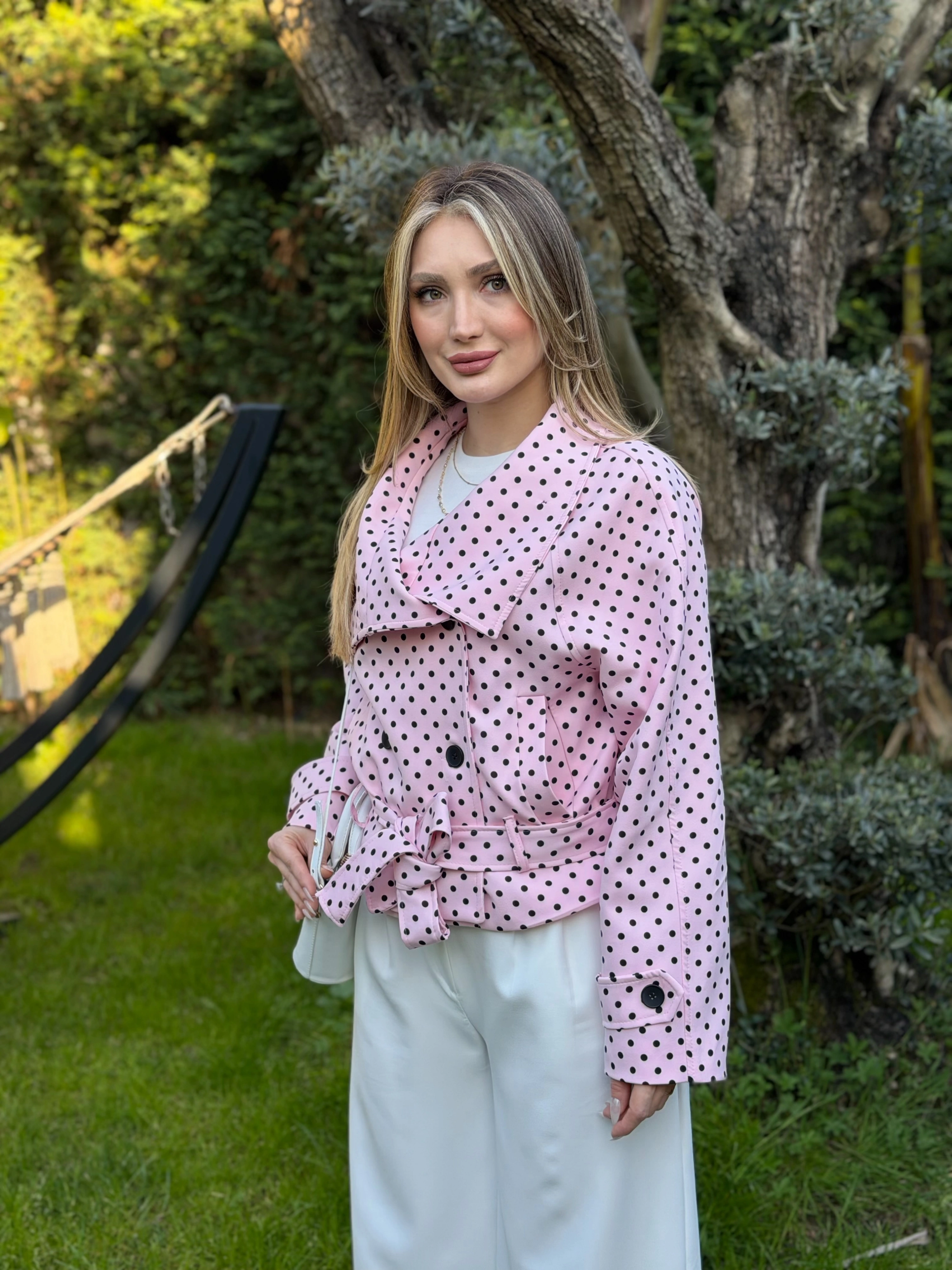 Puantiyeli yakalı astarlı kısa trenç pembe