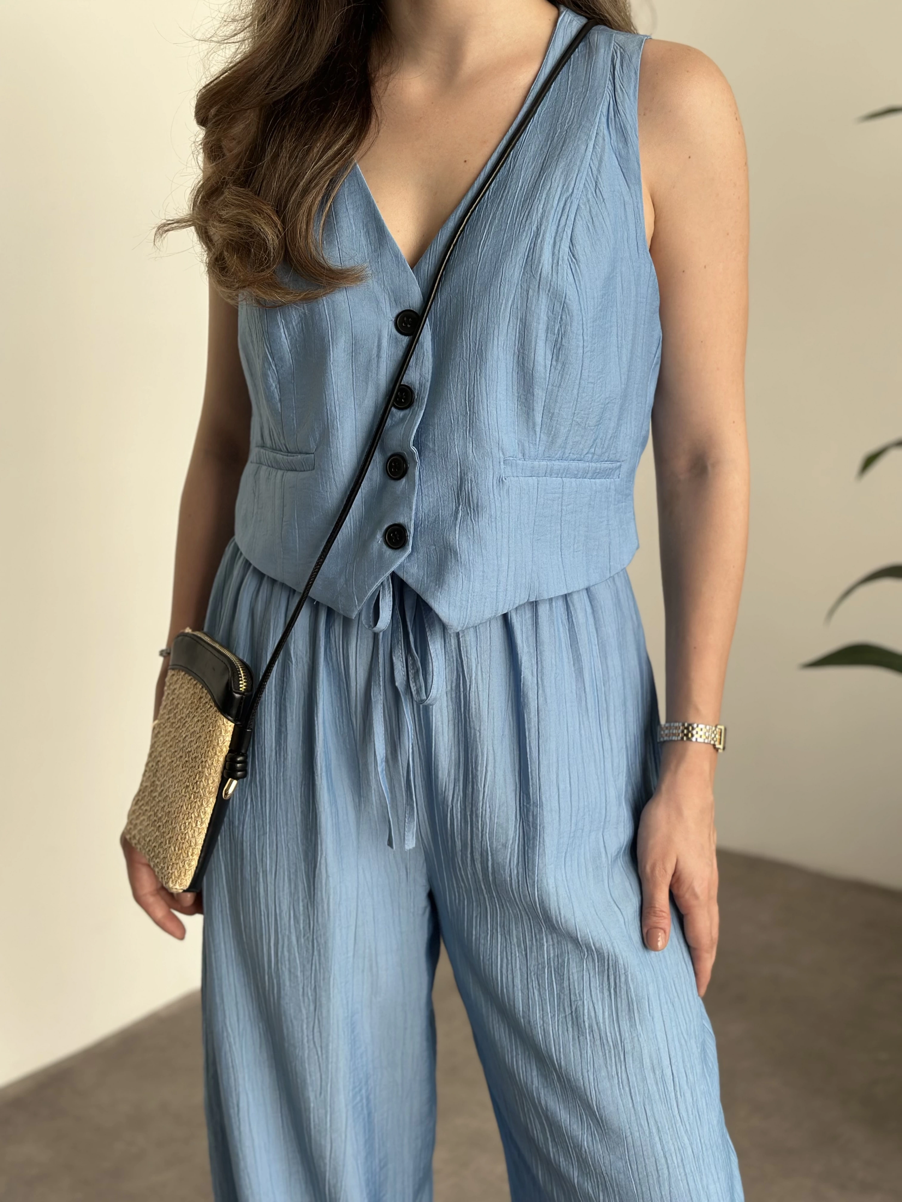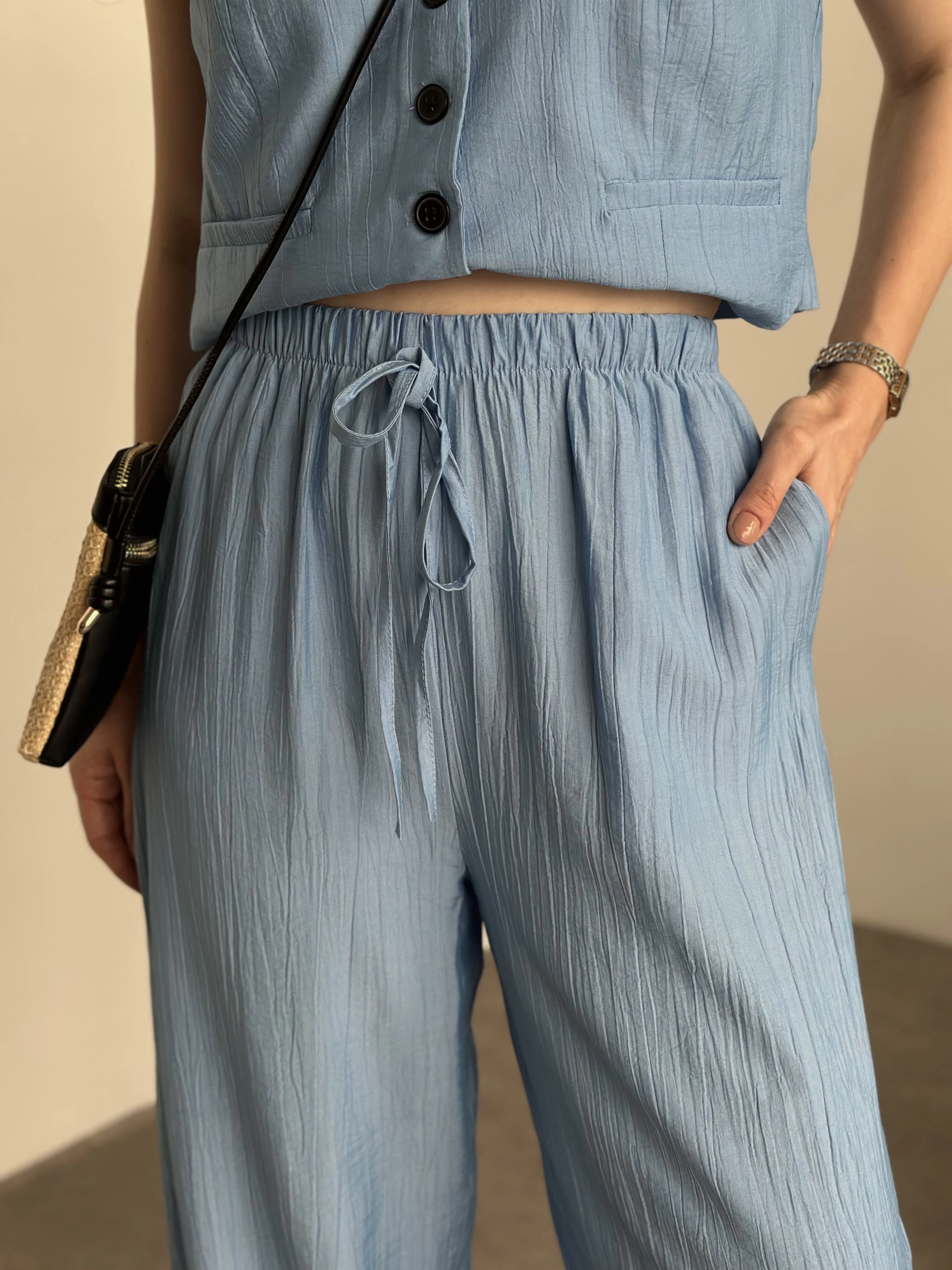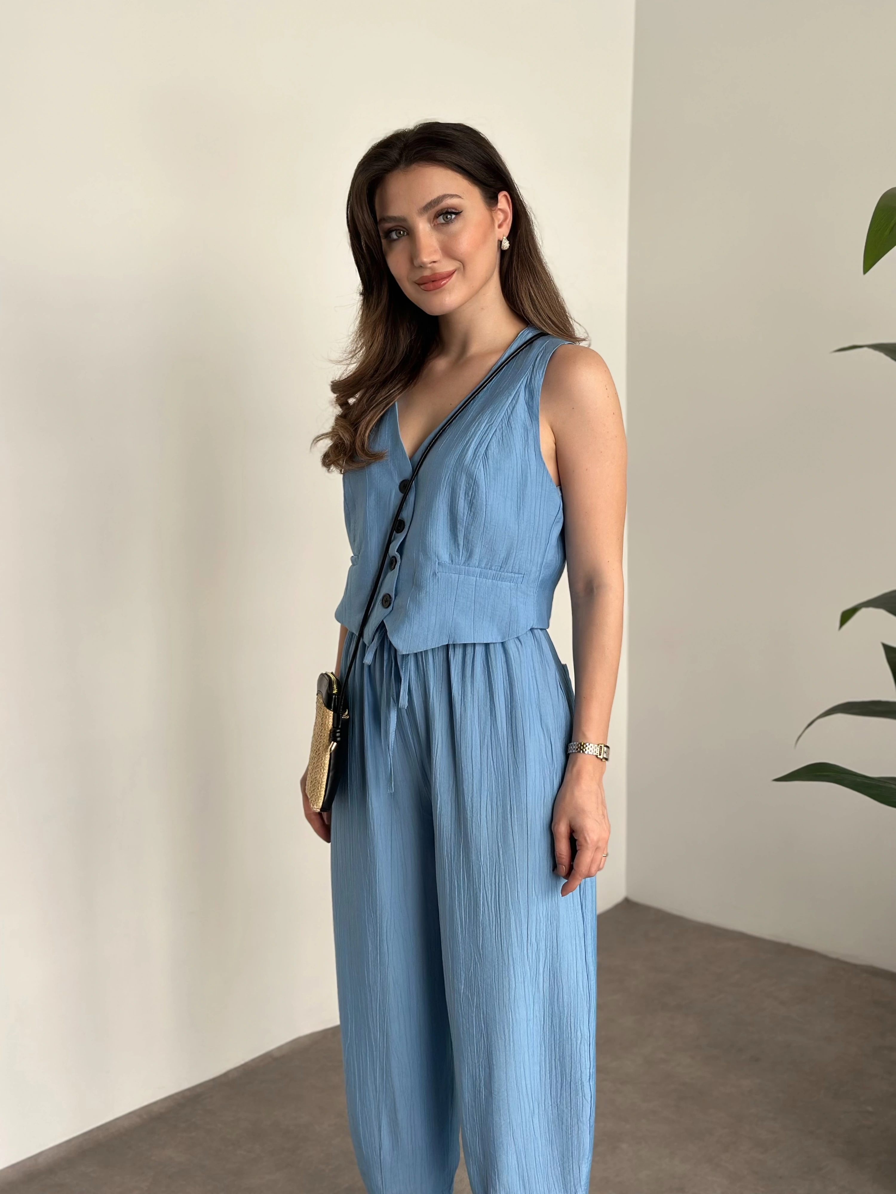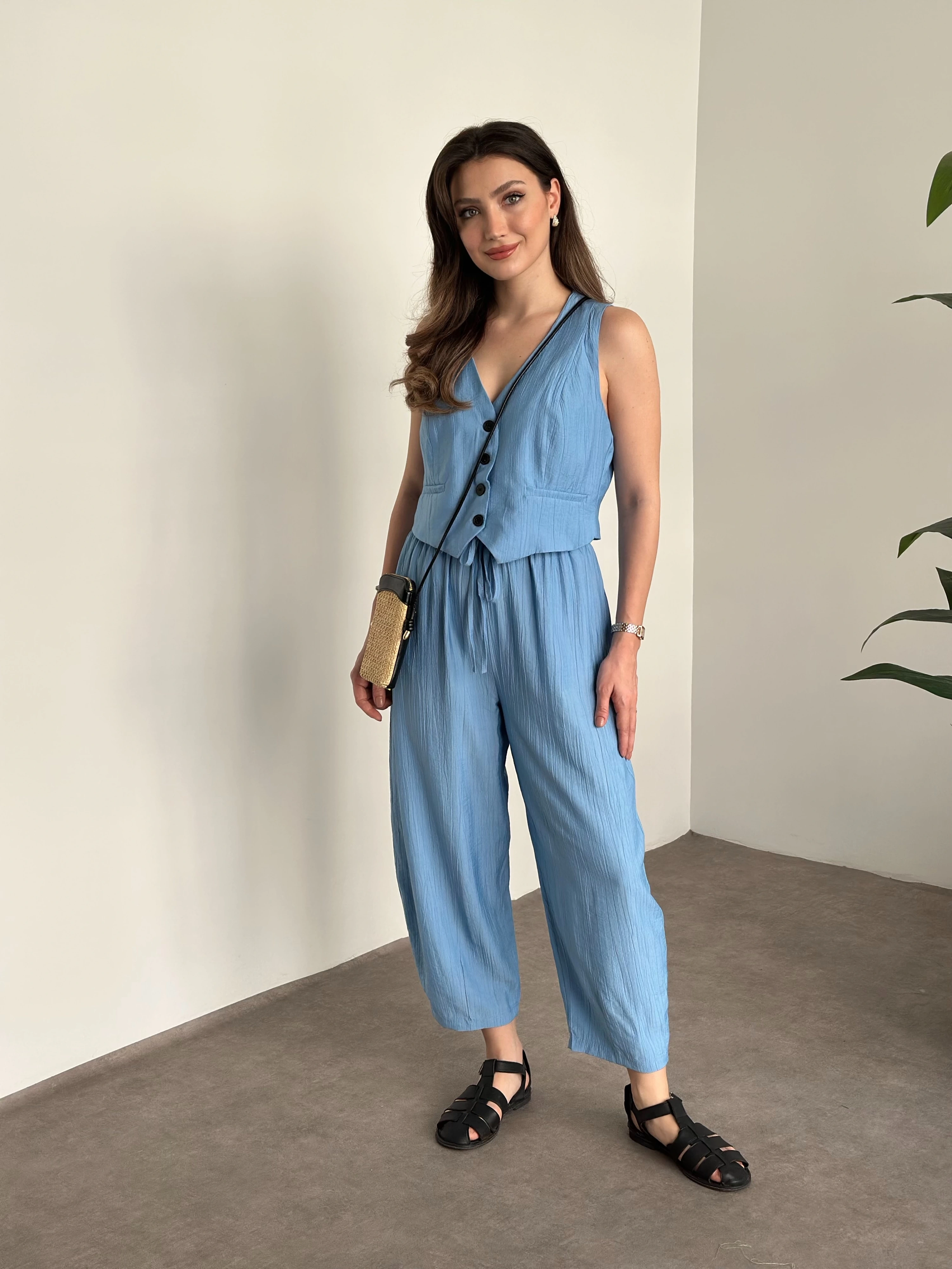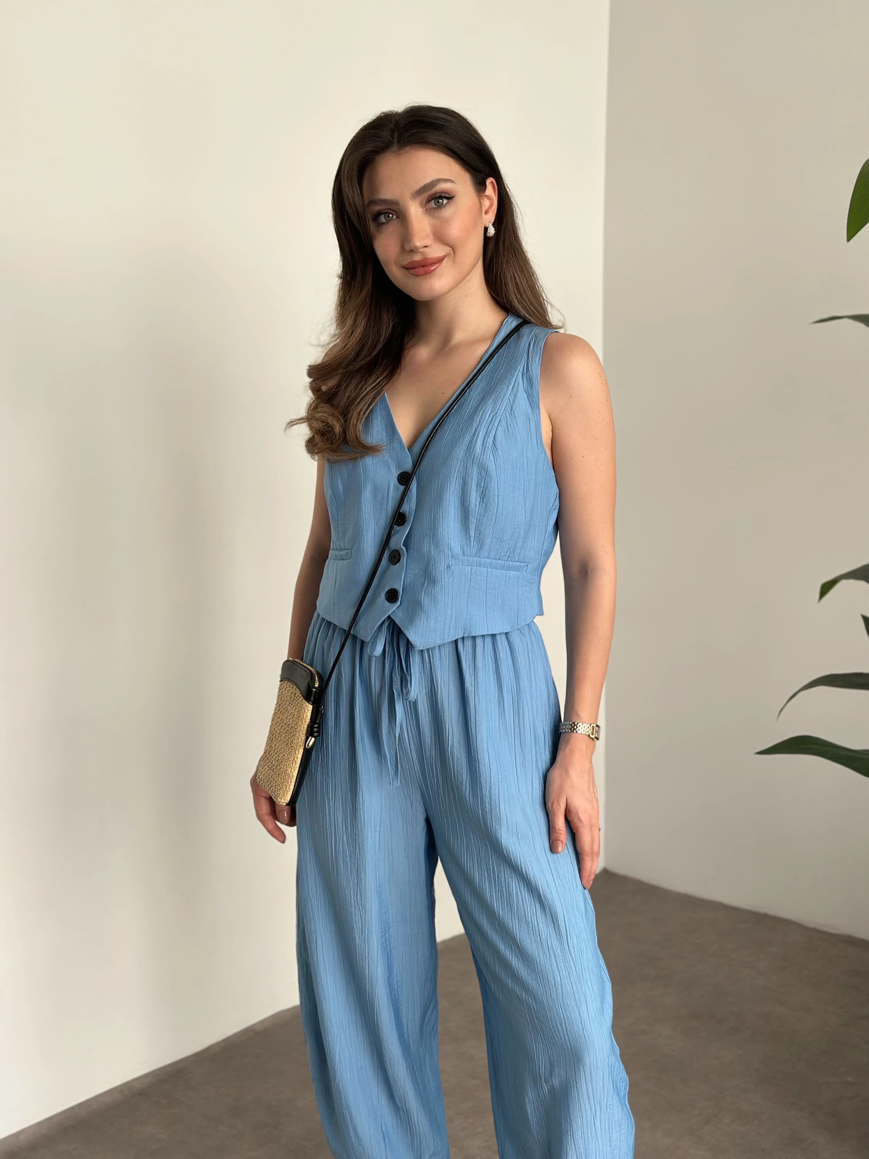 Şalvar kesim pantolon yelekli takım bebek mavisi