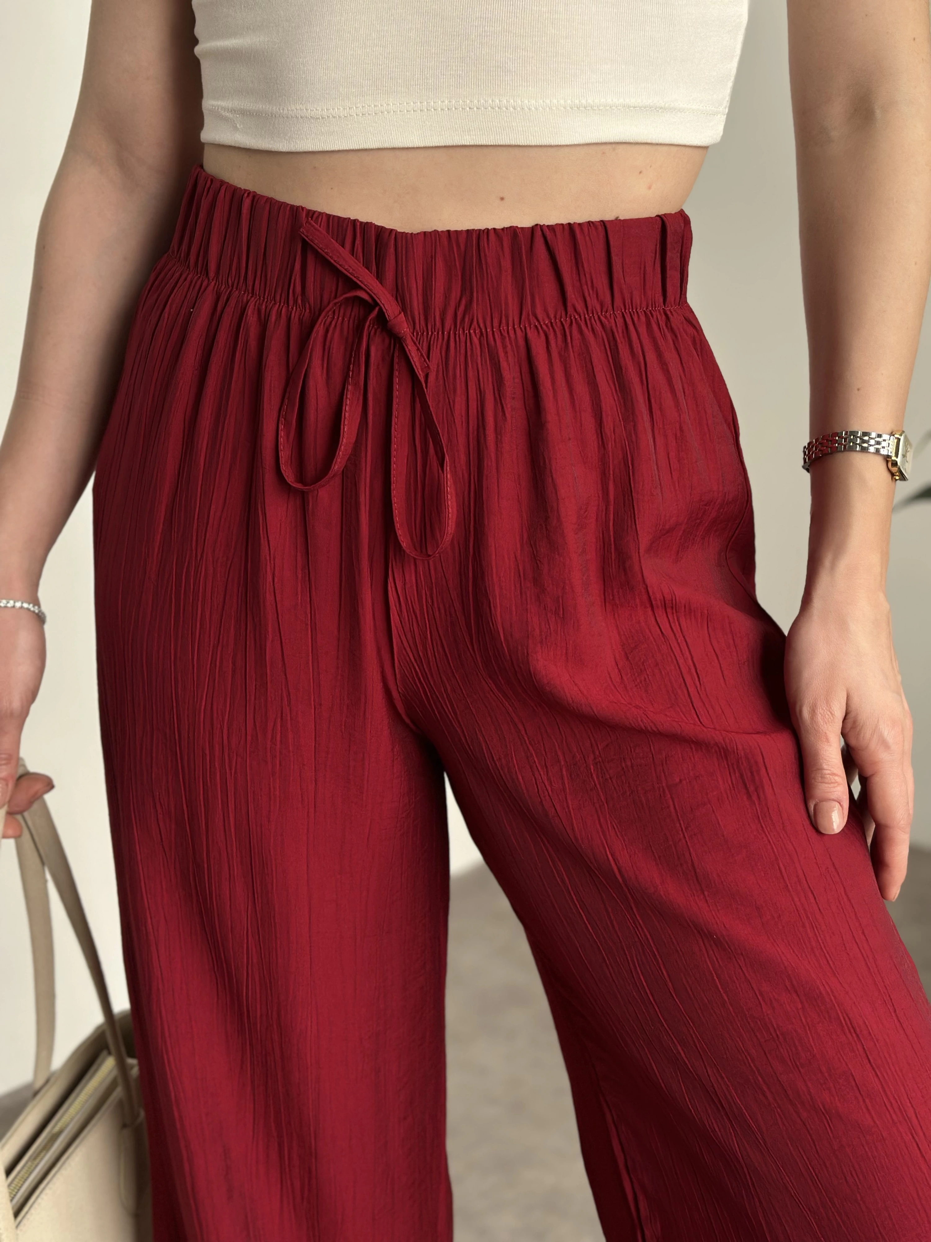 Enine boyuna likralı kemerli pantolon bordo