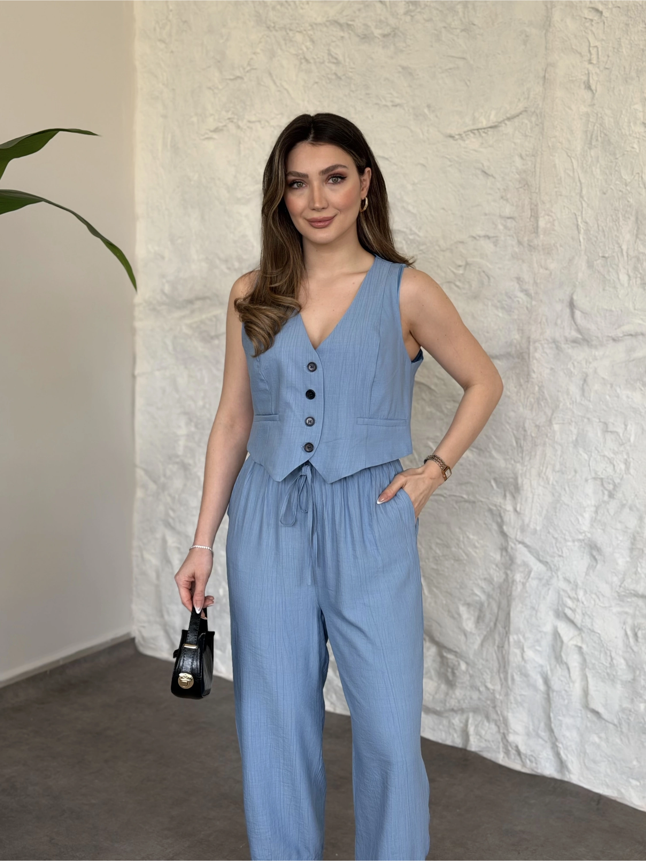 Şalvar pantolon yelekli takım bebek mavisi