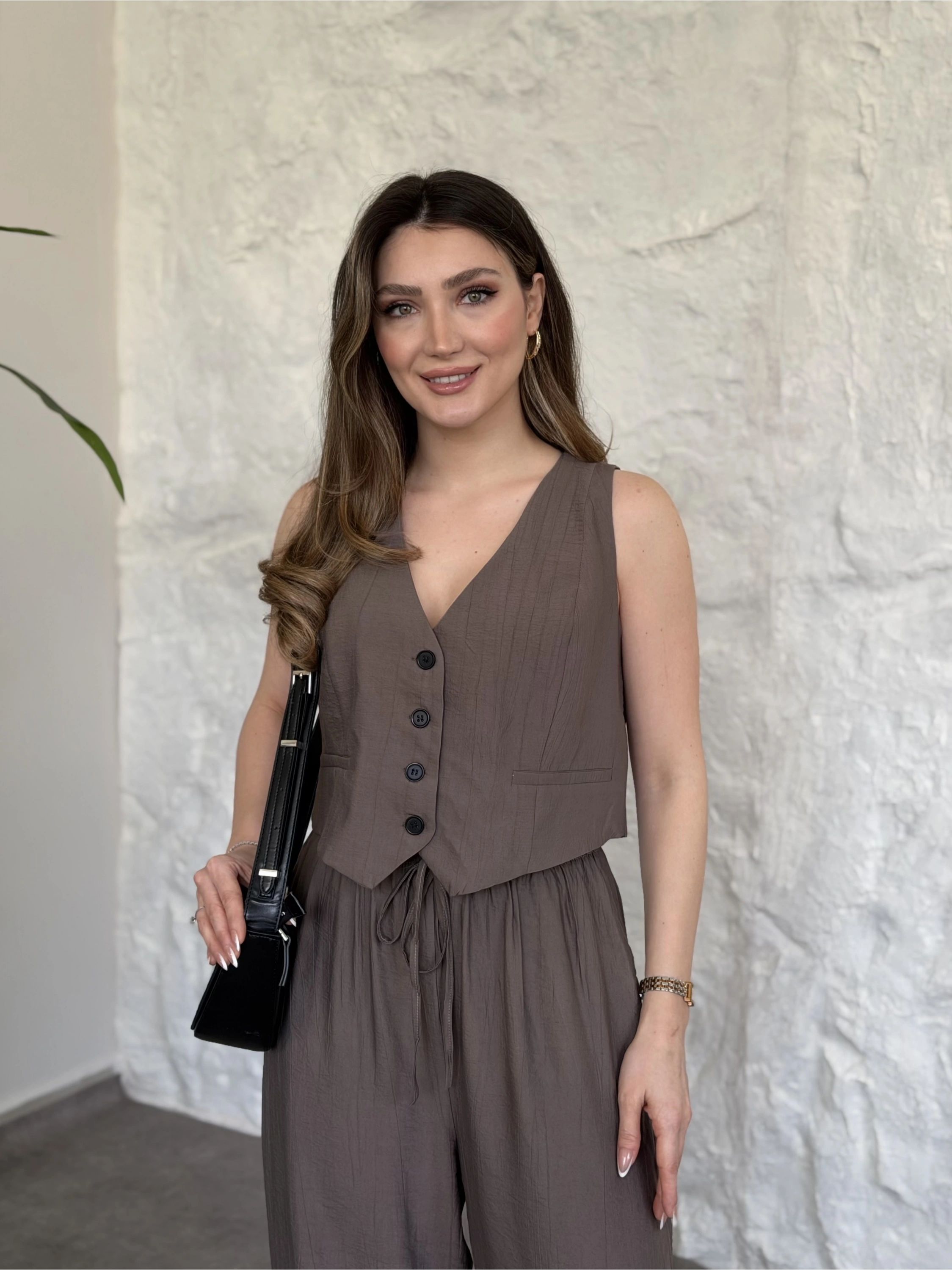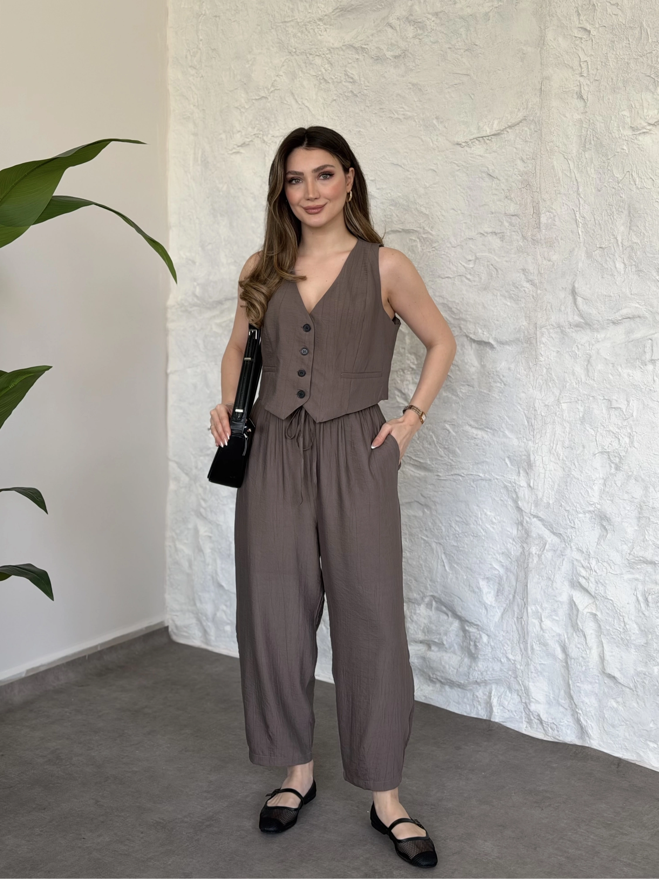 Düğme detaylı yelekli takım kahve