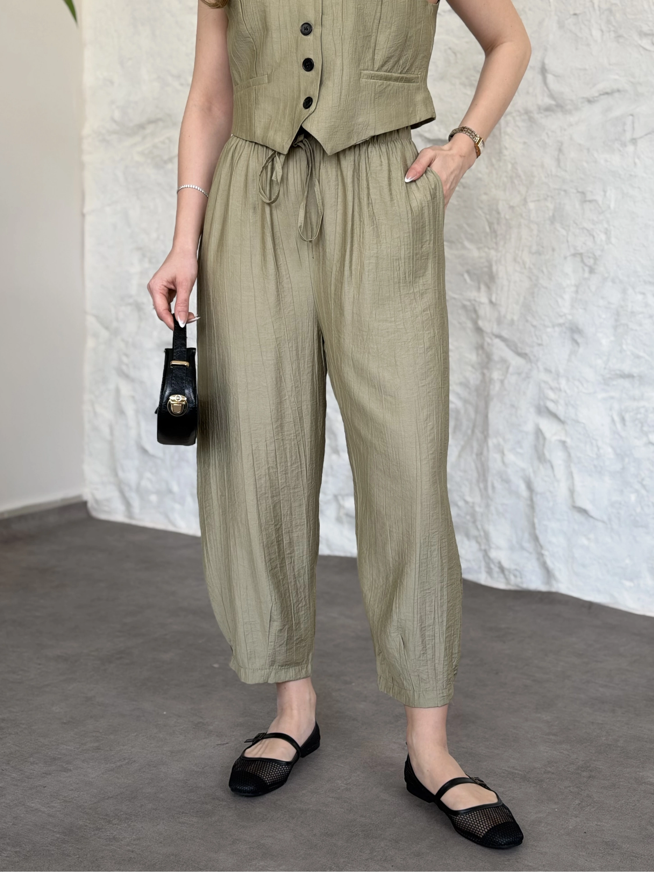 Trenç görünümlü belinden kuşaklı tivil takım yeşil