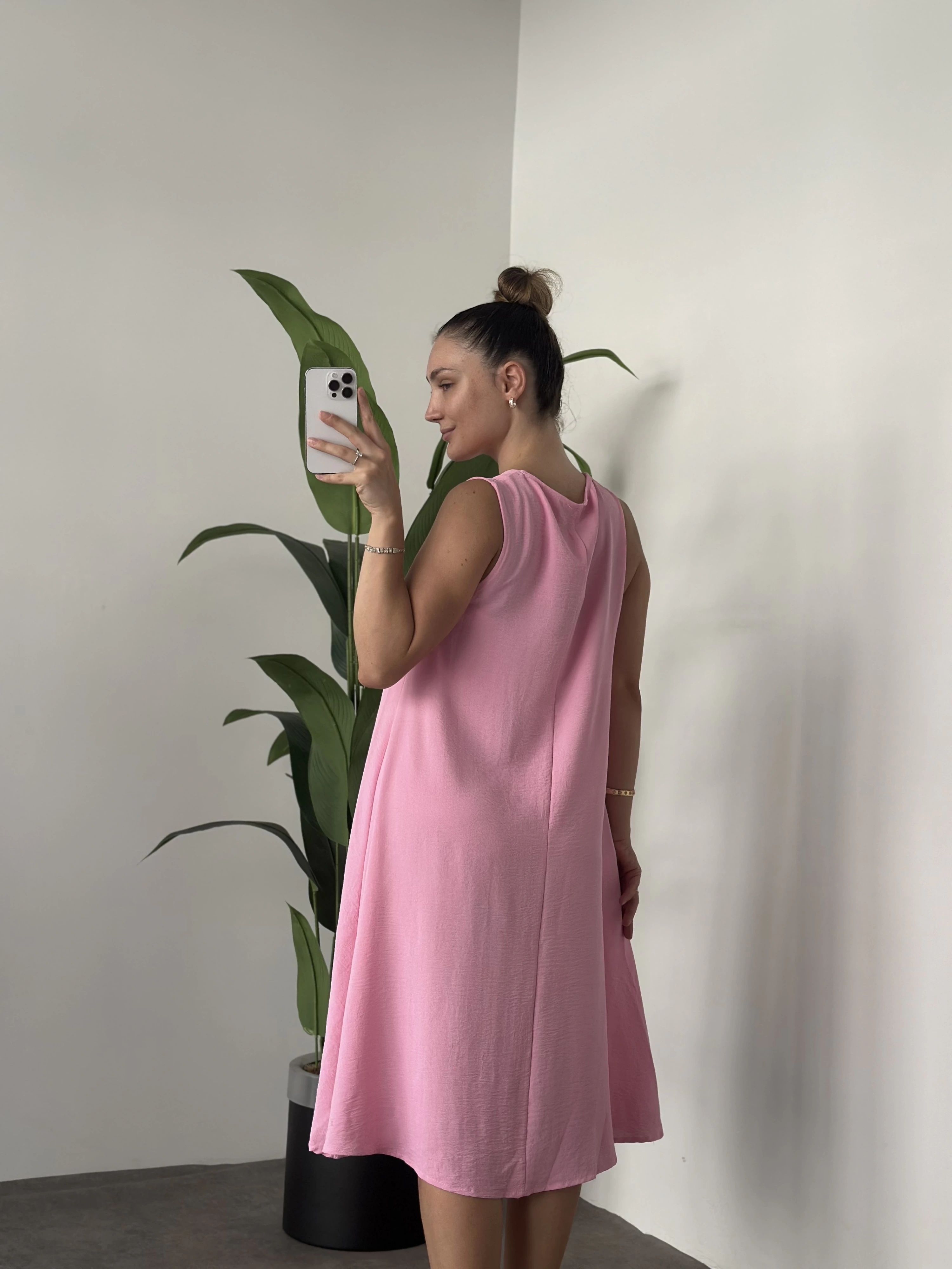 Sırt dekolteli askılı keten elbise bebek mavisi