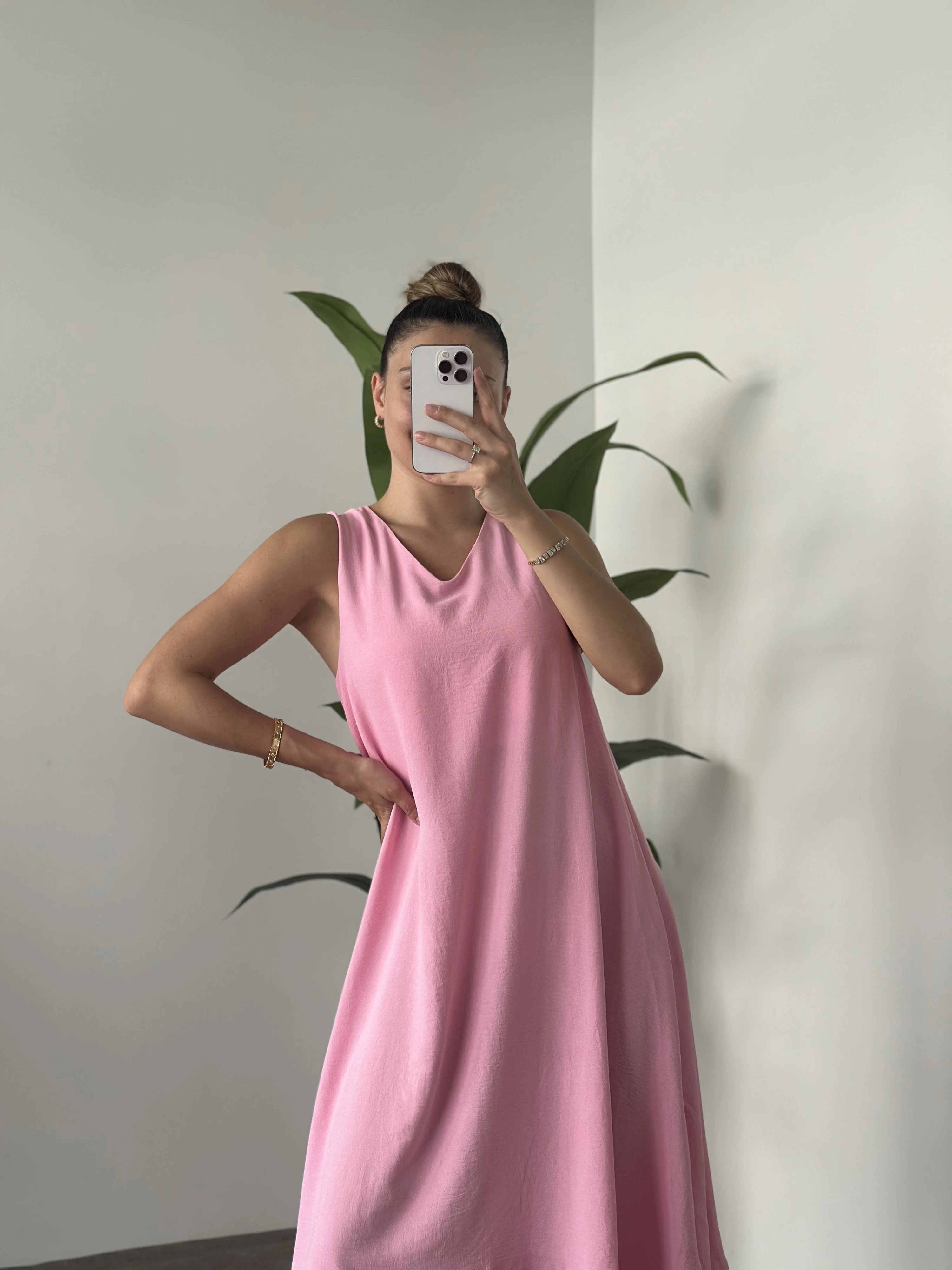 Sırt dekolteli askılı keten elbise yağ yeşili