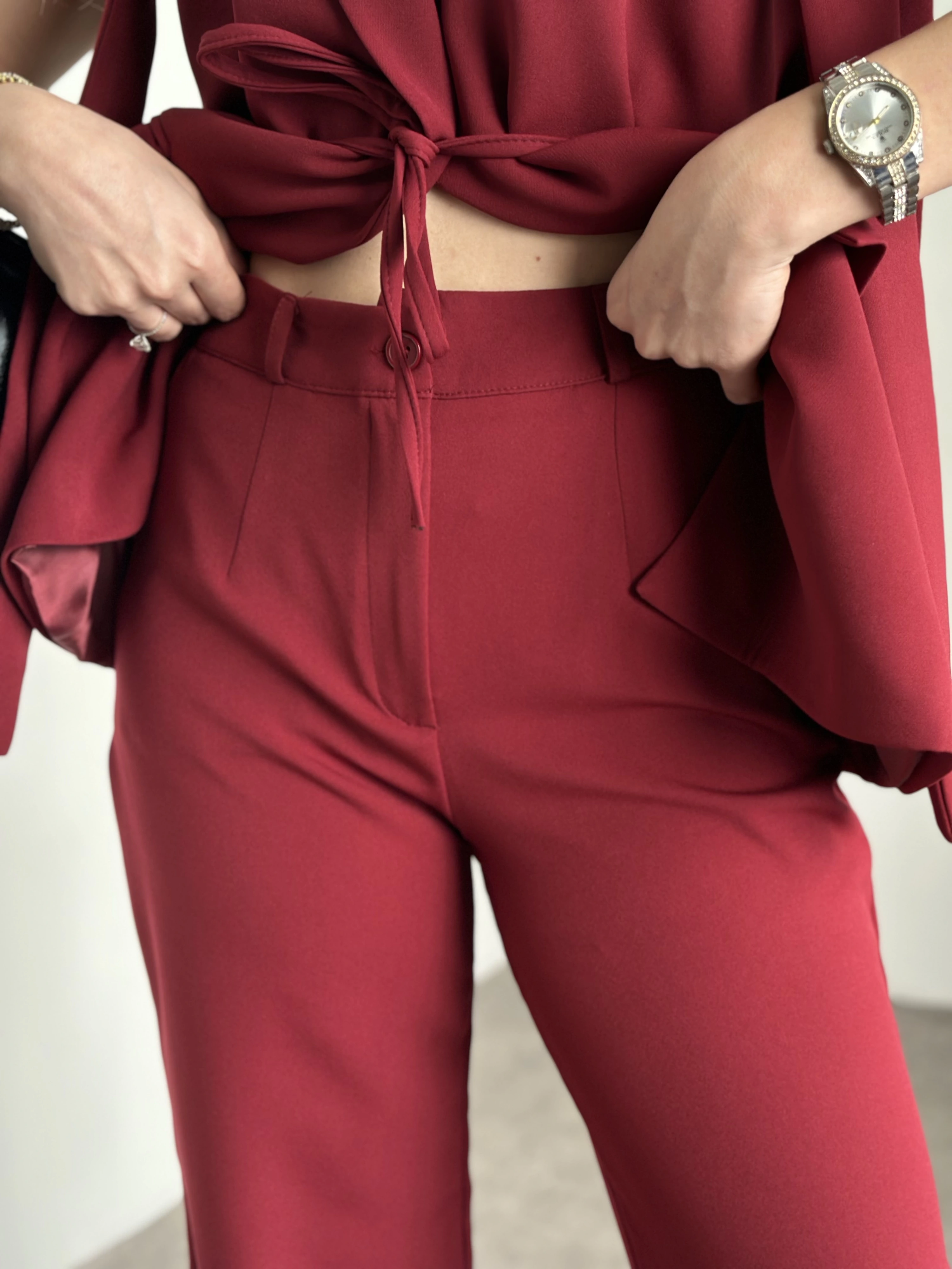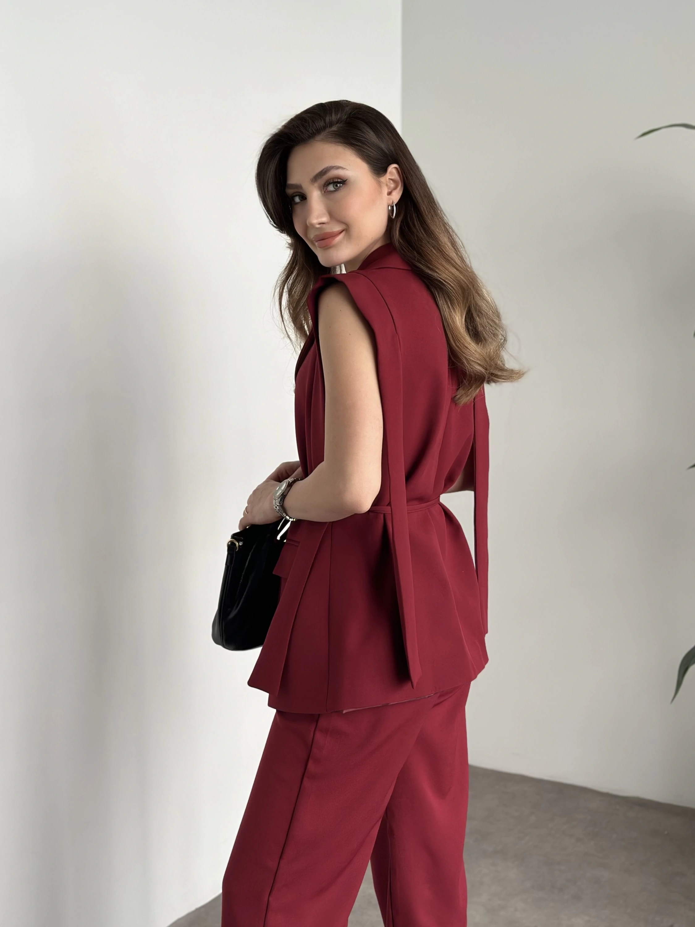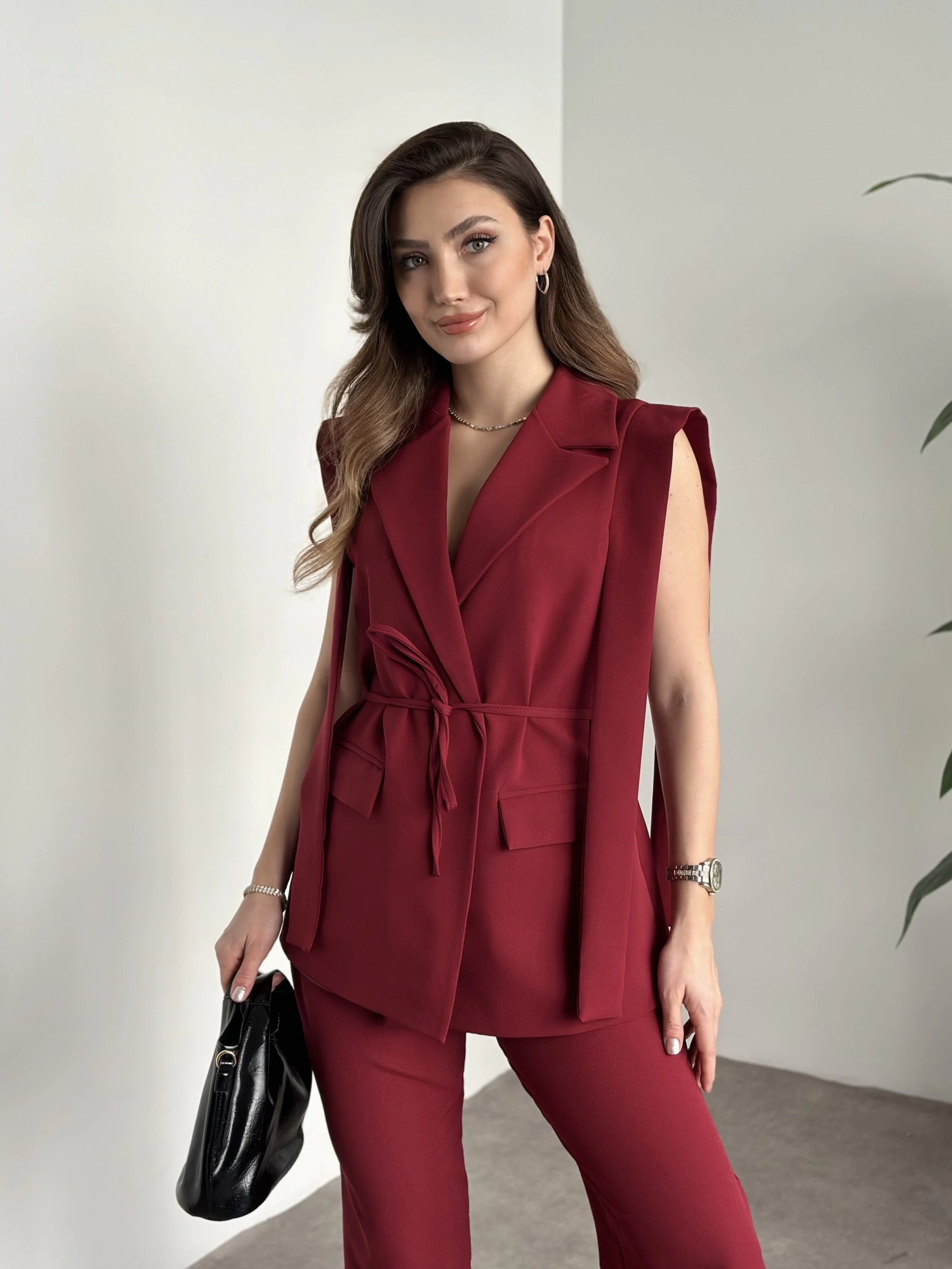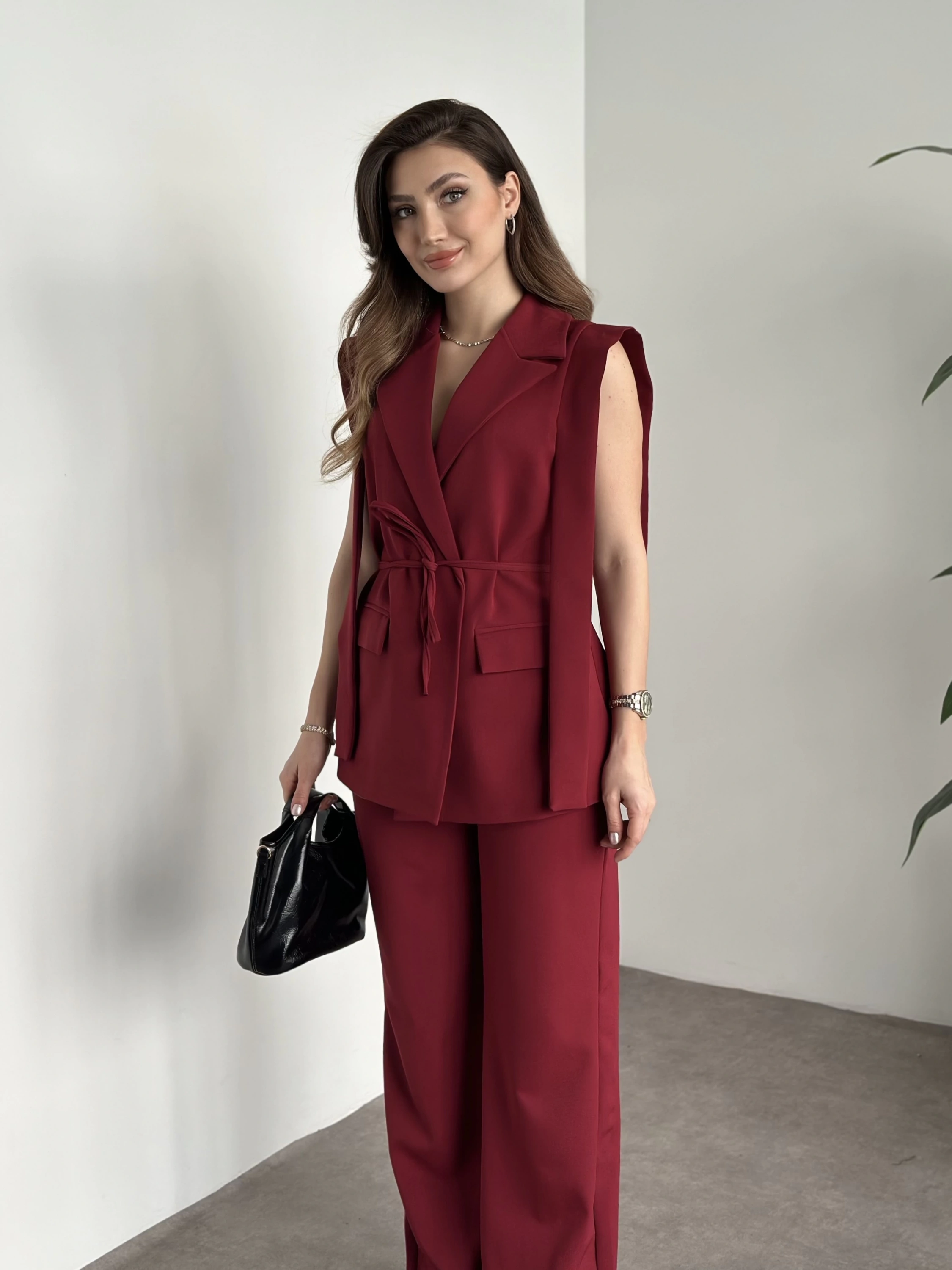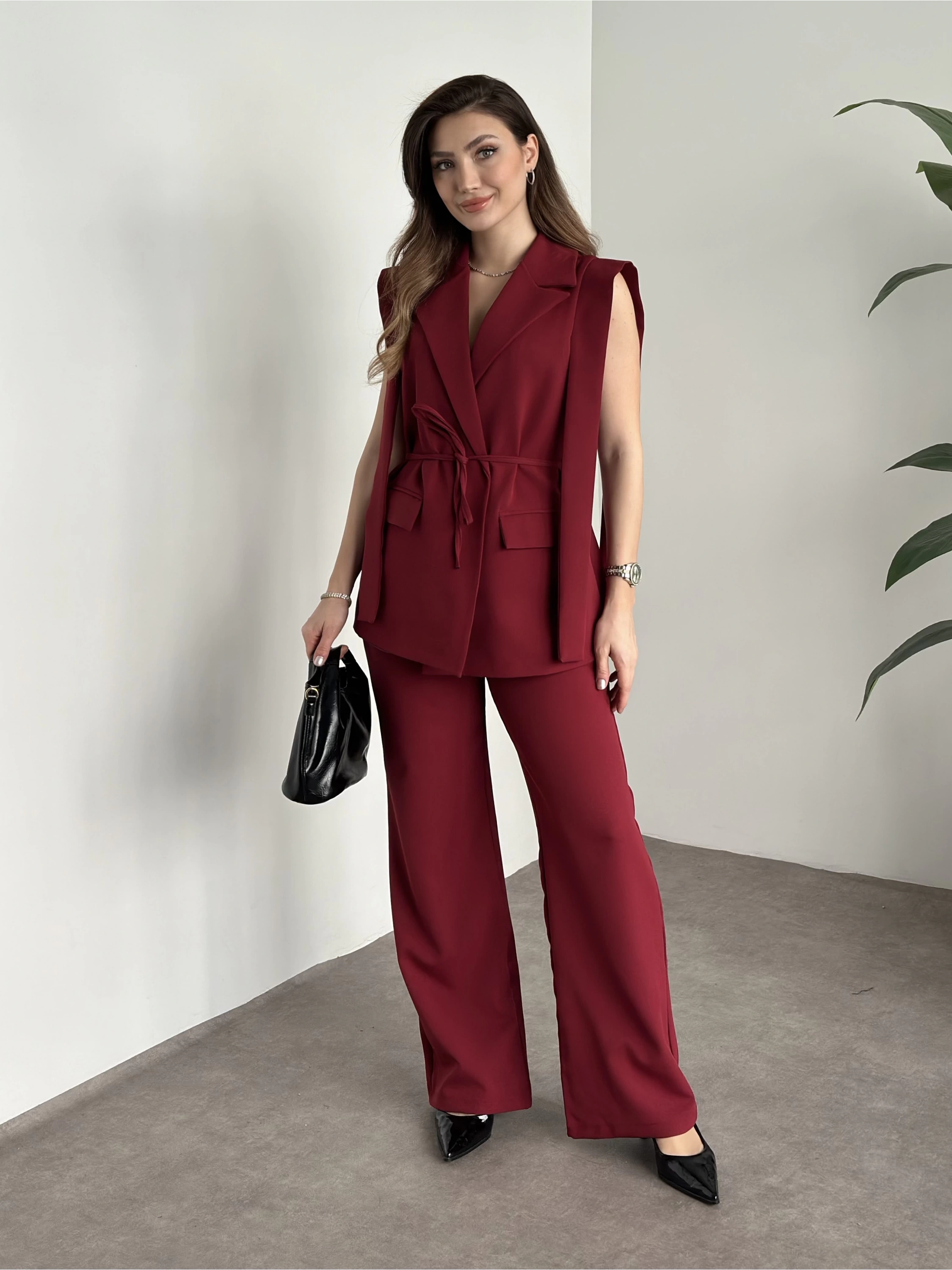 Sıfır kol belden bağlamalı kumaş takım bordo
