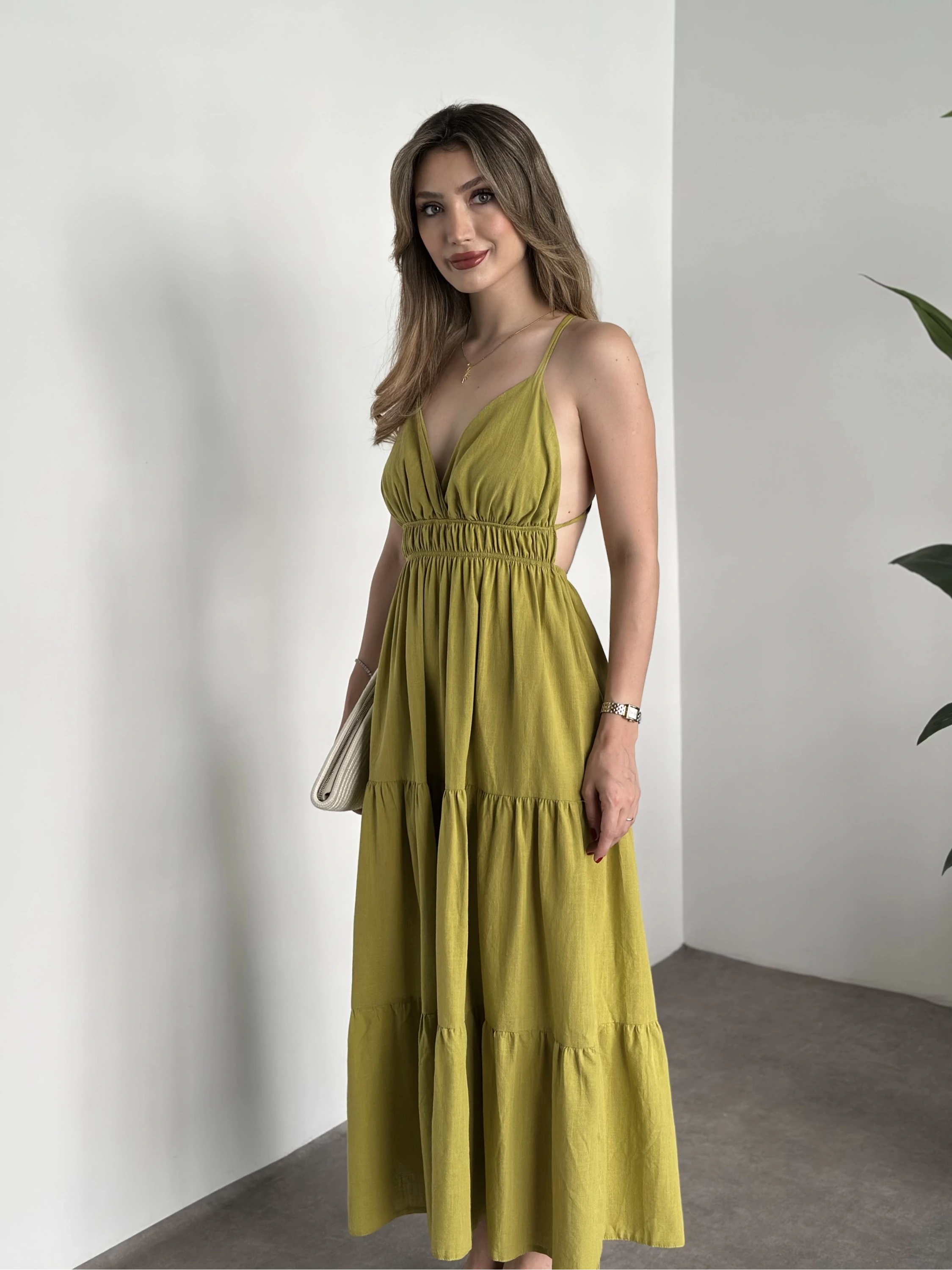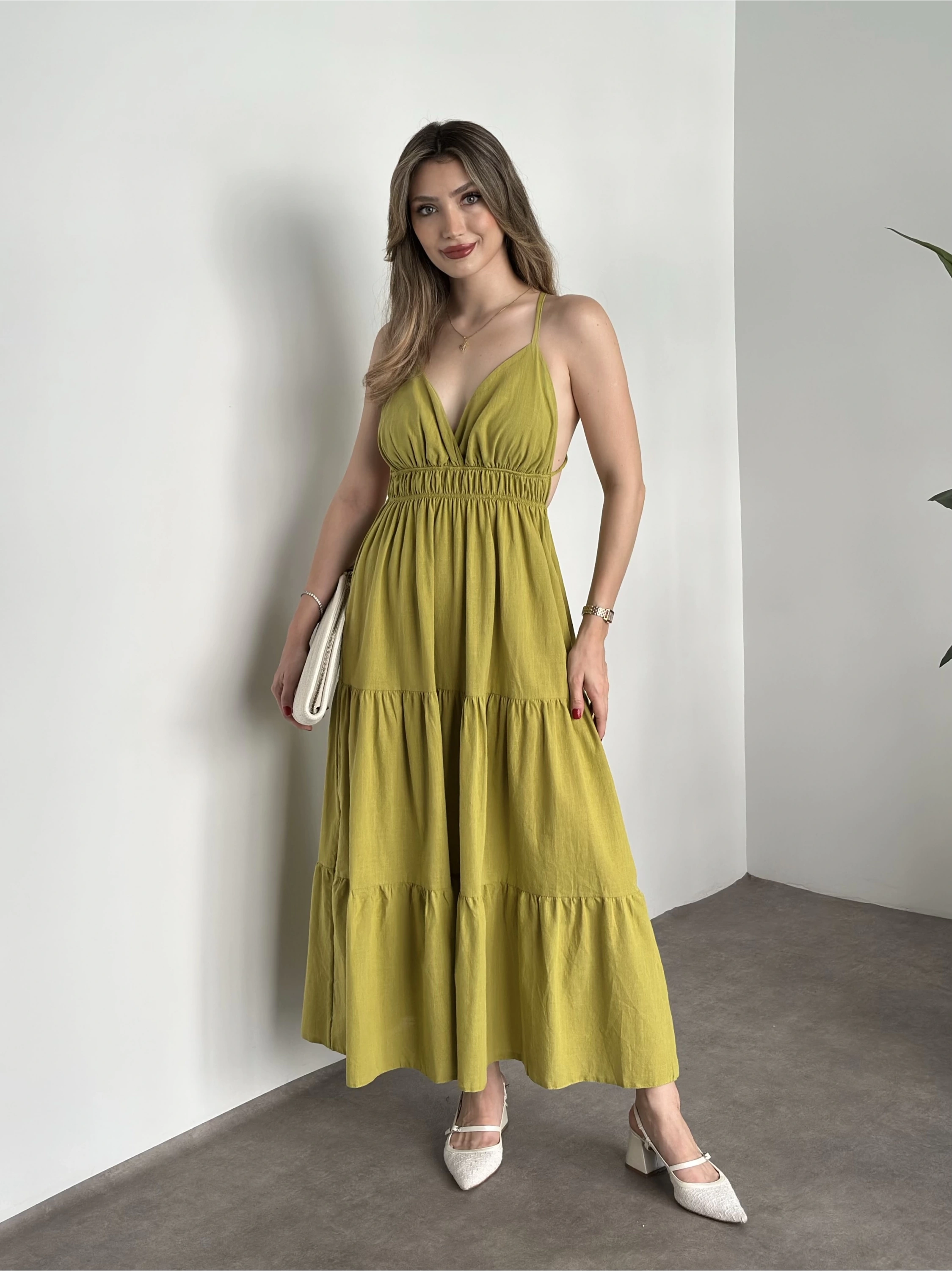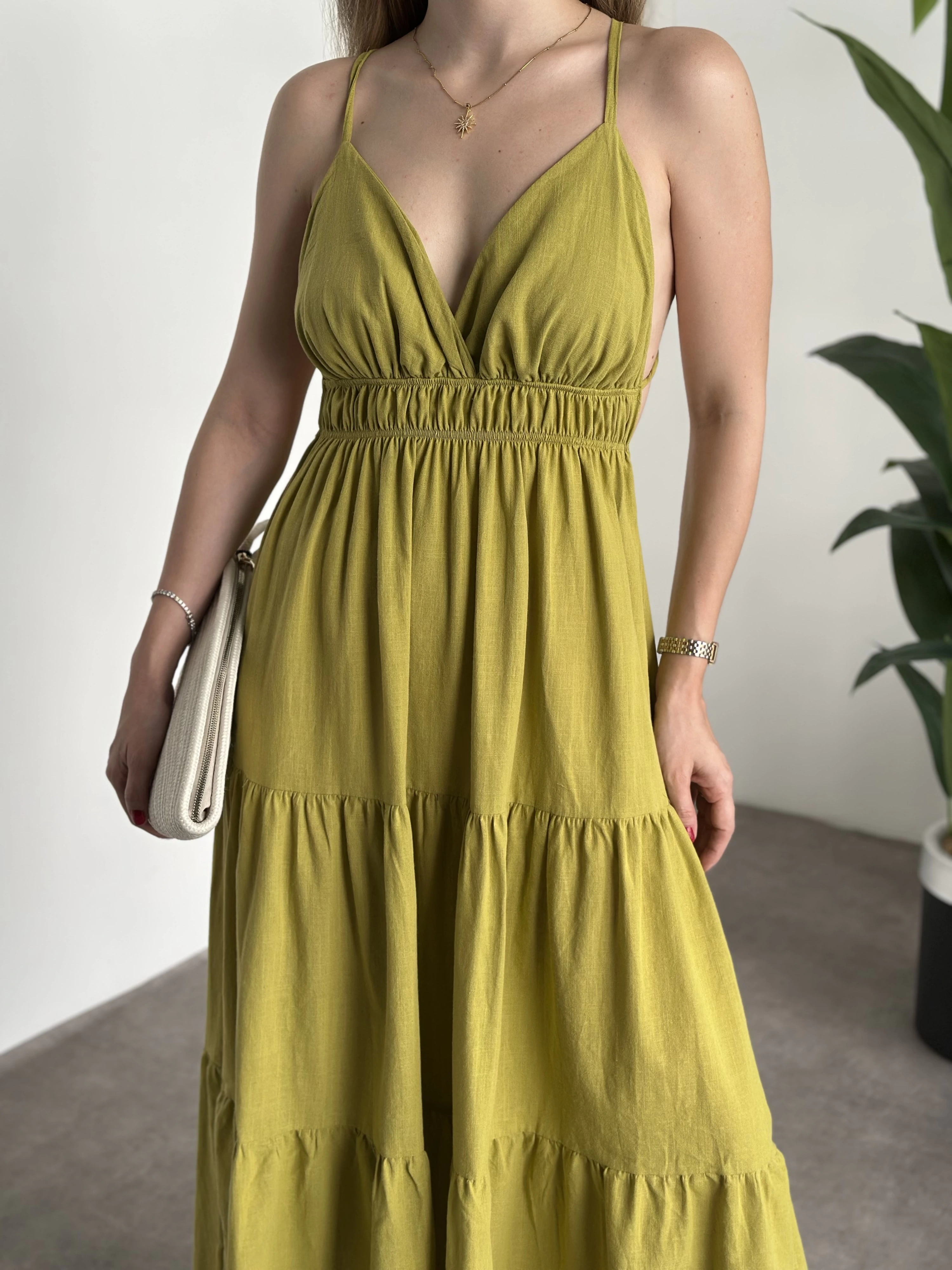 Sırt dekolteli askılı keten elbise yağ yeşili