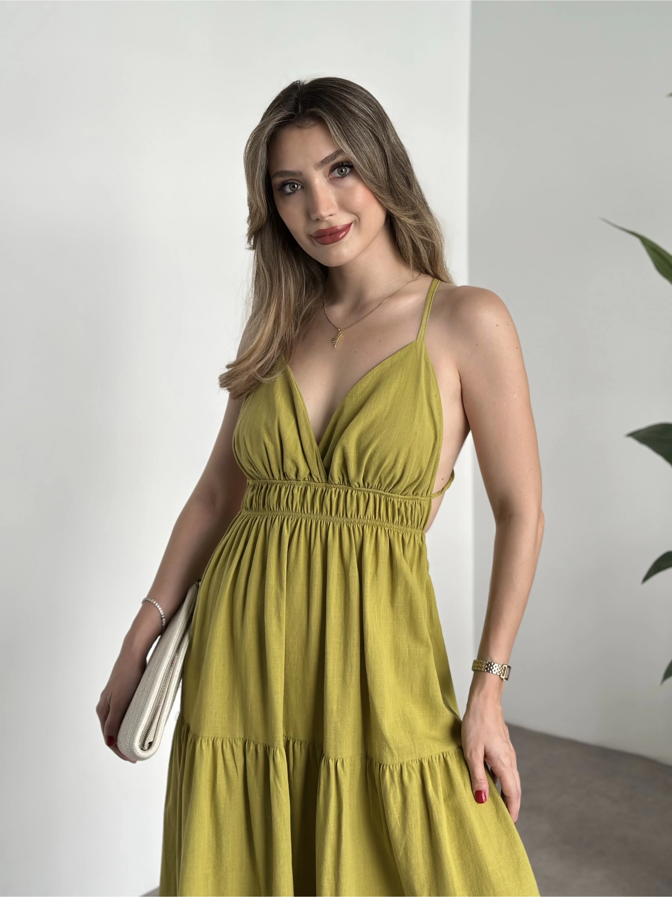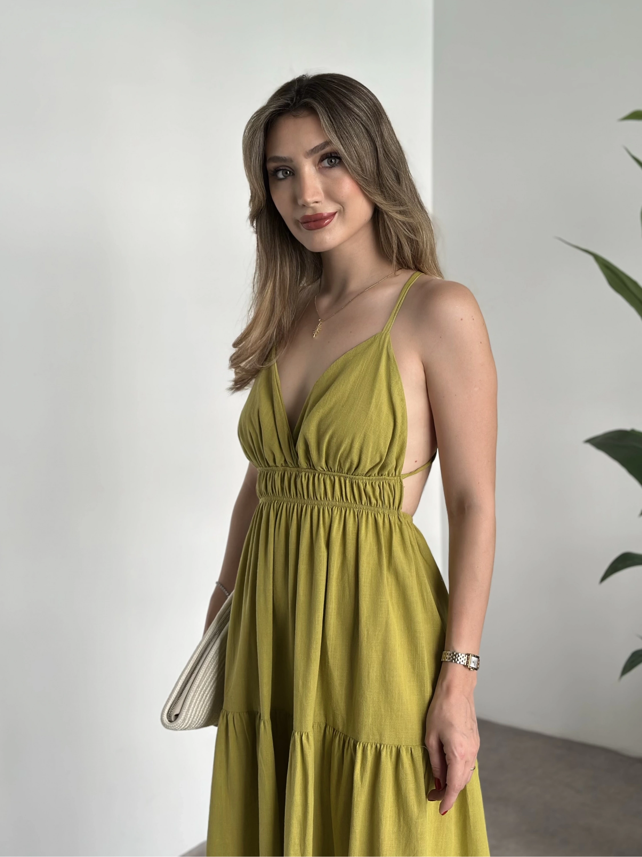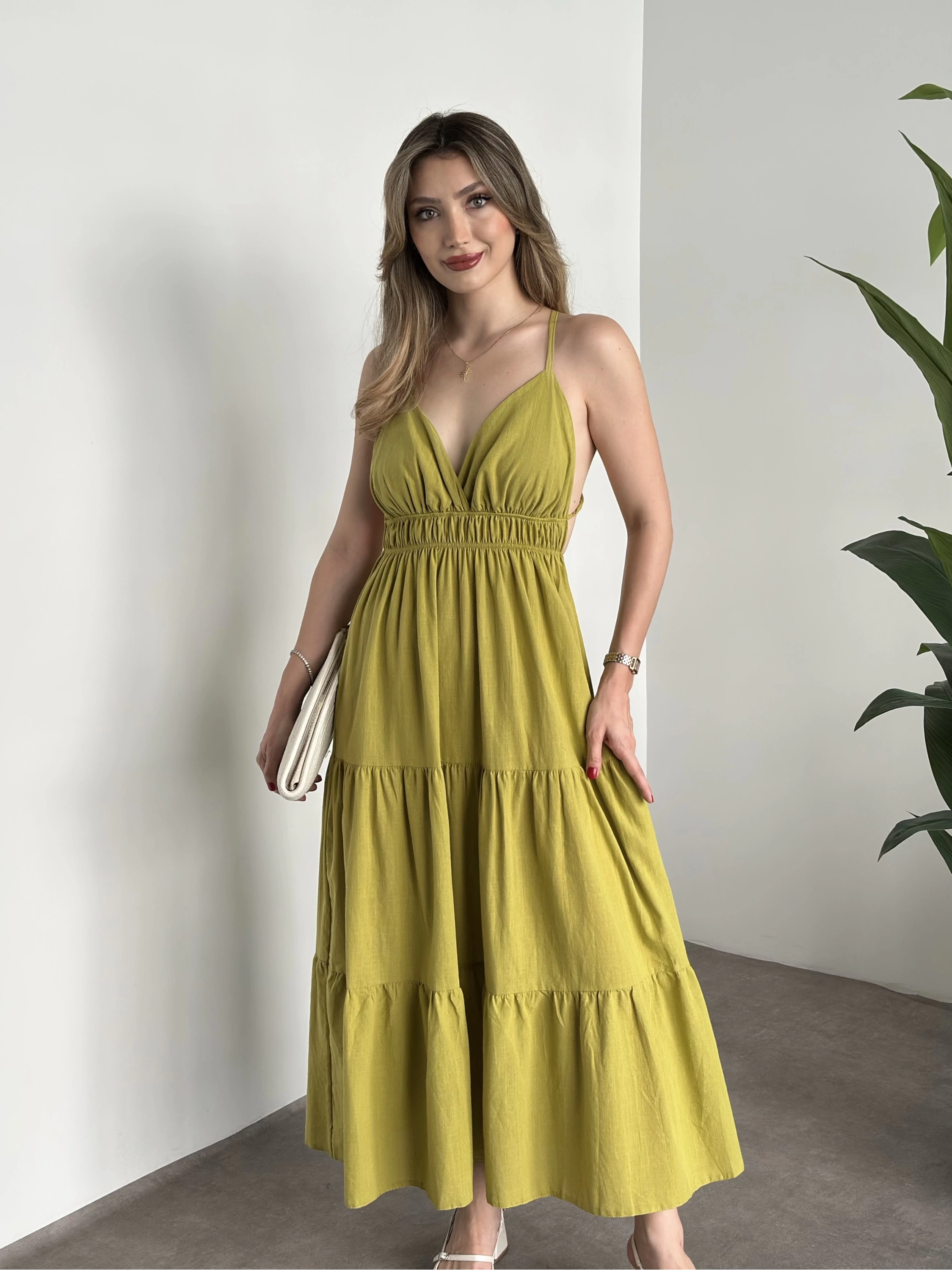 Sırt dekolteli askılı keten elbise yağ yeşili