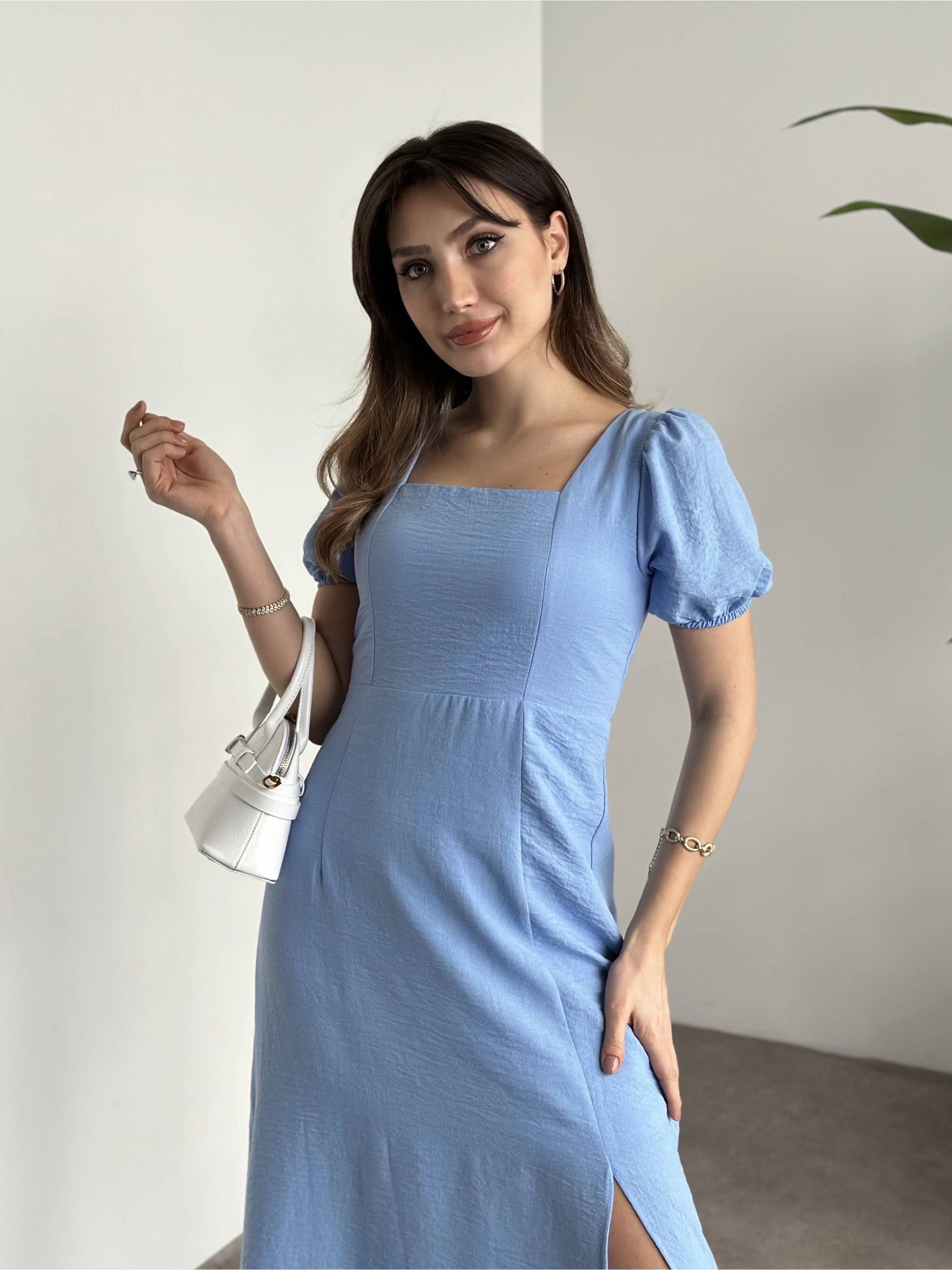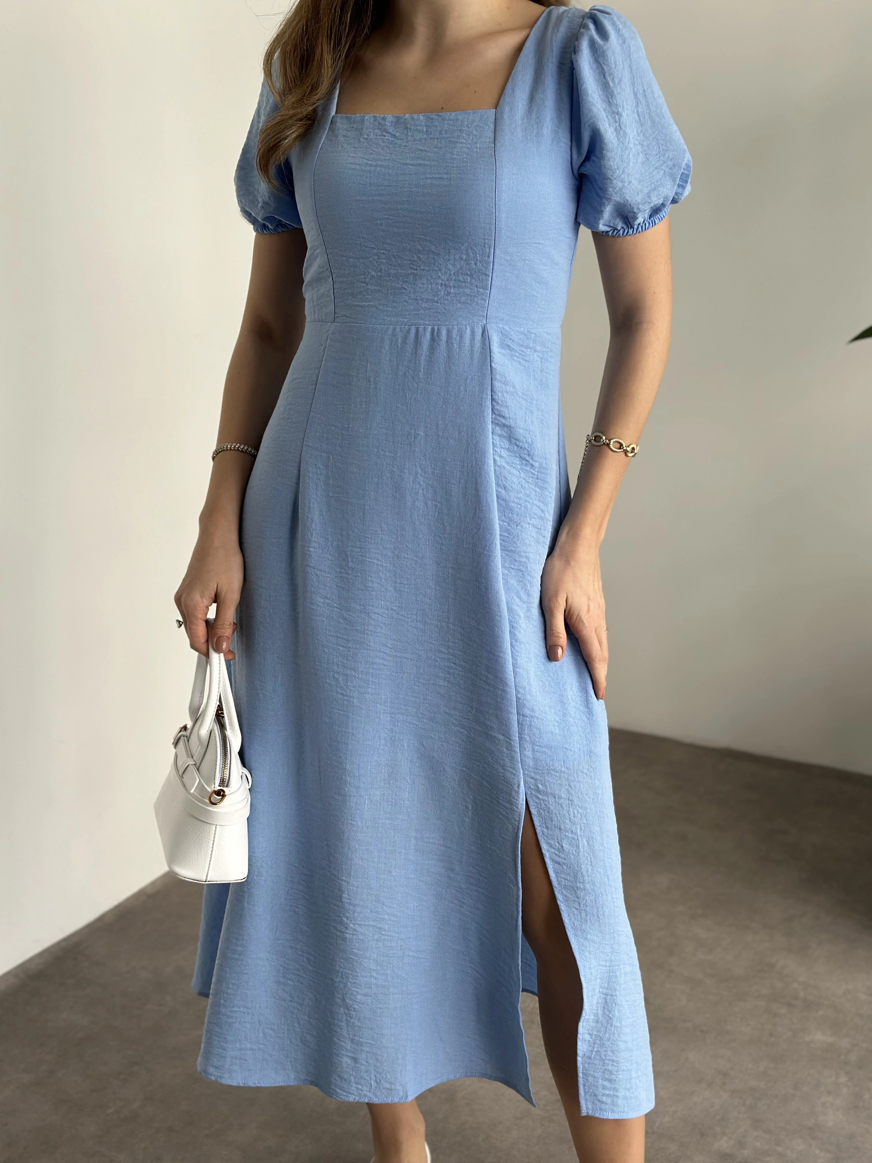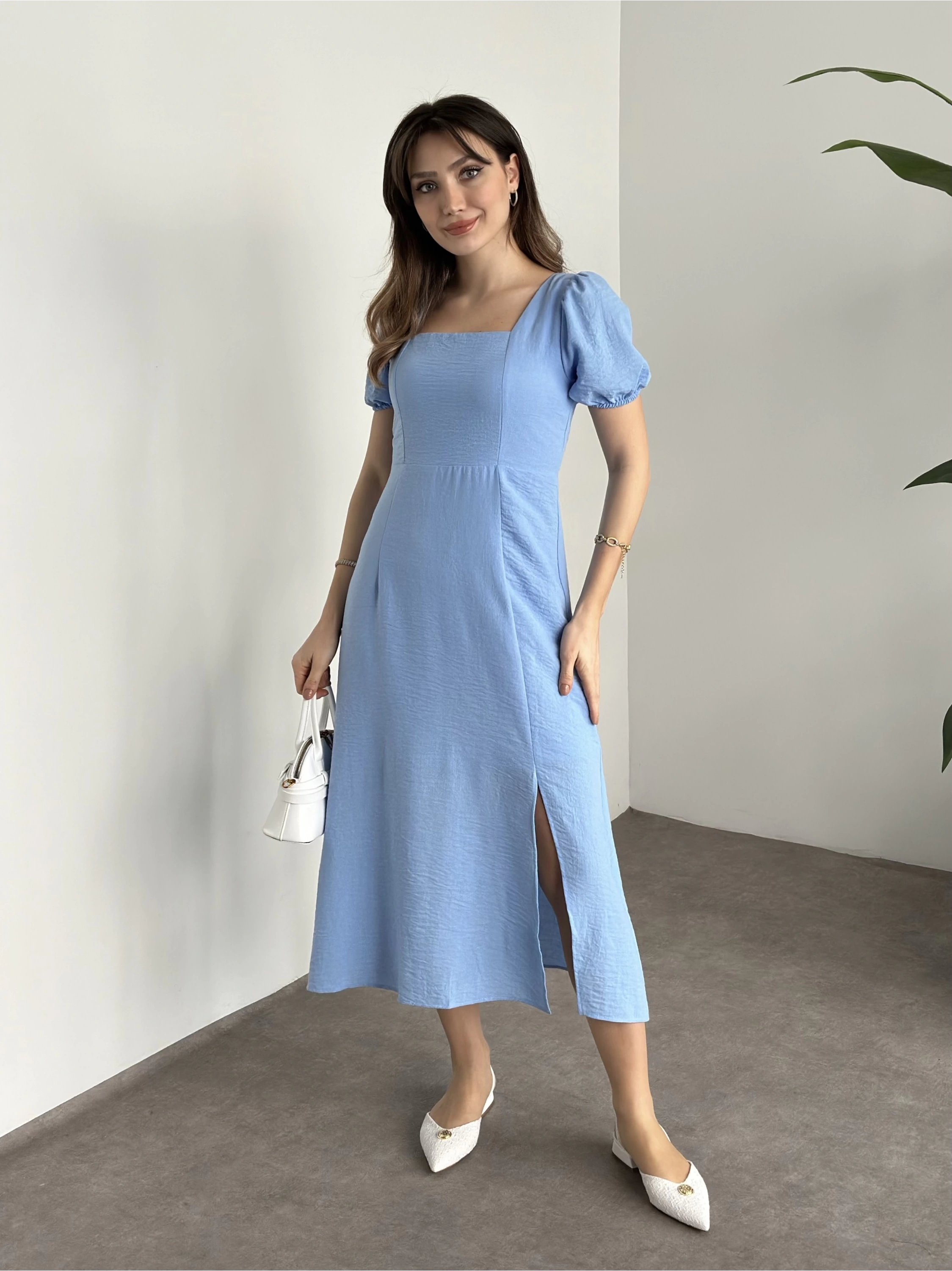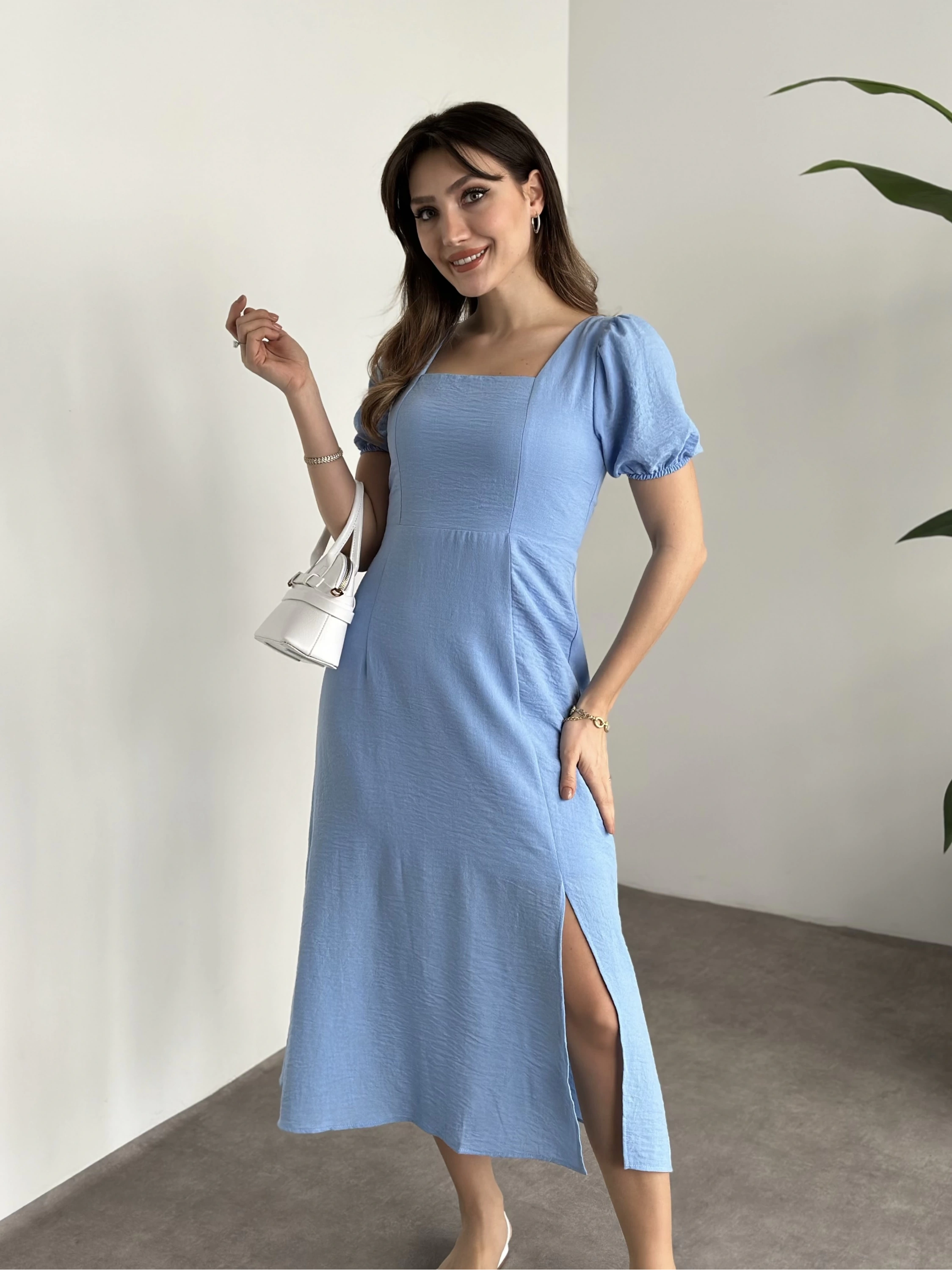 Sırt dekolteli ve yırtmaçlı keten elbise mavi