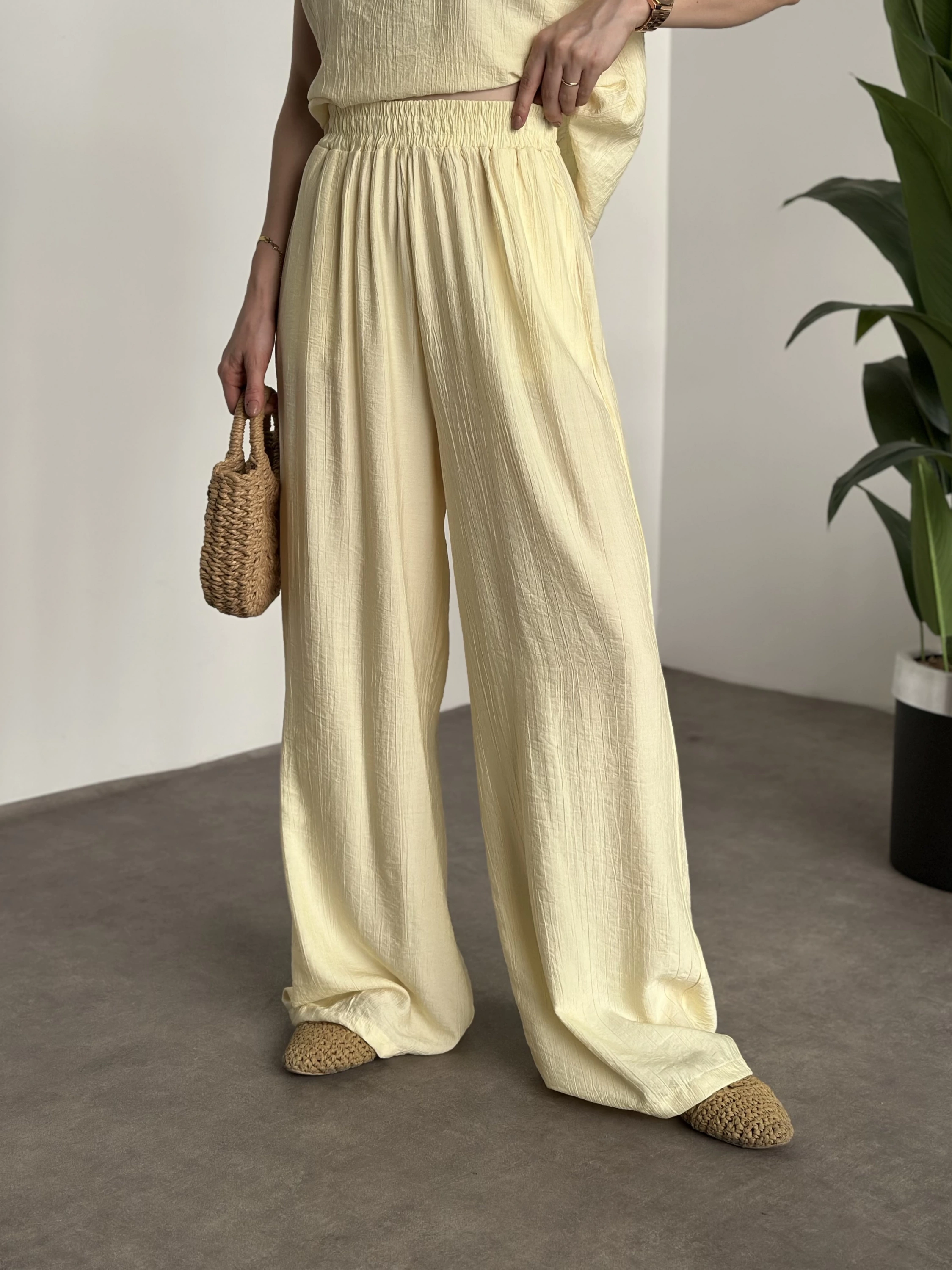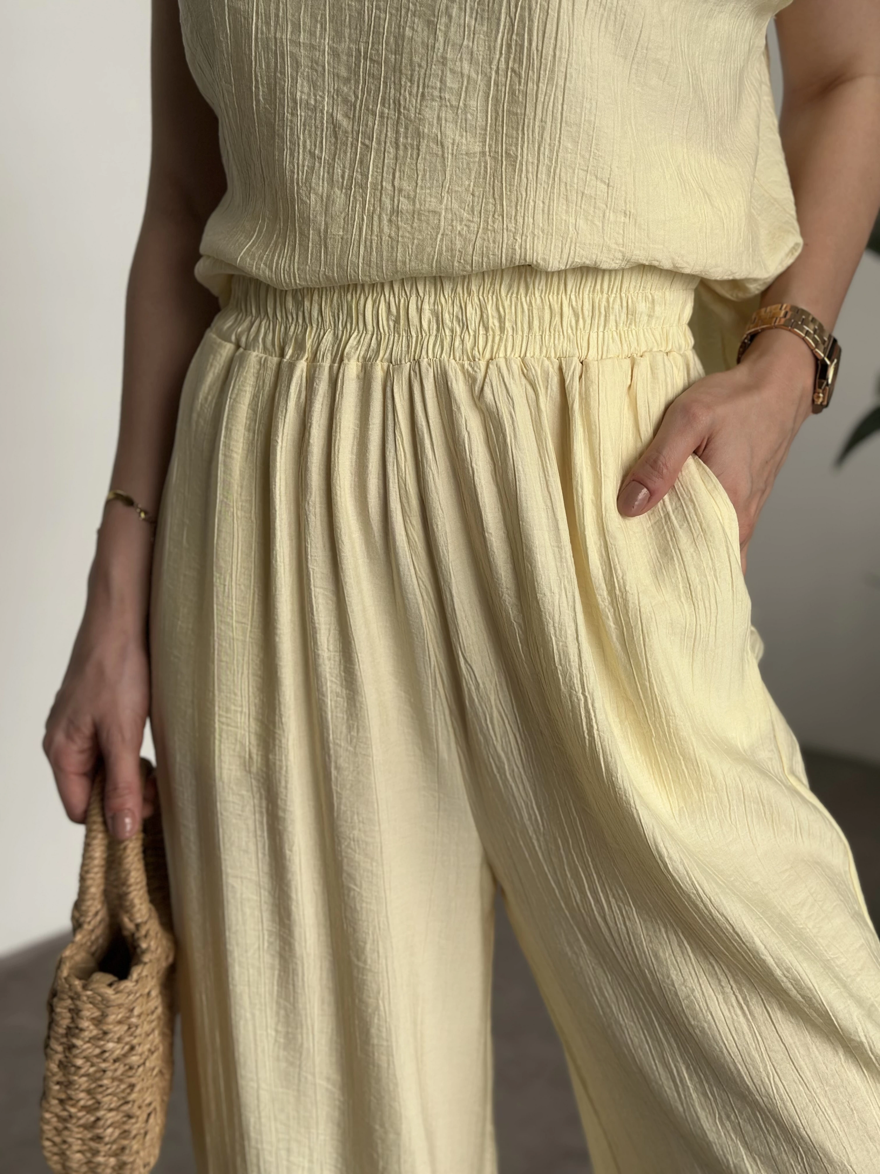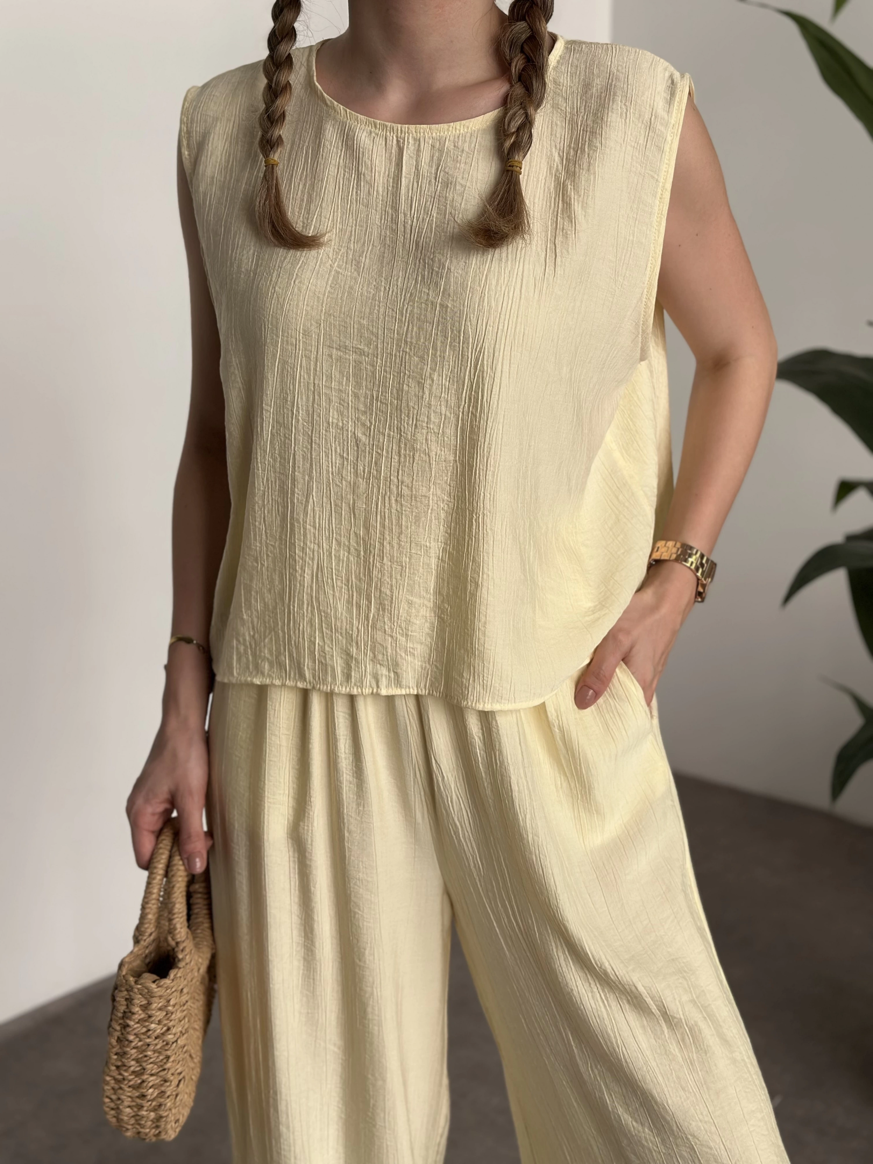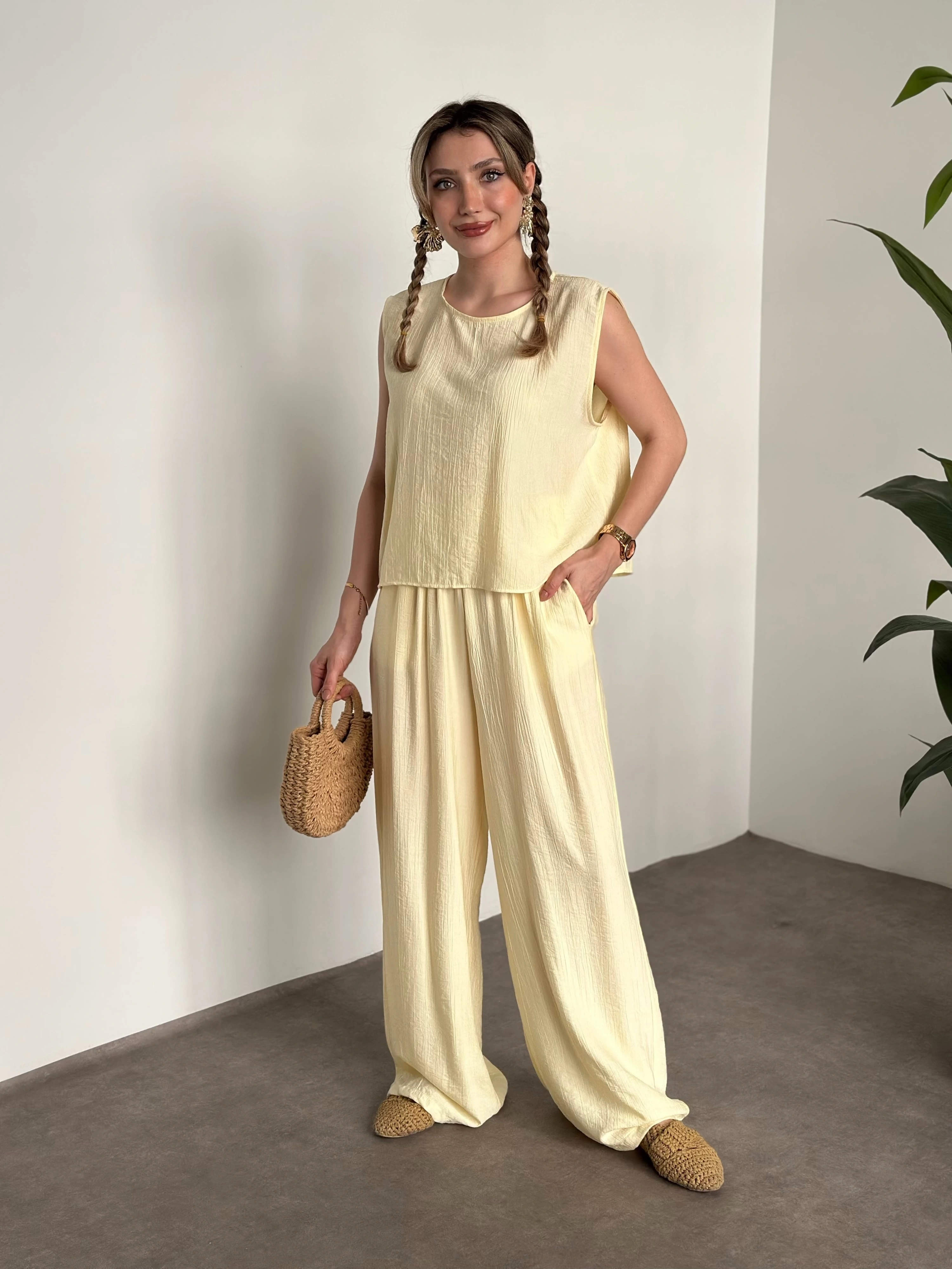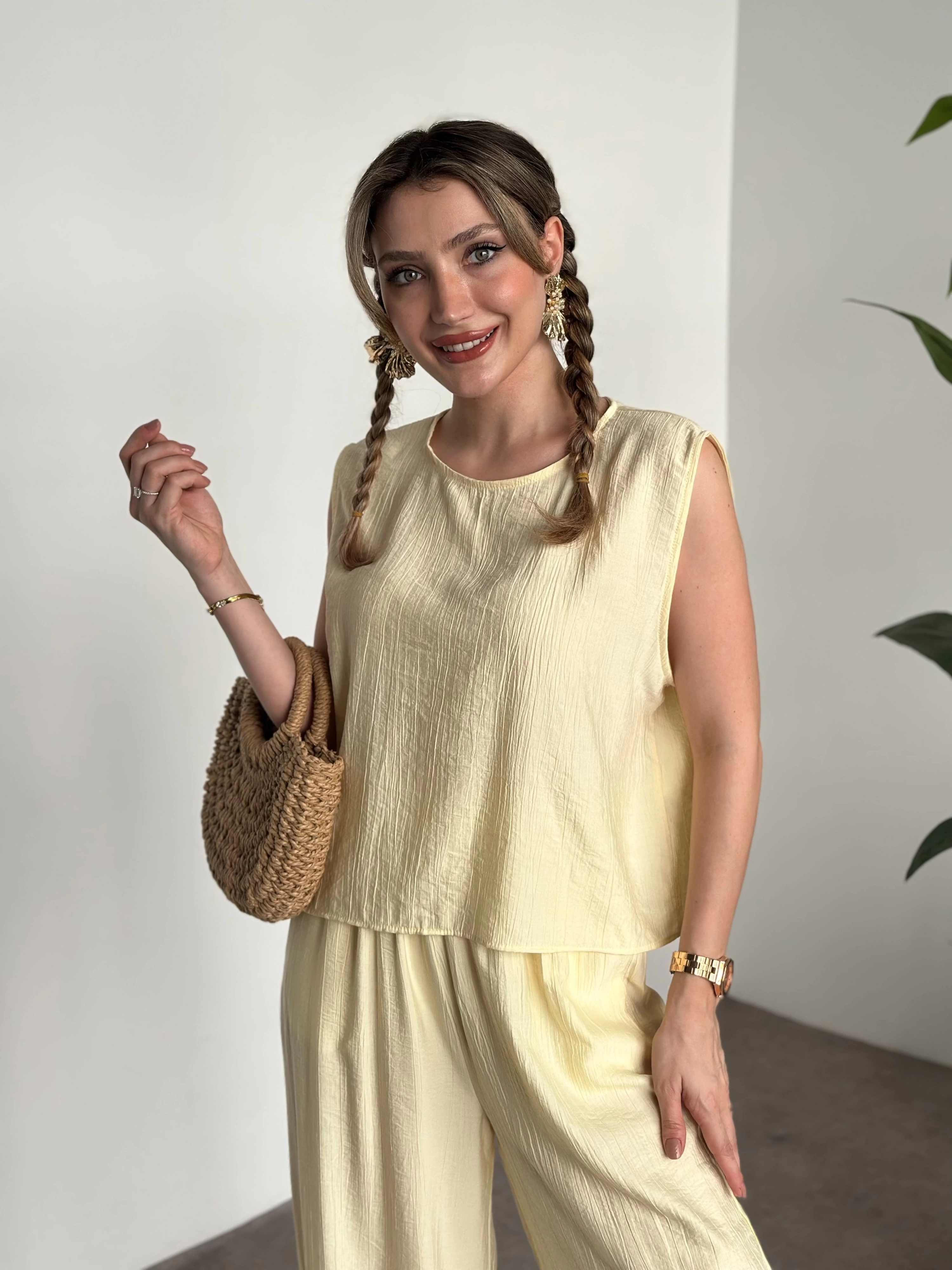 Sırtı bağlama dekolte detaylı tensel kumaş takım sarı