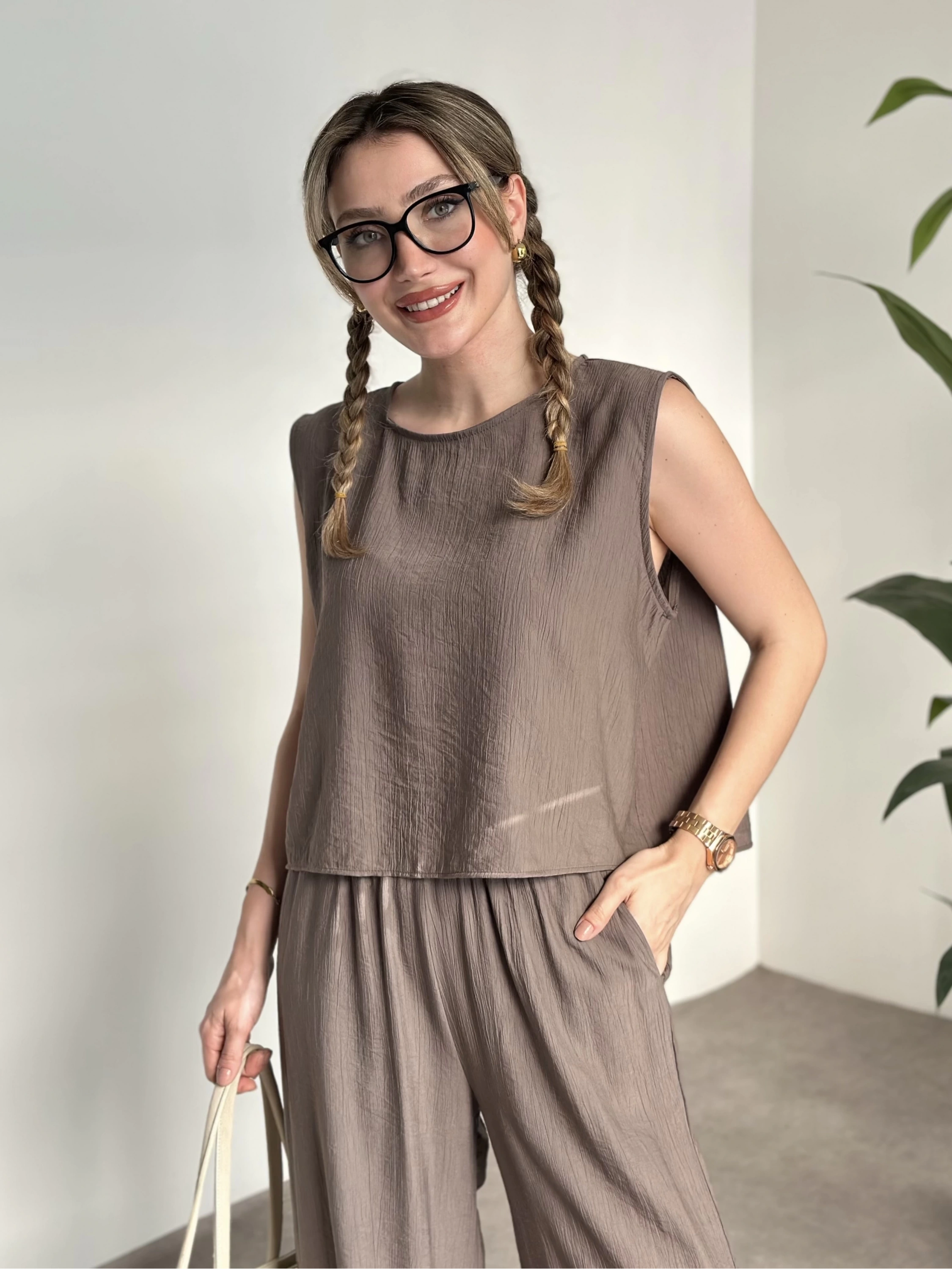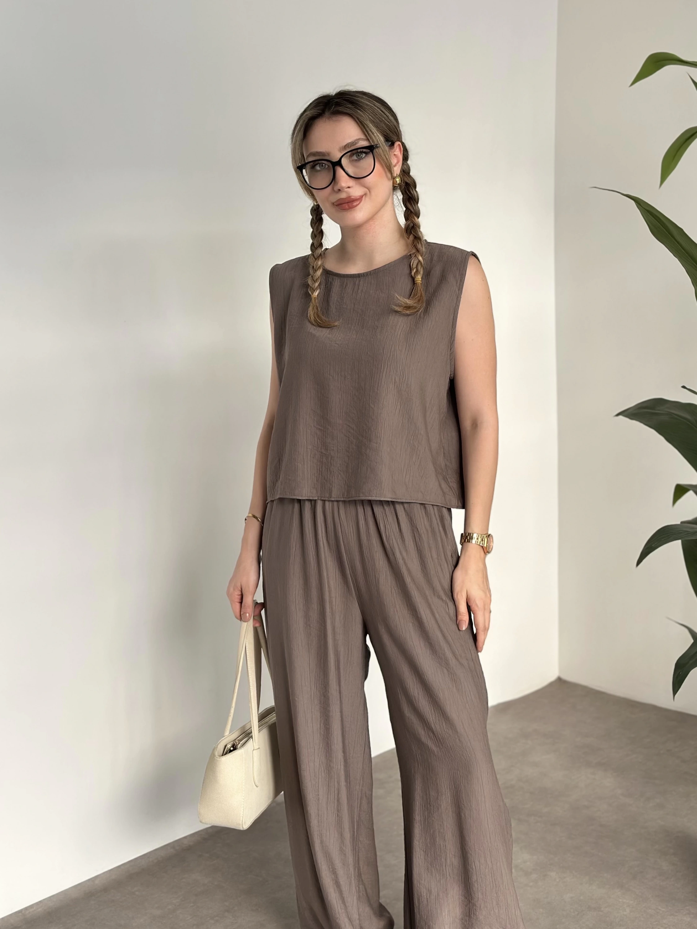 Premium yandan bağlama detaylı double kumaş takım kahve