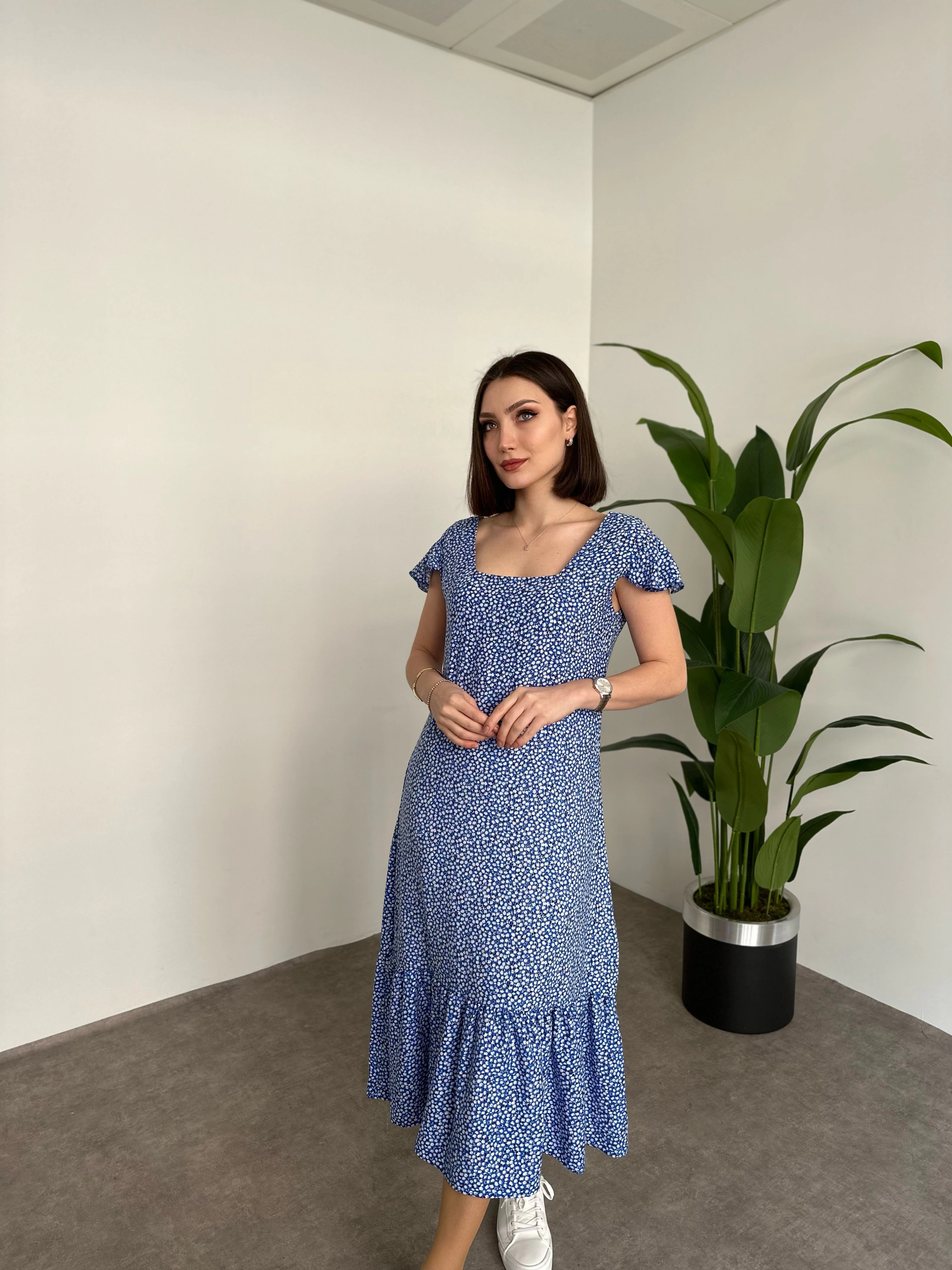 Sırtı Dekolteli Viskon Kumaş Midi Boy Elbise Mavi