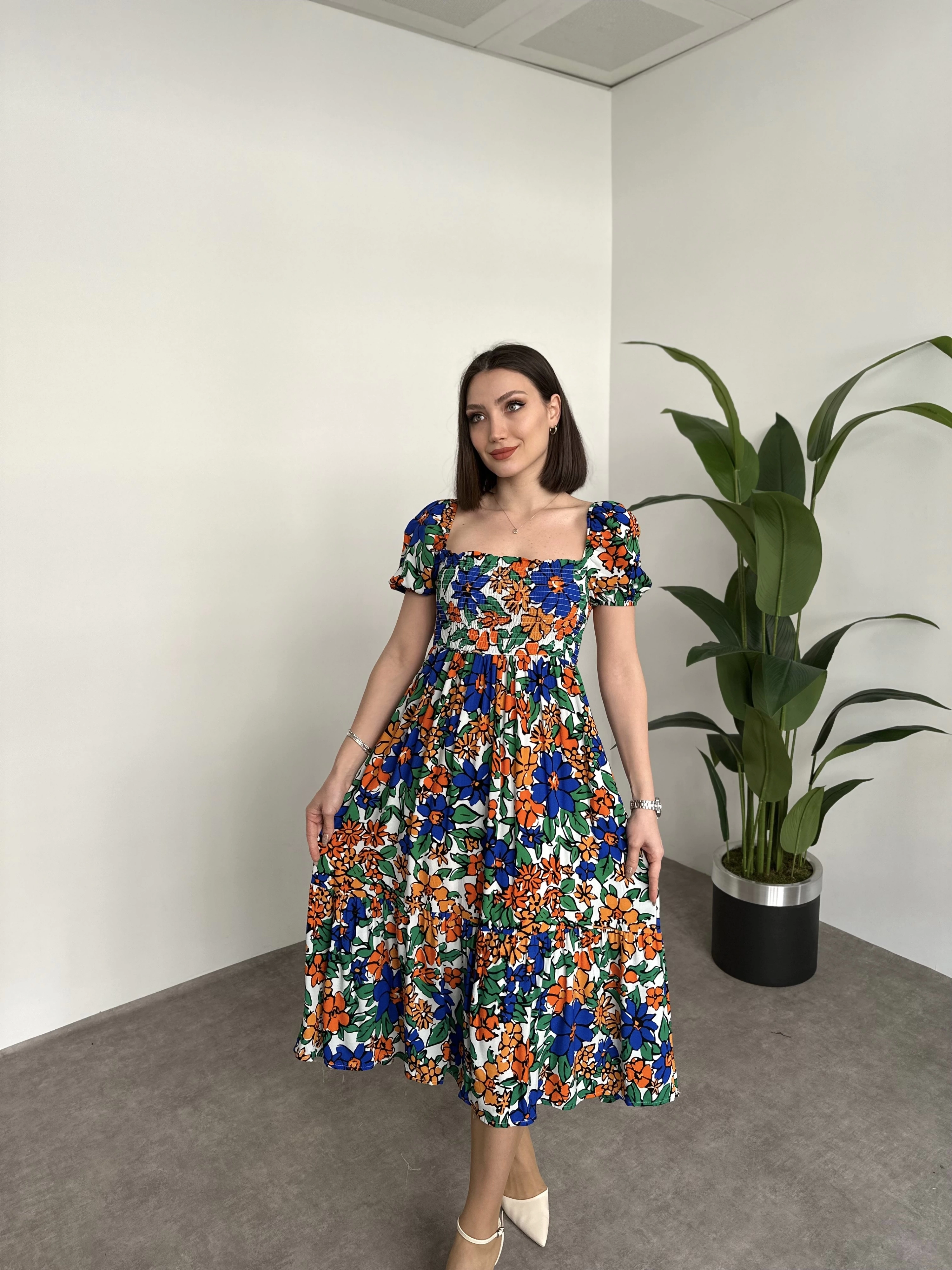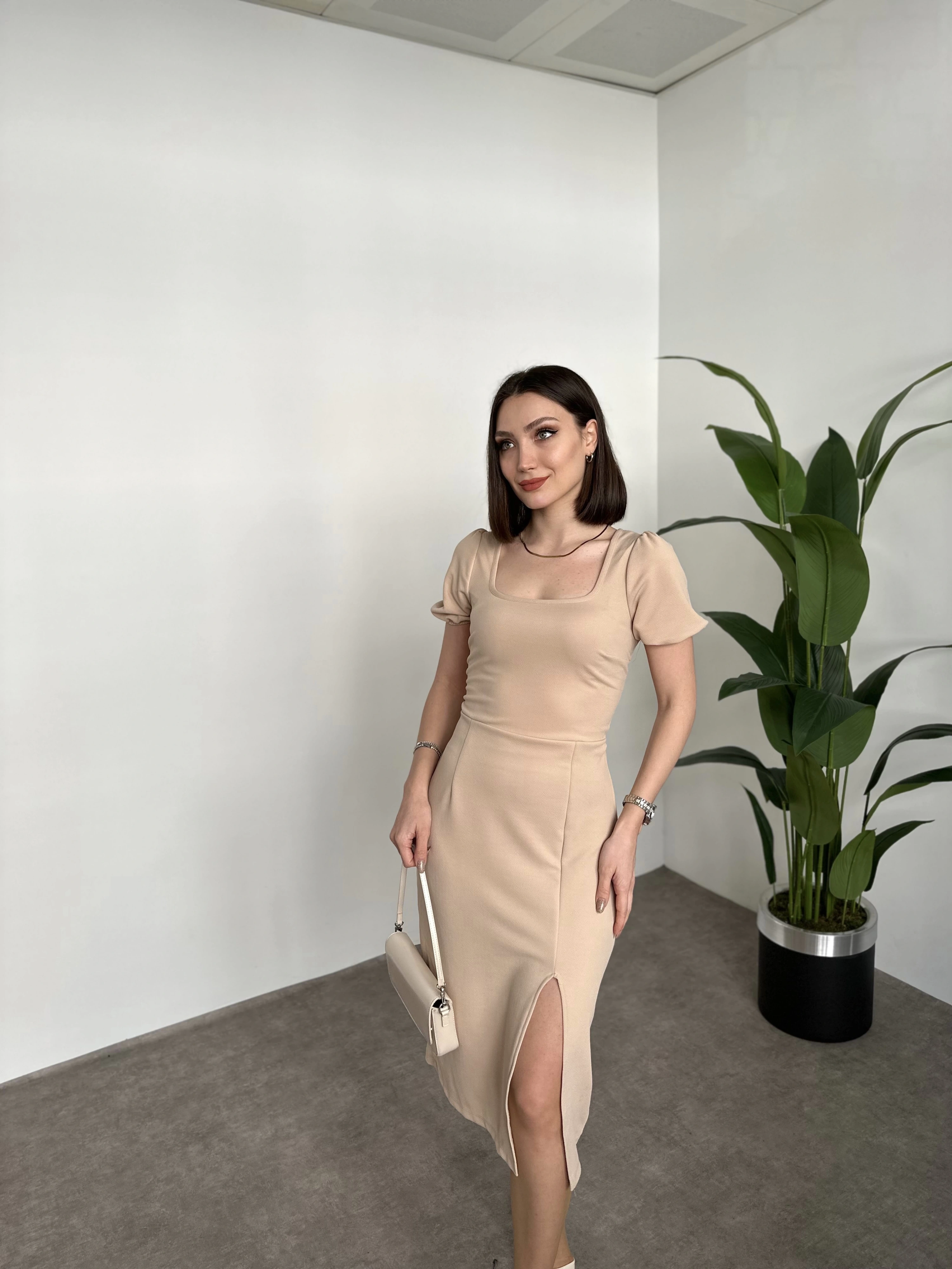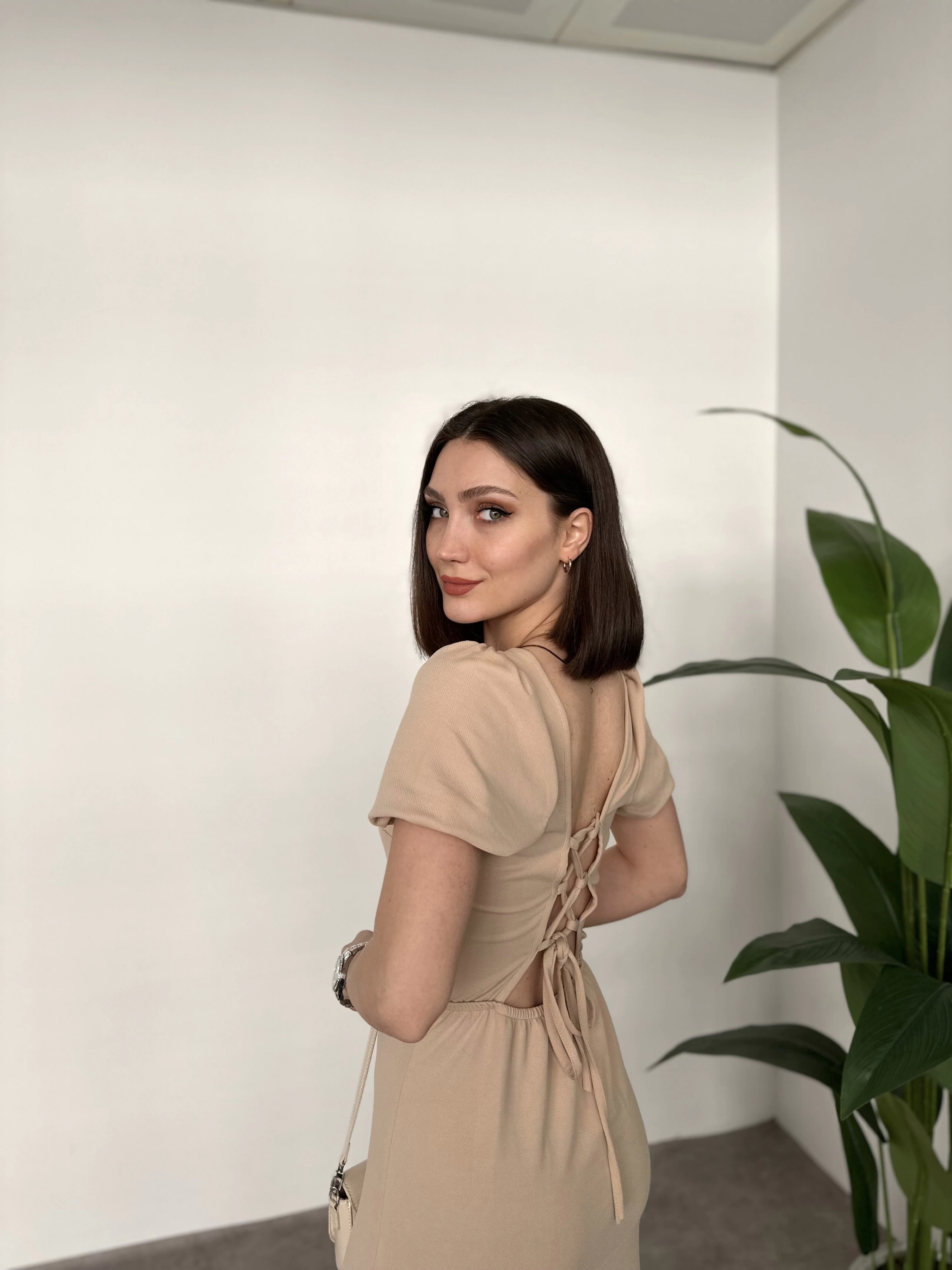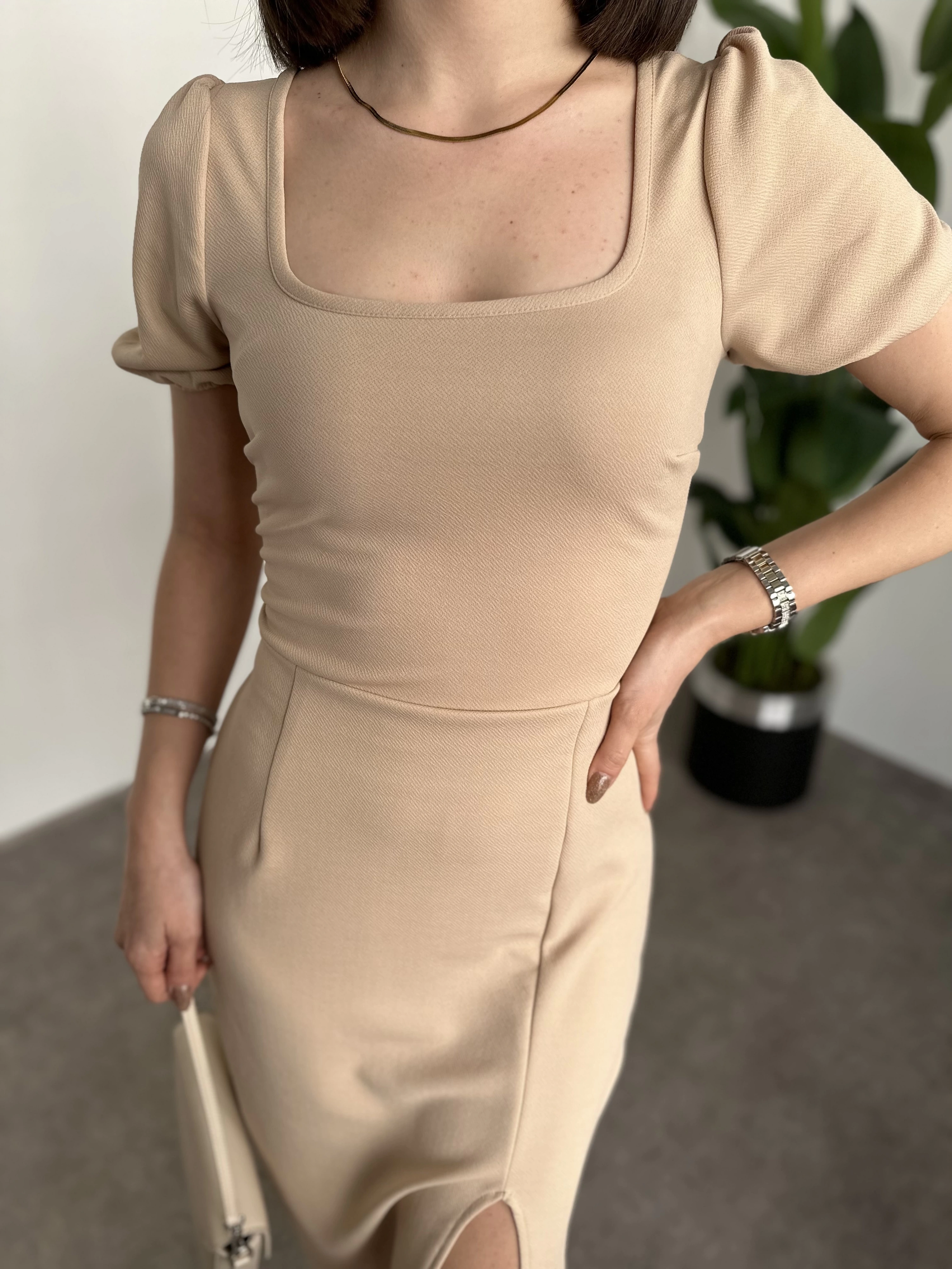 Sırtı Dekolteli Yırtmaç Detay Elbise Krem