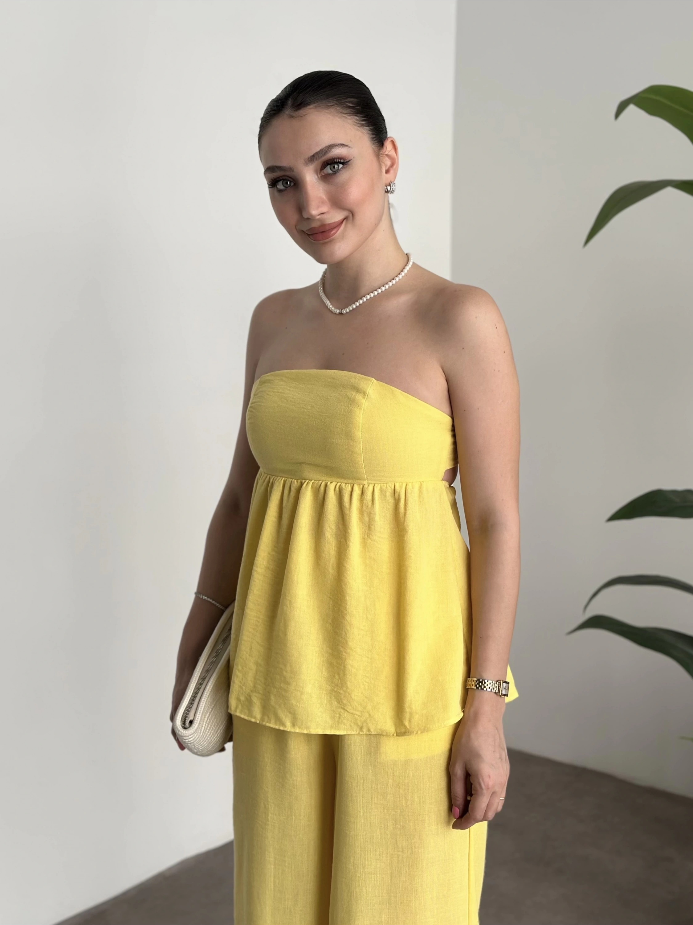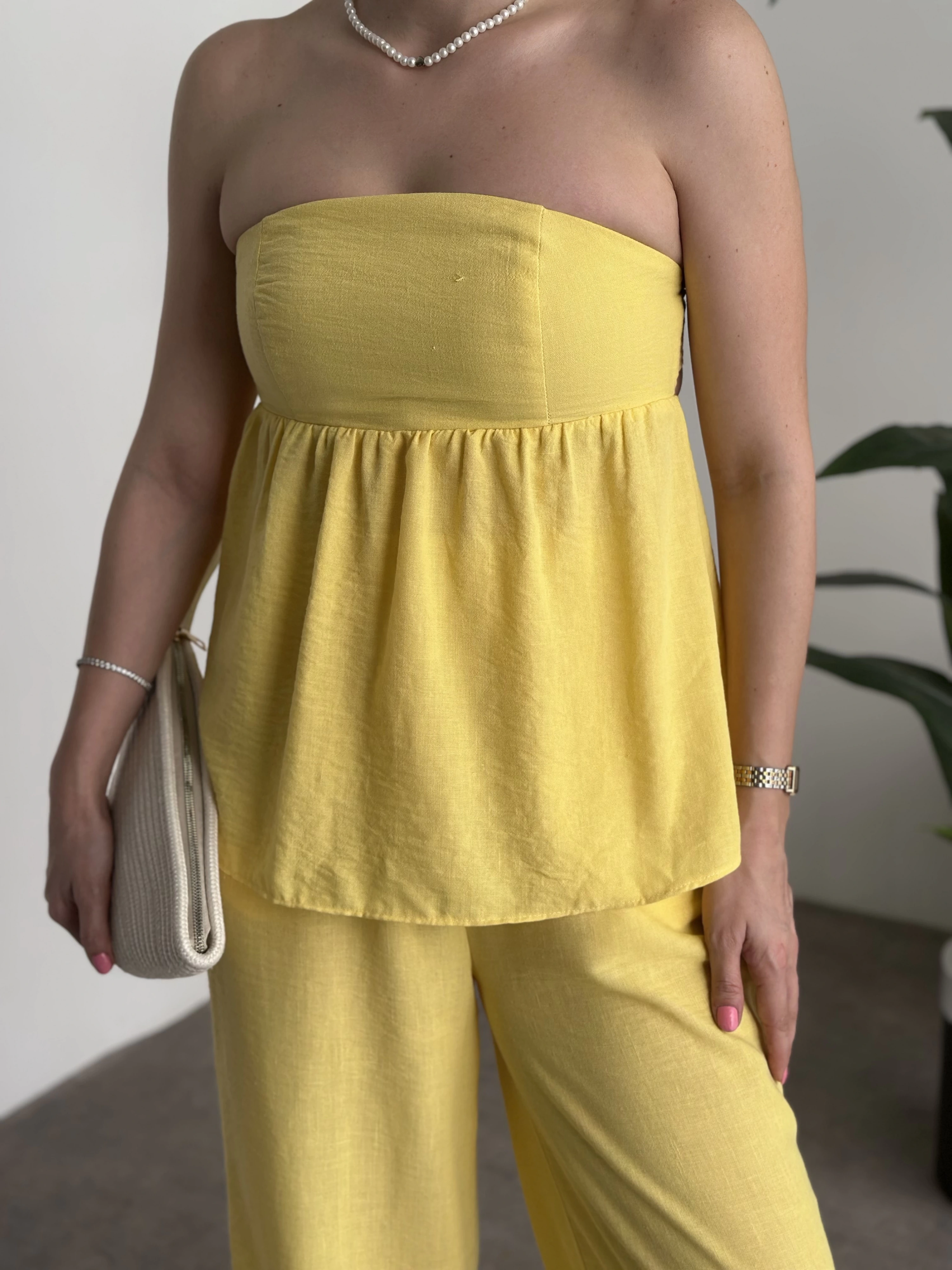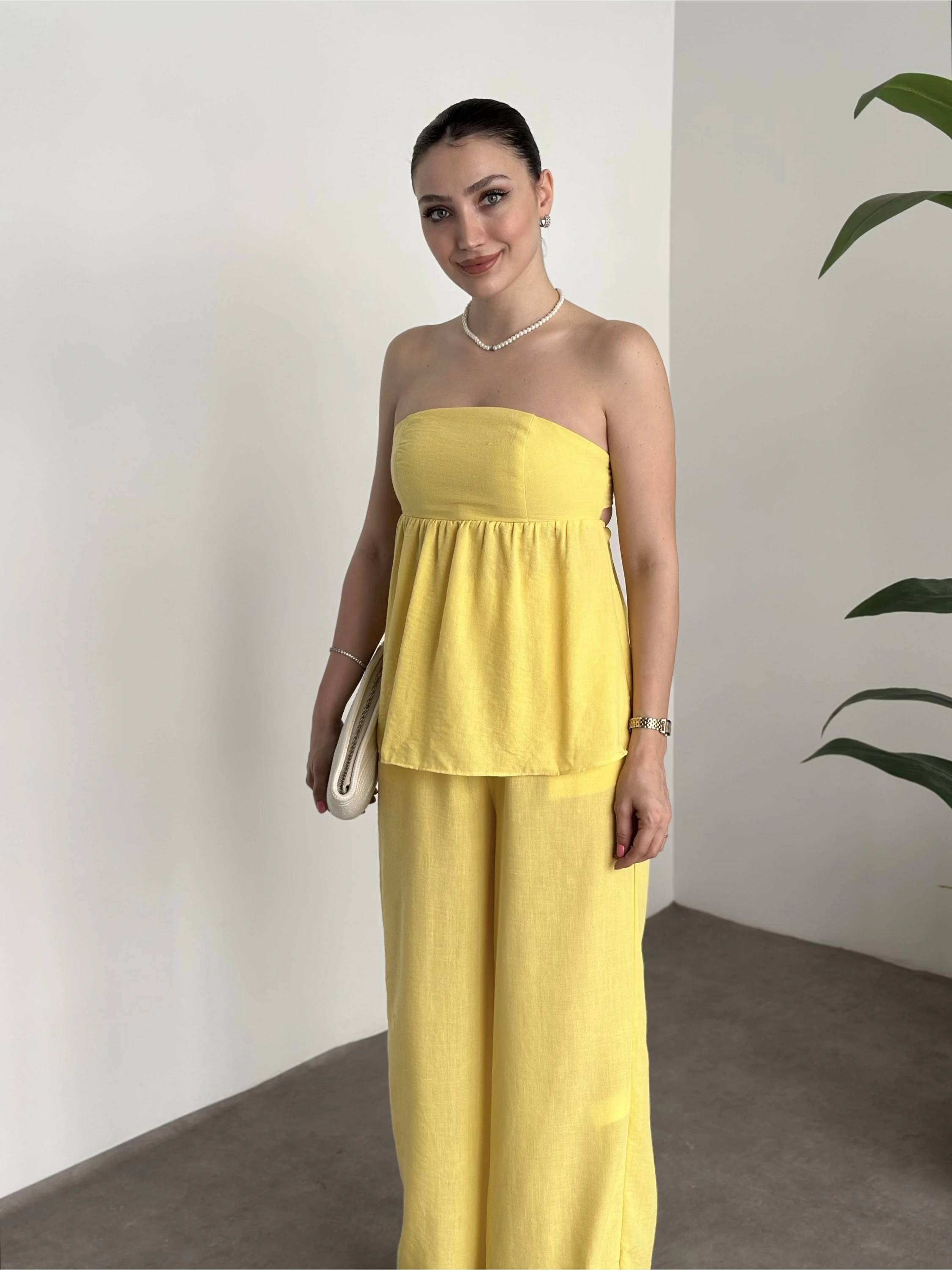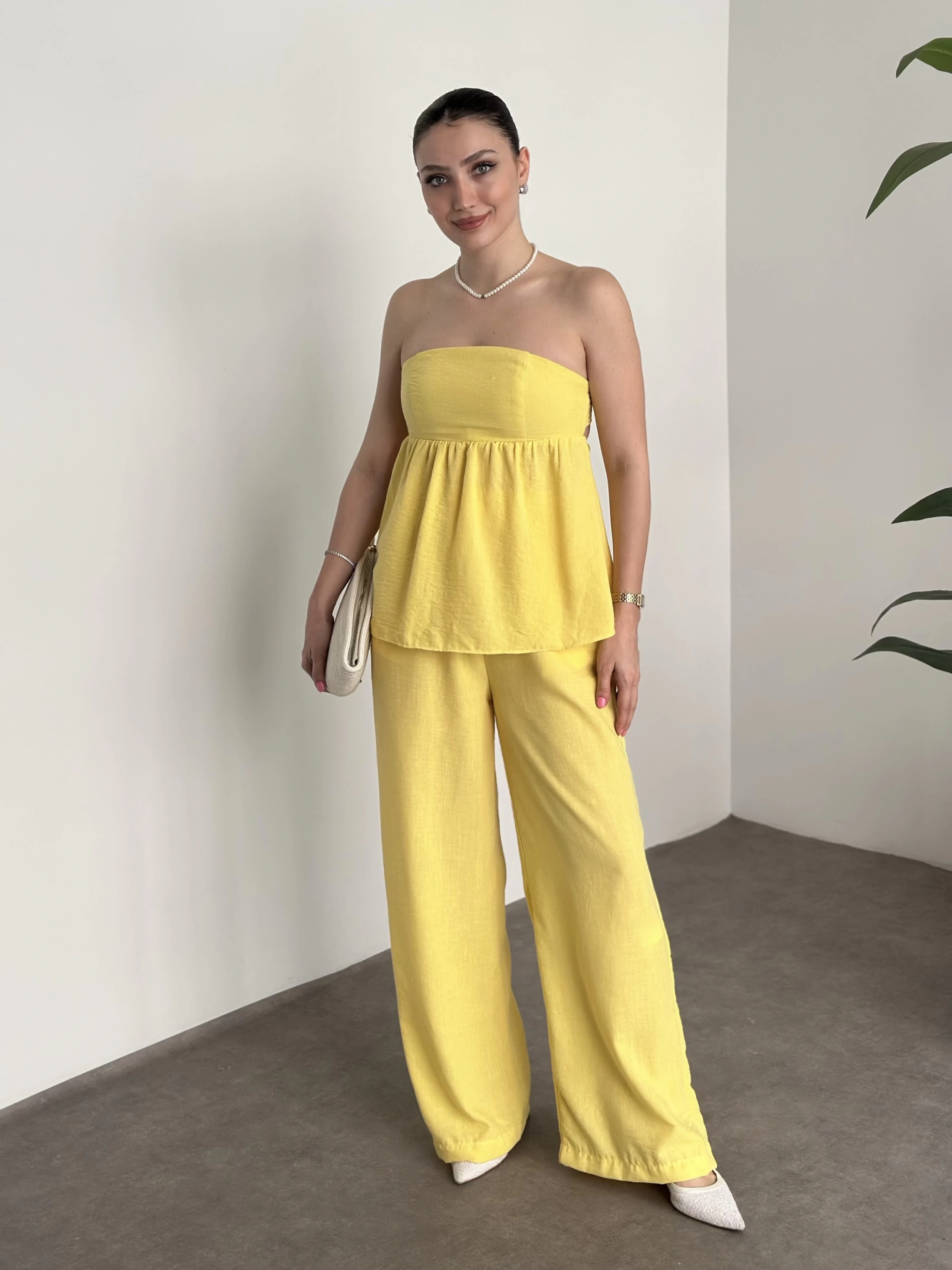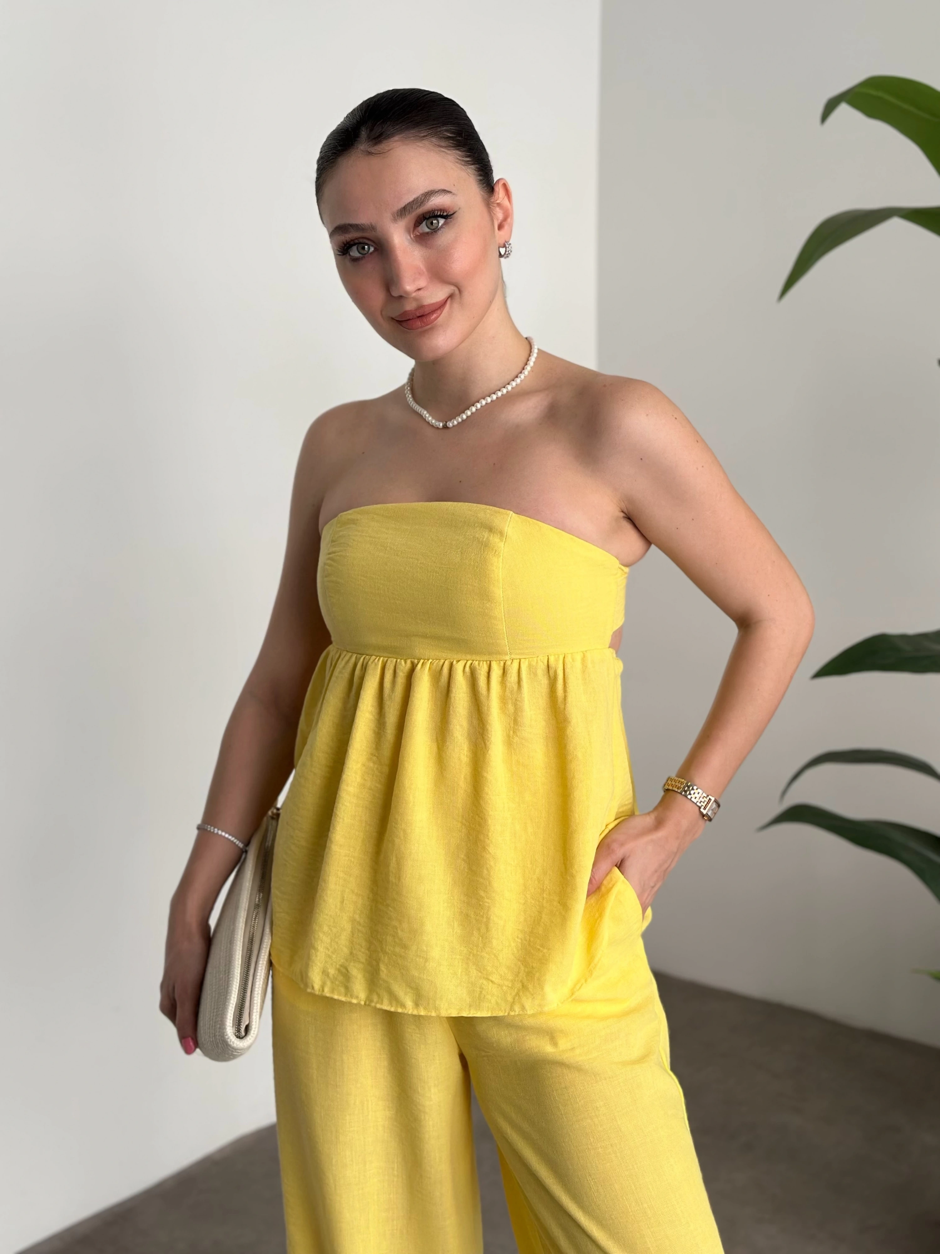 Straplez arkadan bağlama detaylı keten takım sarı