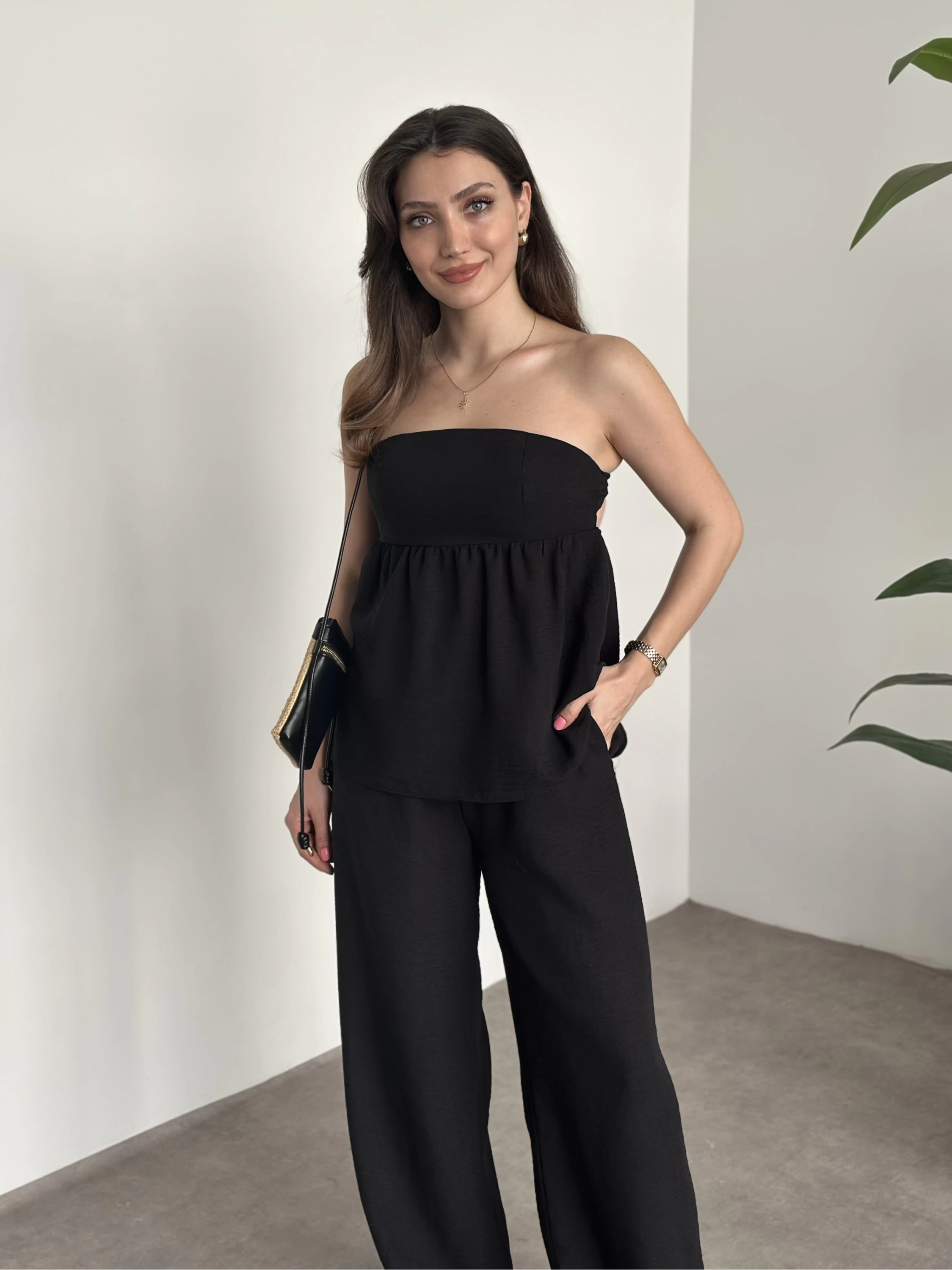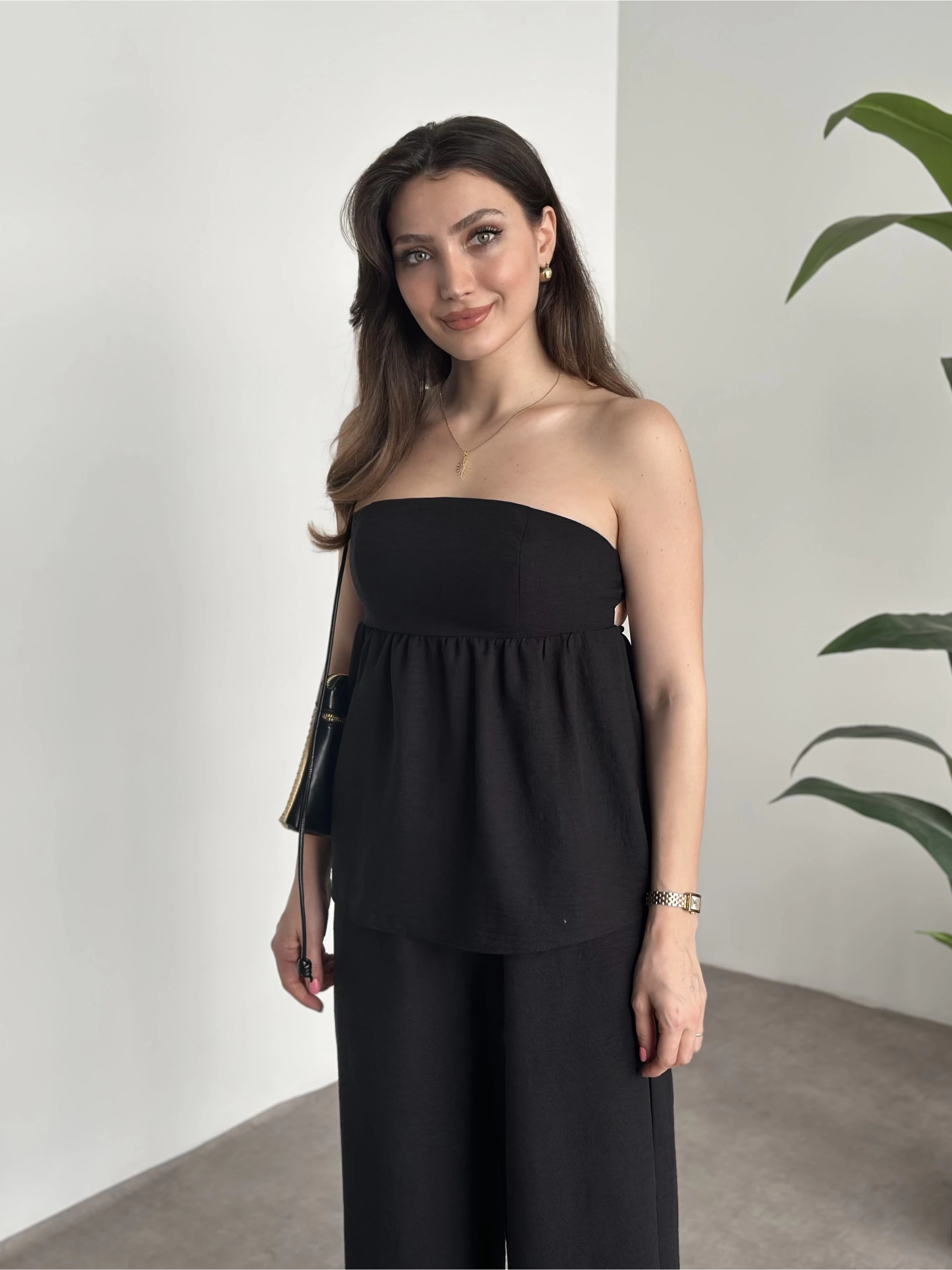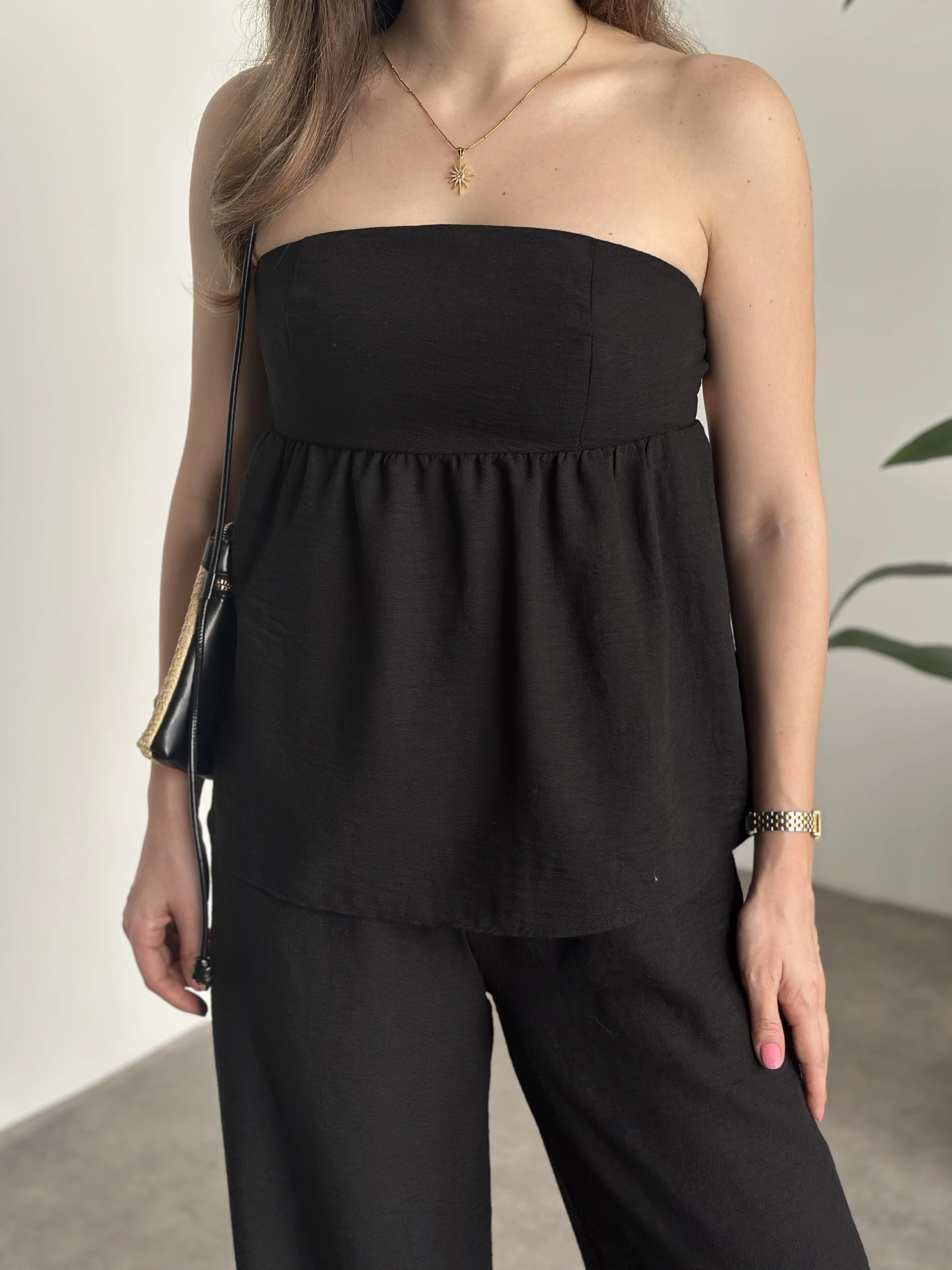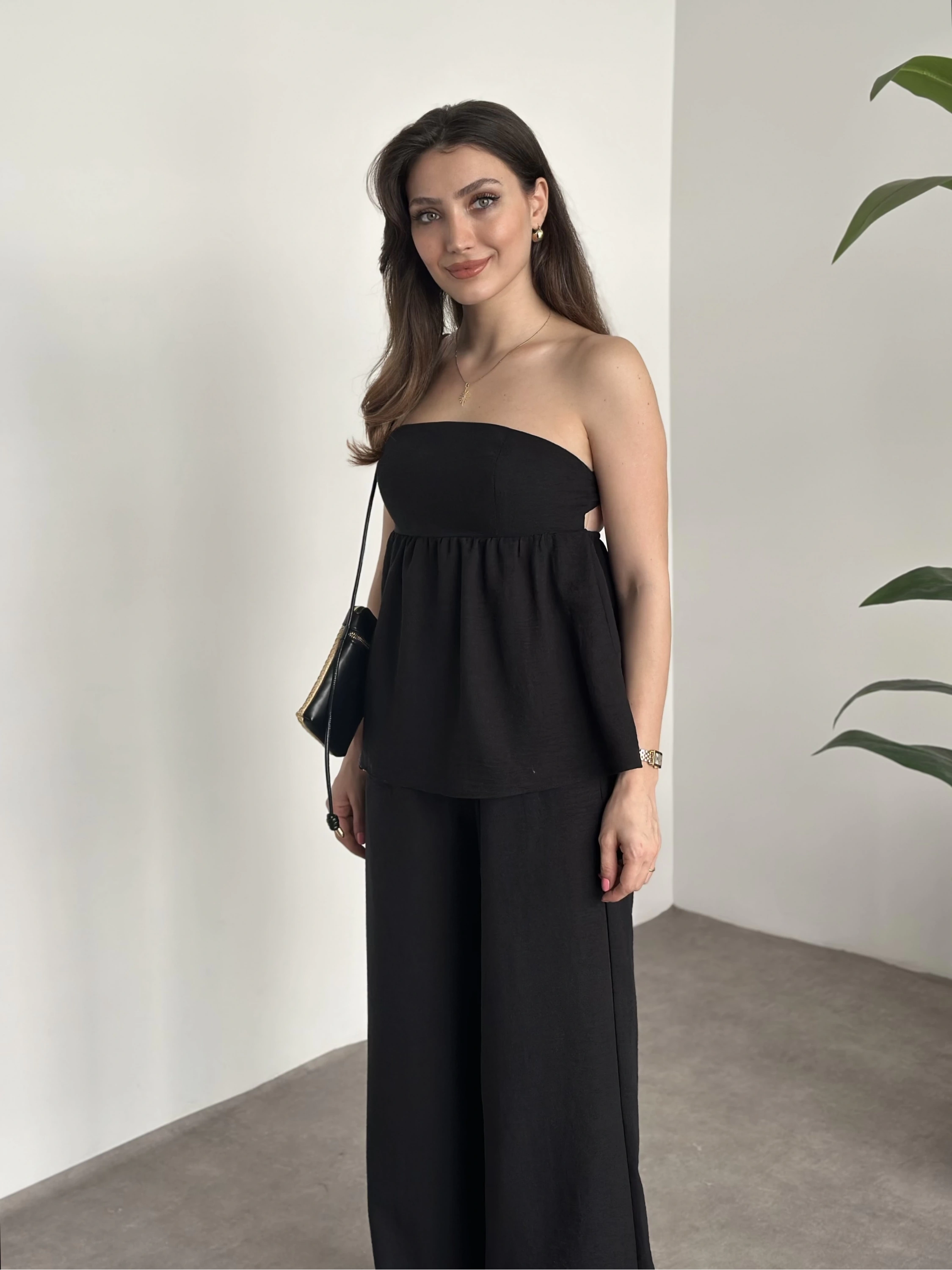 Straplez arkadan bağlama detaylı keten takım siyah