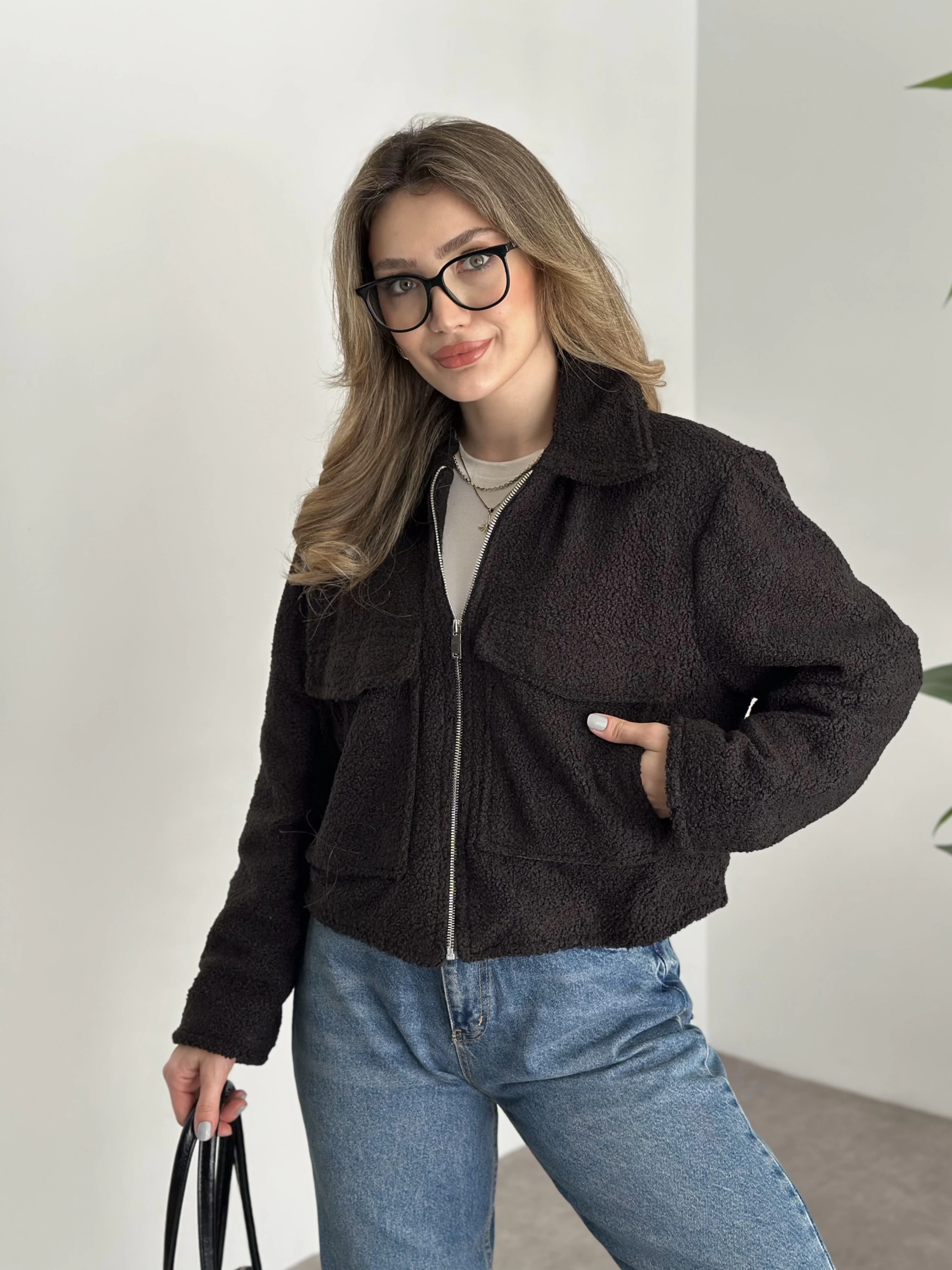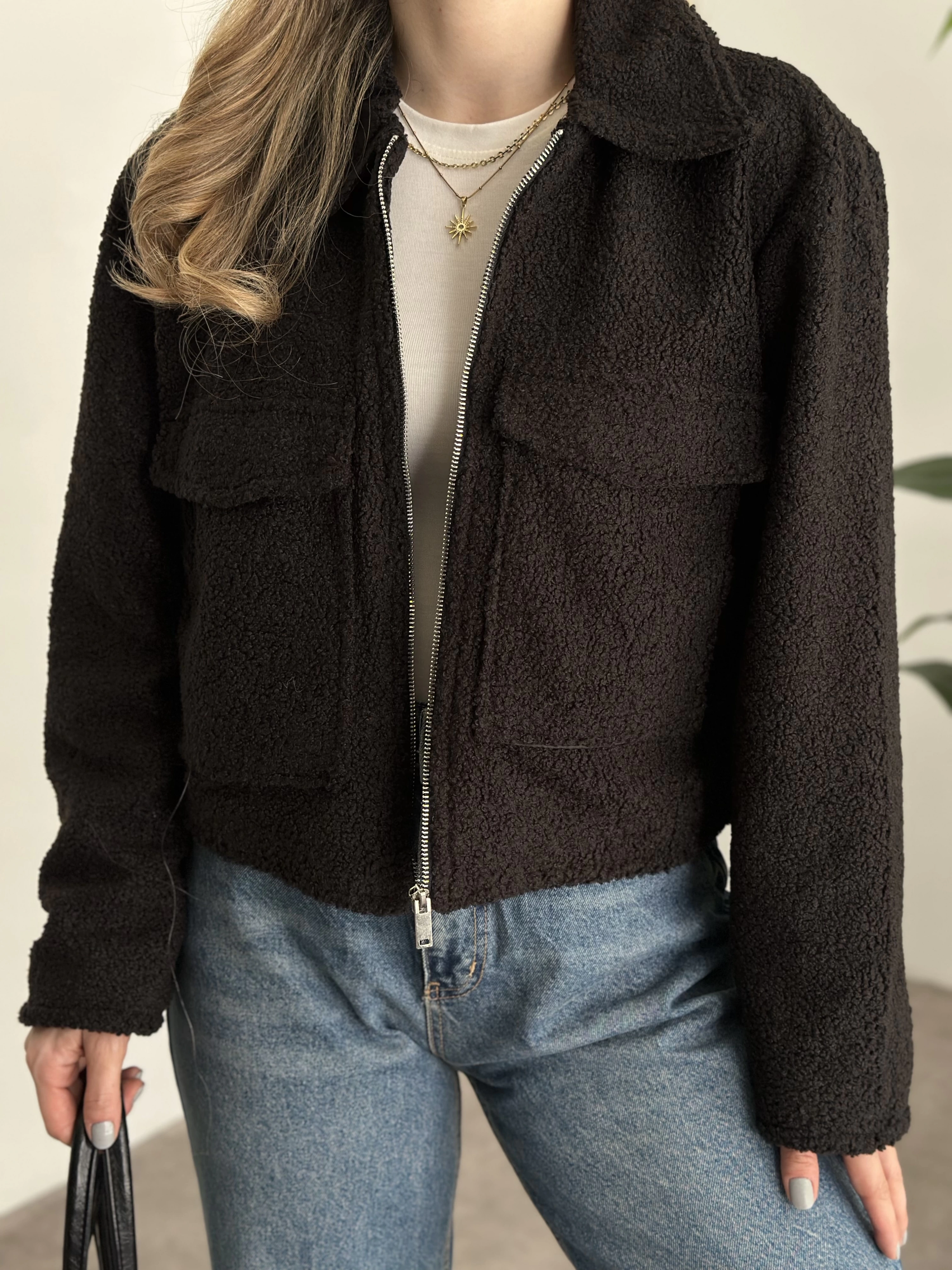 Teddy fermuarlı astarlı kısa ceket siyah