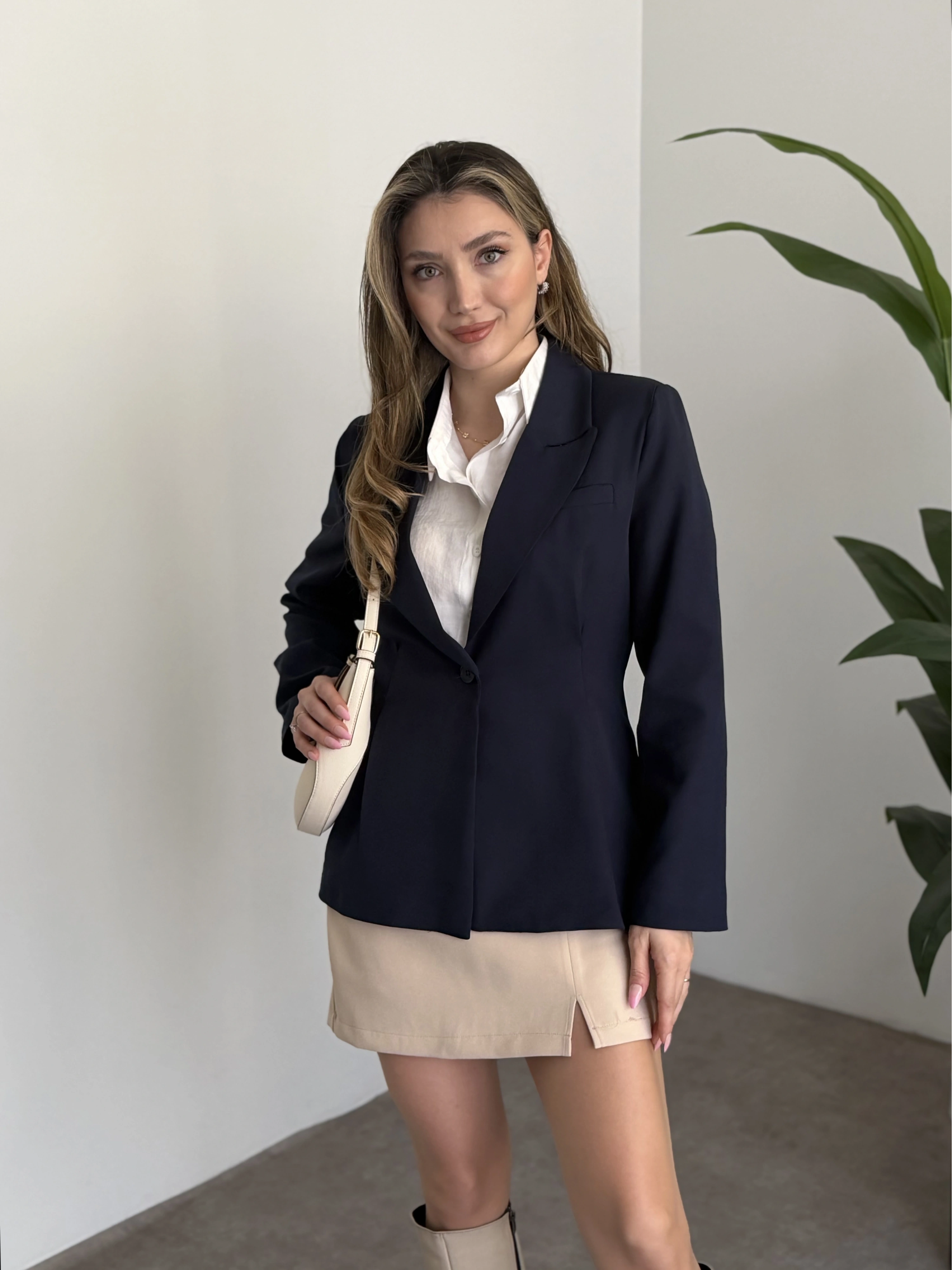 Tek düğme belden oturan blazer ceket Lacivert