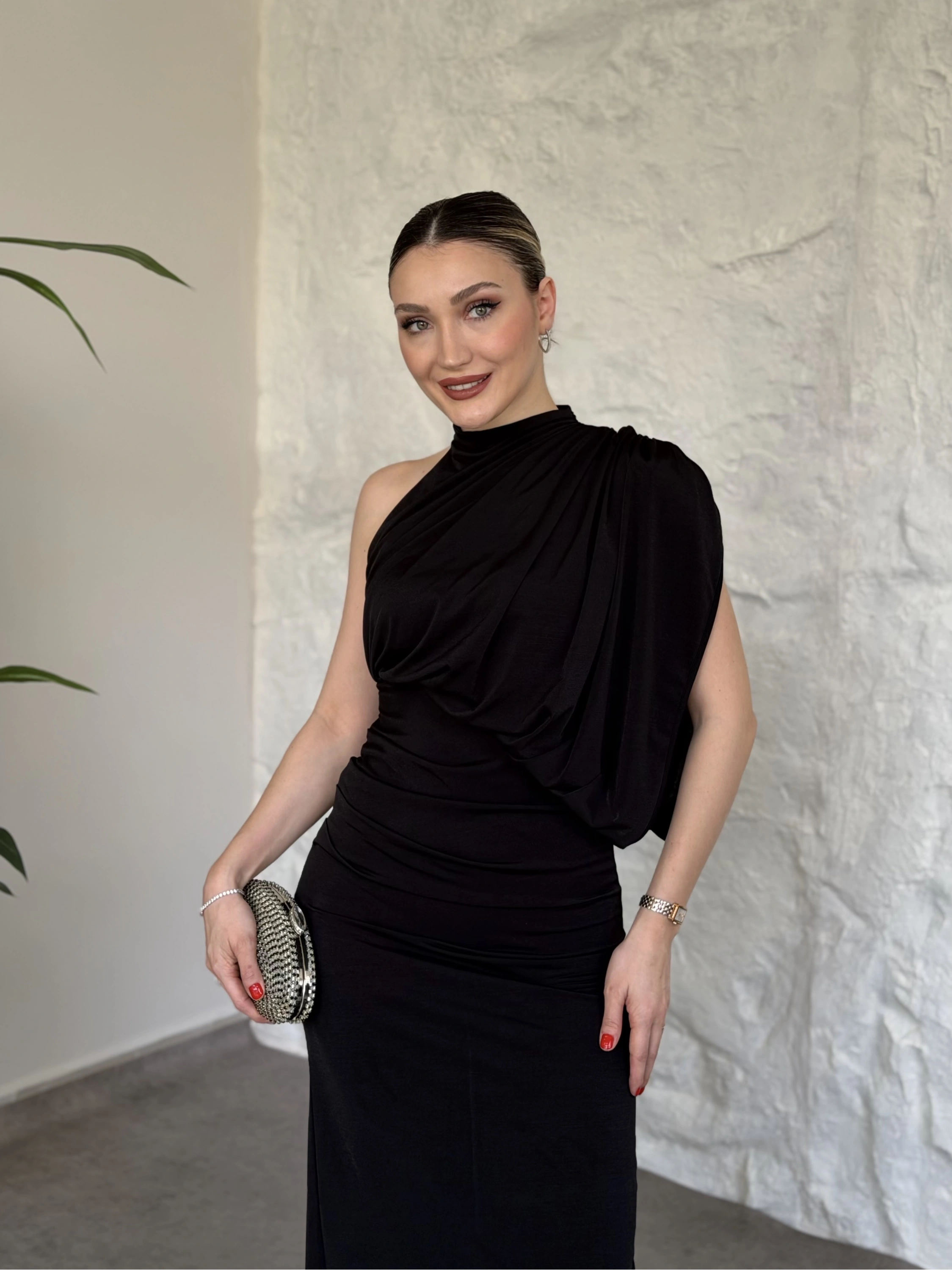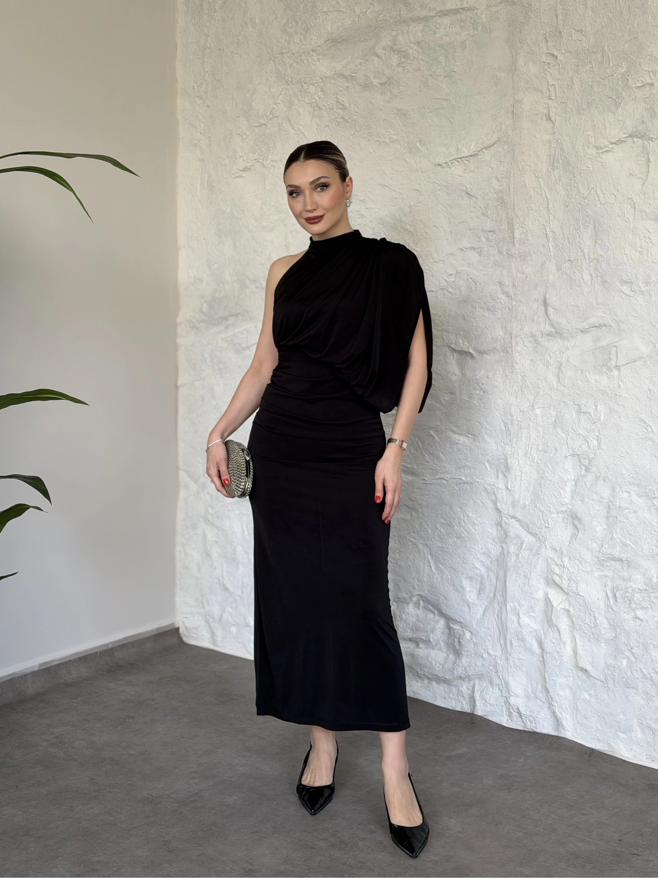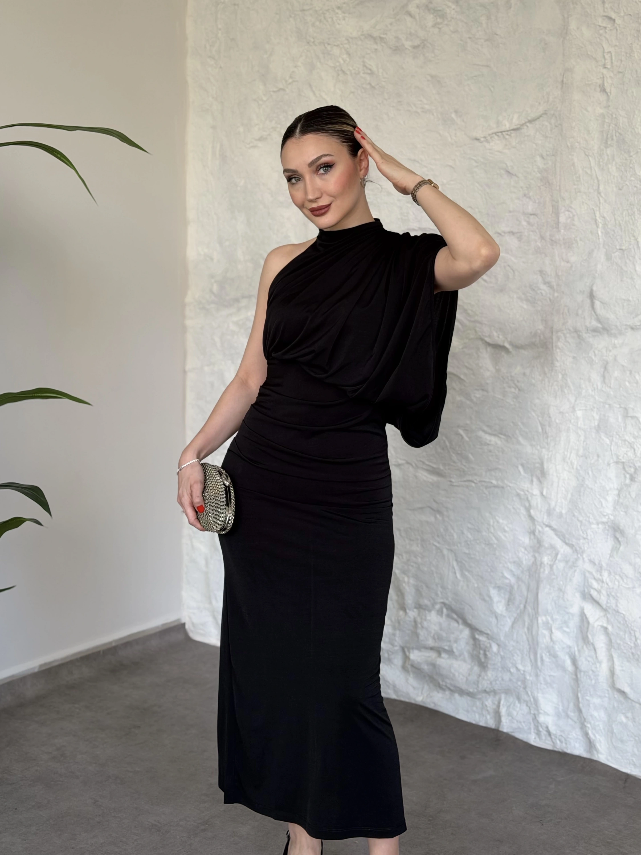 Tek omuz yarasa kol detaylı büzgülü elbise siyah