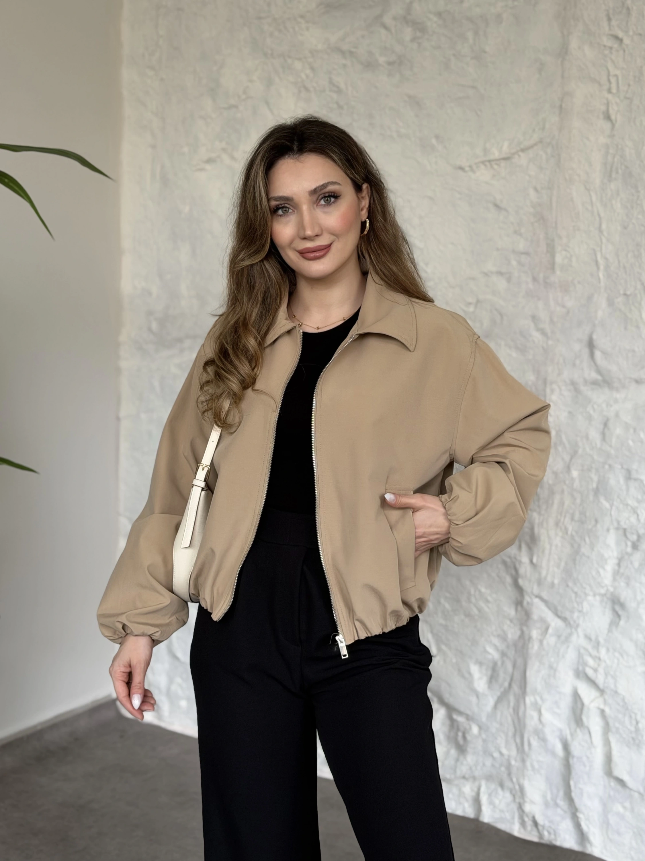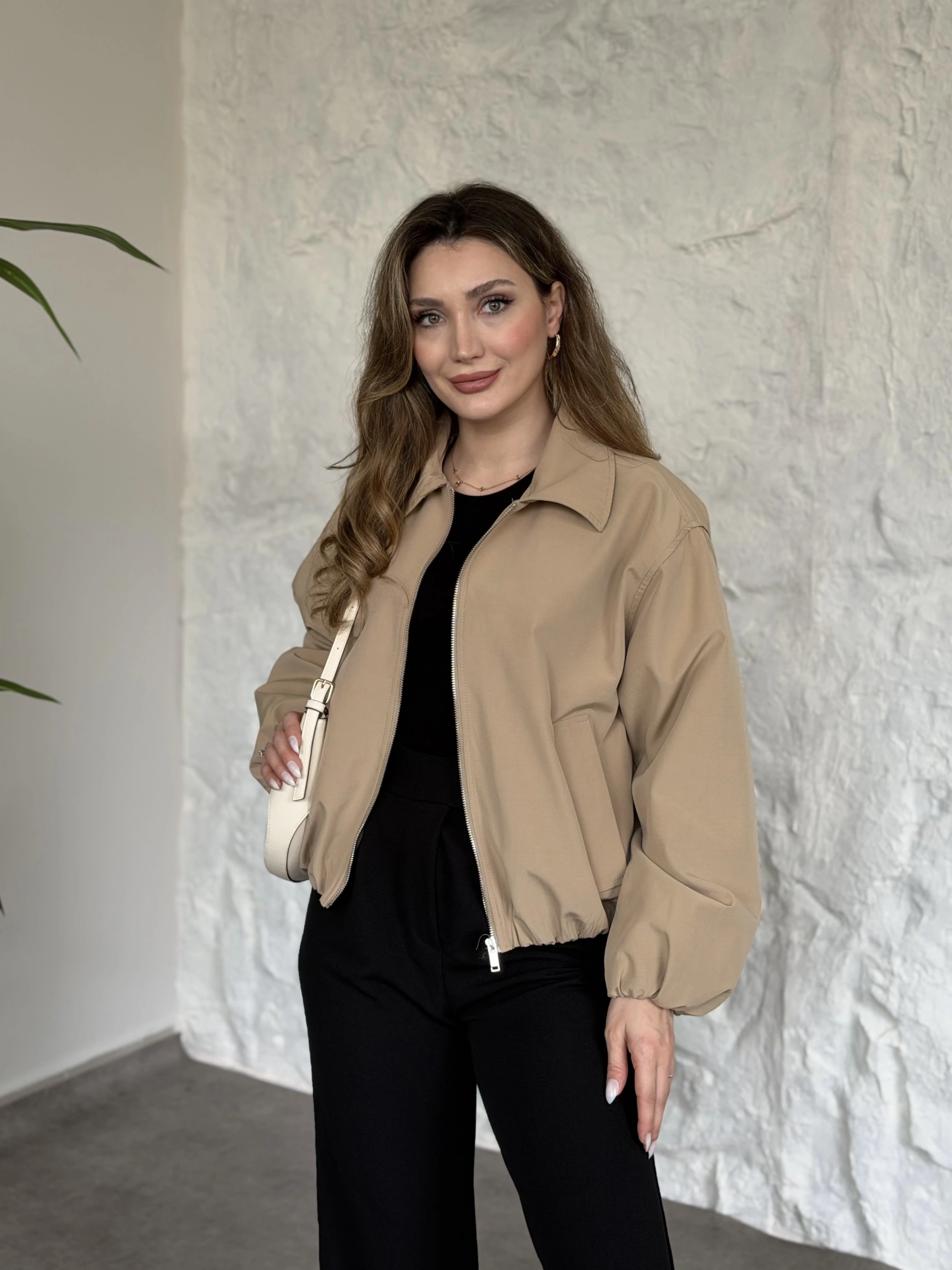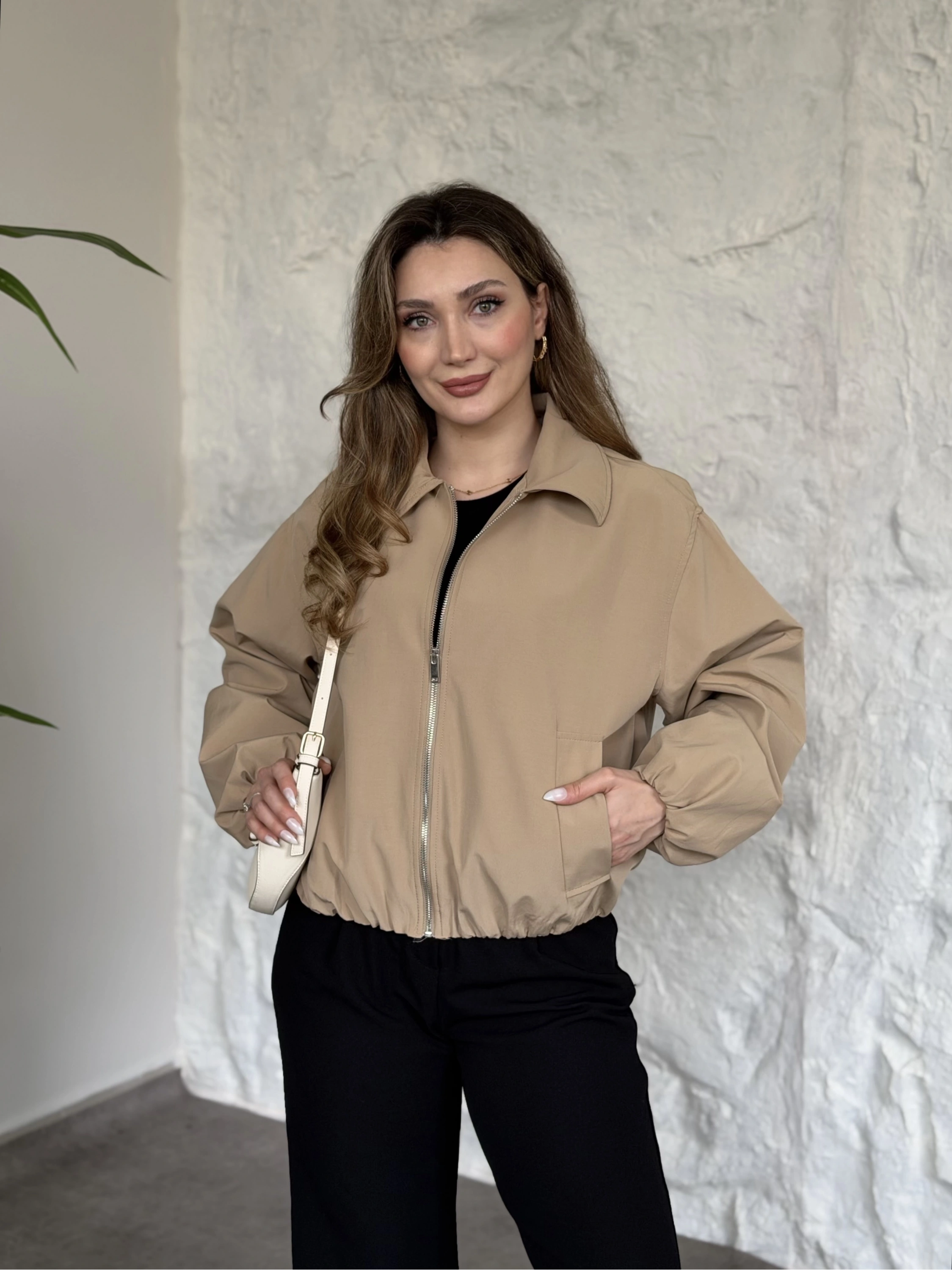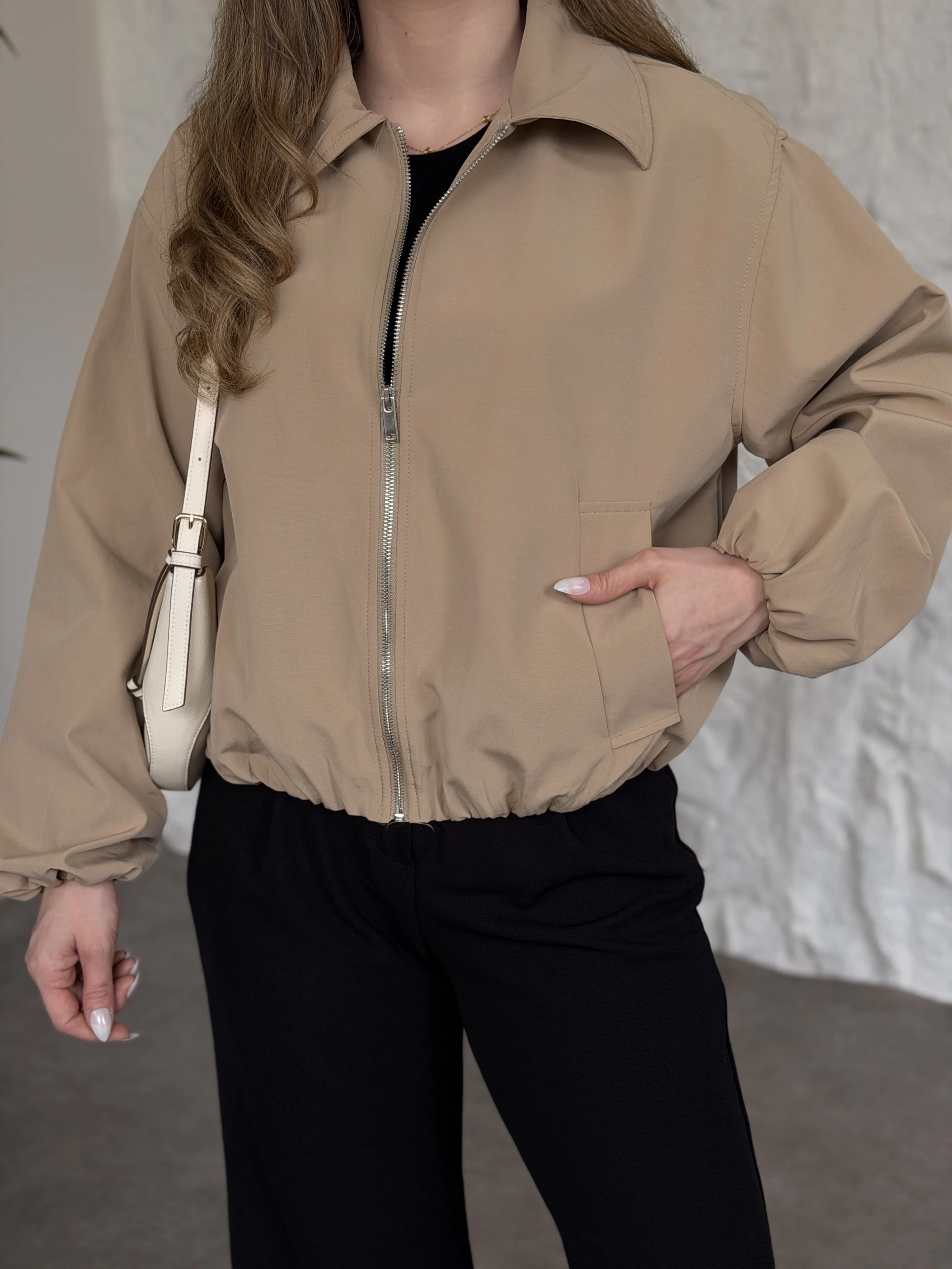 Torino kumaş beli lastikli fermuarlı ceket bej