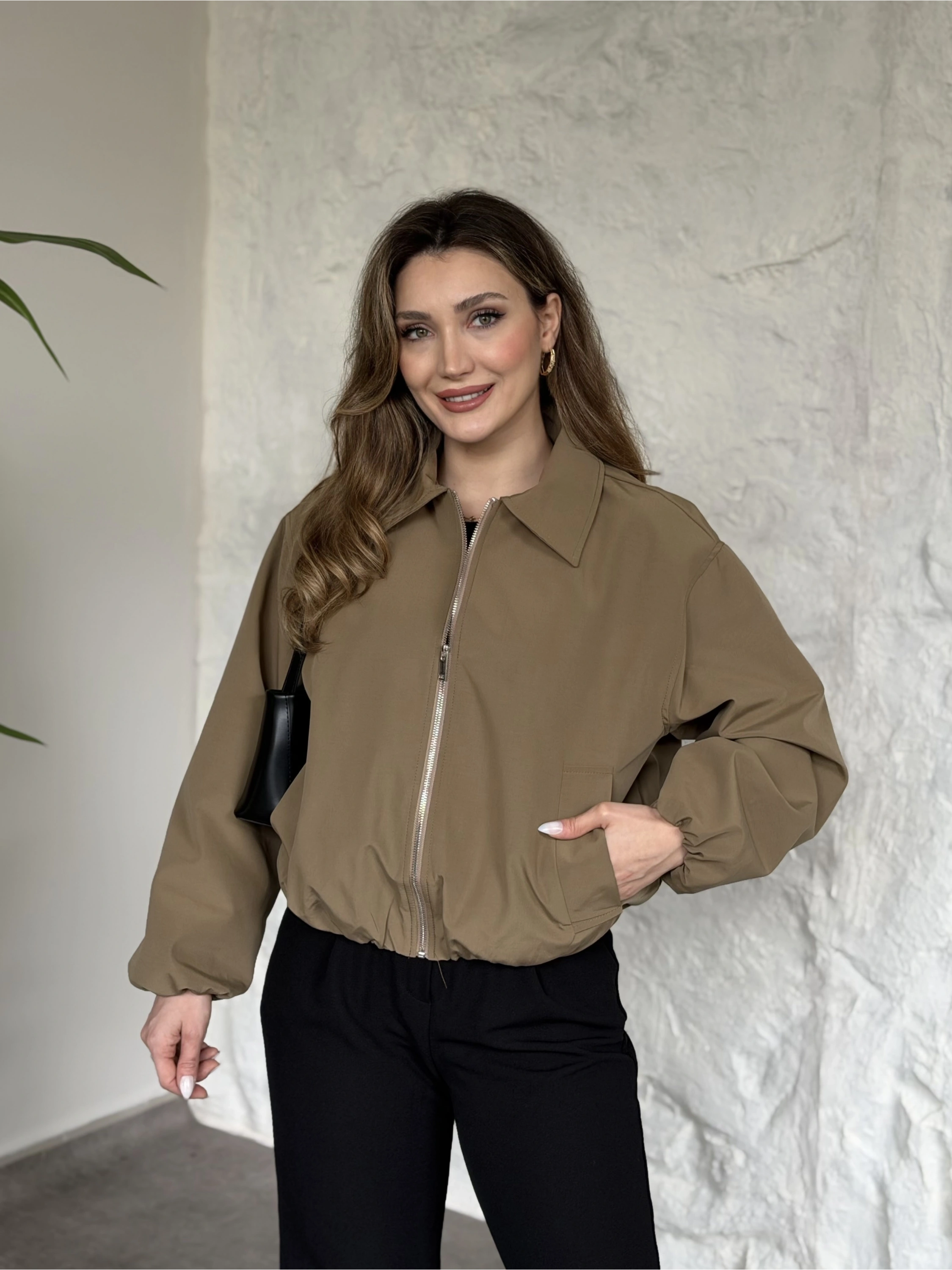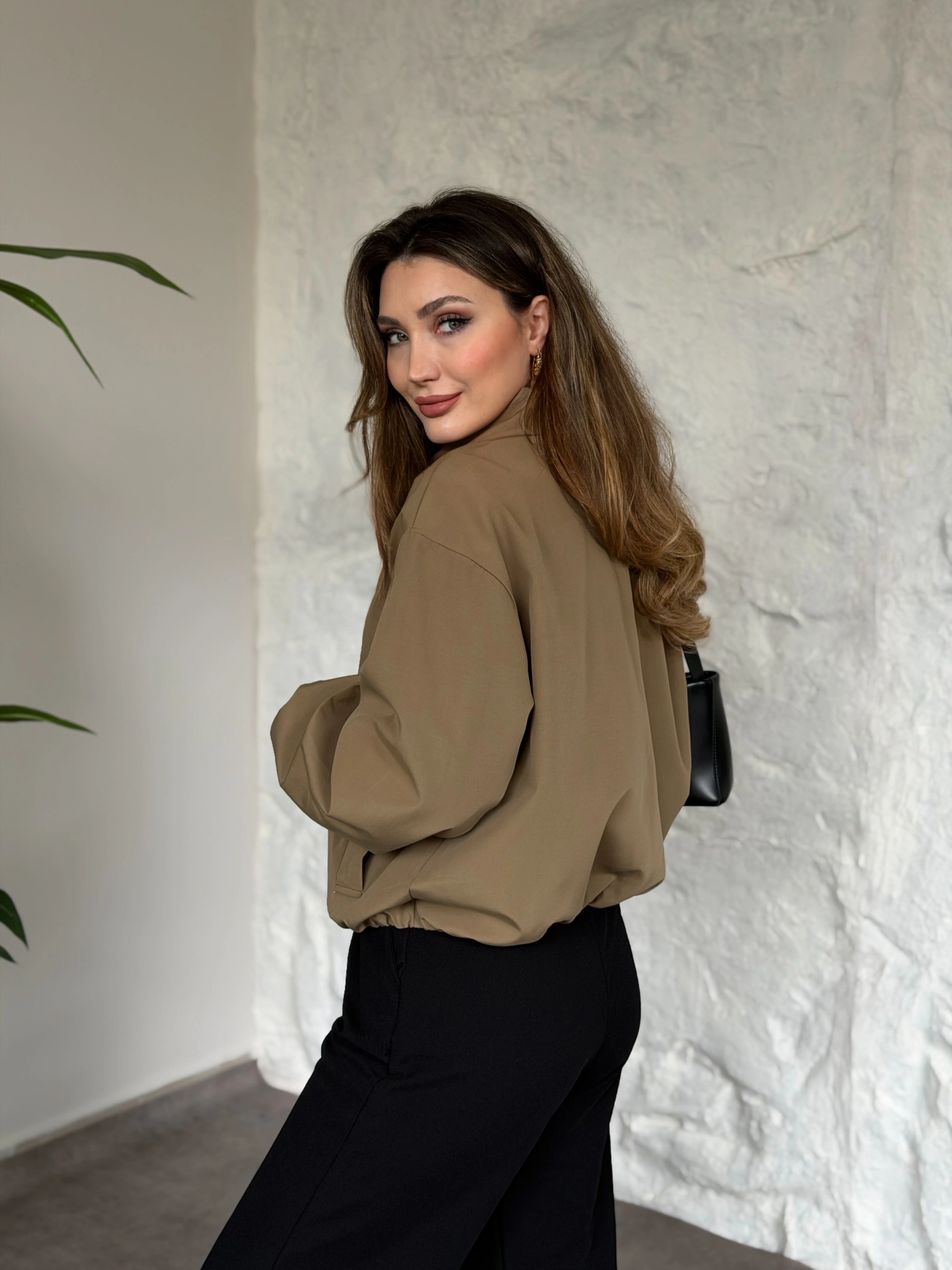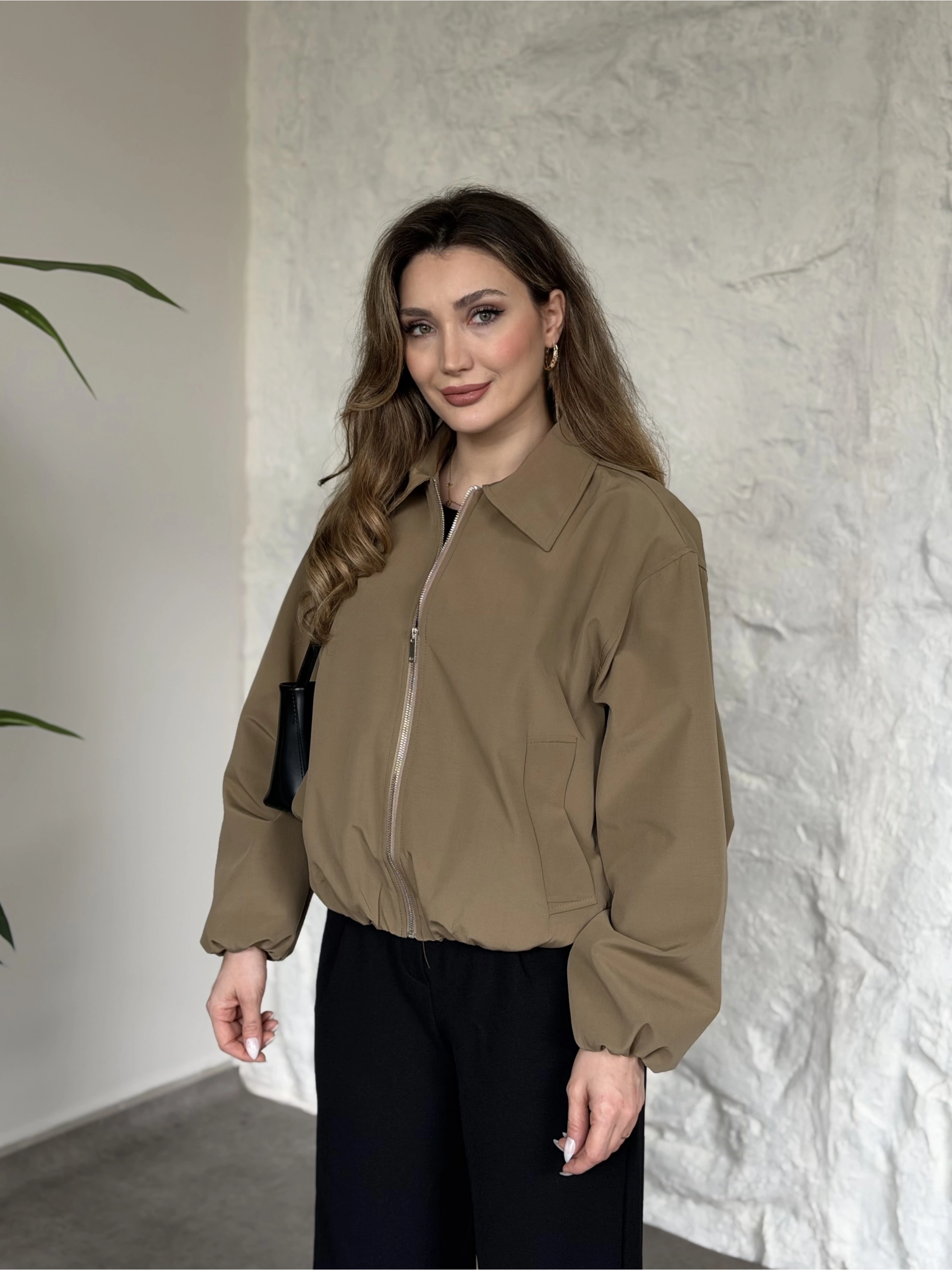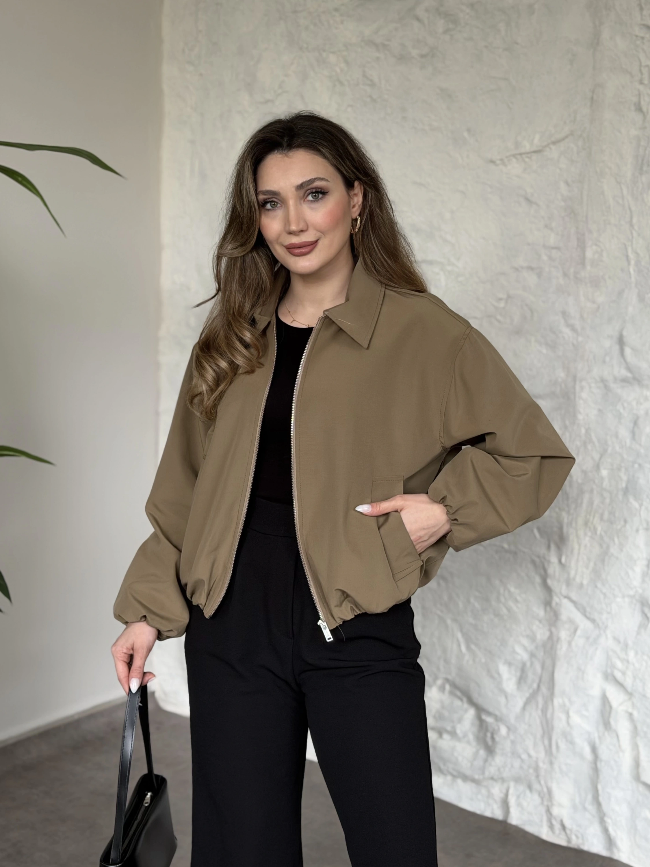 Torino kumaş beli lastikli fermuarlı ceket acı kahve