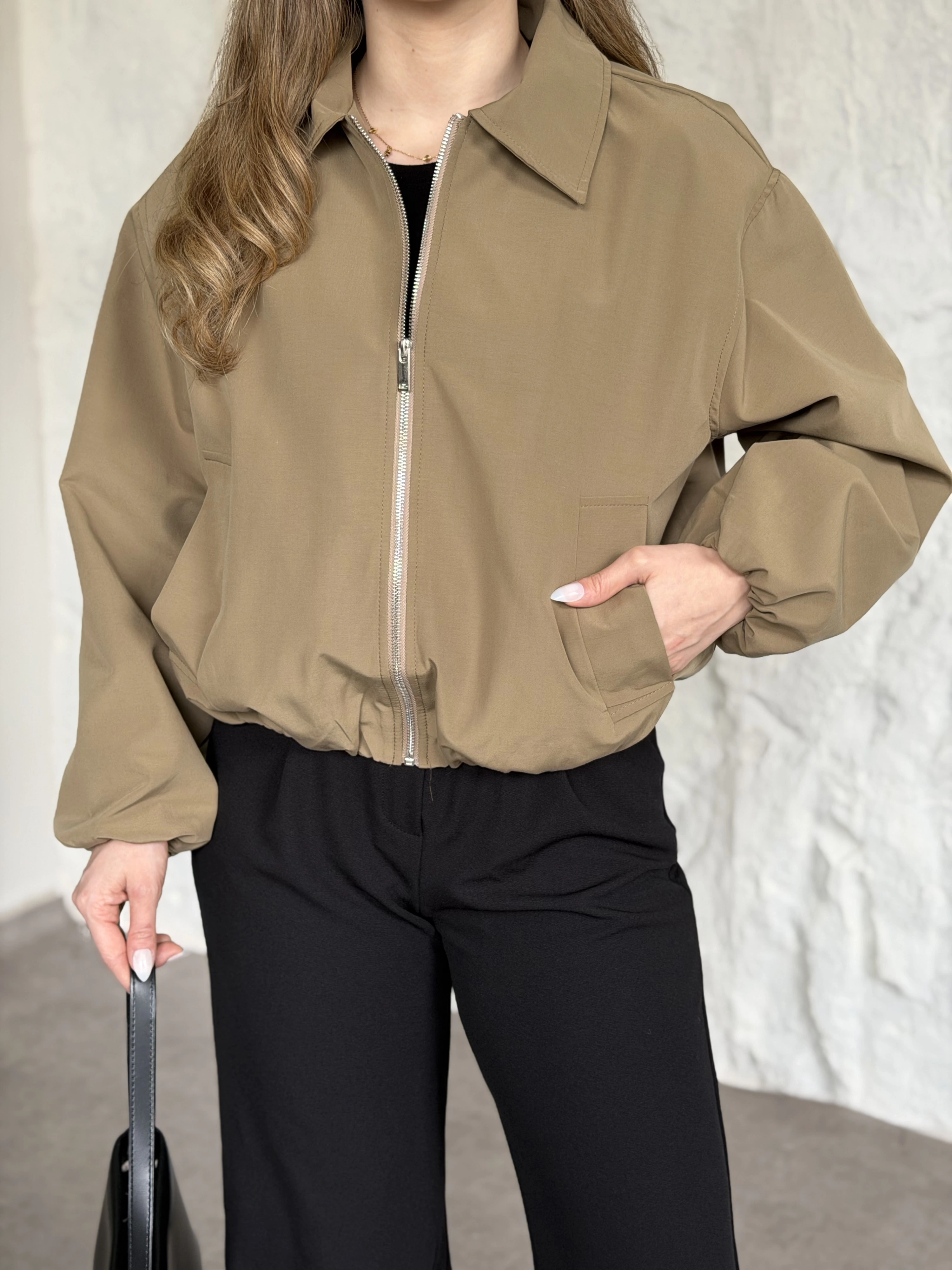 Torino kumaş beli lastikli fermuarlı ceket bej