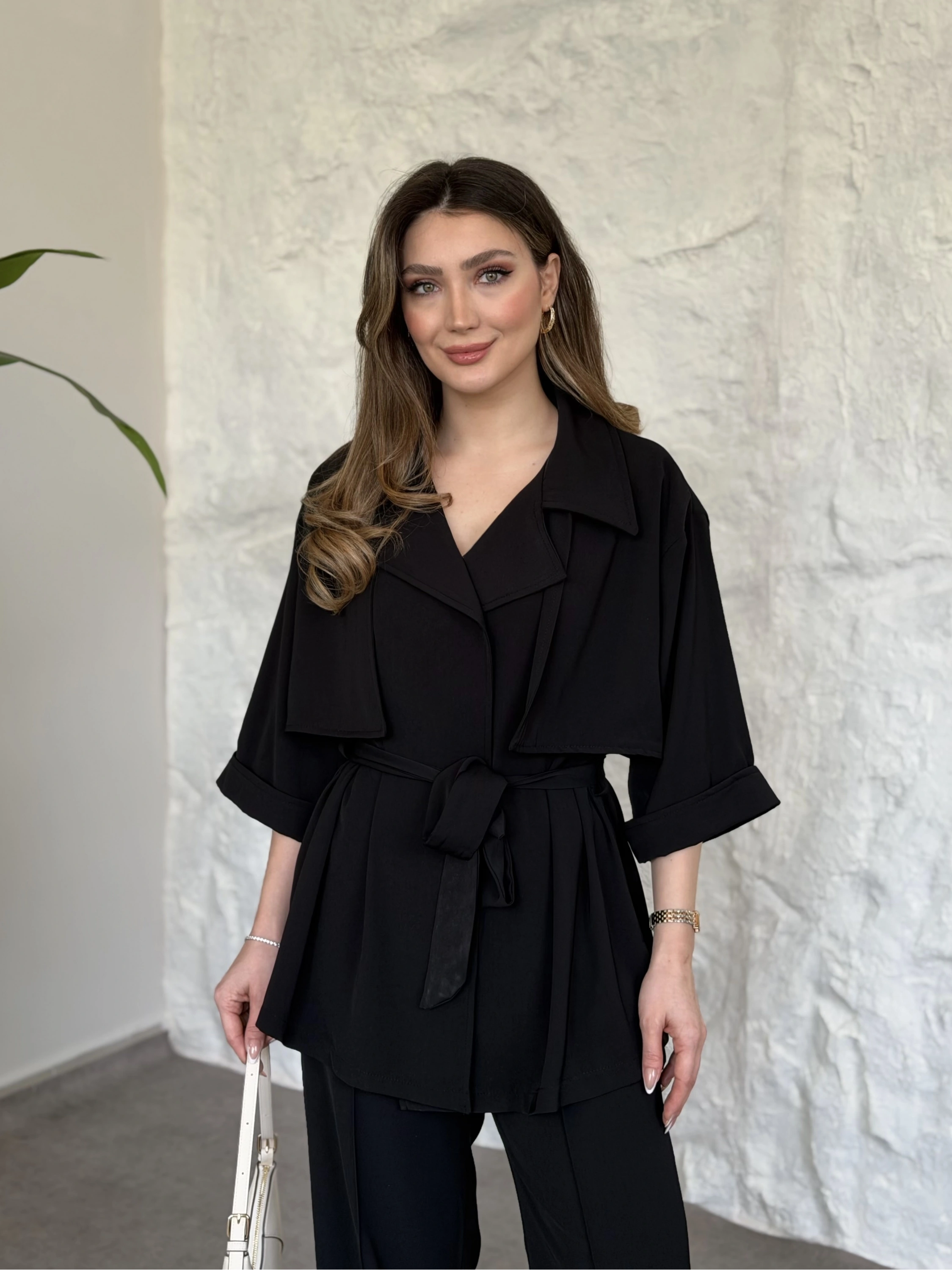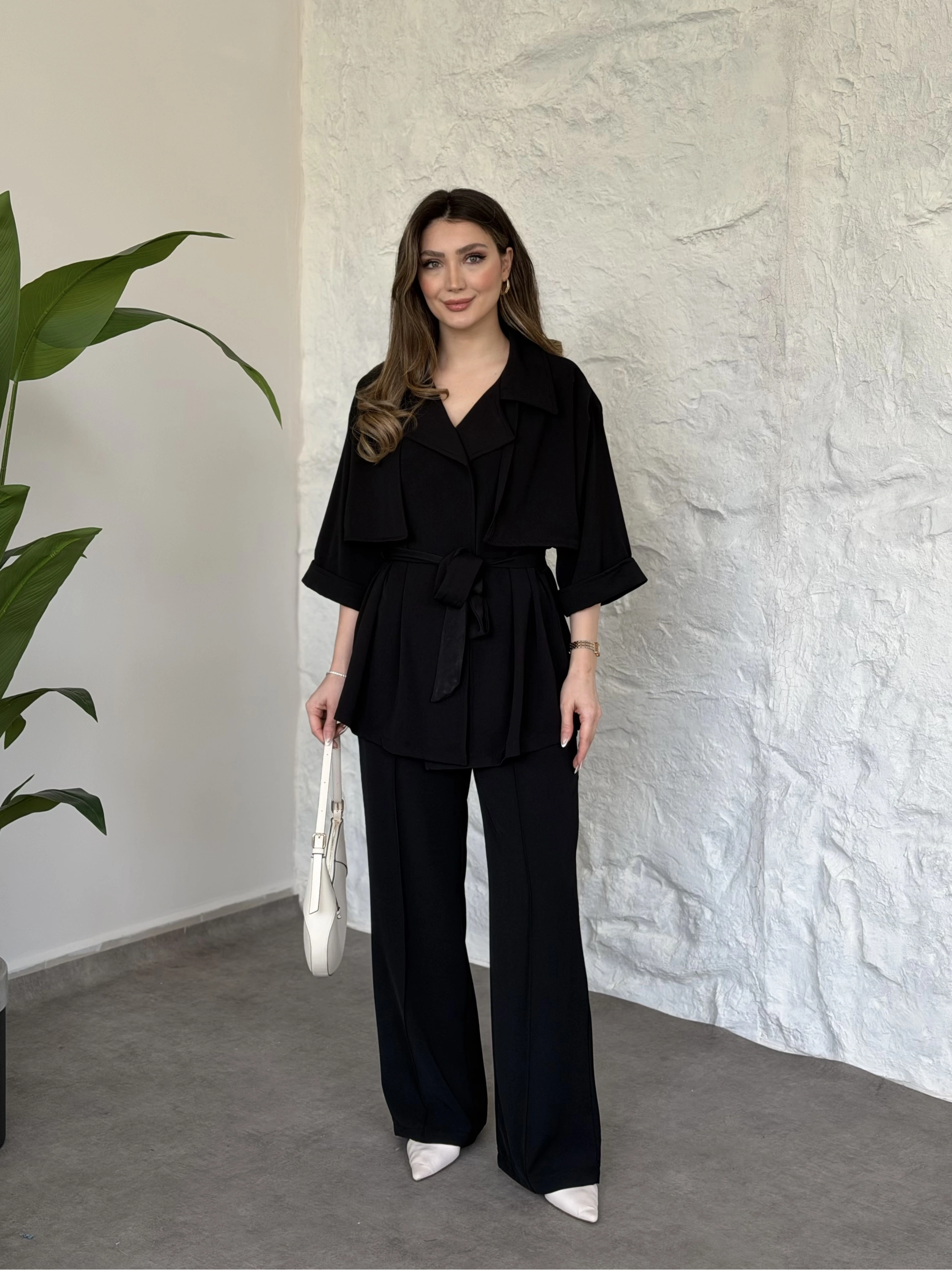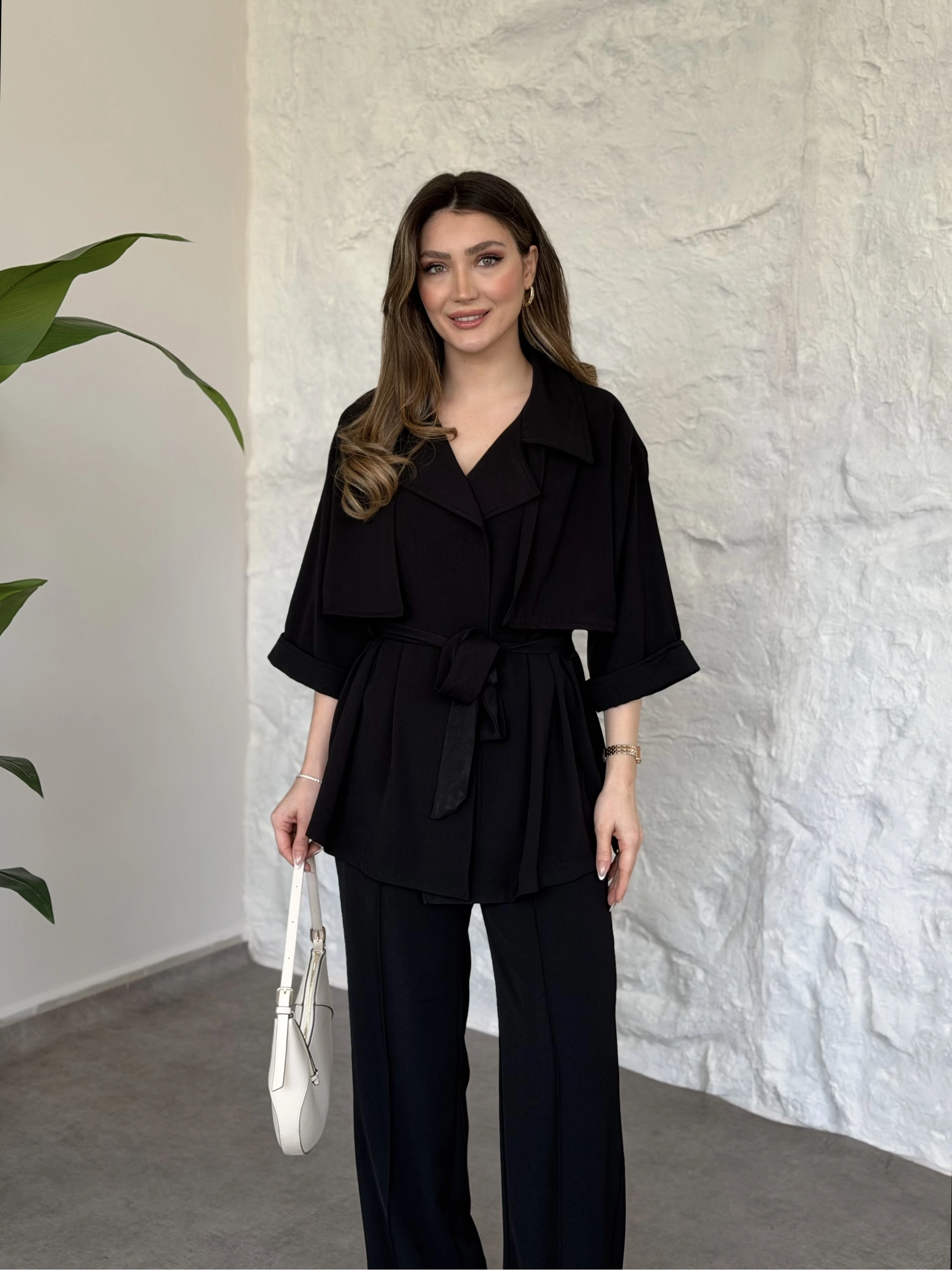 Trenç görünümlü belinden kuşaklı tivil takım siyah