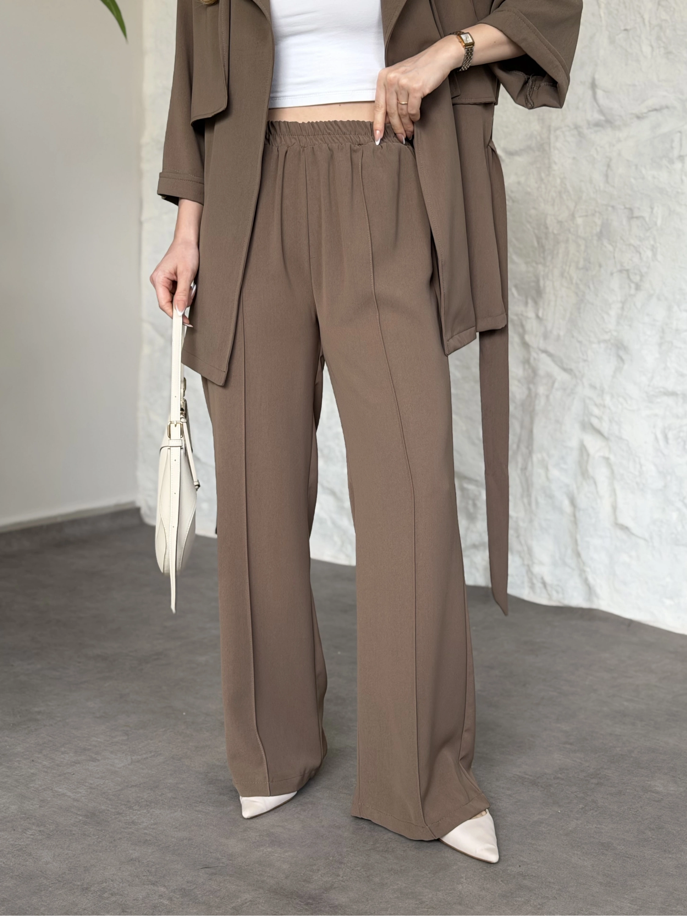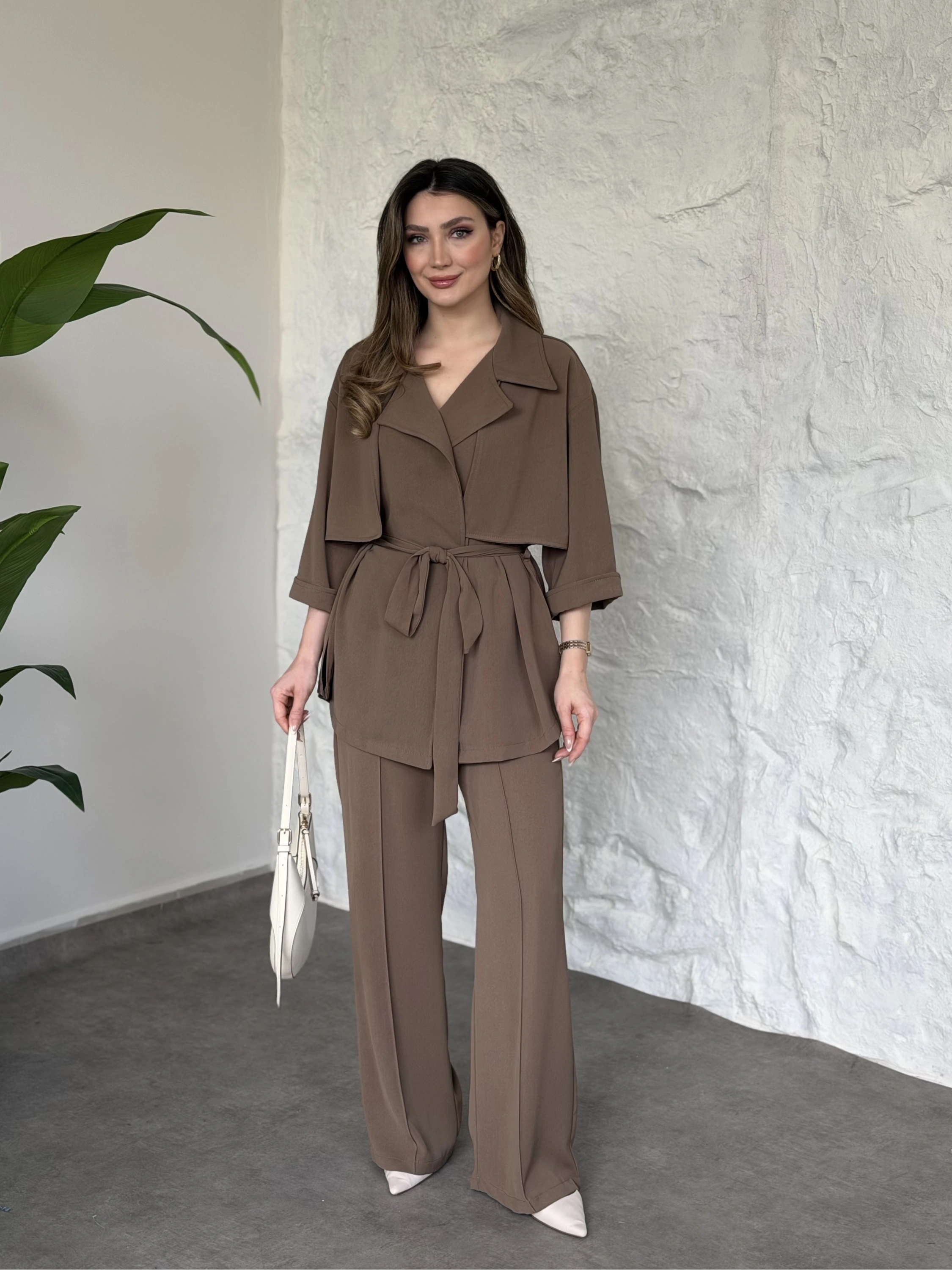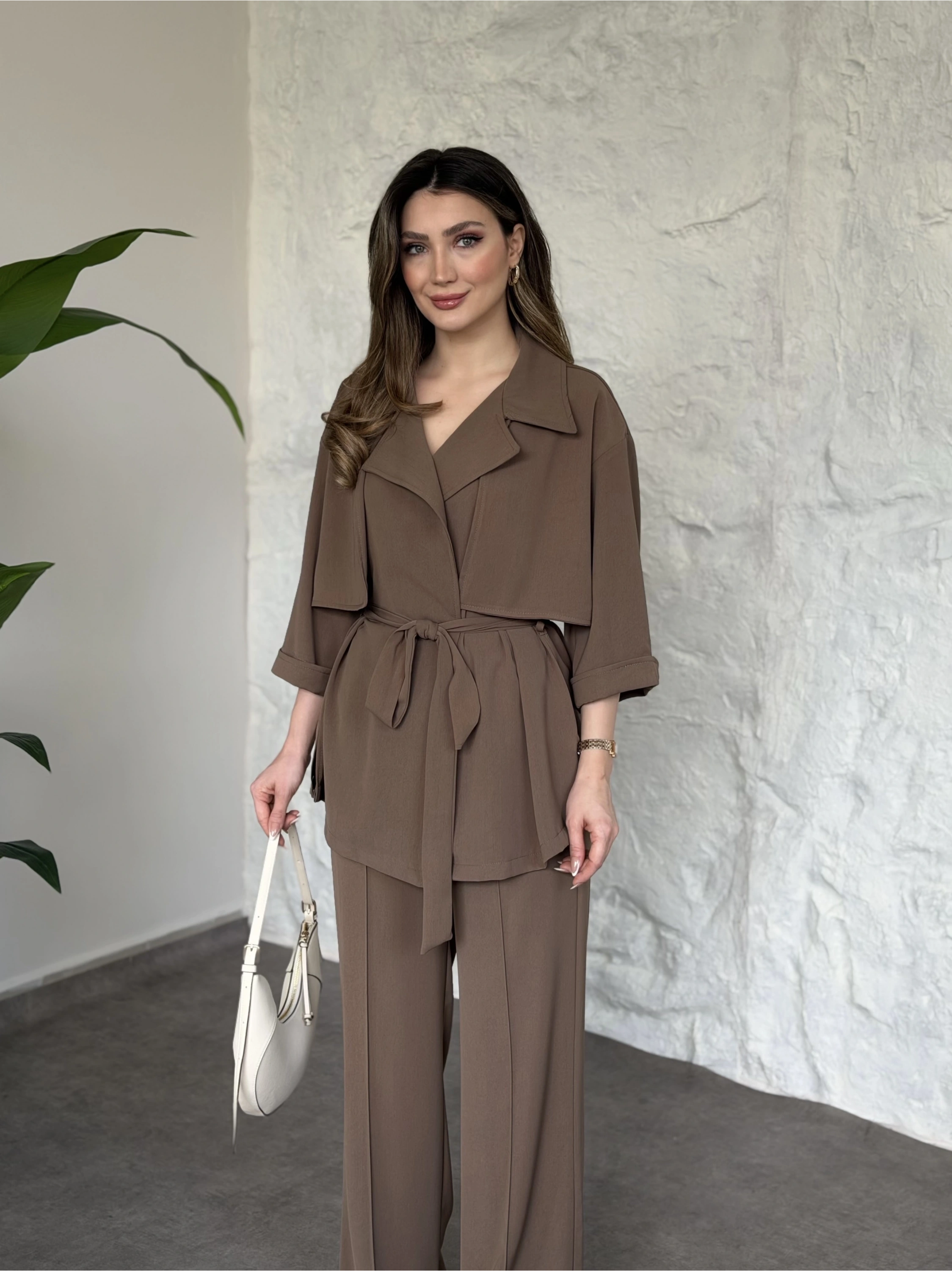 Trenç görünümlü belinden kuşaklı tivil takım vizon