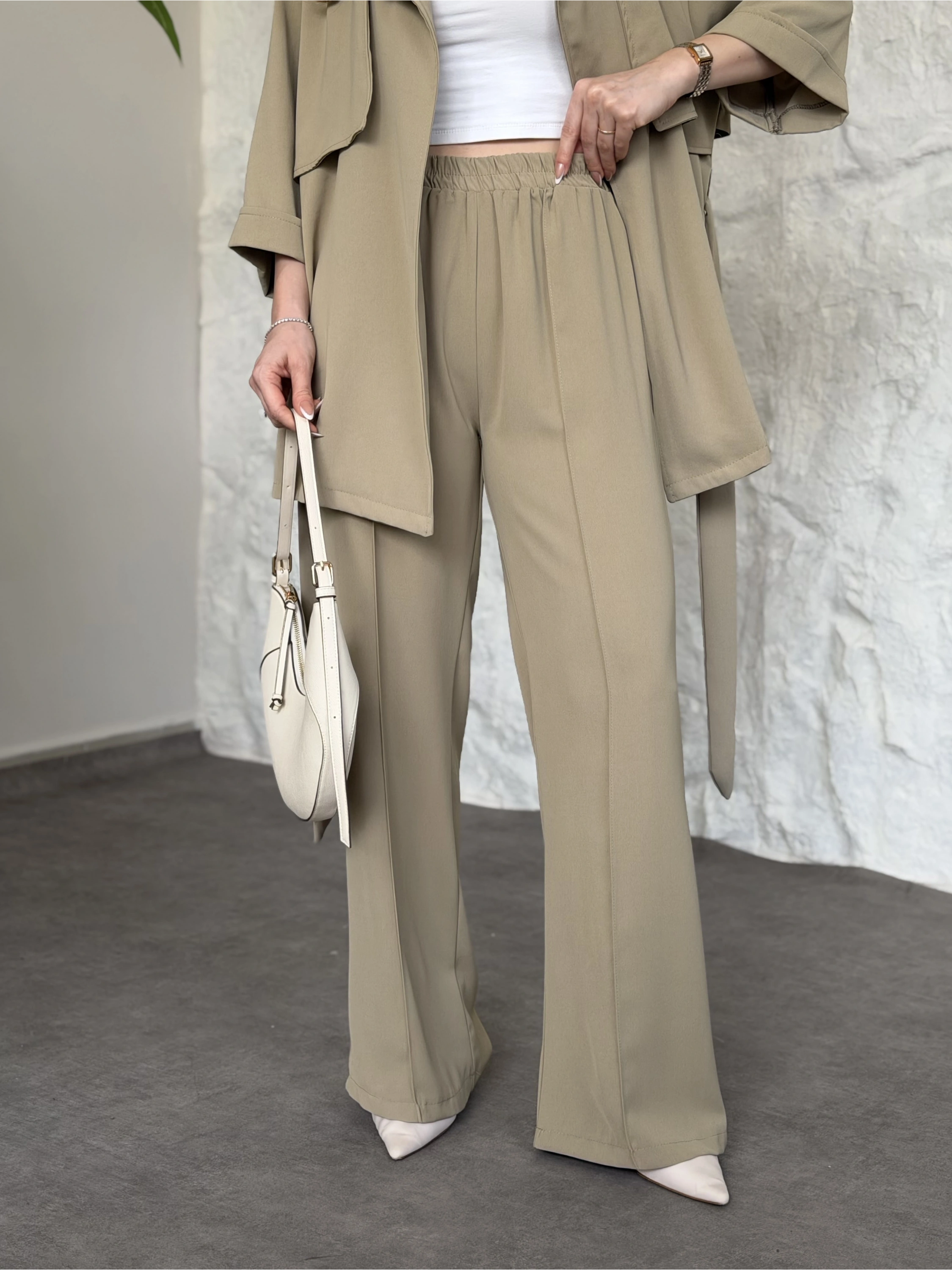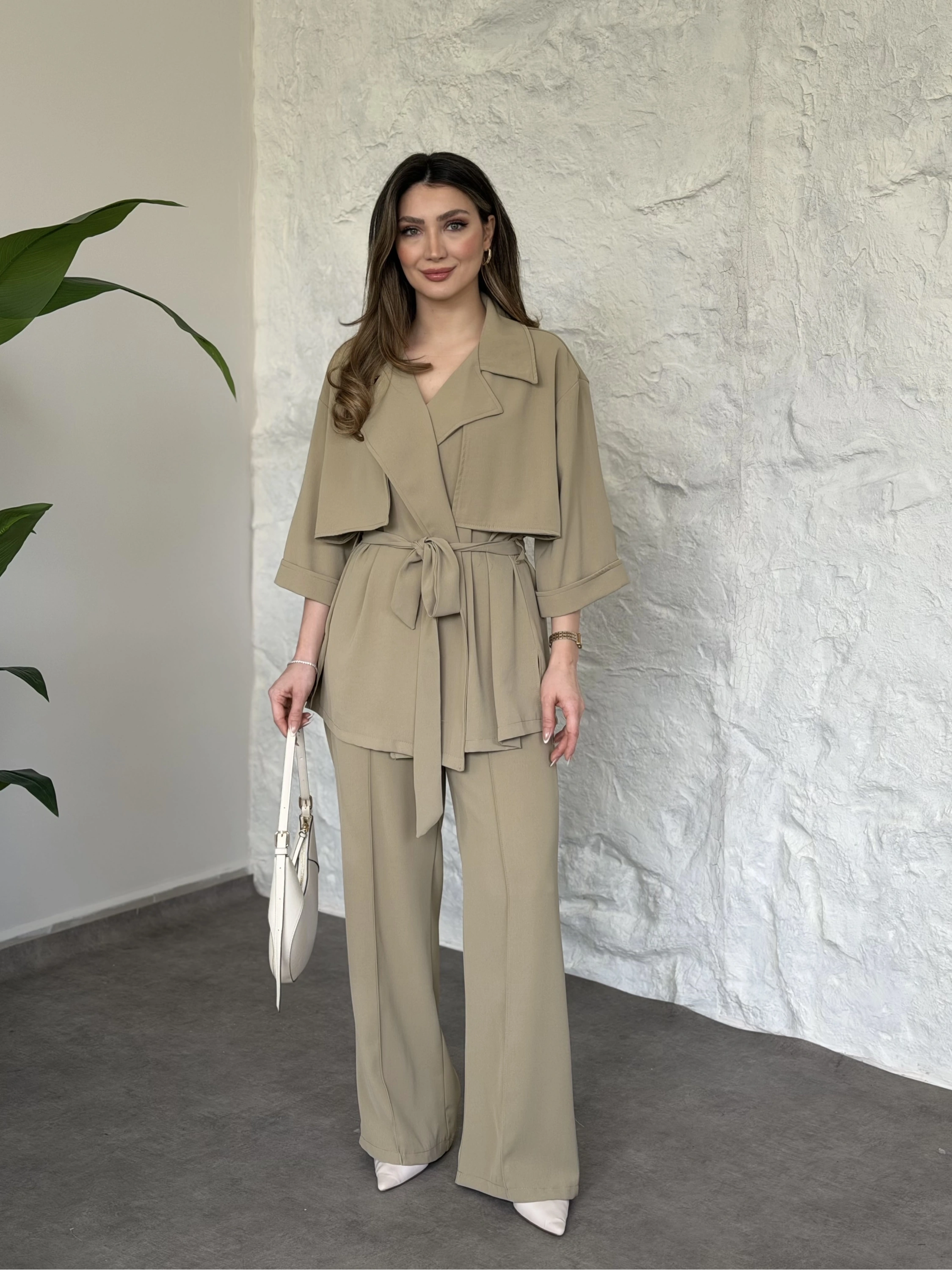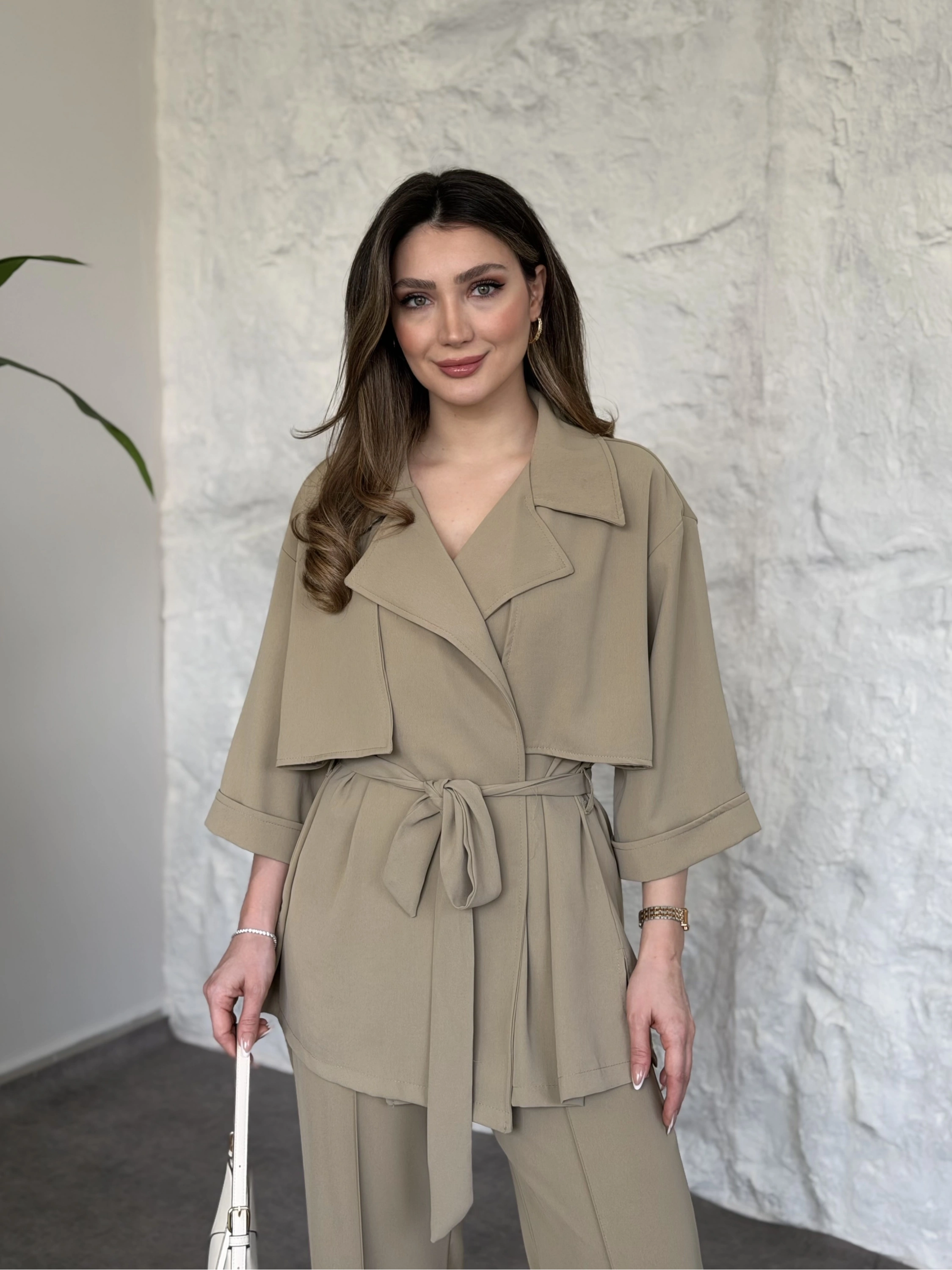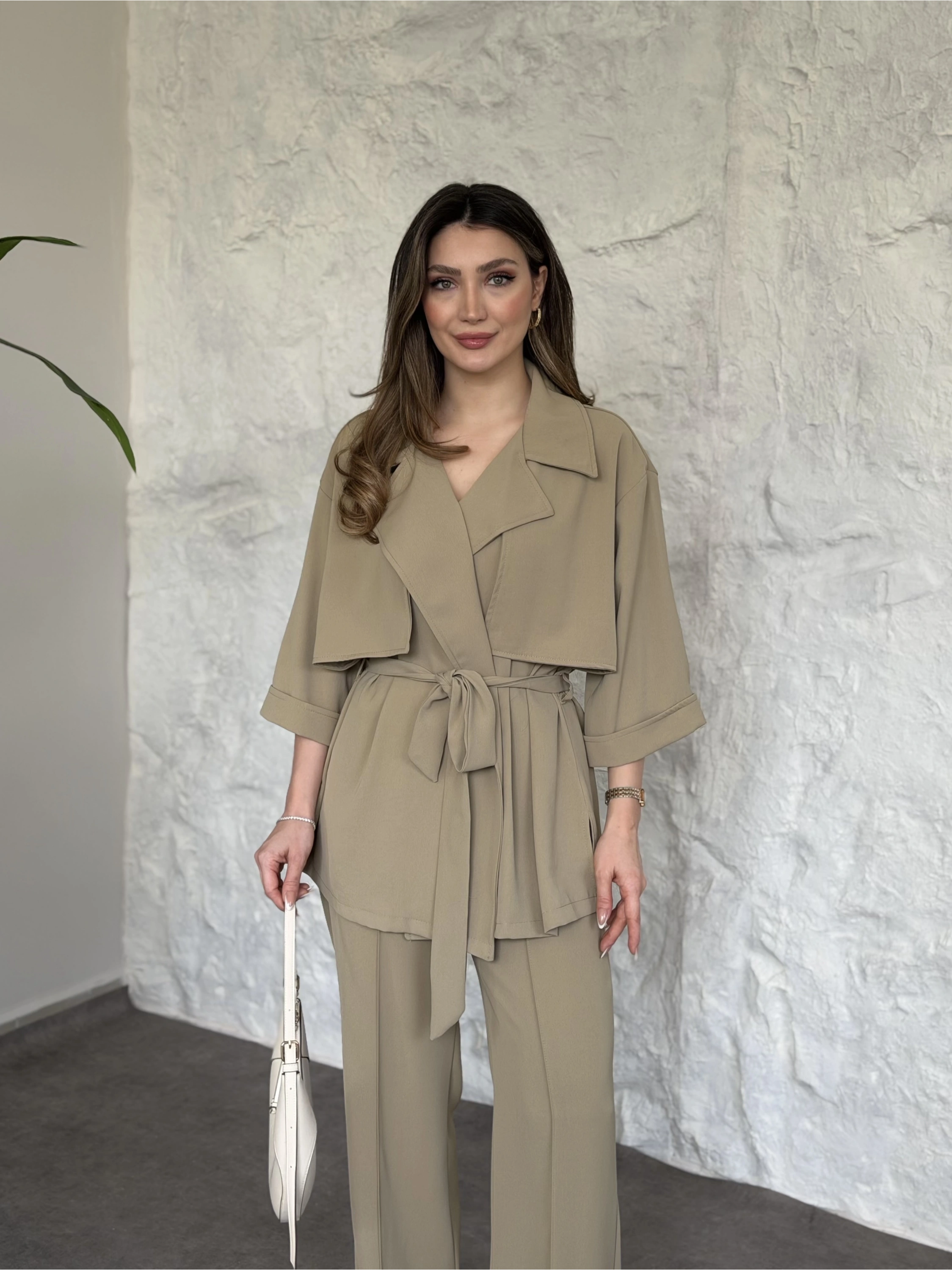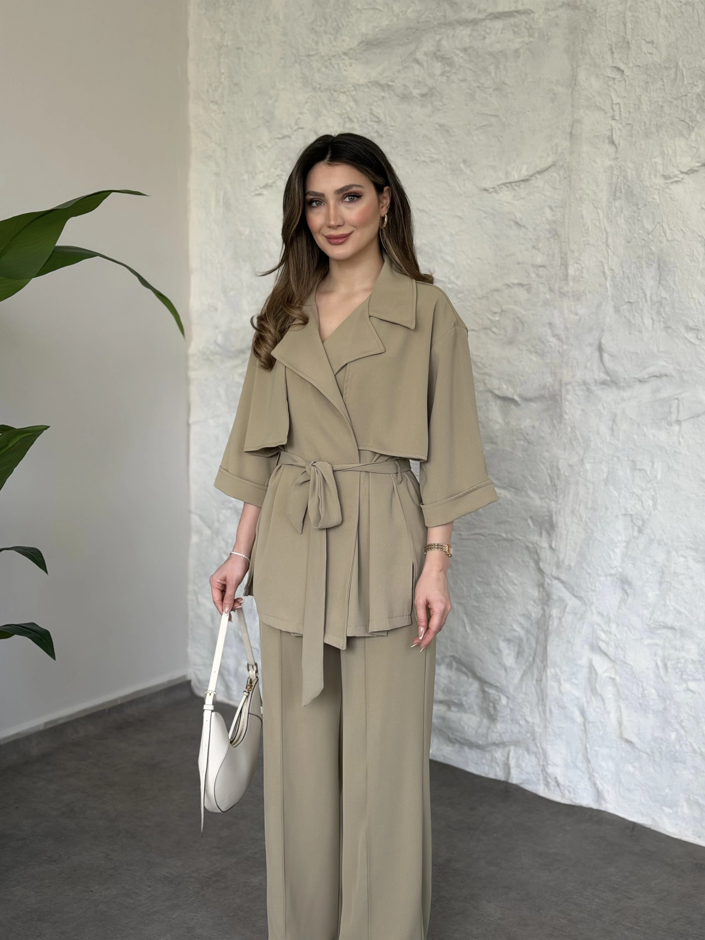 Trenç görünümlü belinden kuşaklı tivil takım krem