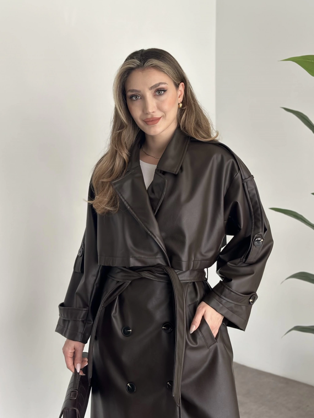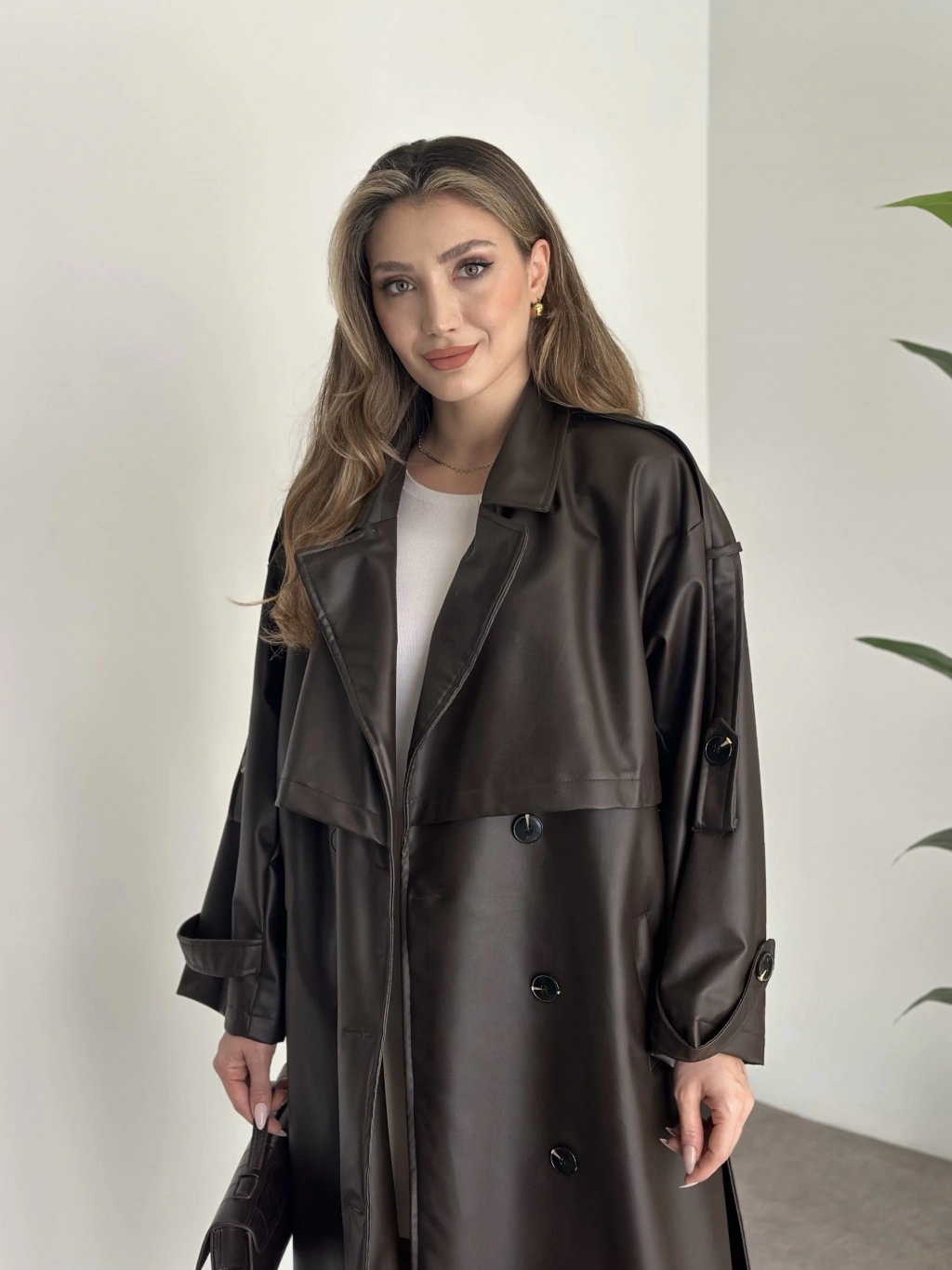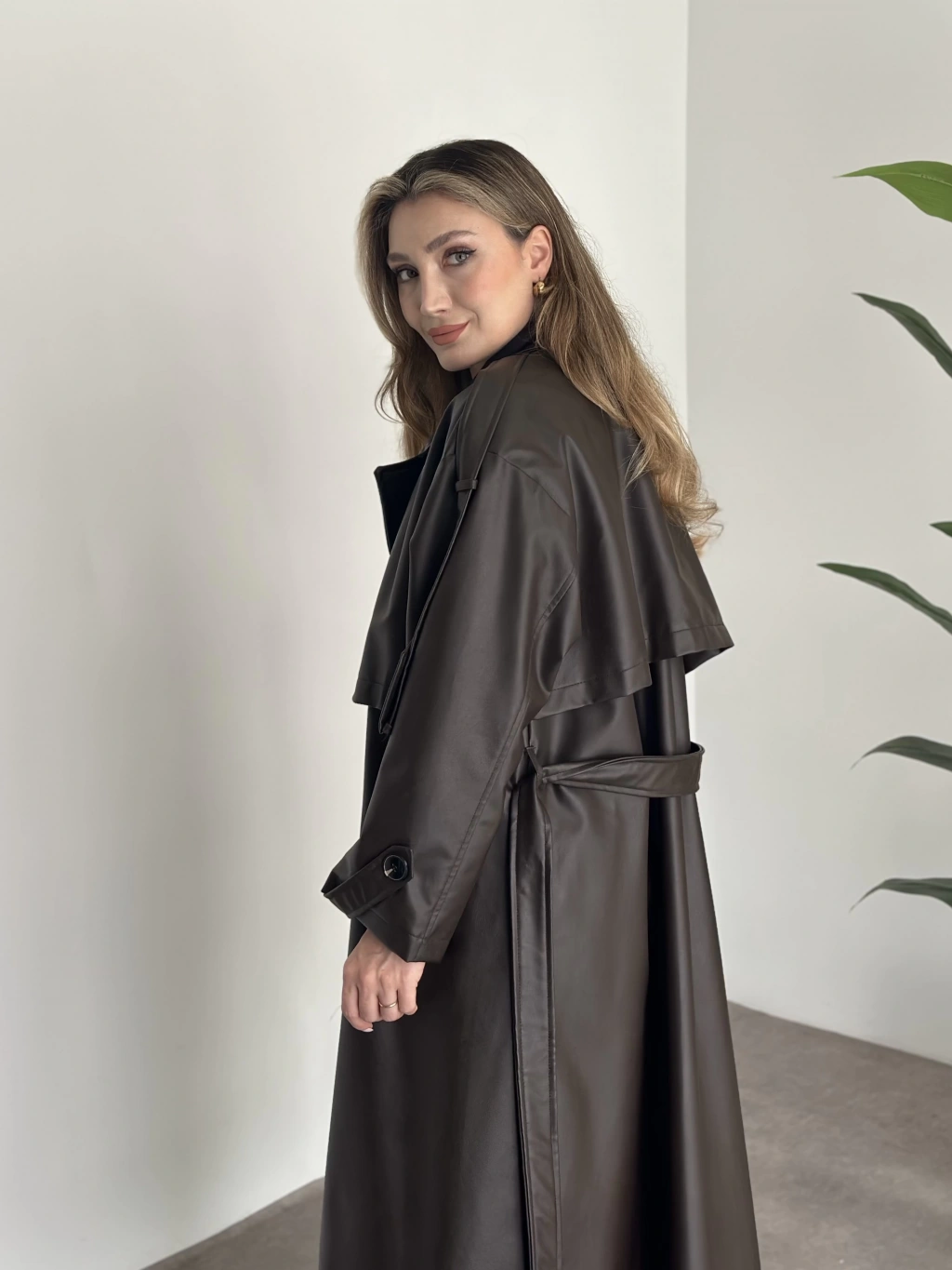 Uzun beli kuşaklı oversize astarlı deri trençkot kahve