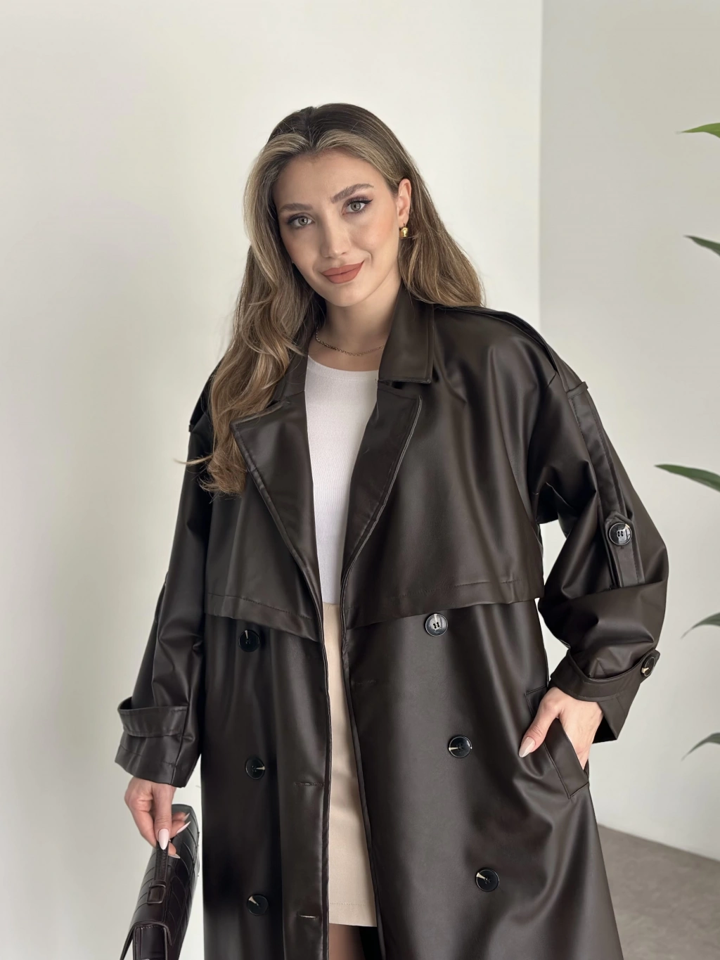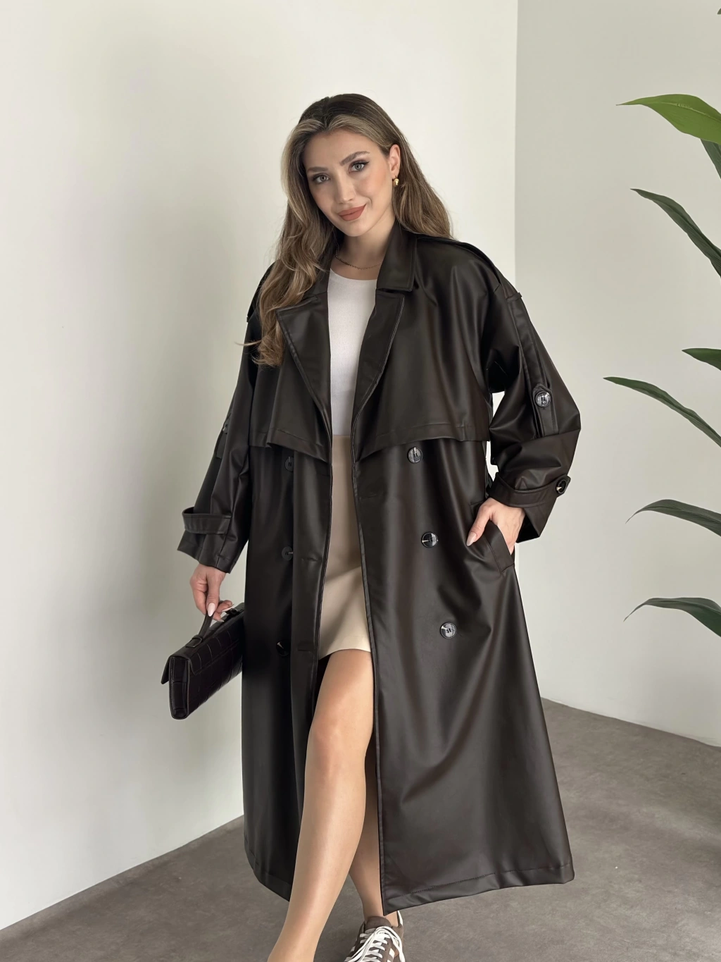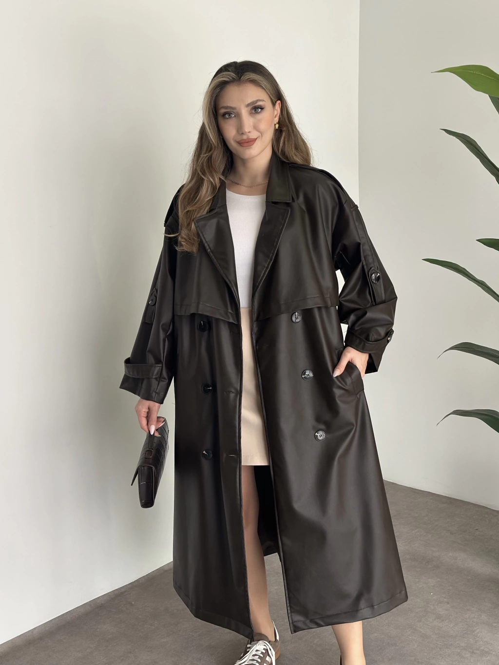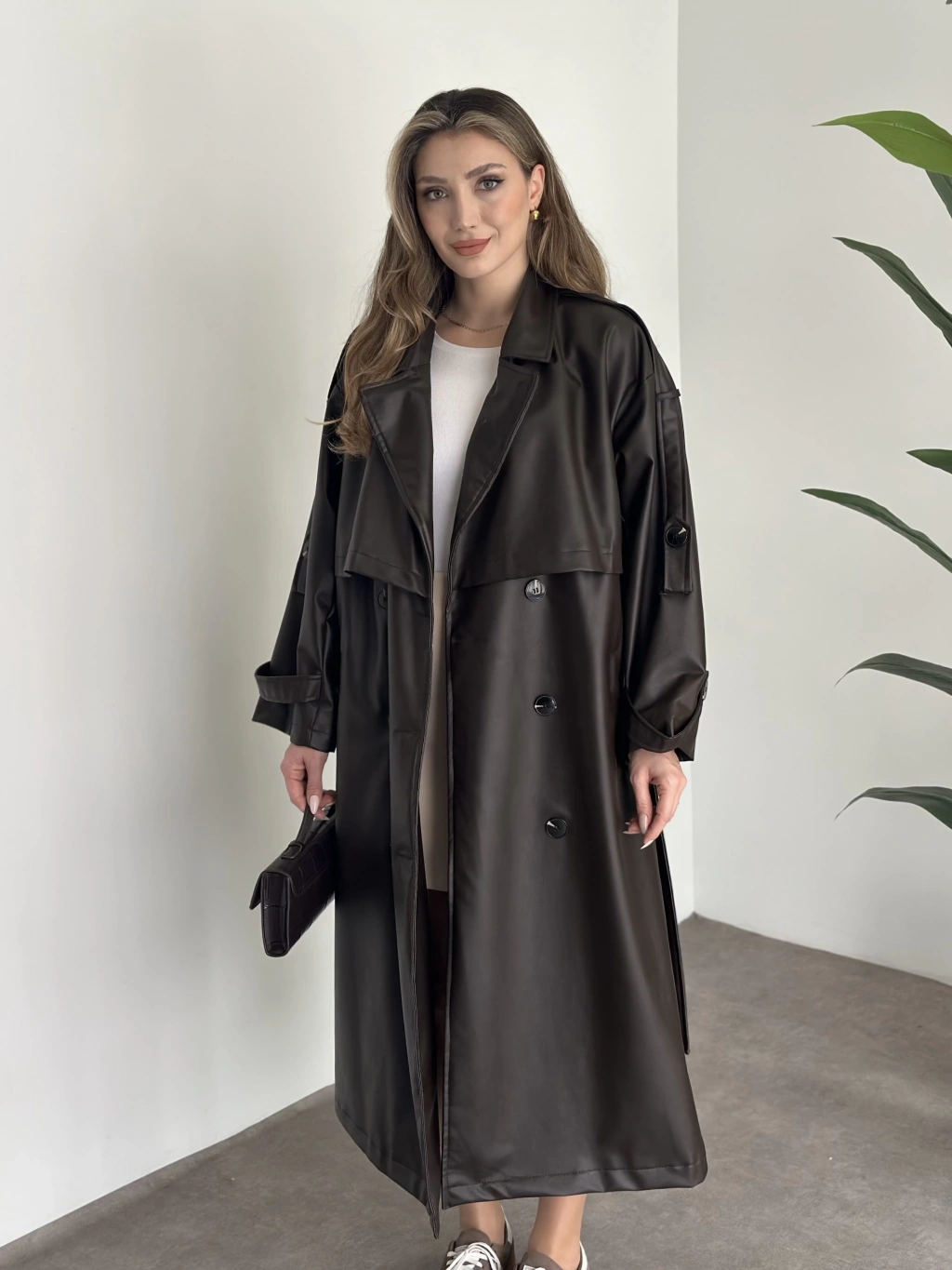 Uzun beli kuşaklı oversize astarlı deri trençkot kahve