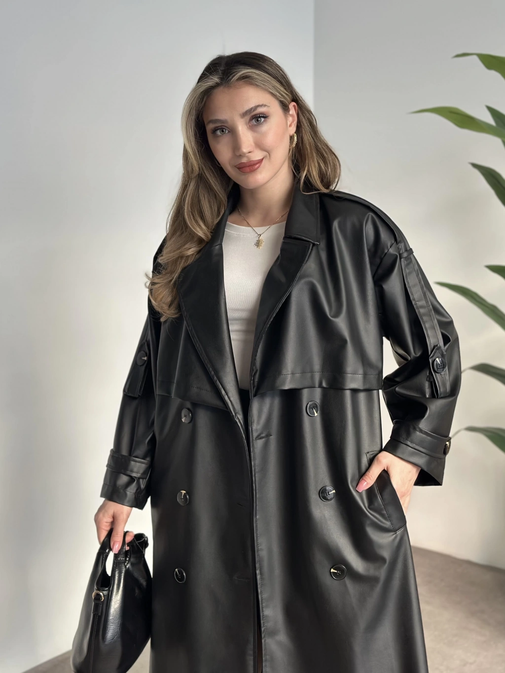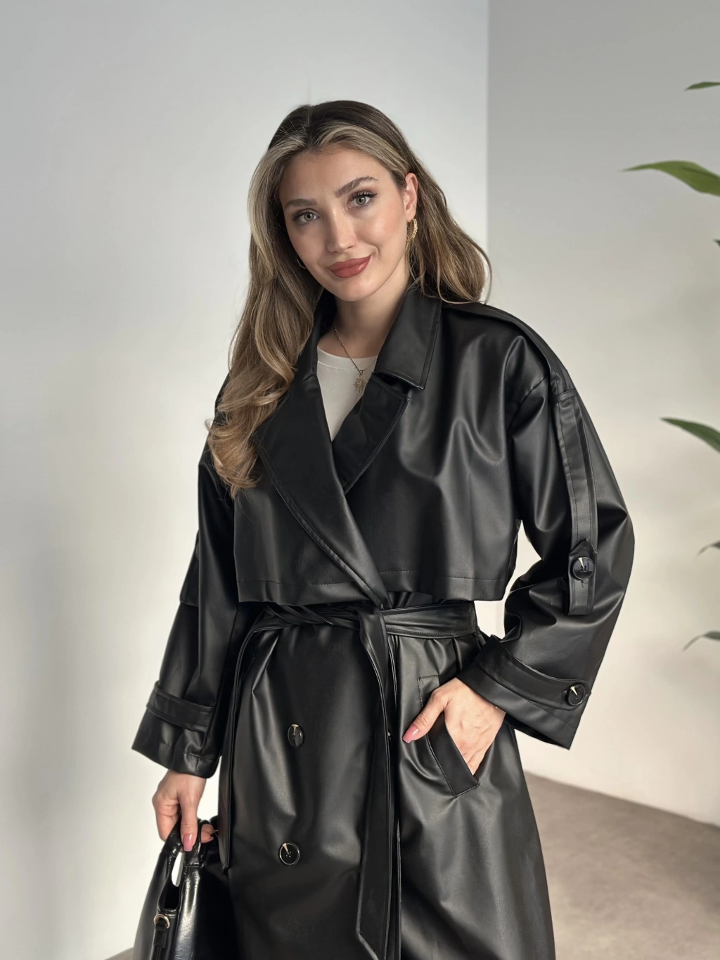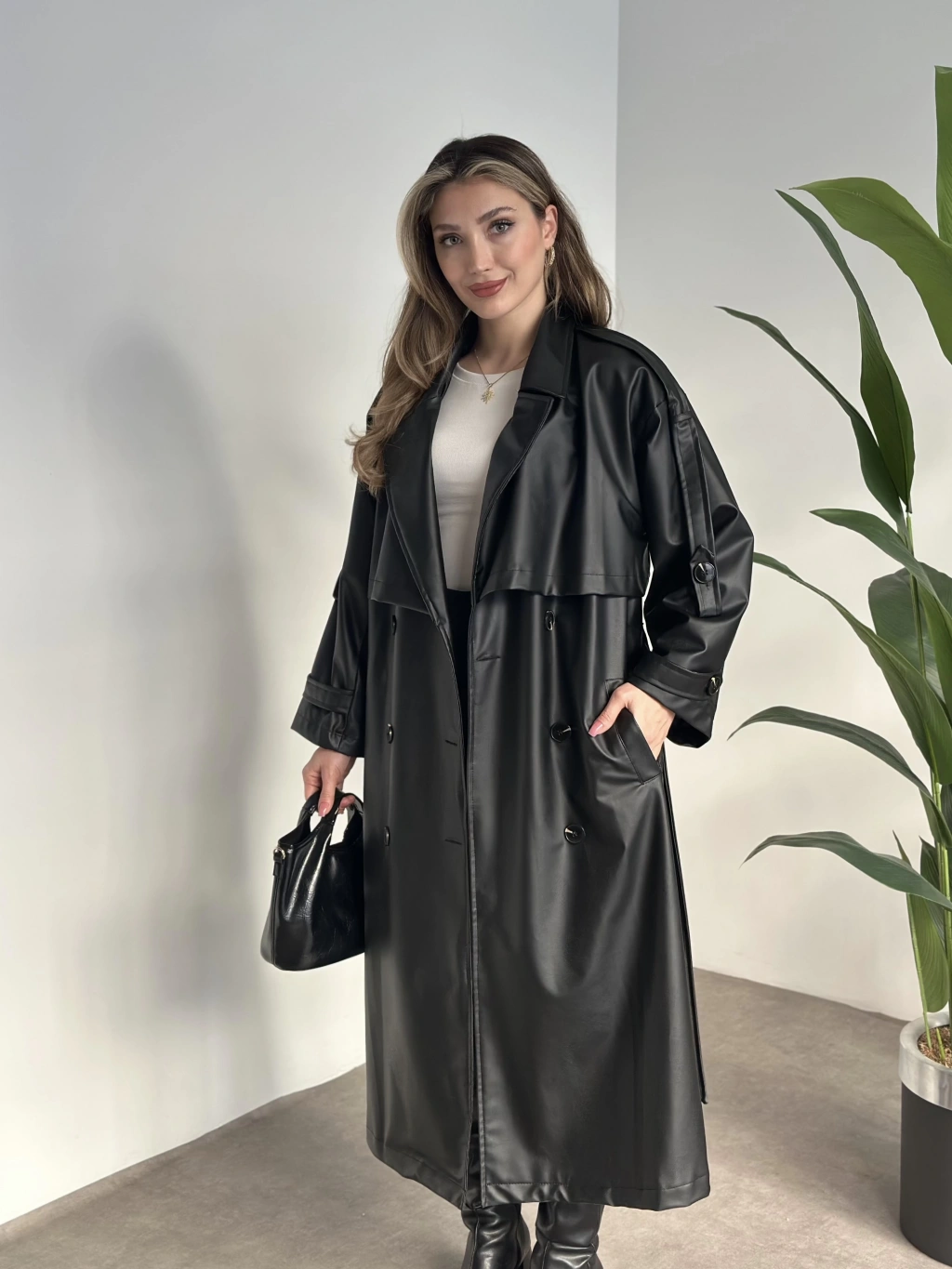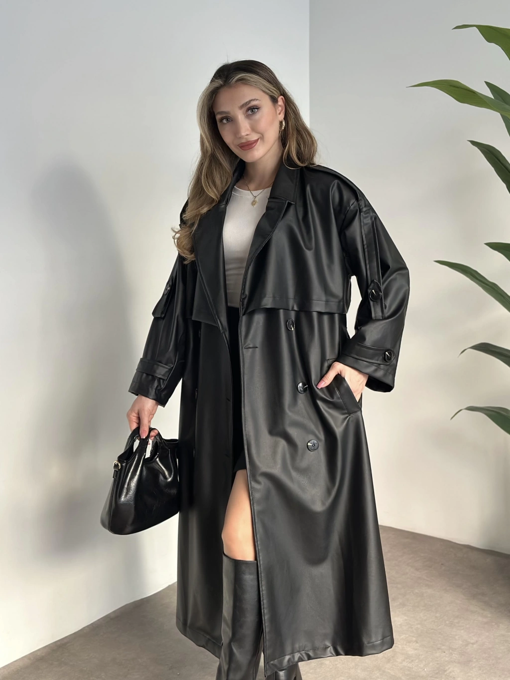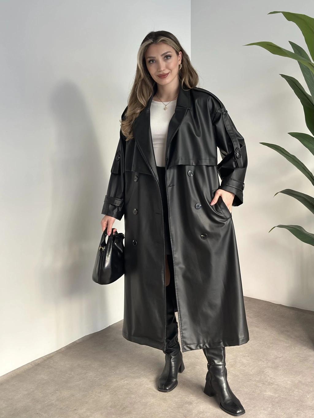 Uzun beli kuşaklı oversize astarlı deri trençkot siyah
