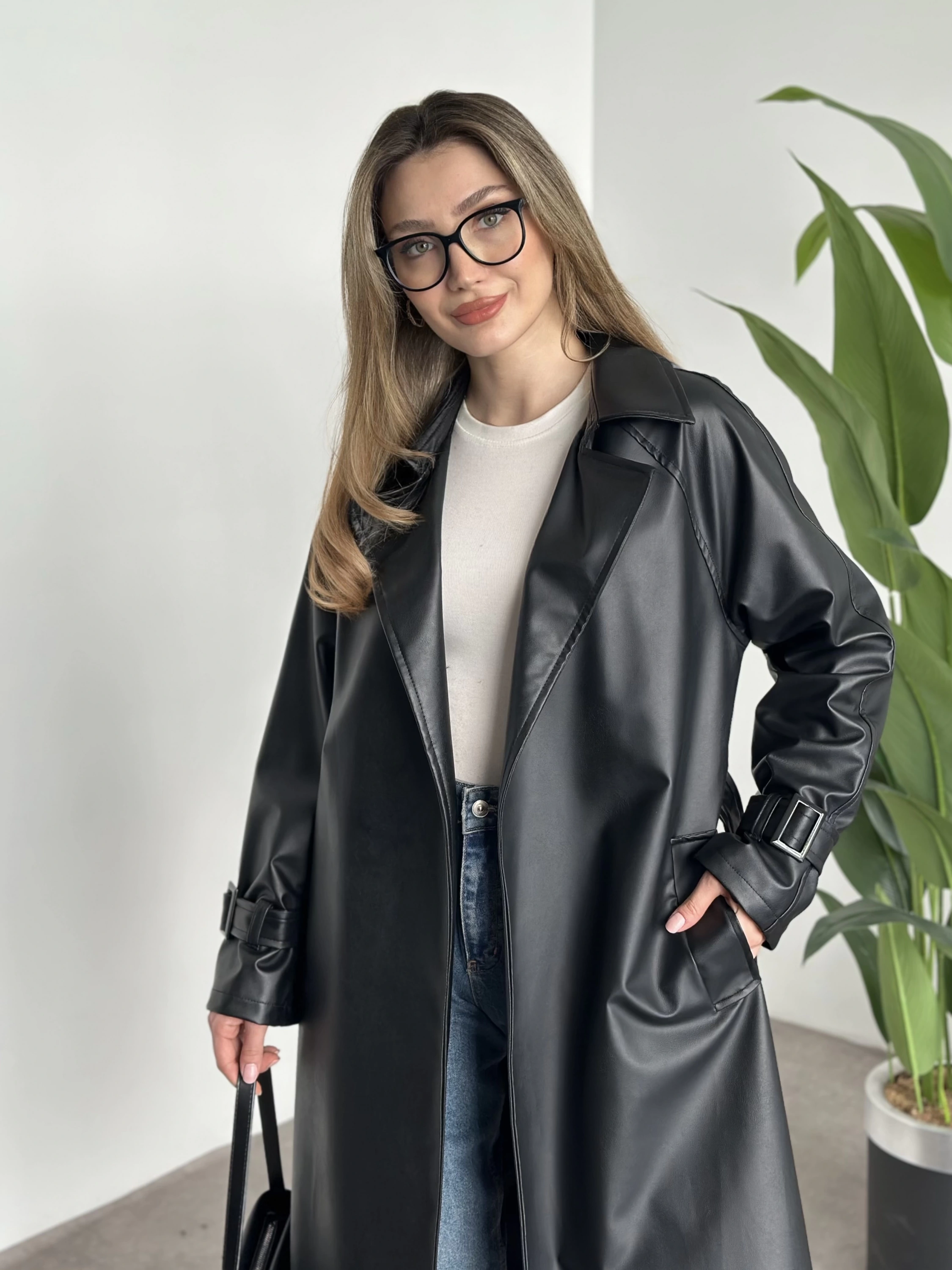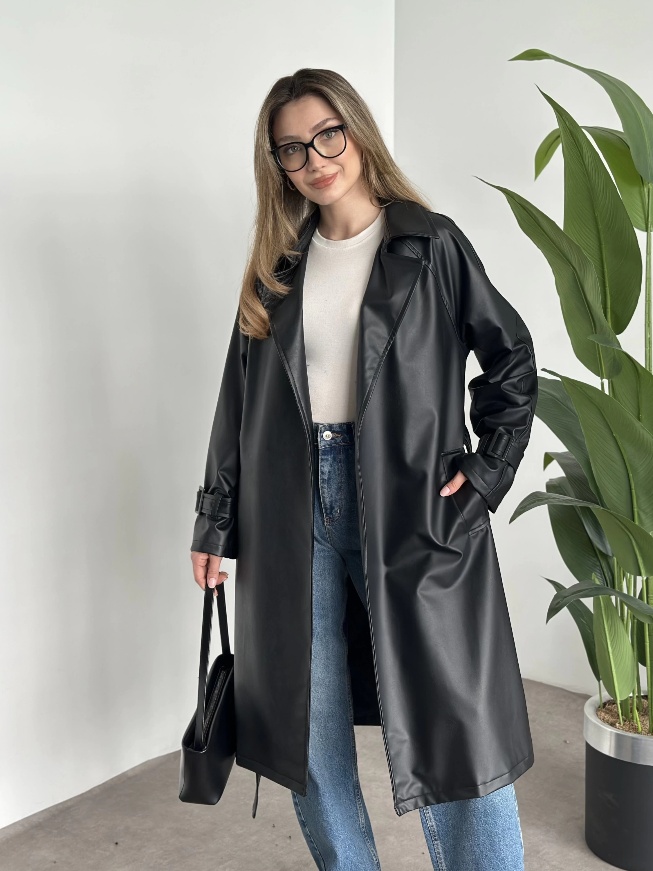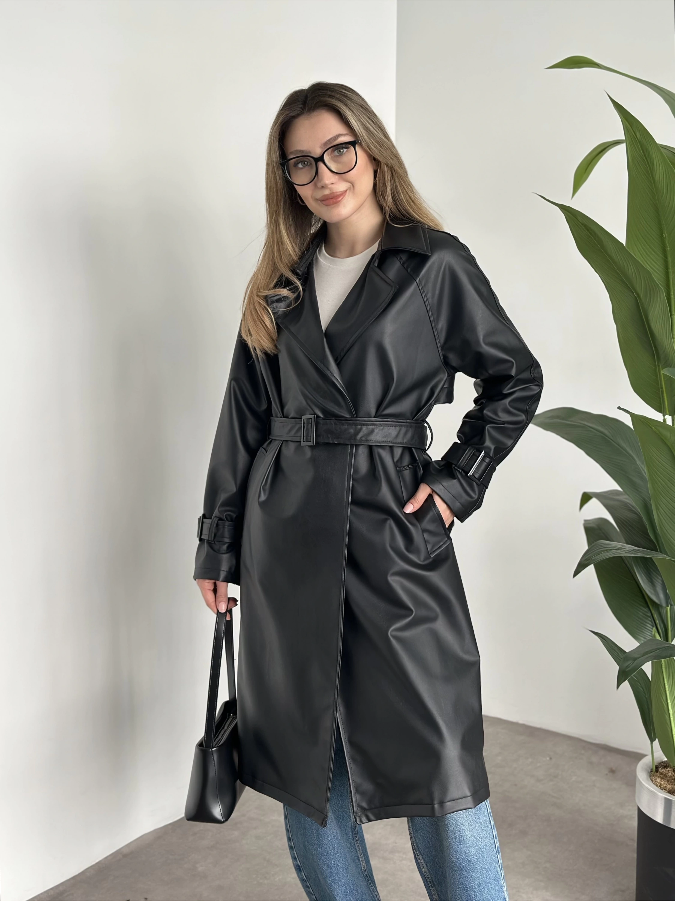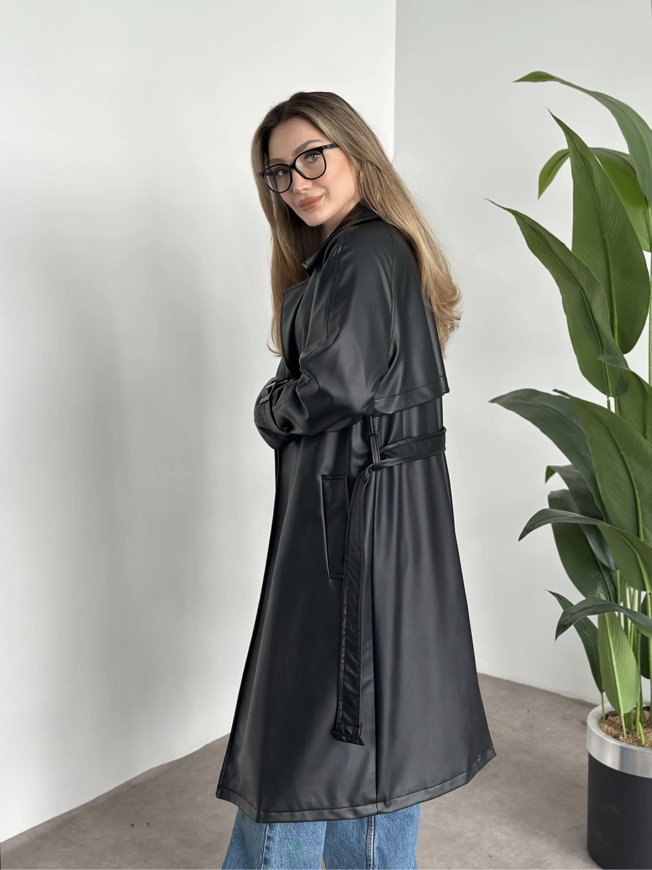 Uzun belinden kemerli deri trenç siyah