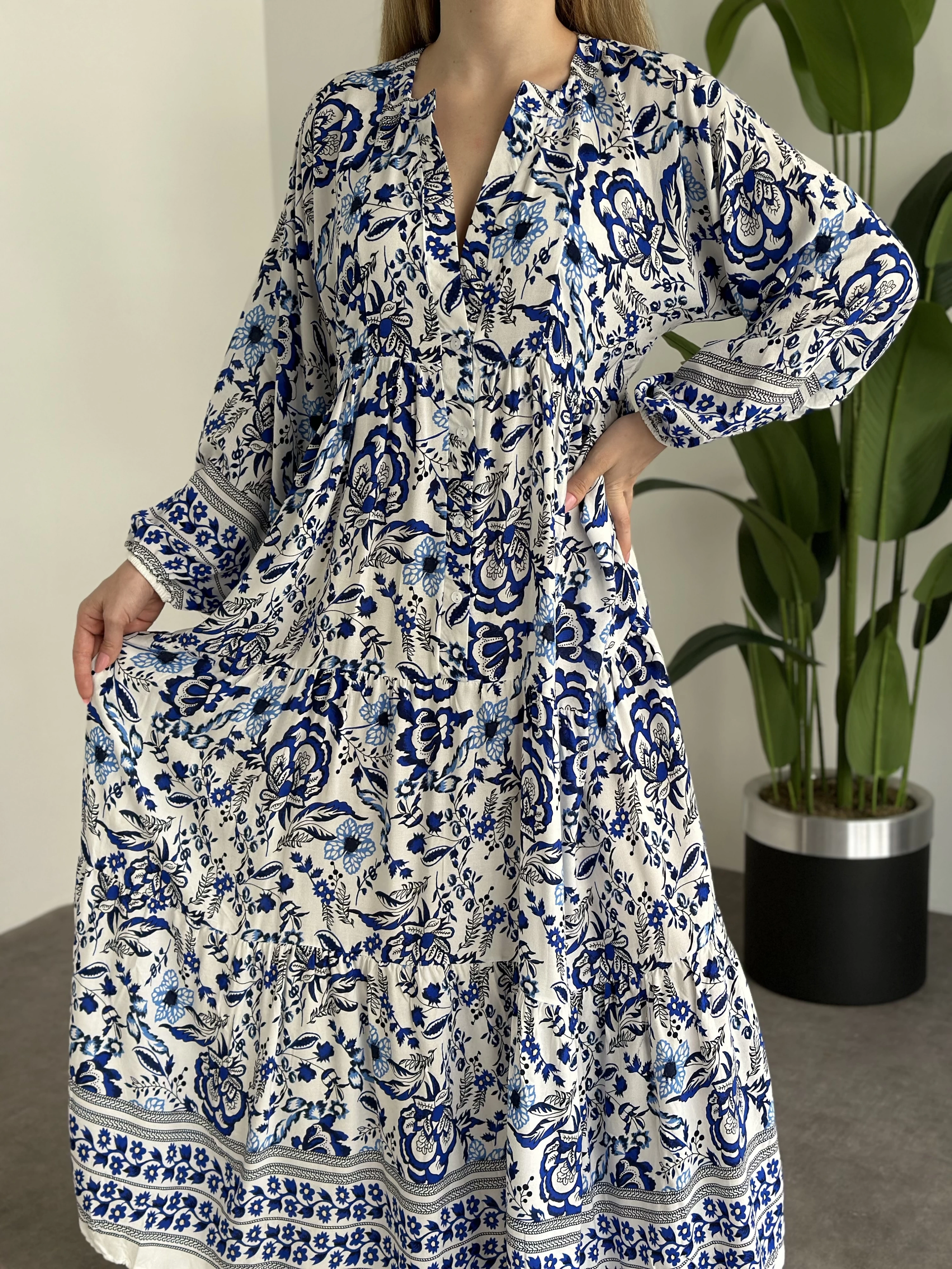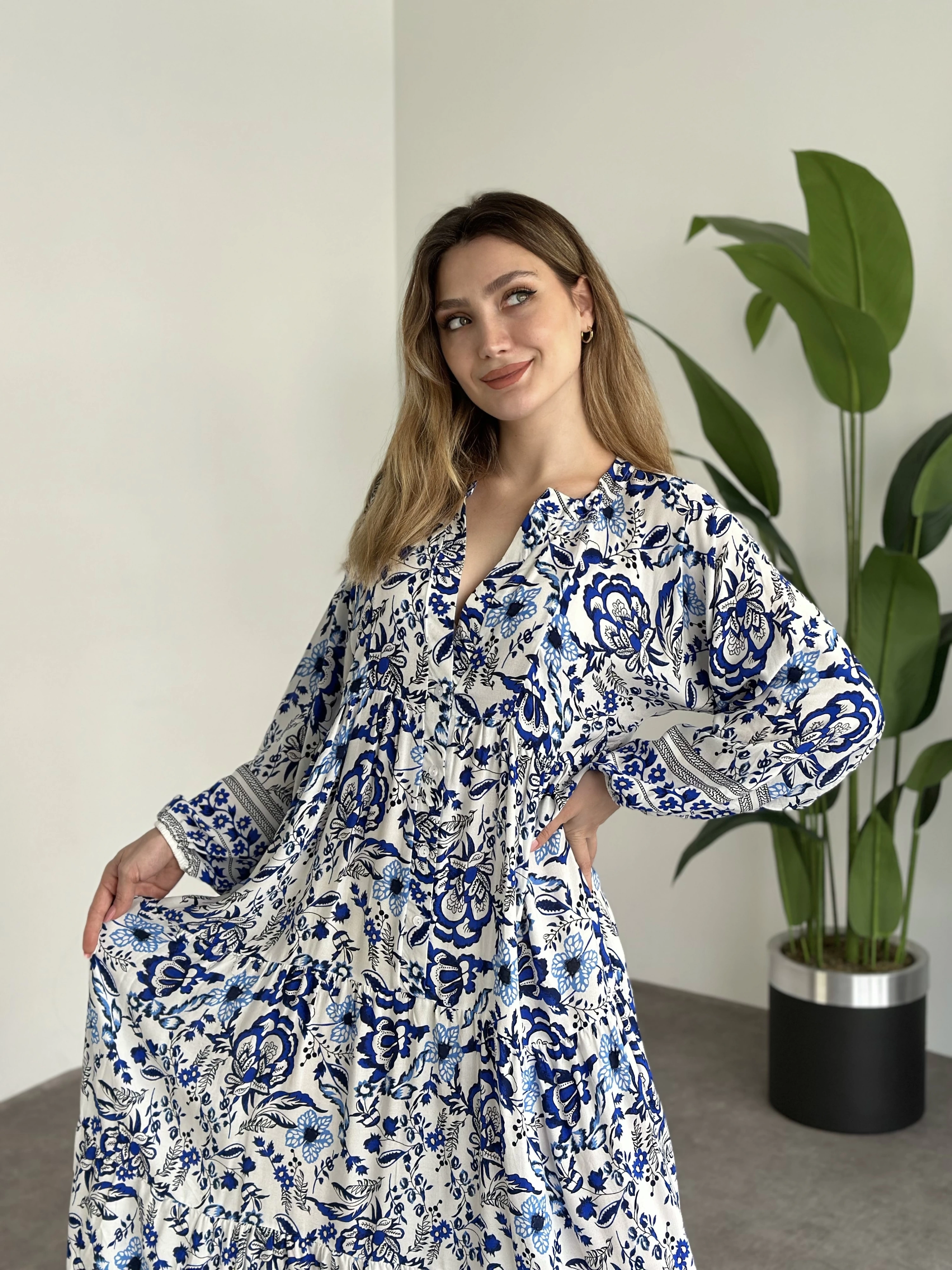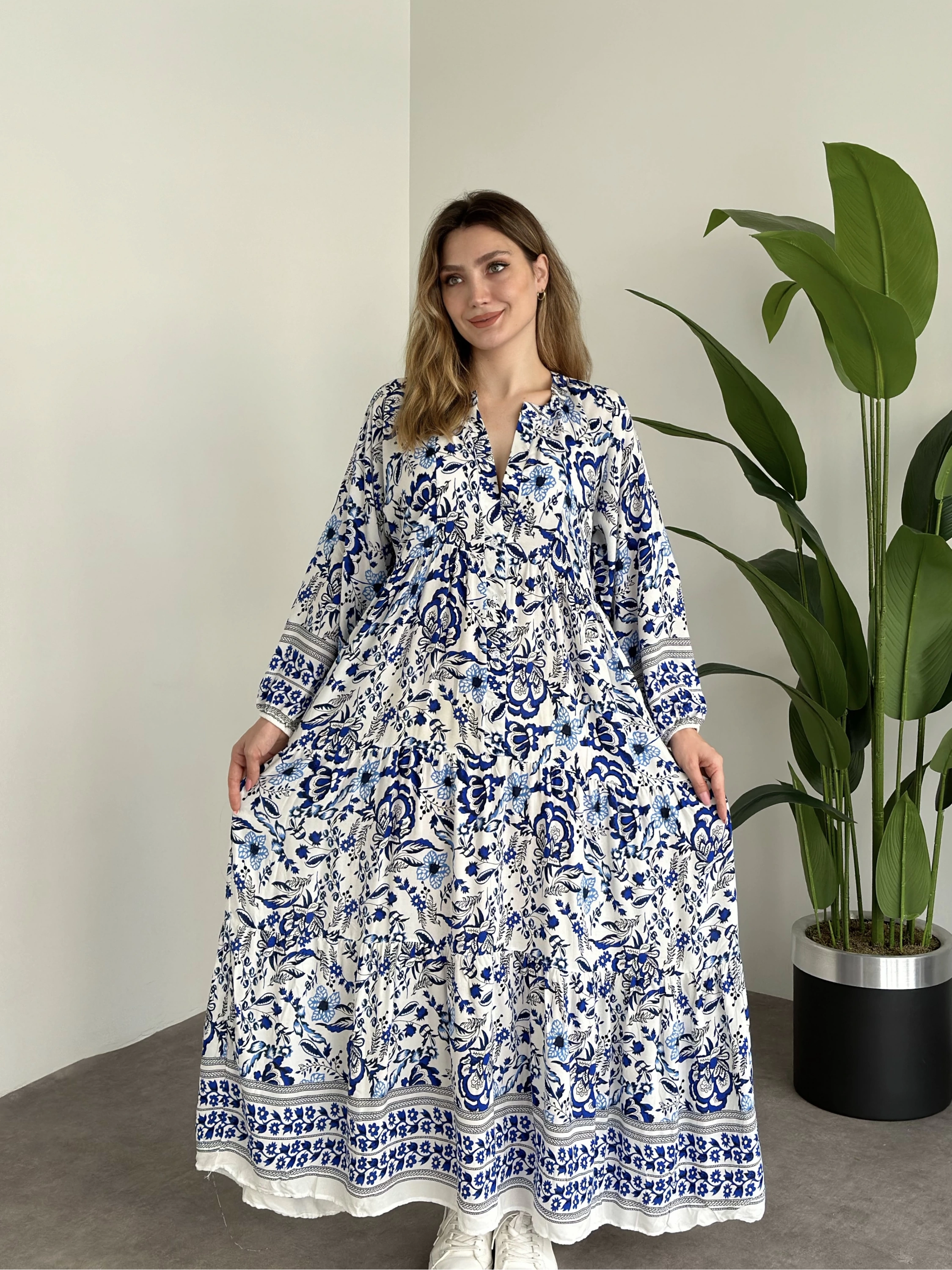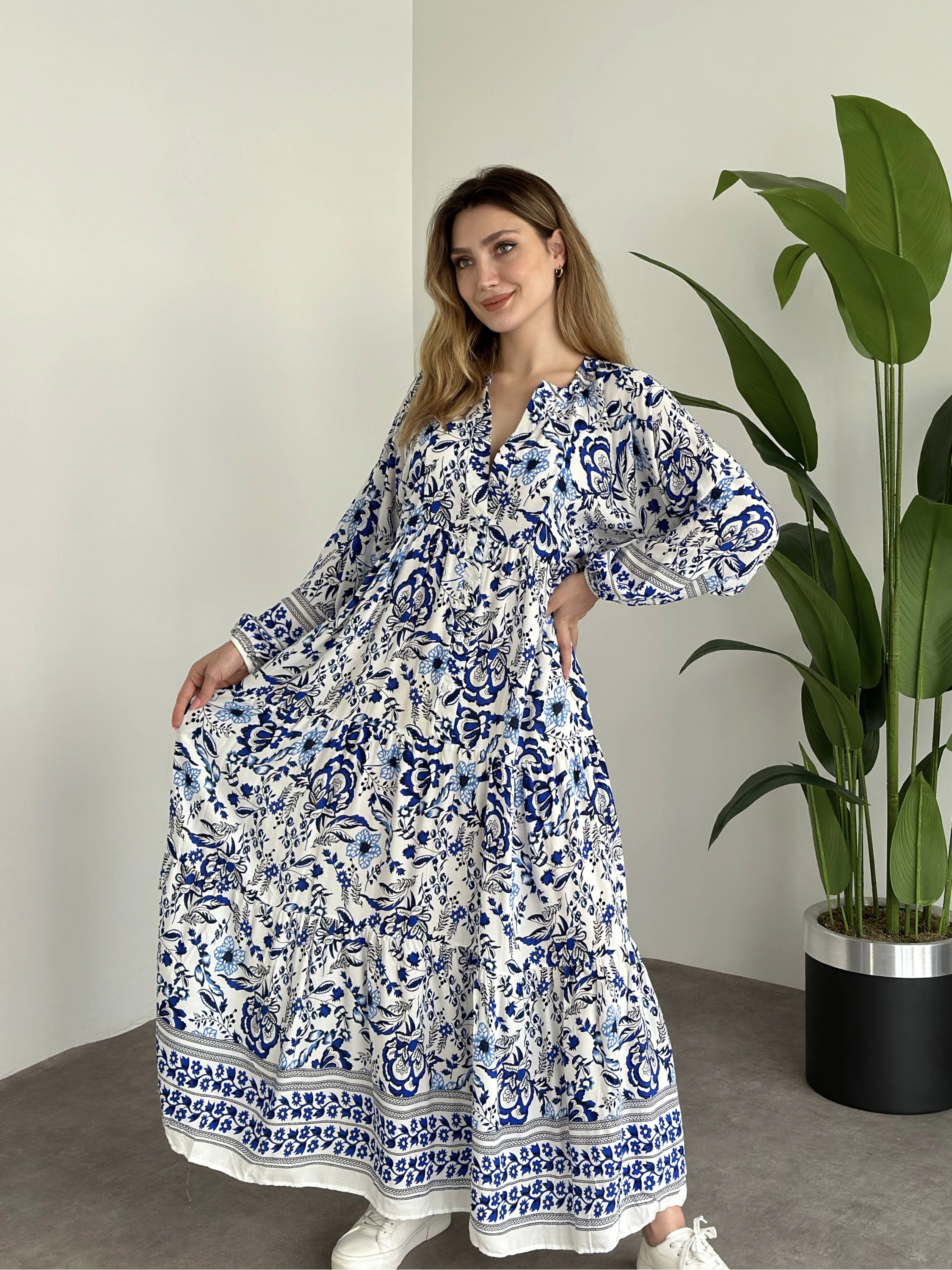 Uzun Boy Dekolte Bol Kesim Pamuklu Viskon Elbise Beyaz Mavi