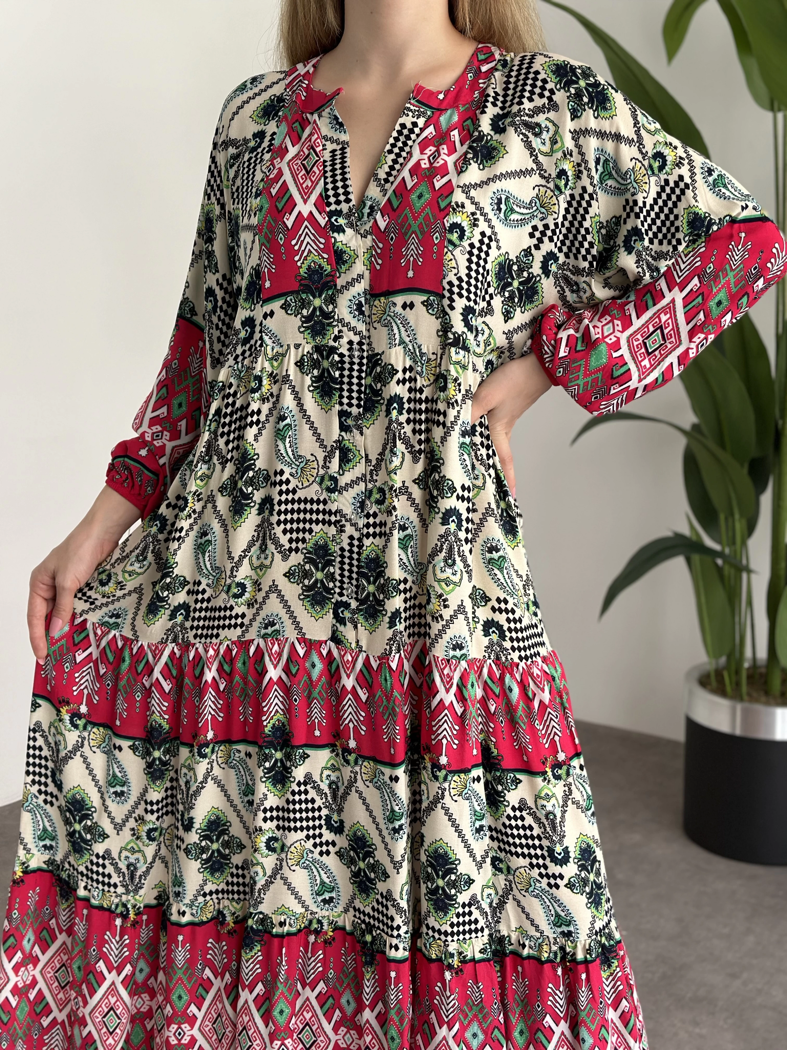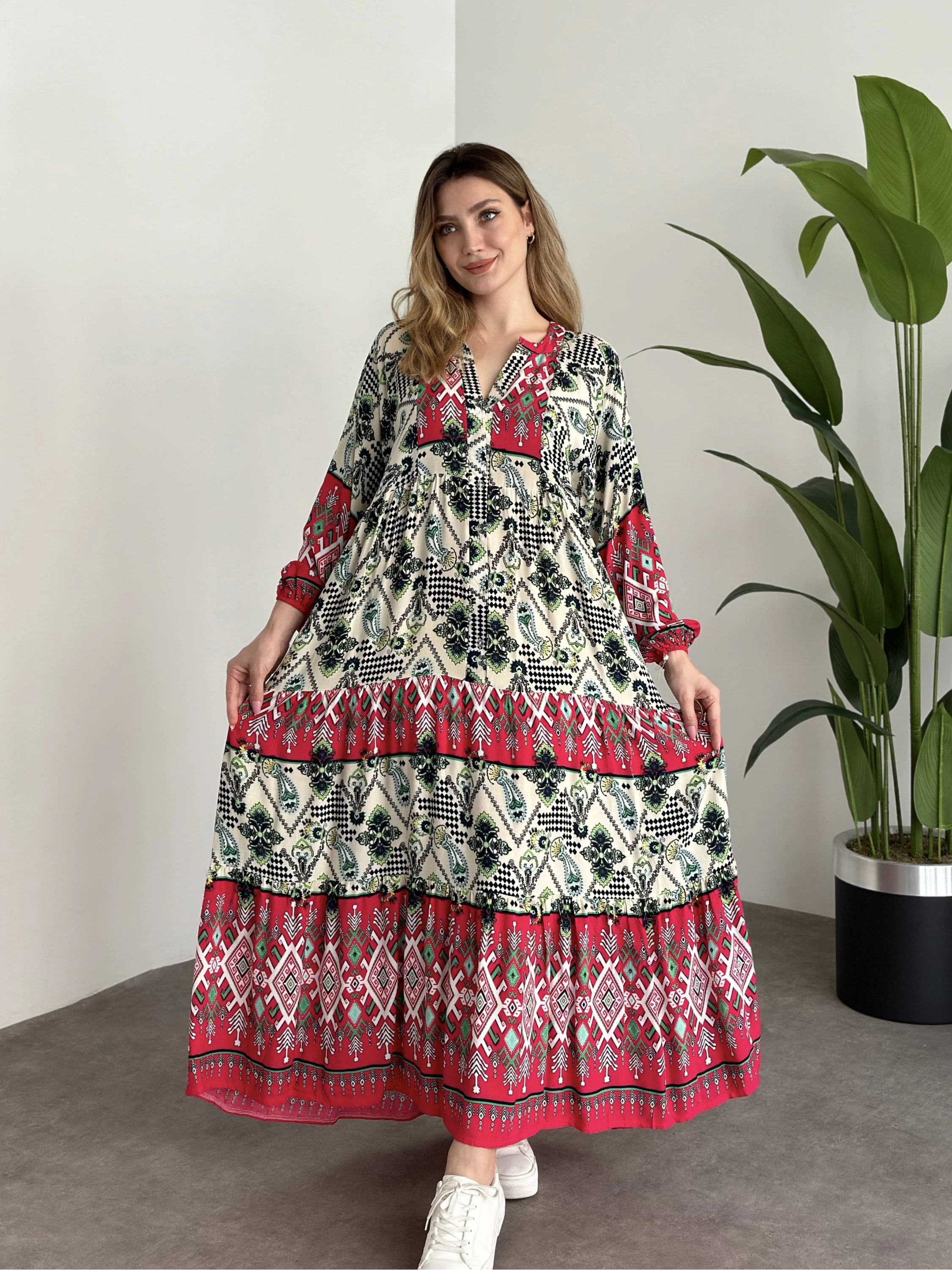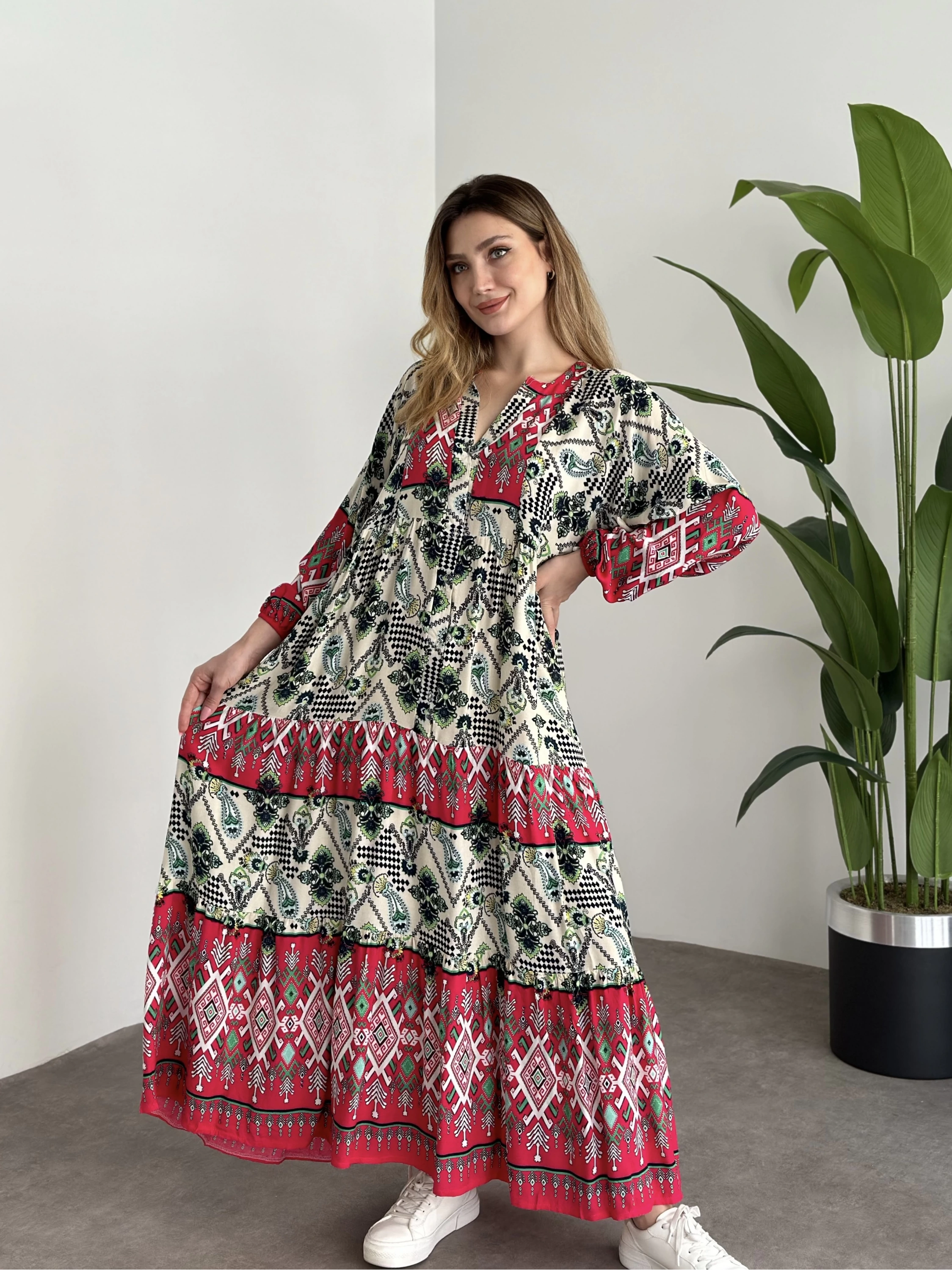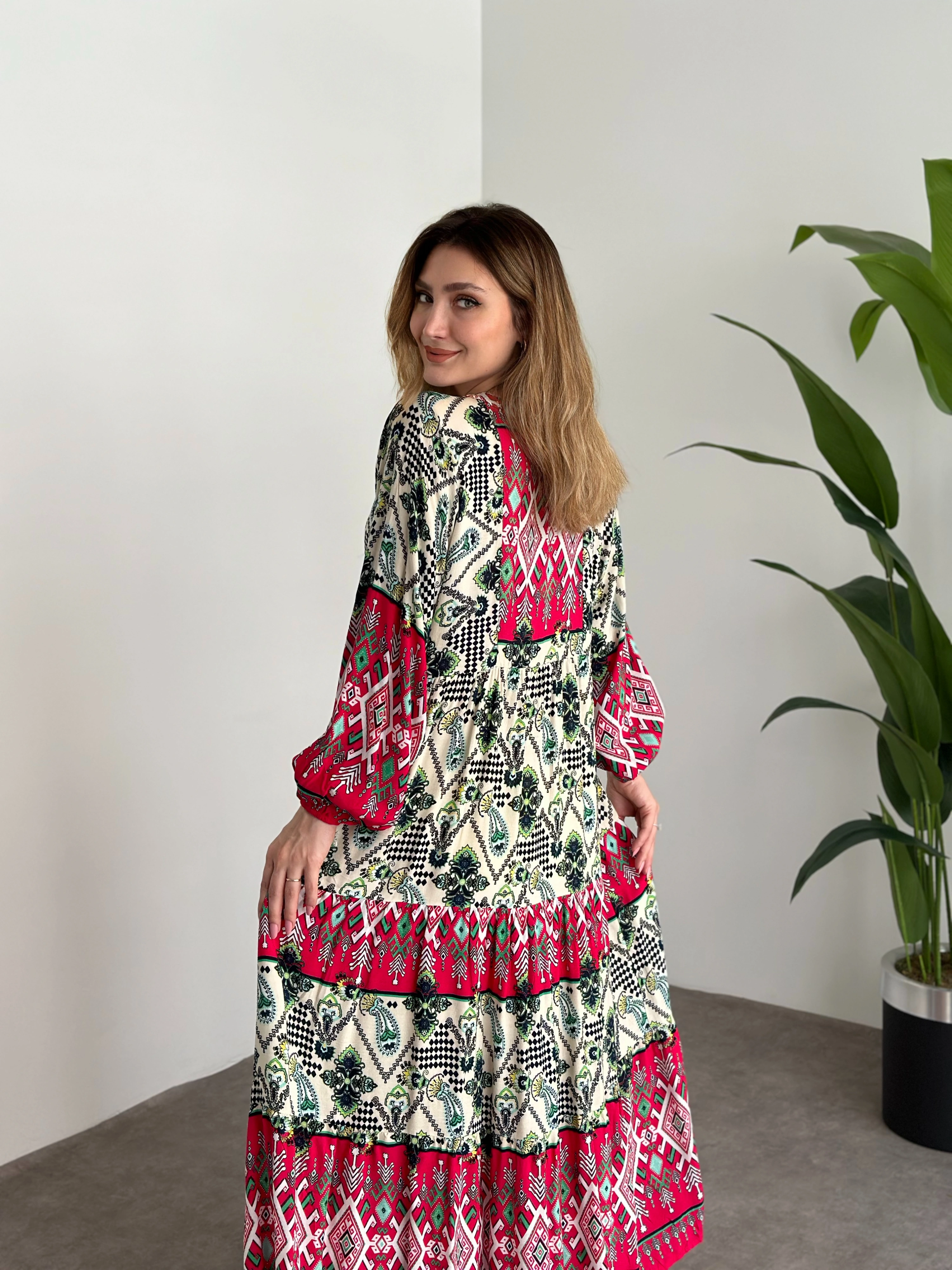 Uzun Boy Dekolte Bol Kesim Pamuklu Viskon Elbise Fusya Motifli