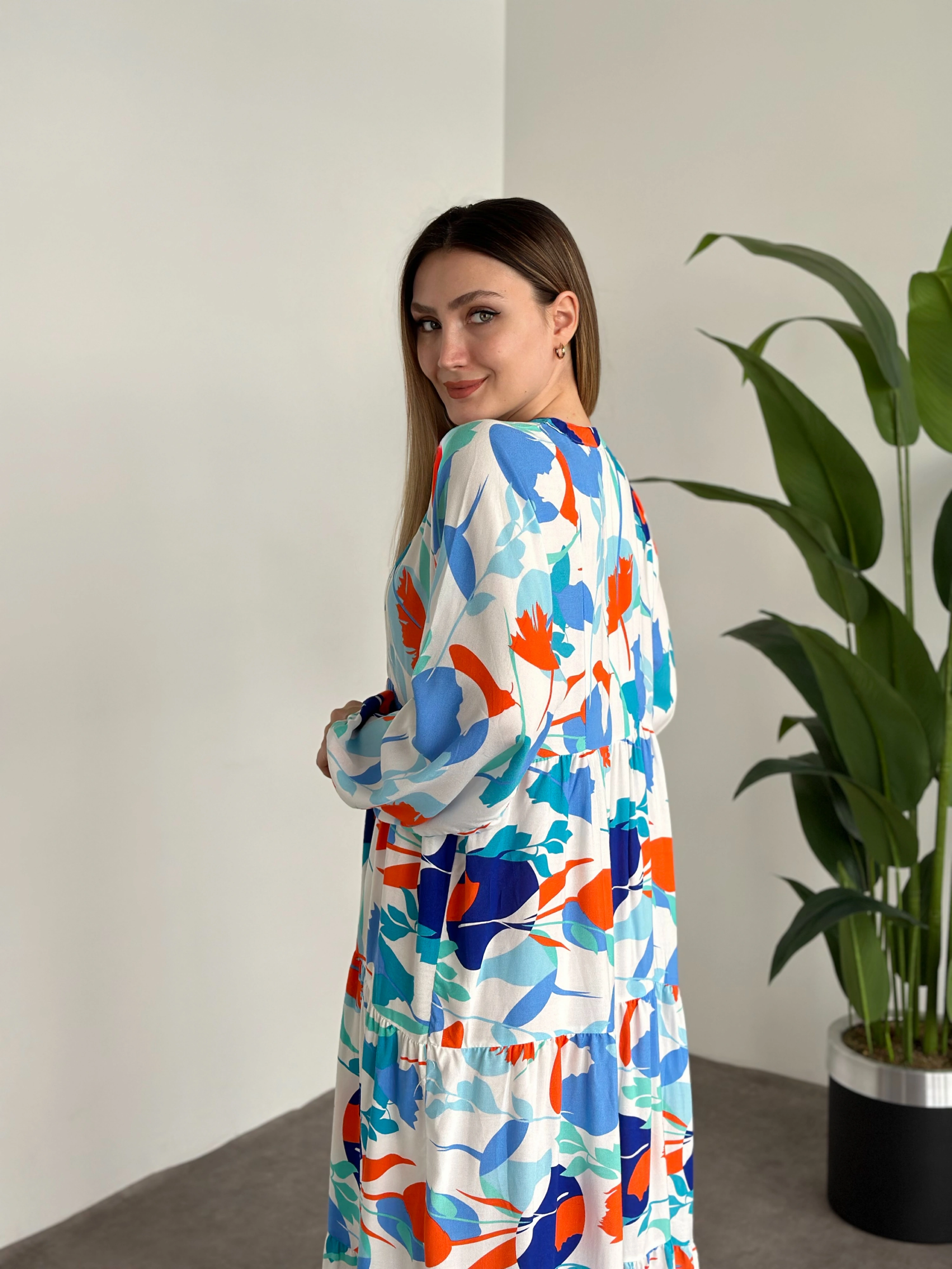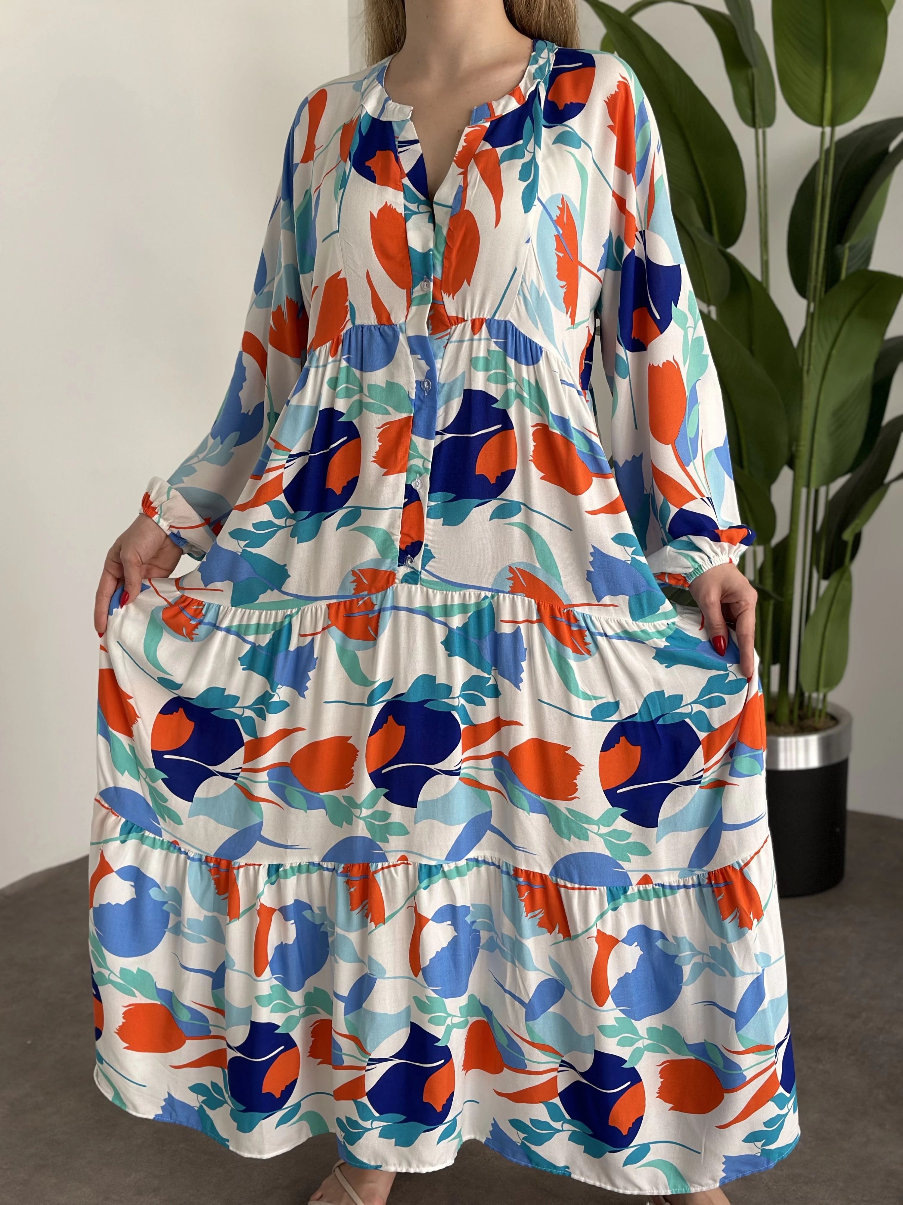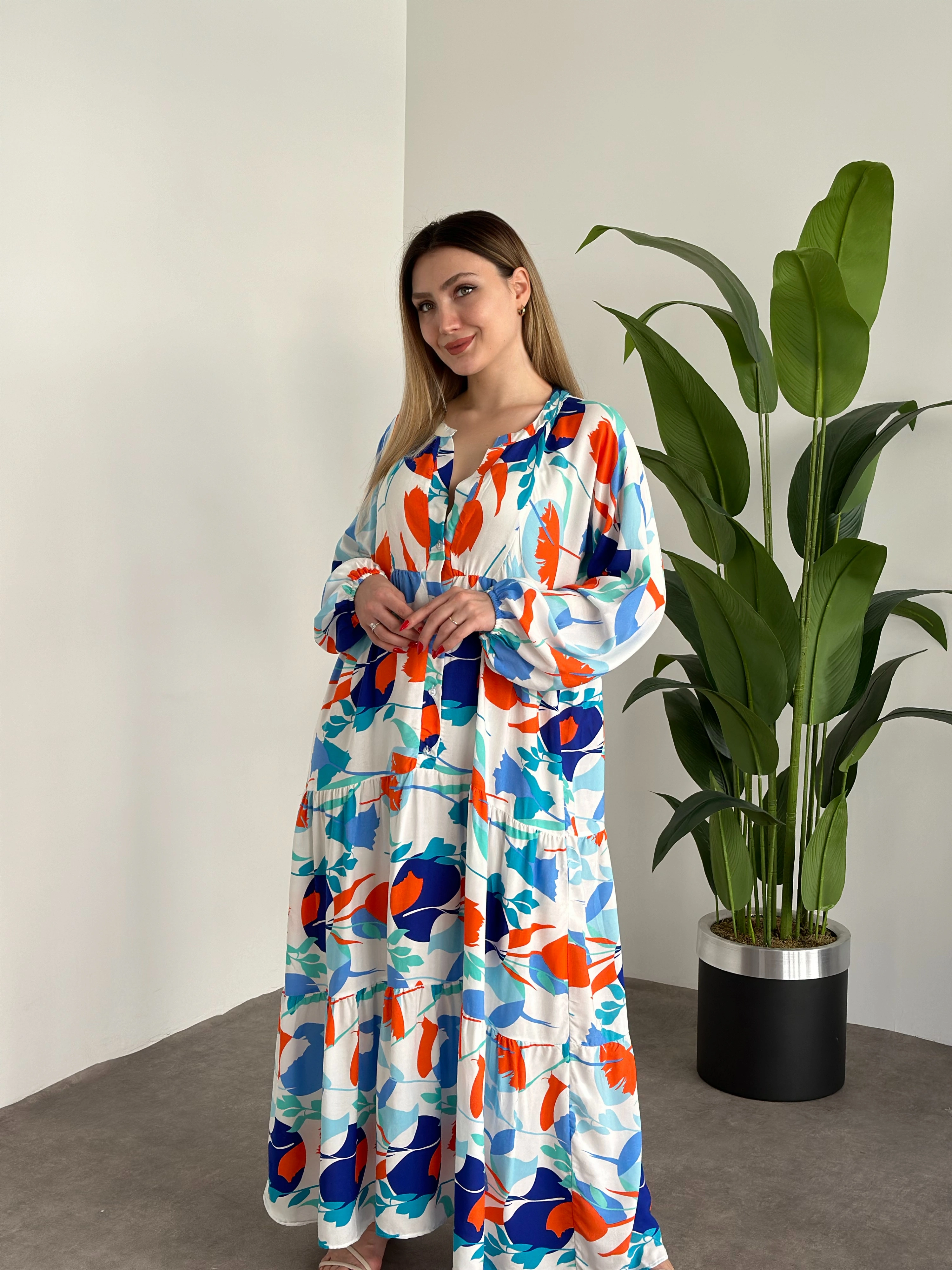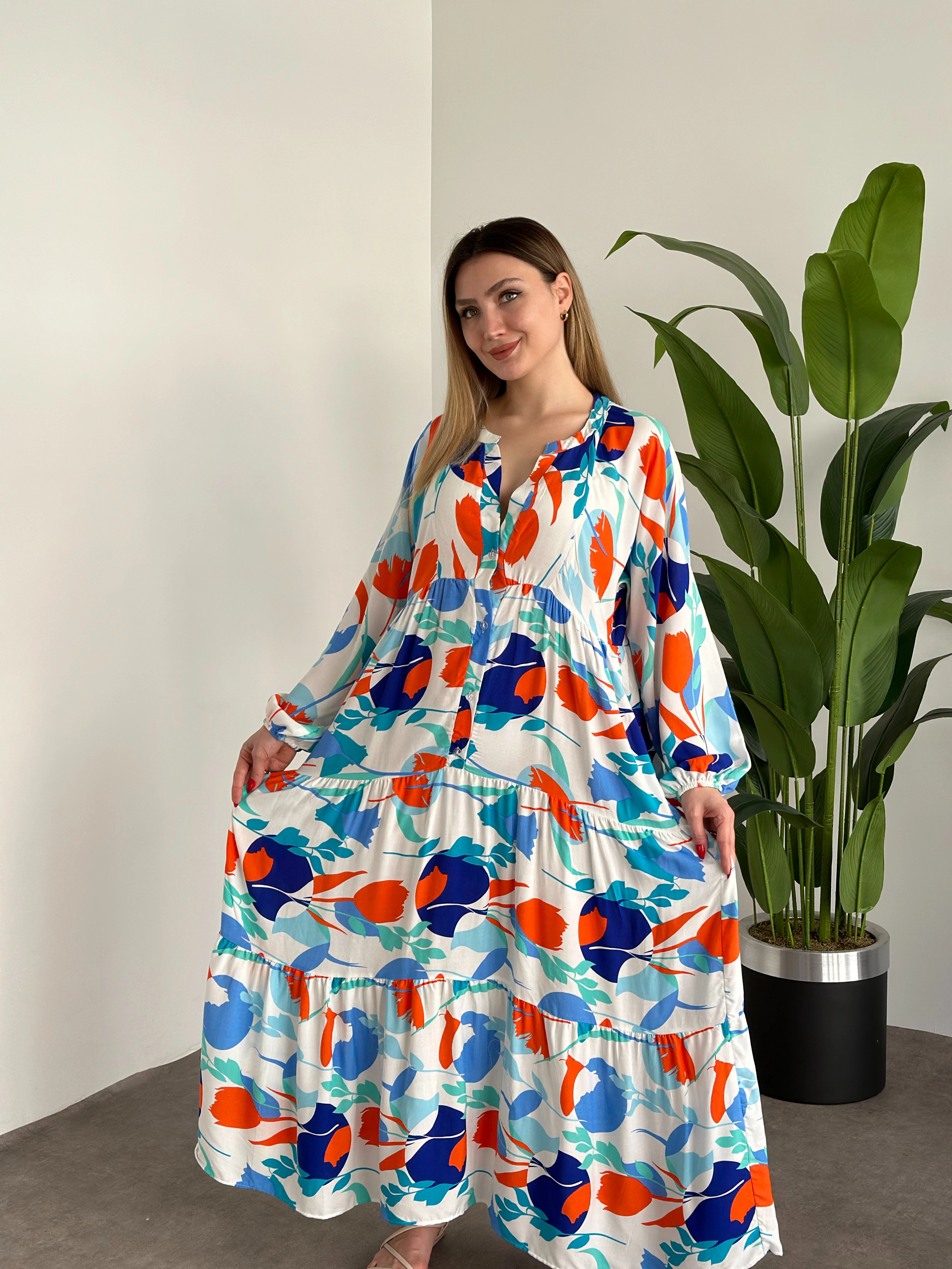 Uzun Boy Dekolte Bol Kesim Pamuklu Viskon Elbise Turuncu Mavili desenli