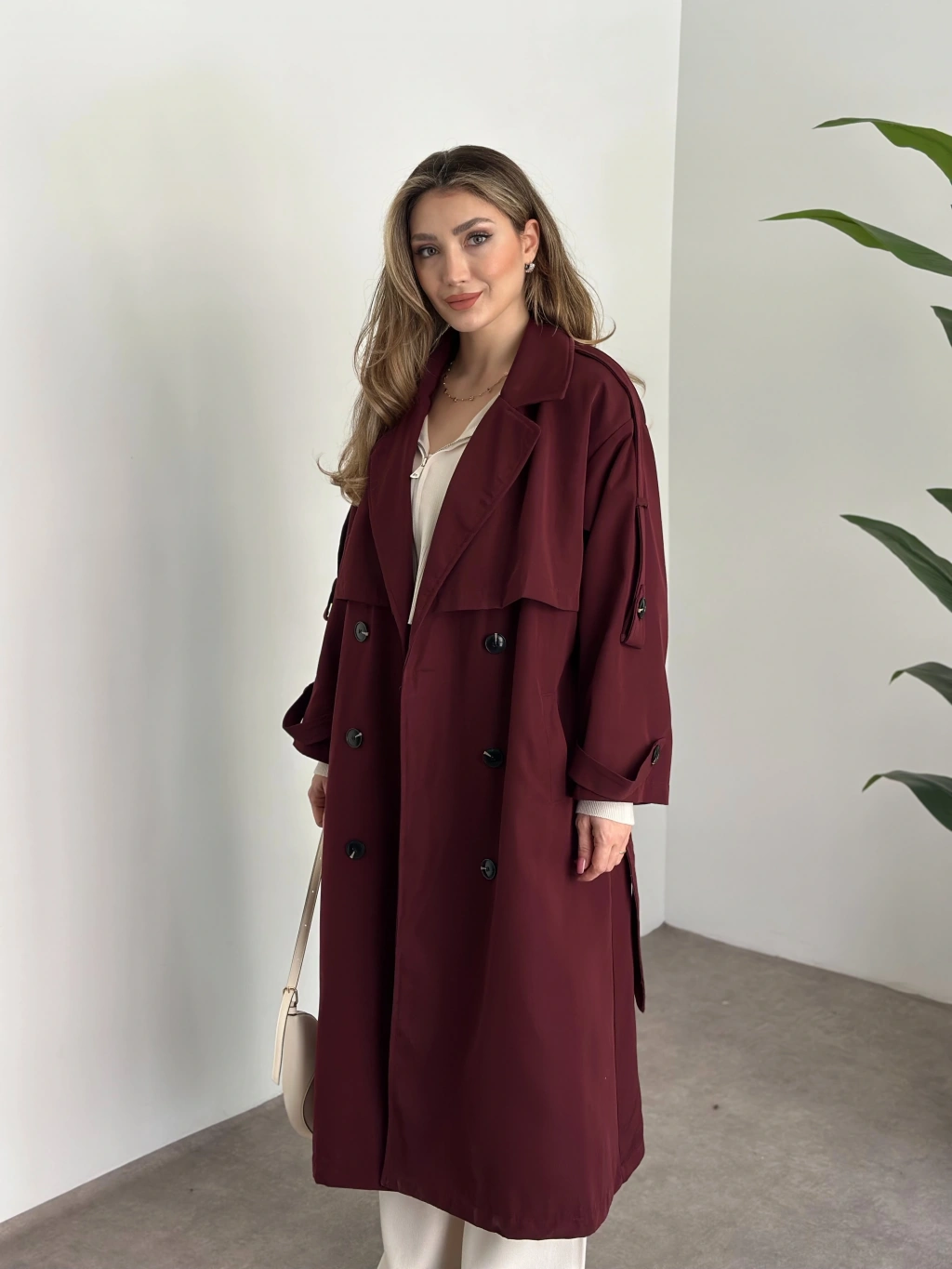 Uzun düğmeli beli kuşaklı oversize astarlı trençkot bordo
