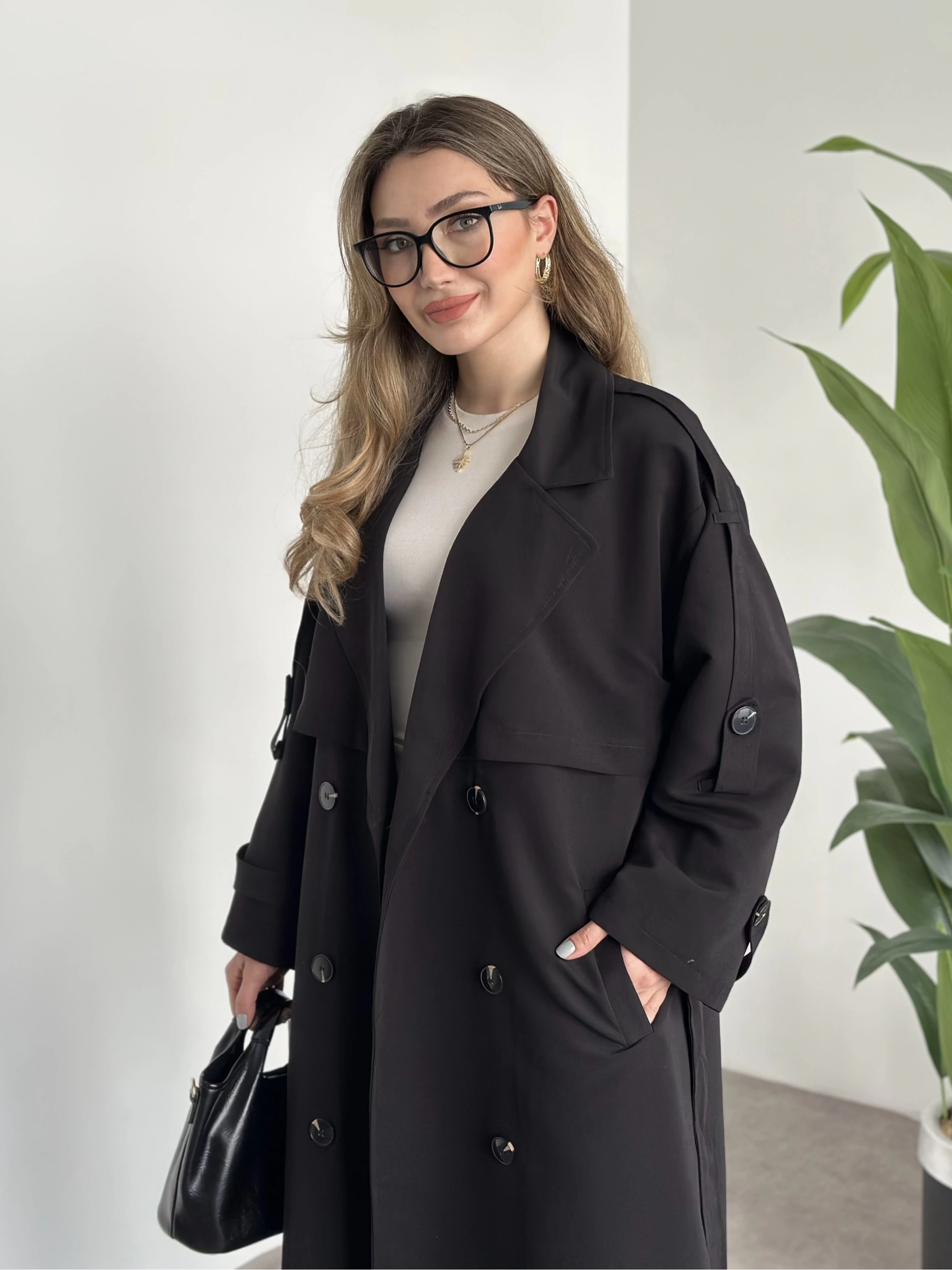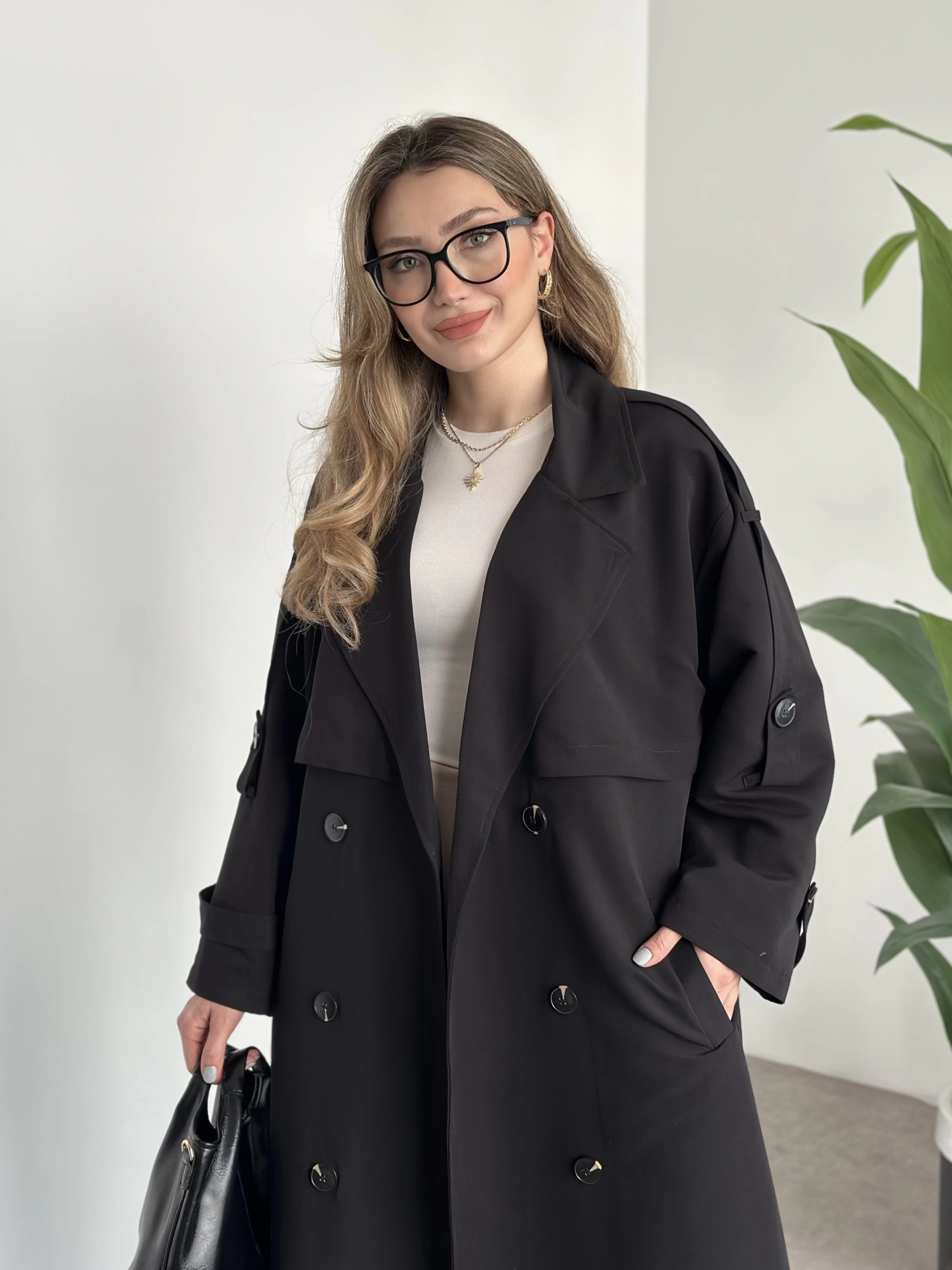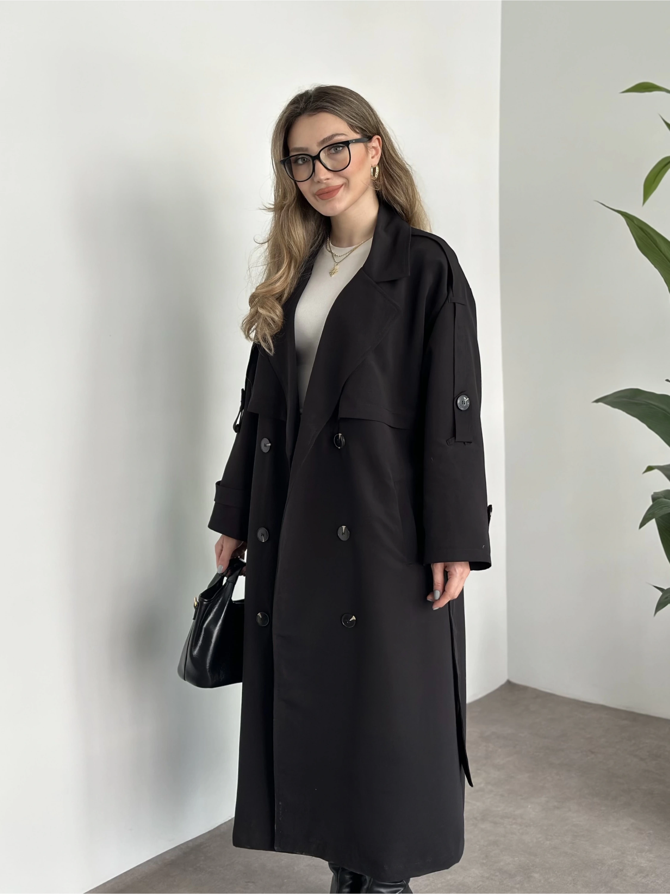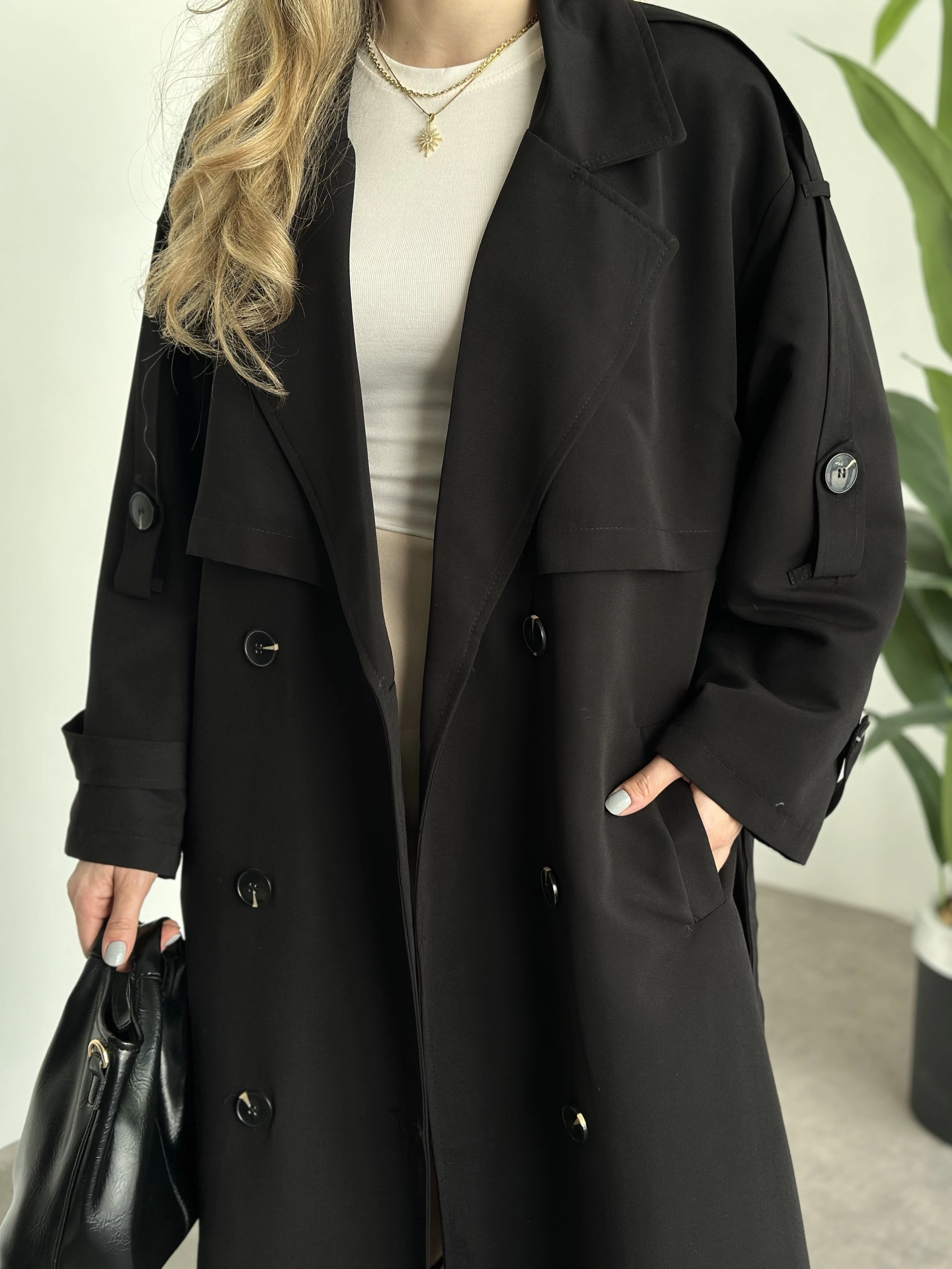 Uzun düğmeli beli kuşaklı oversize astarlı trençkot siyah