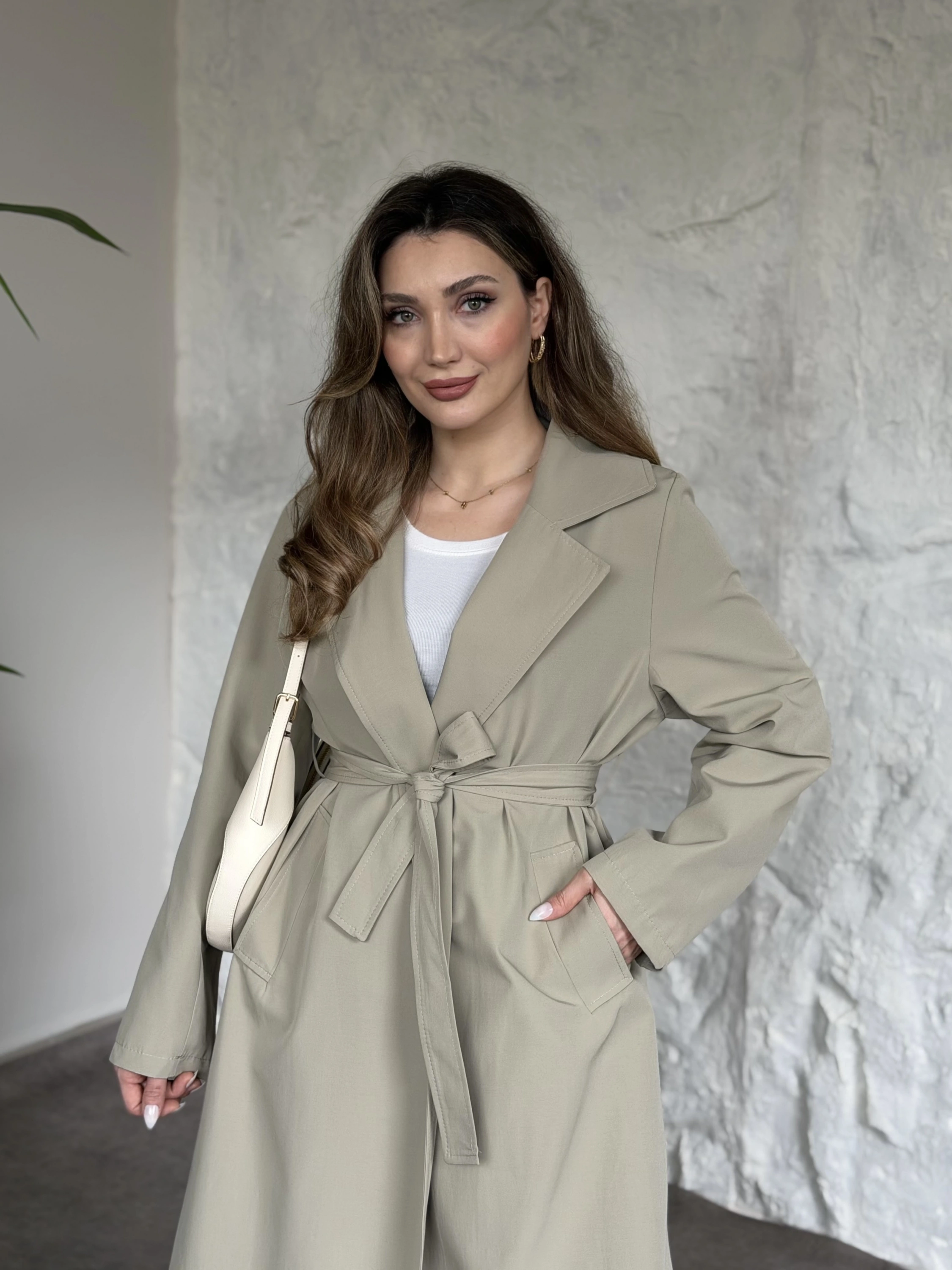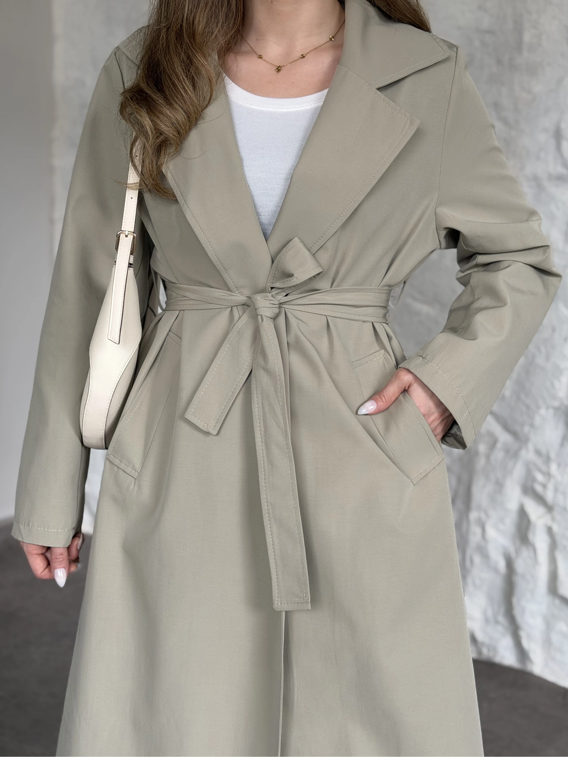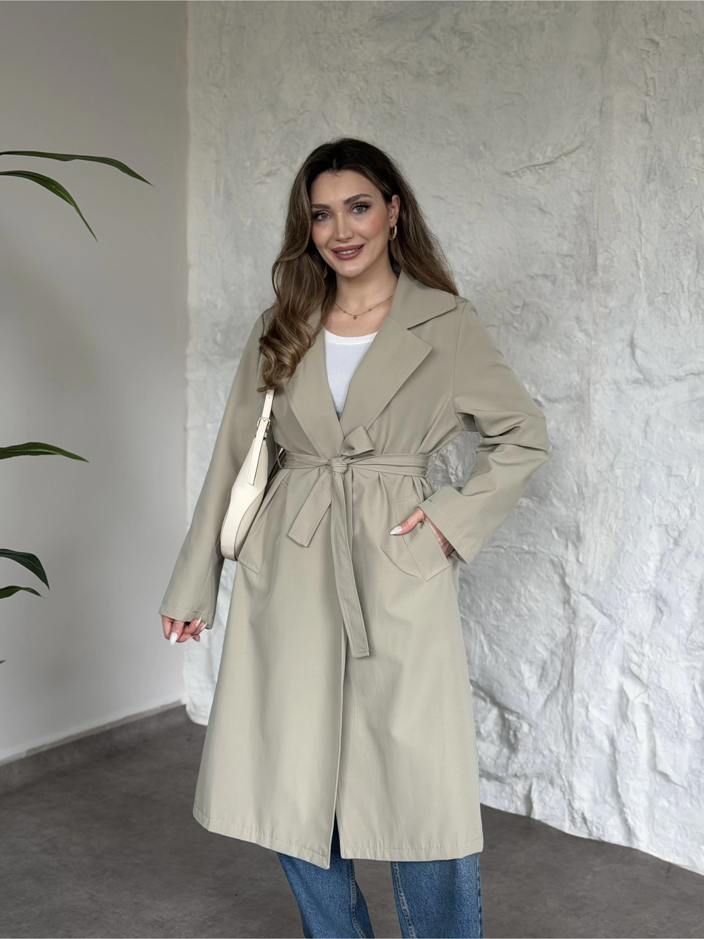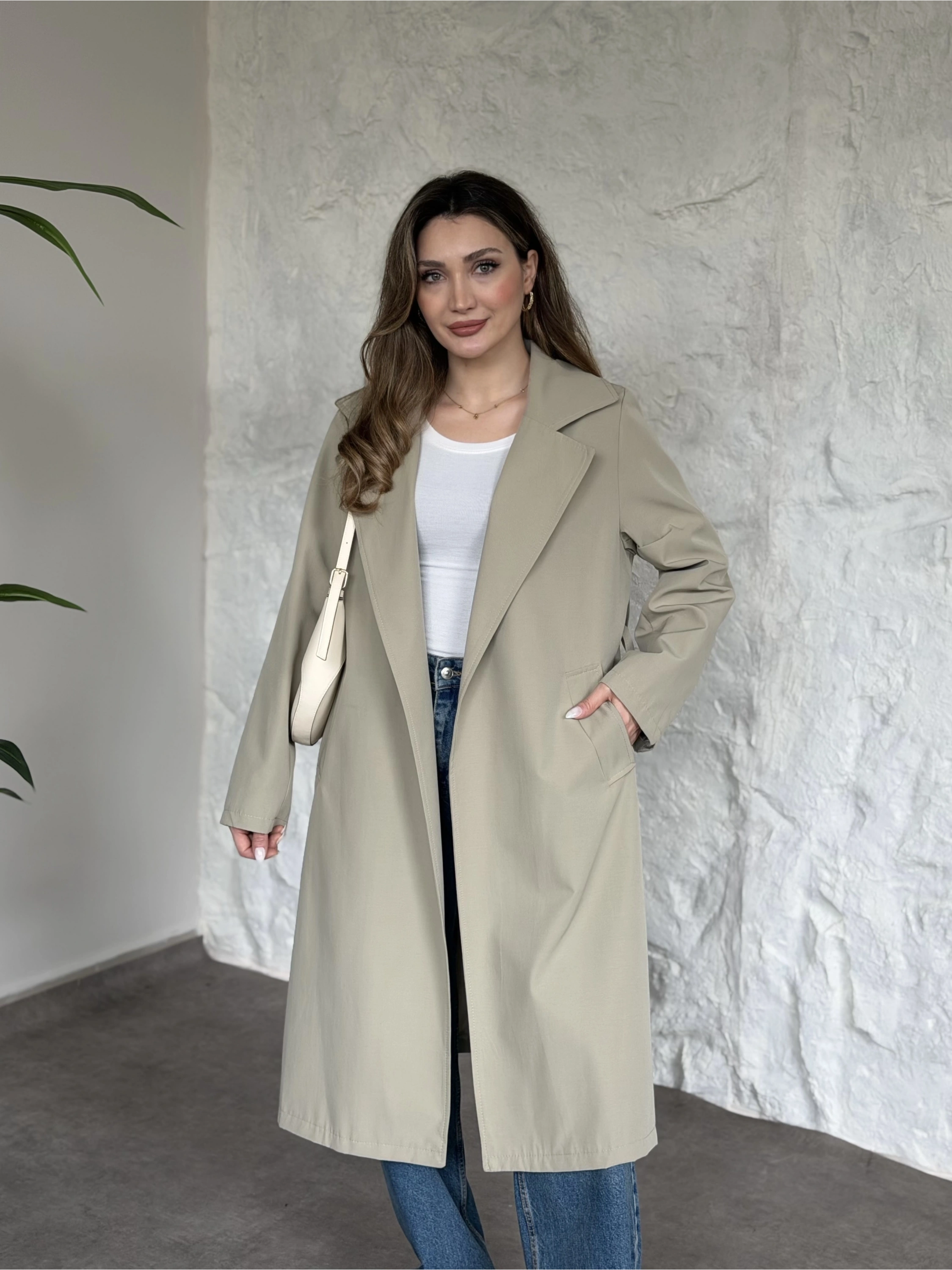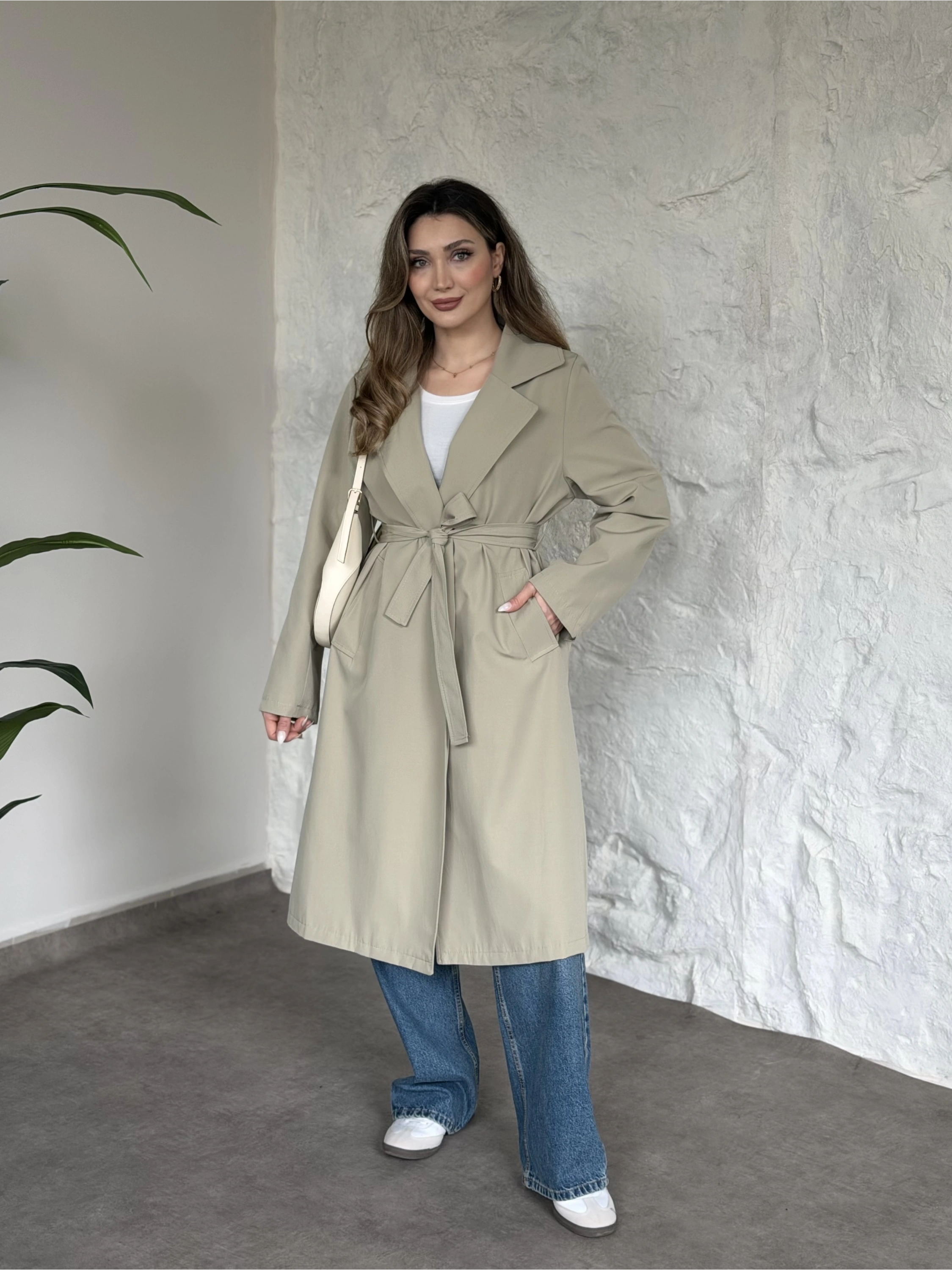Premium kalite Torino kumaş beli kemerli trenç ceket bej