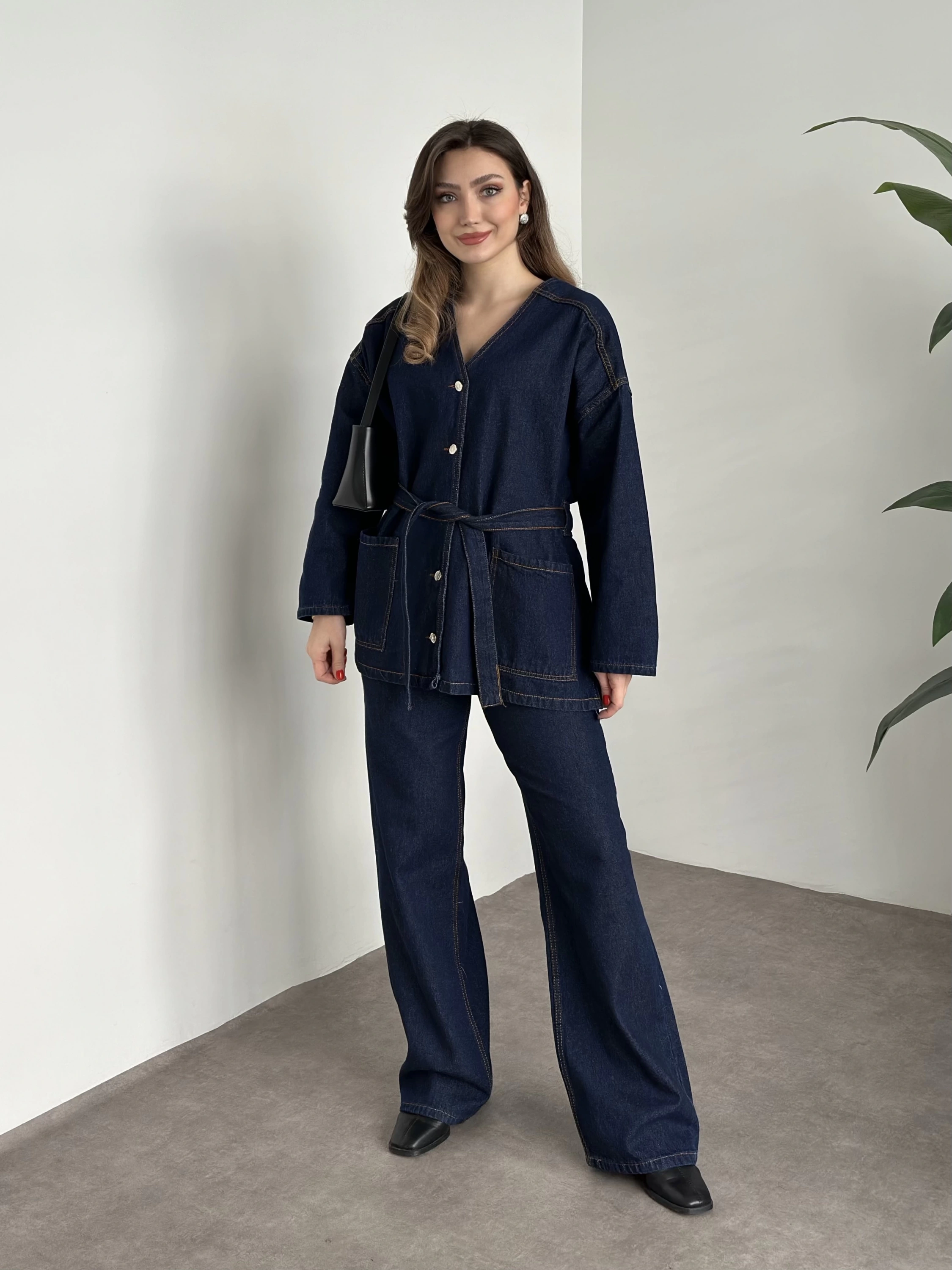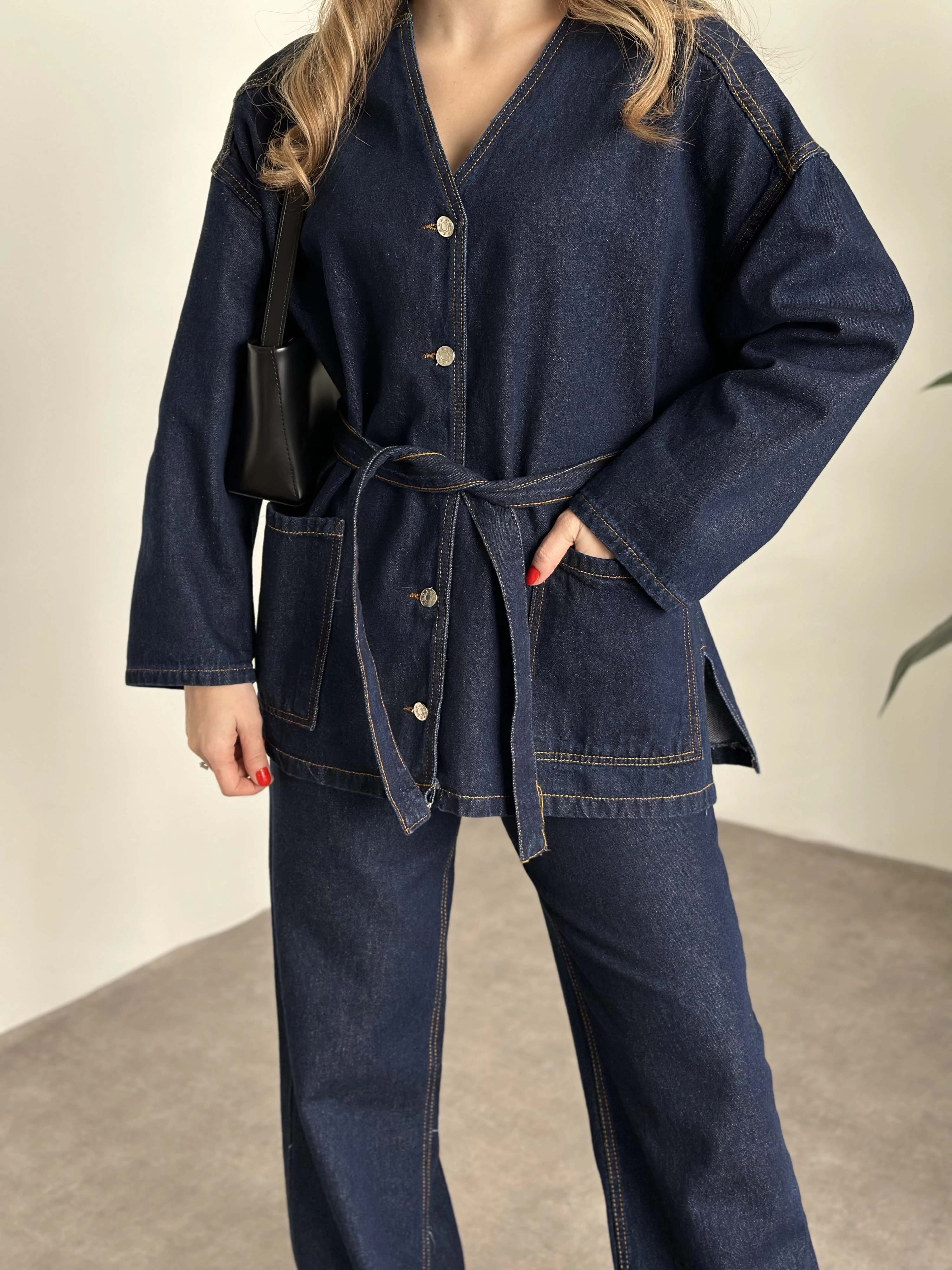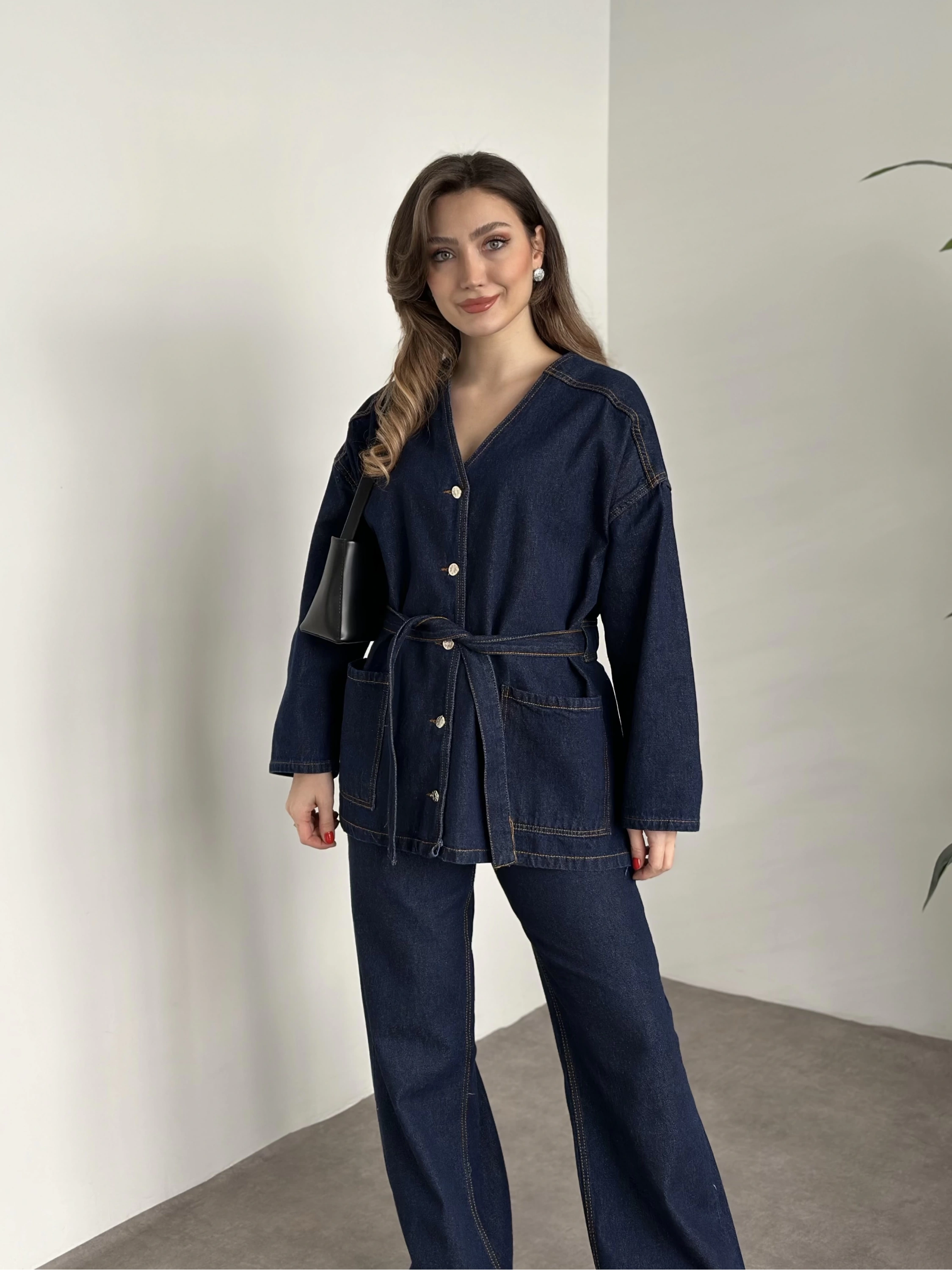 V yaka belinden kuşaklı premium kot takım