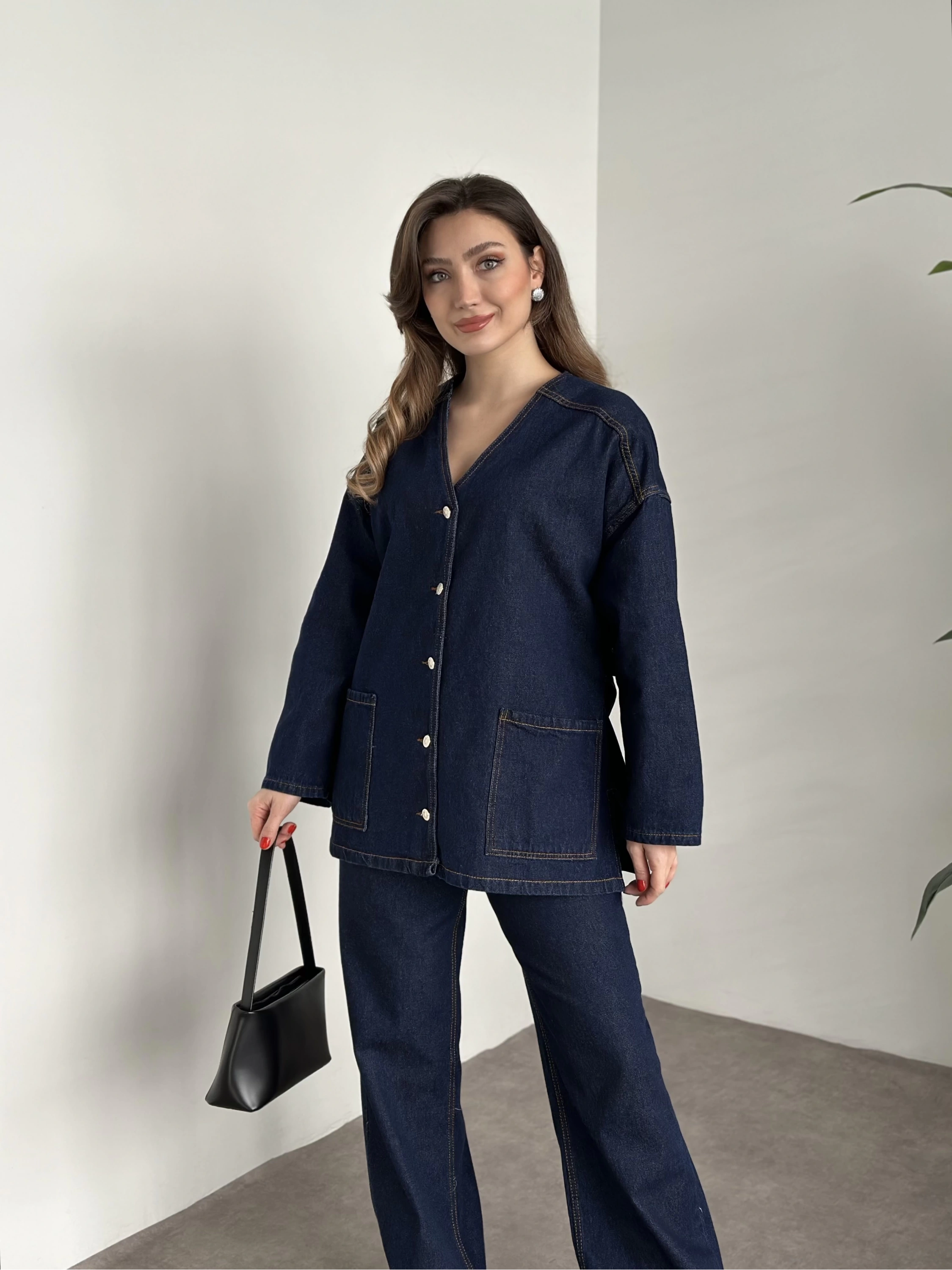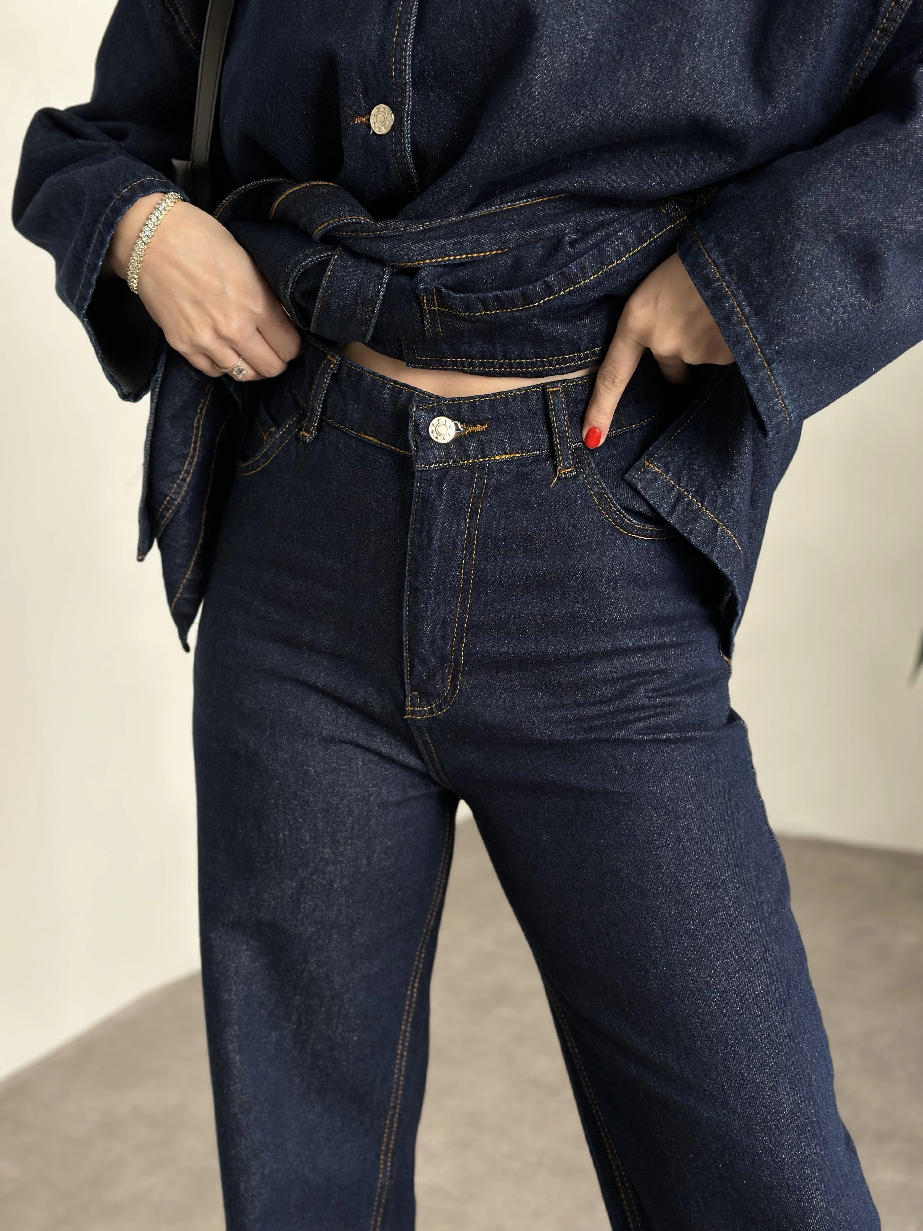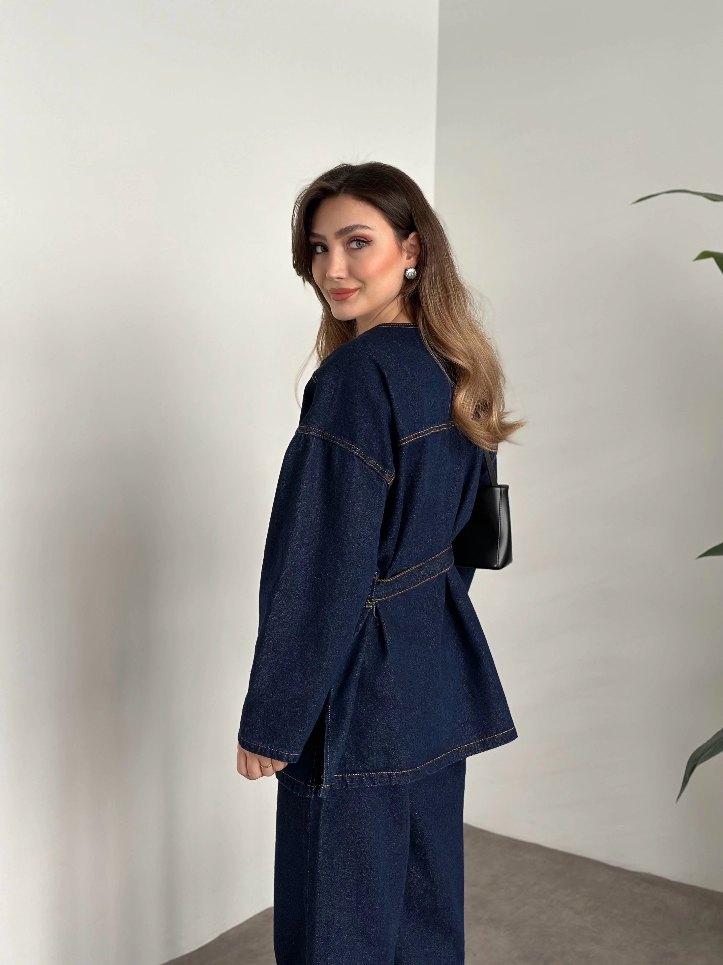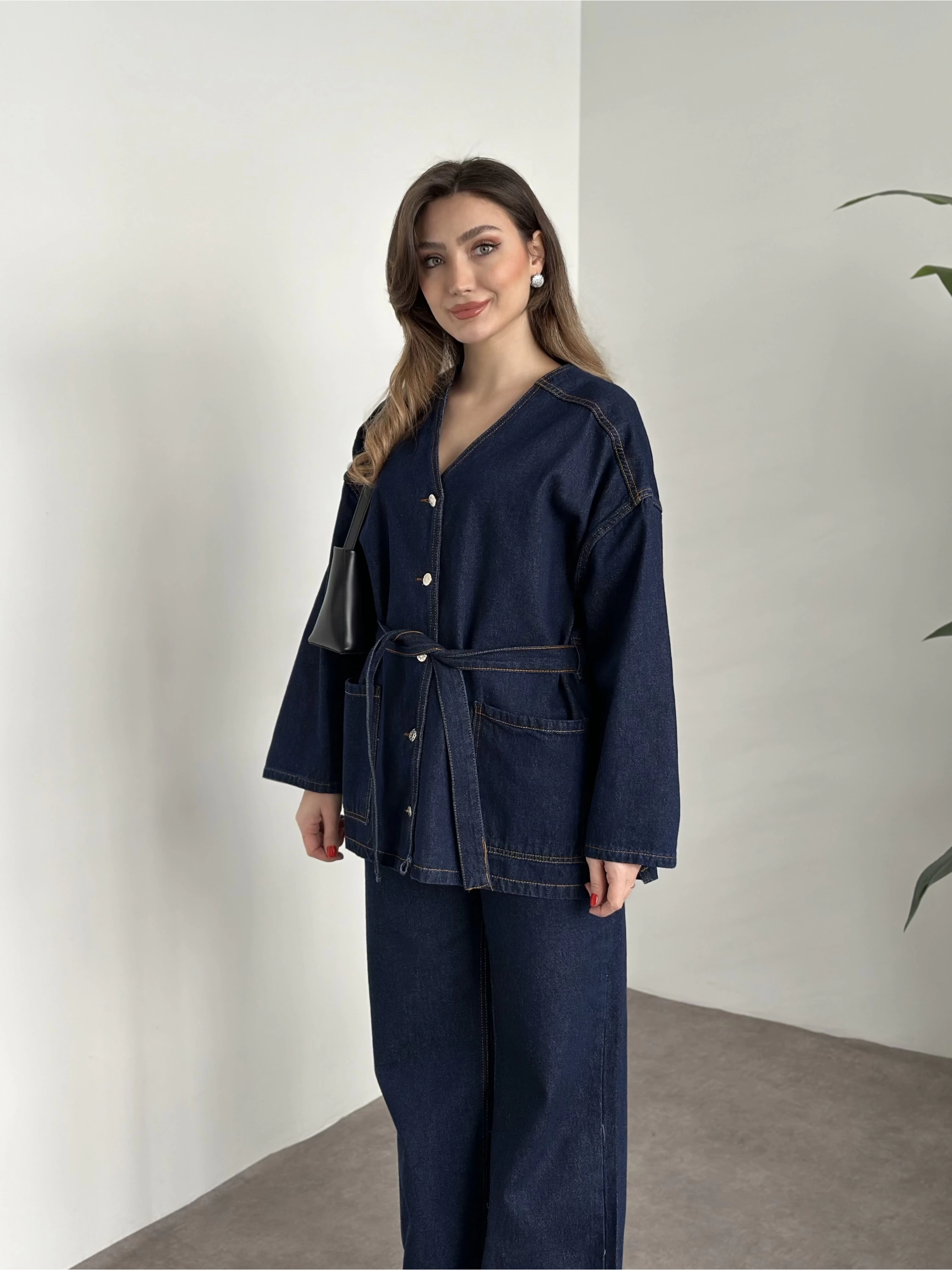 V yaka belinden kuşaklı premium kot takım