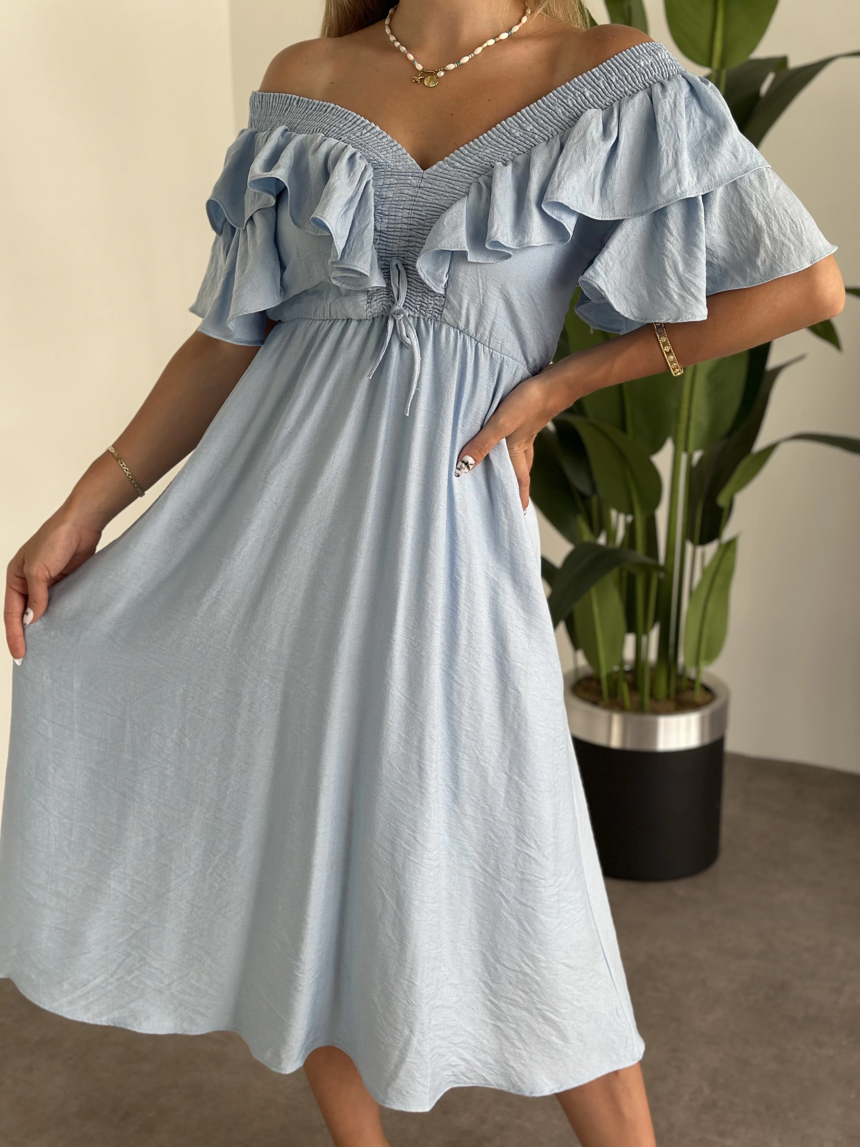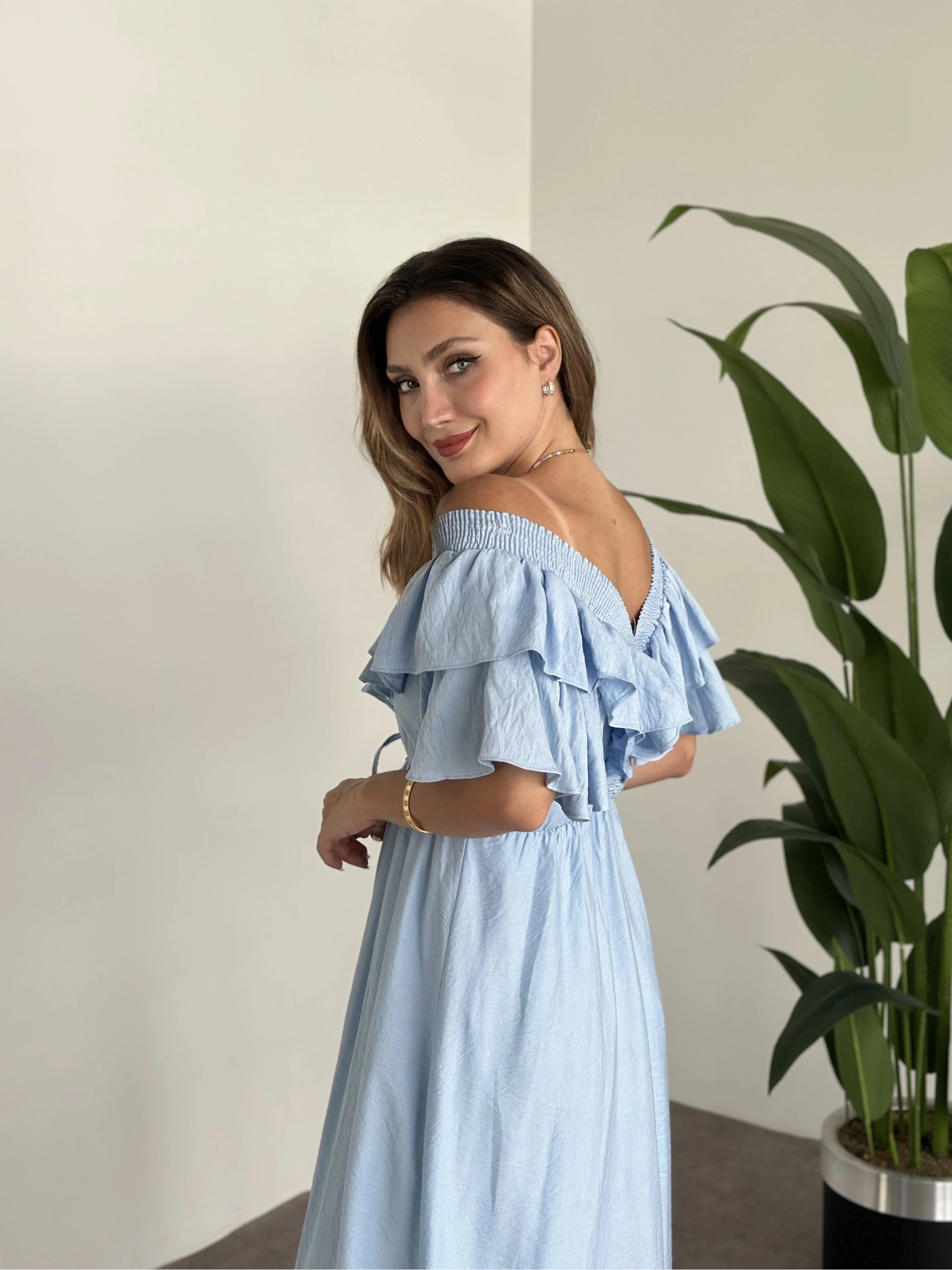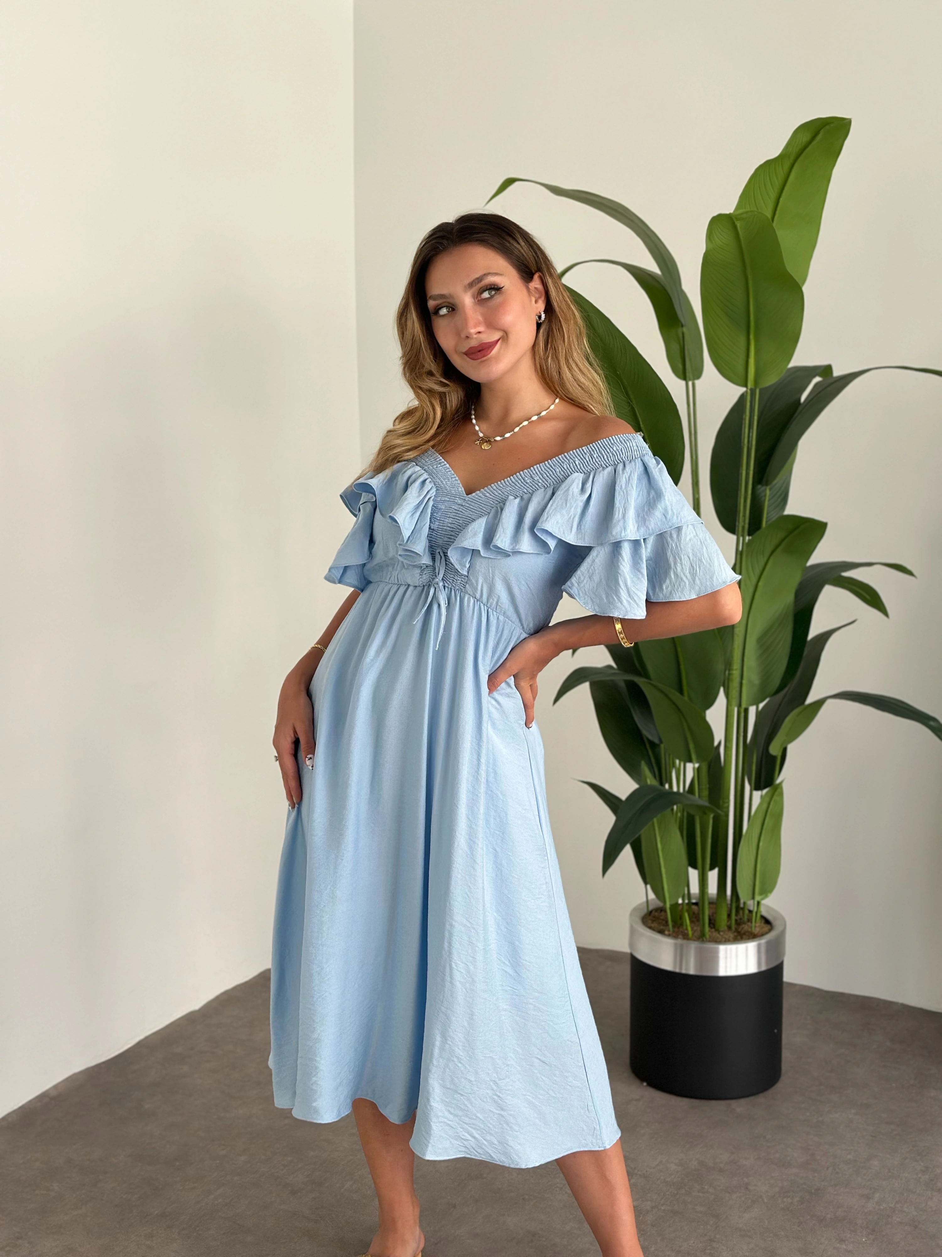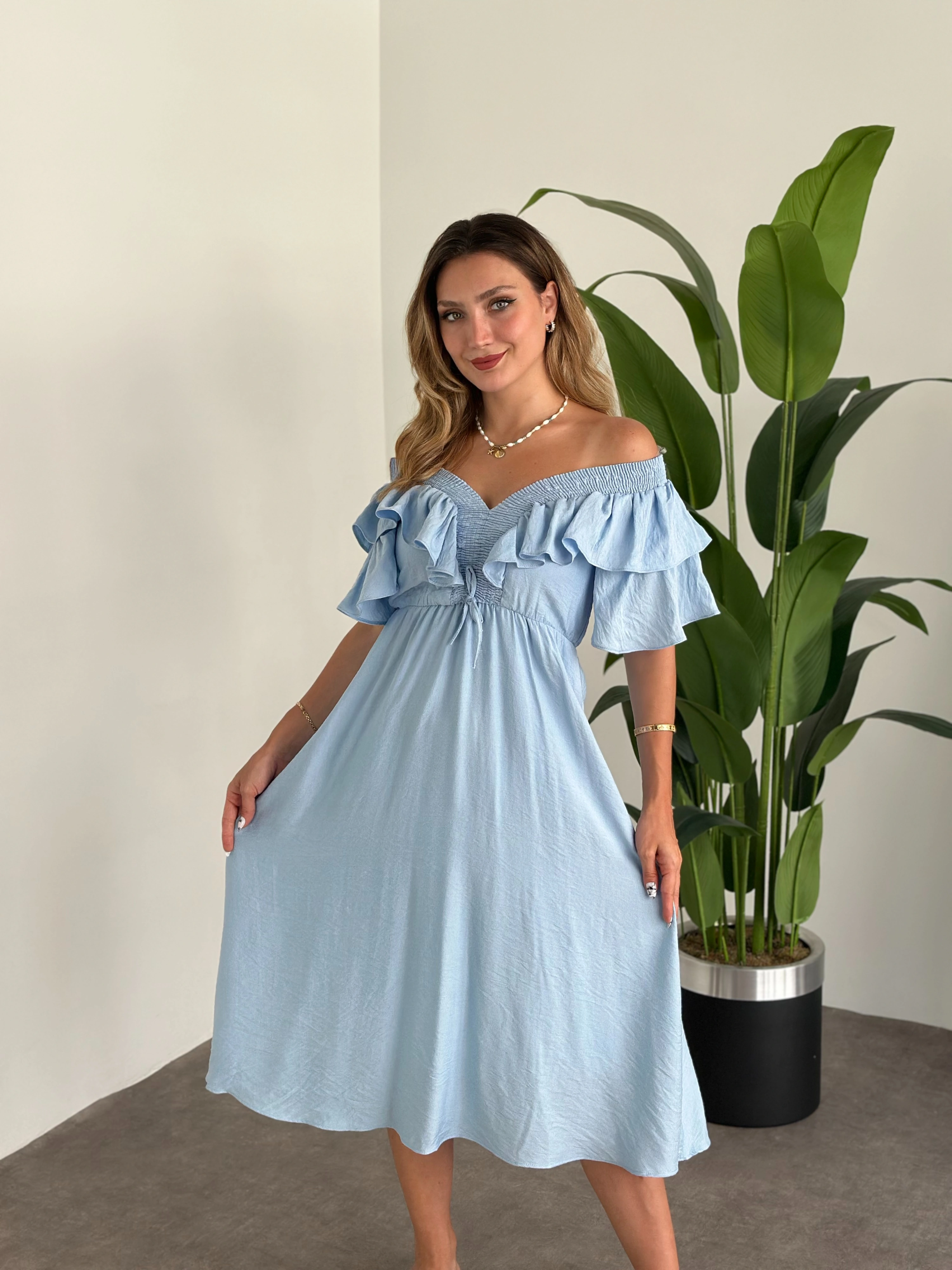 Yakası Gipe Ve Volanlı Astarlı Elbise Mavi