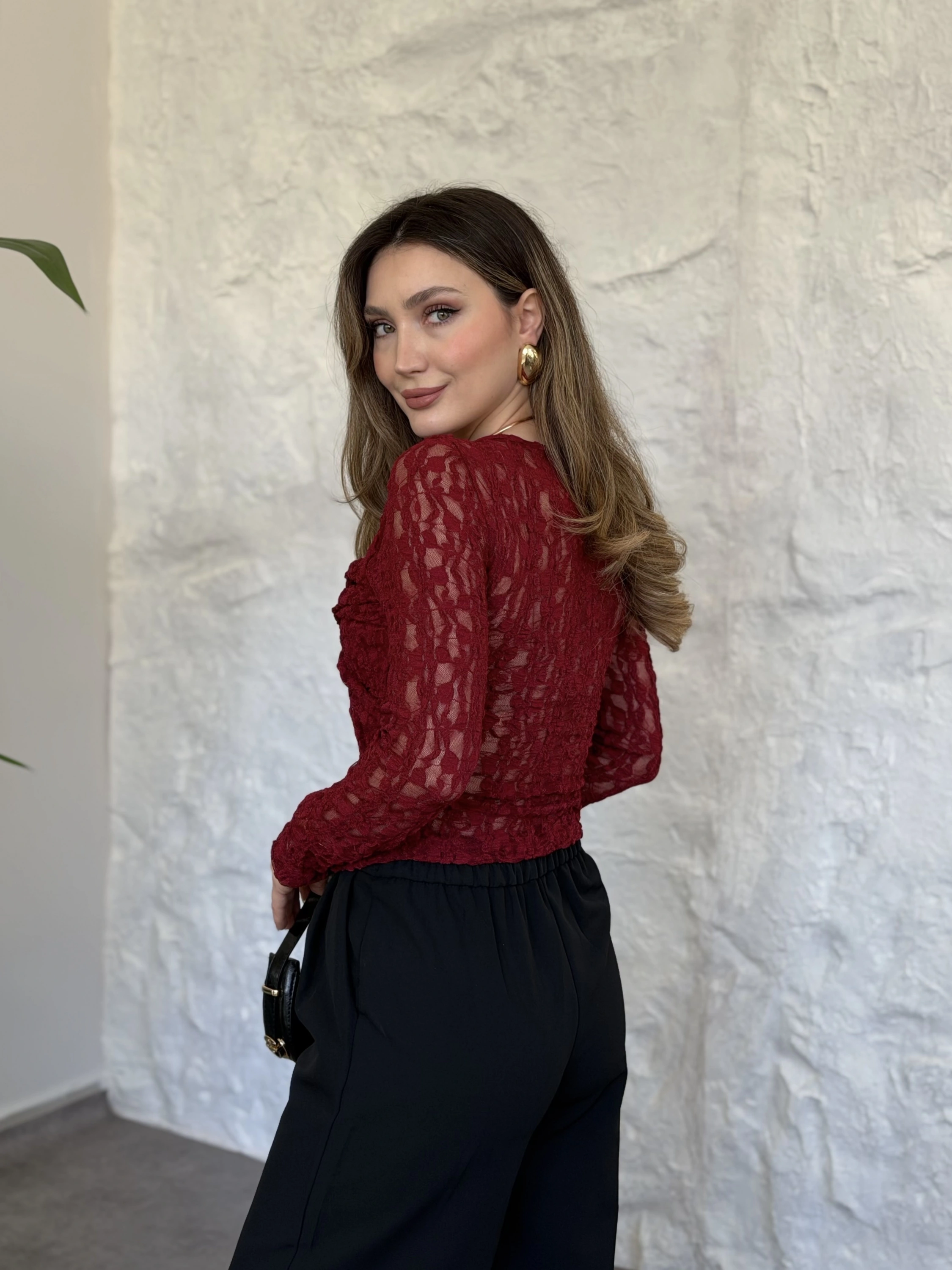 Vatkali beli büzgülü dantel detaylı bluz bordo