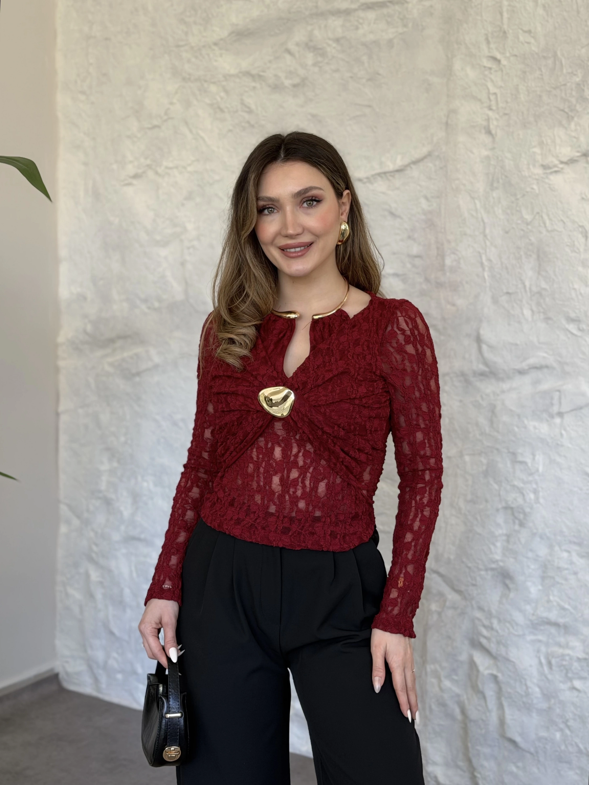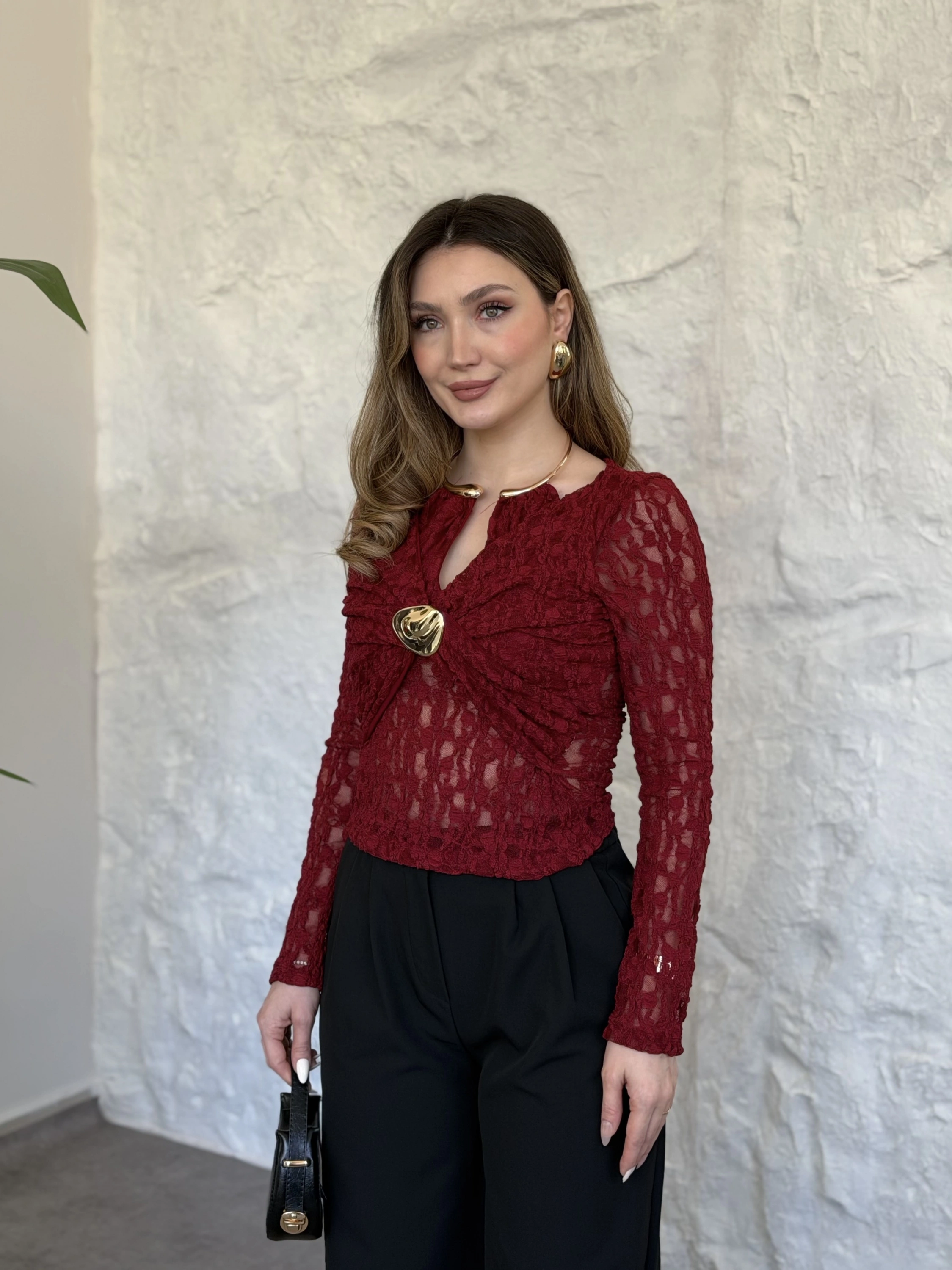 Yakası ve önü aksesuar detaylı dantelli bluz bordo